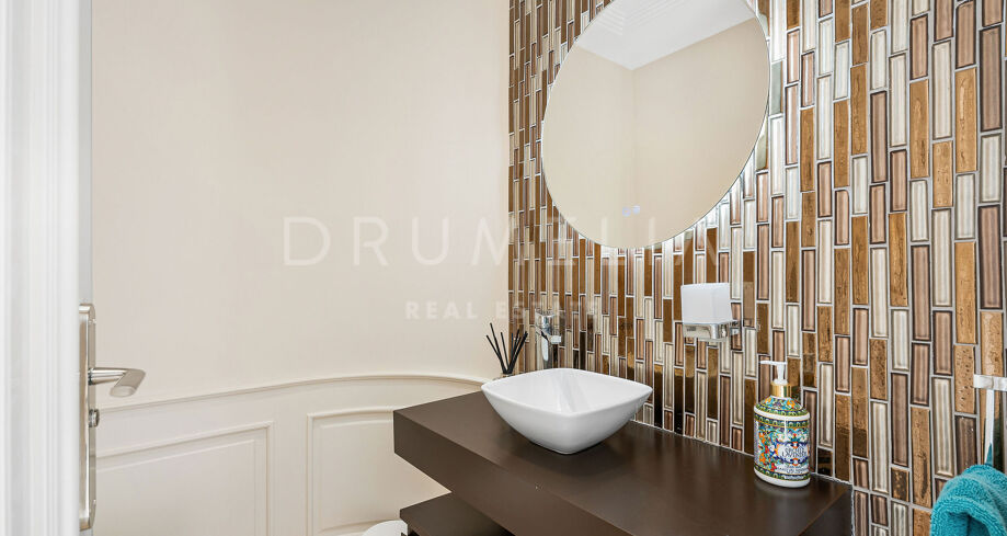 I andre etasje finner du hovedsoverommet med en privat terrasse med utsikt mot golfbanen, samt to ekstra soverom med egne bad. Kjelleren rommer en selvstendig gjesteleilighet med egen inngang, et romslig vaskerom og en stor garasje – delvis brukt som treningsrom, med et ekstra rom som kan gjøres om til hjemmekino. Uteområdet byr på en ny utekjøkken- og grillplass, en avslappende lounge, en formell spiseplass og en frodig hage med frukttrær og urtebed. En sjelden eiendom som kombinerer beliggenhet, komfort og funksjonalitet på elegant vis.