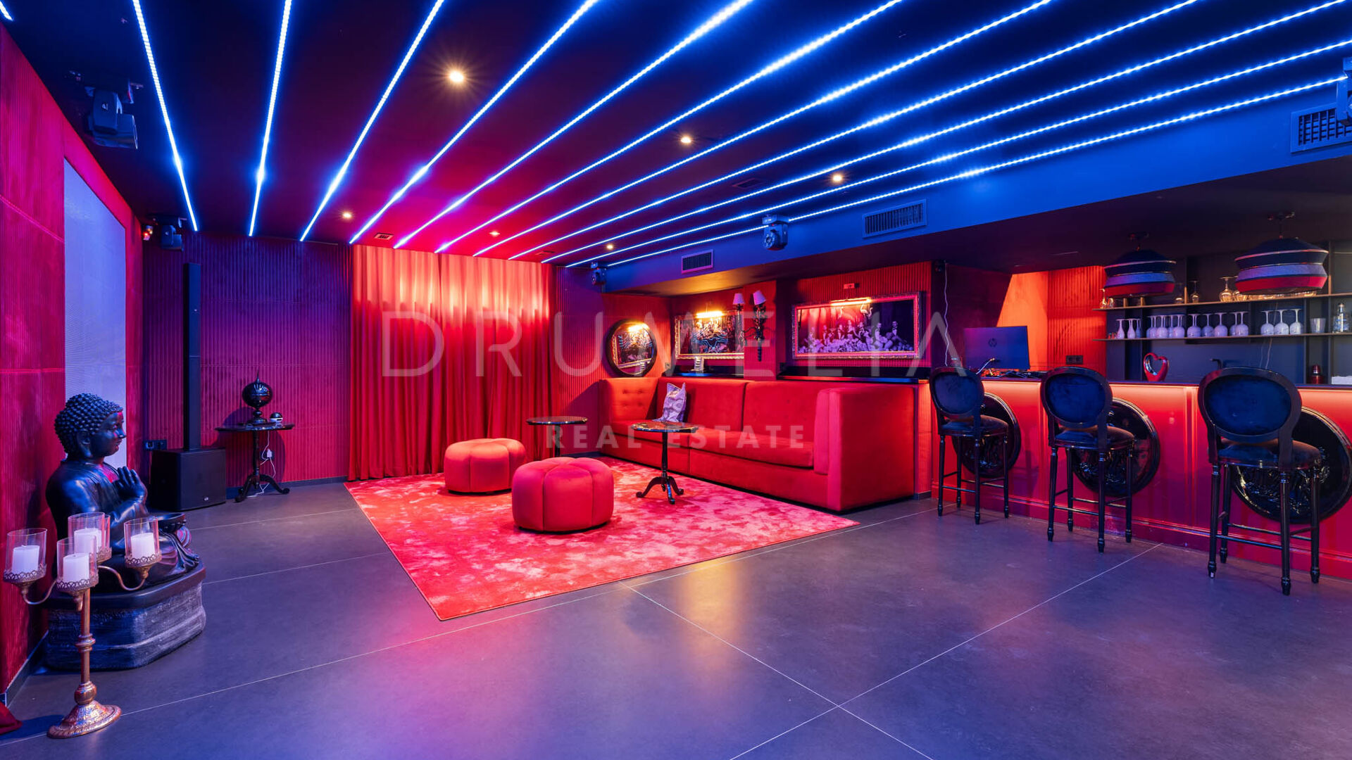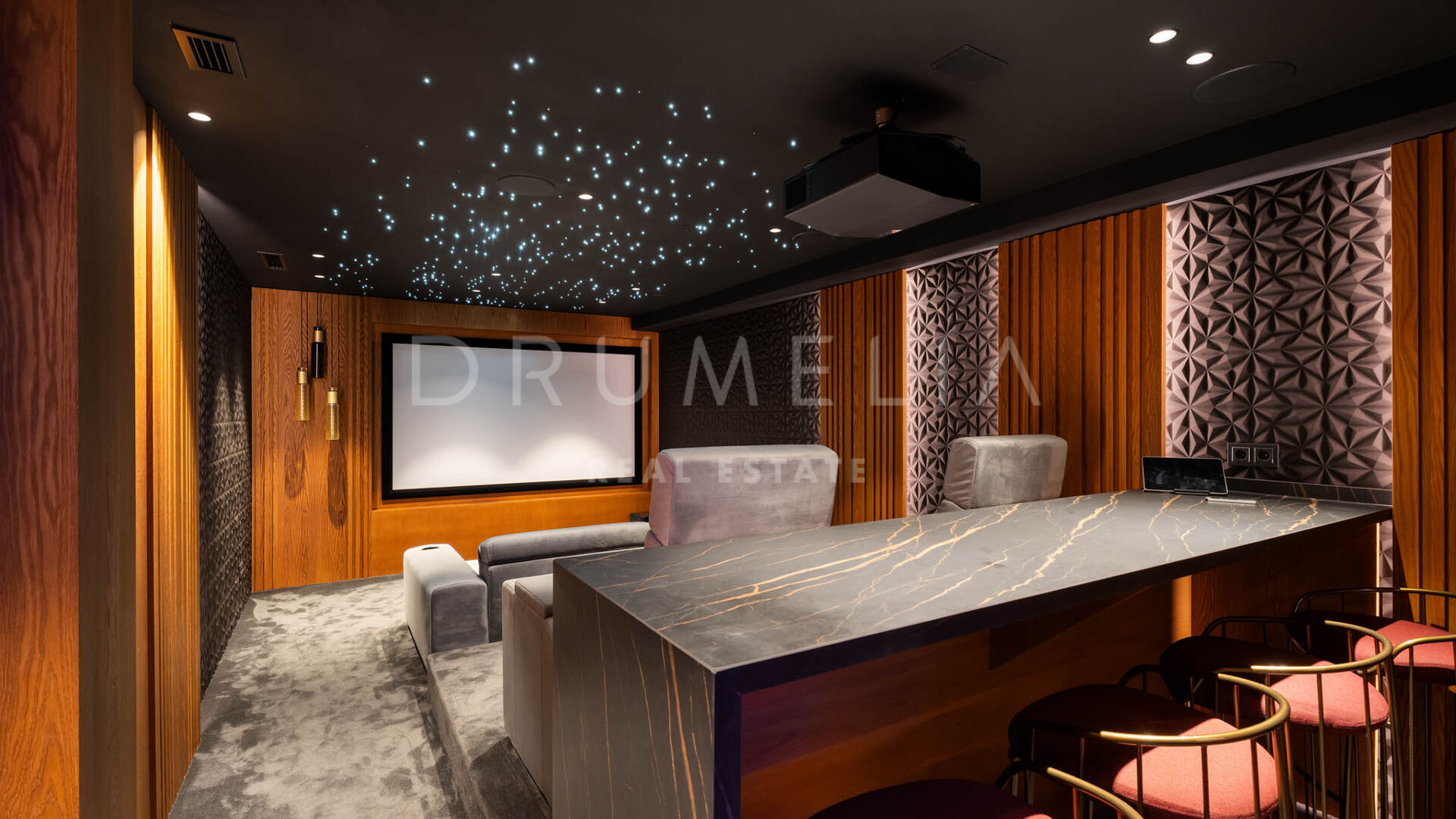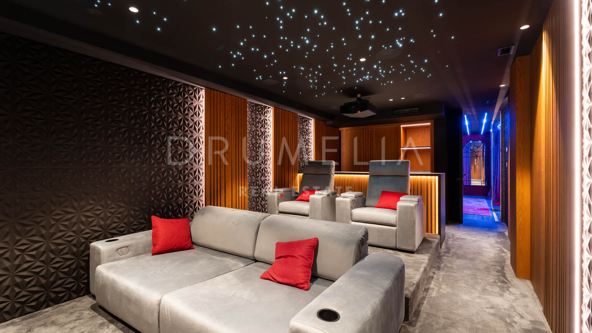 Underetasjen rommer velvære- og underholdningsområder, inkludert kinorom, treningsrom, badstue og en egen sone for sosiale sammenkomster. Eiendommen har også en stor garasje med dreieplattformer som gjør manøvrering enklere.