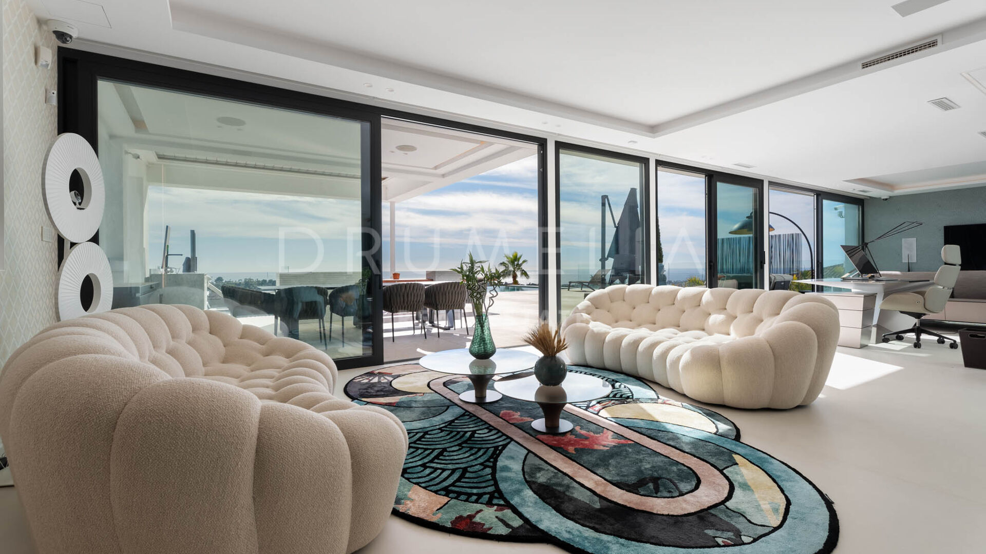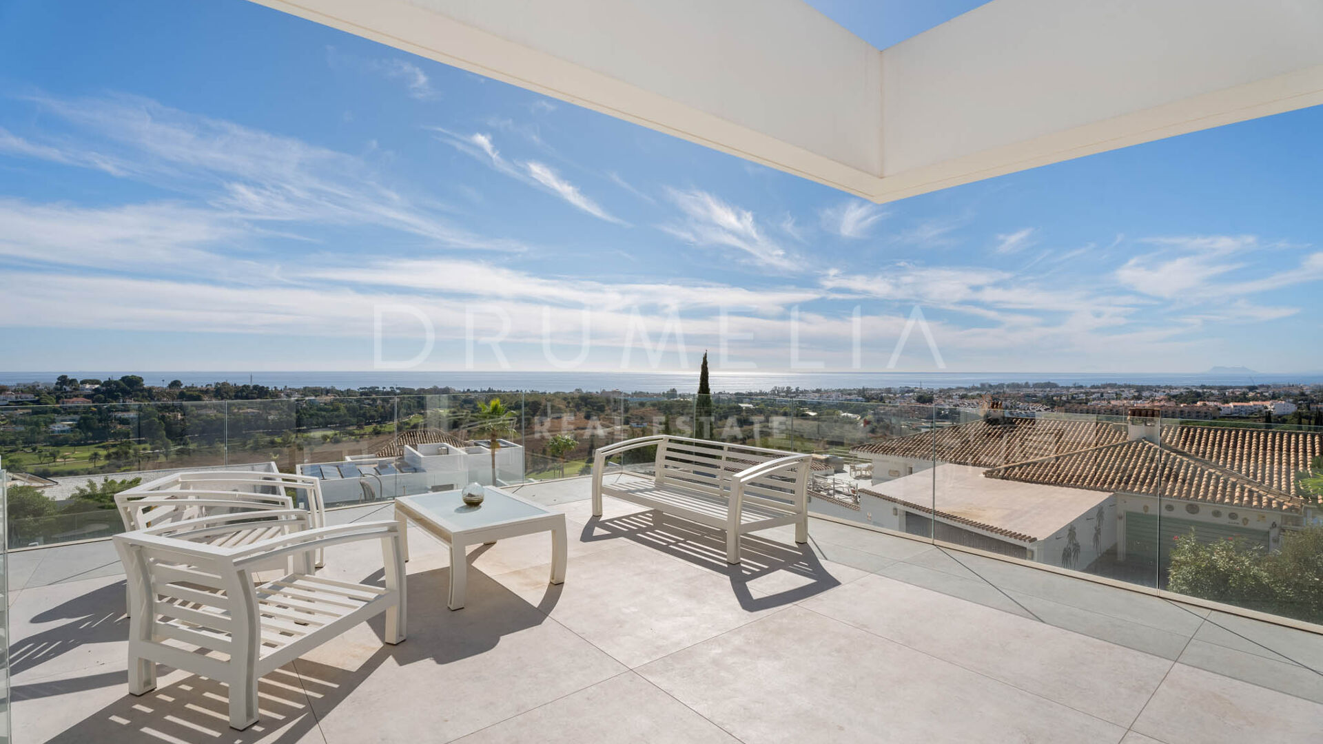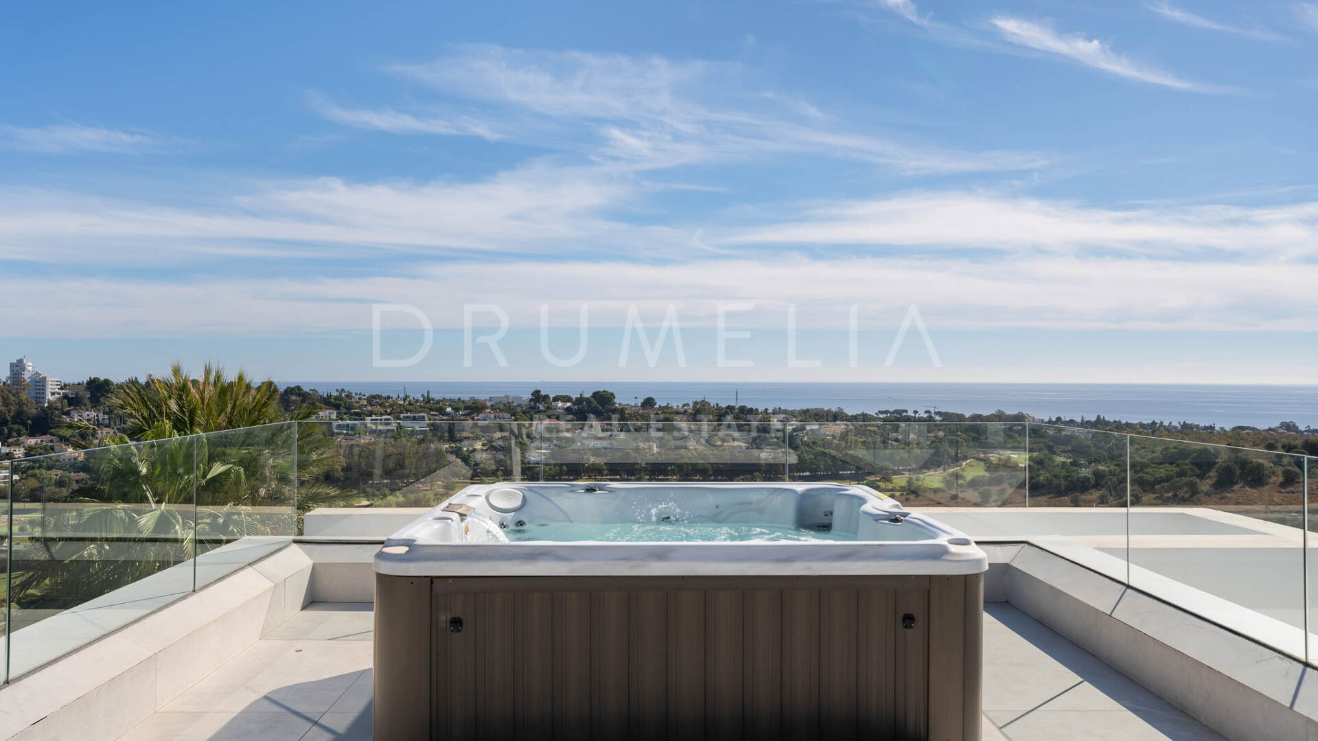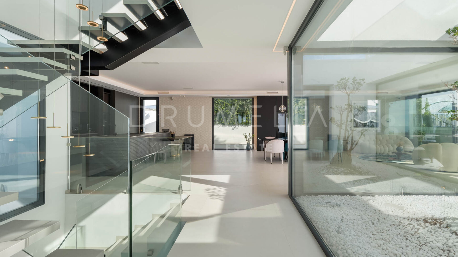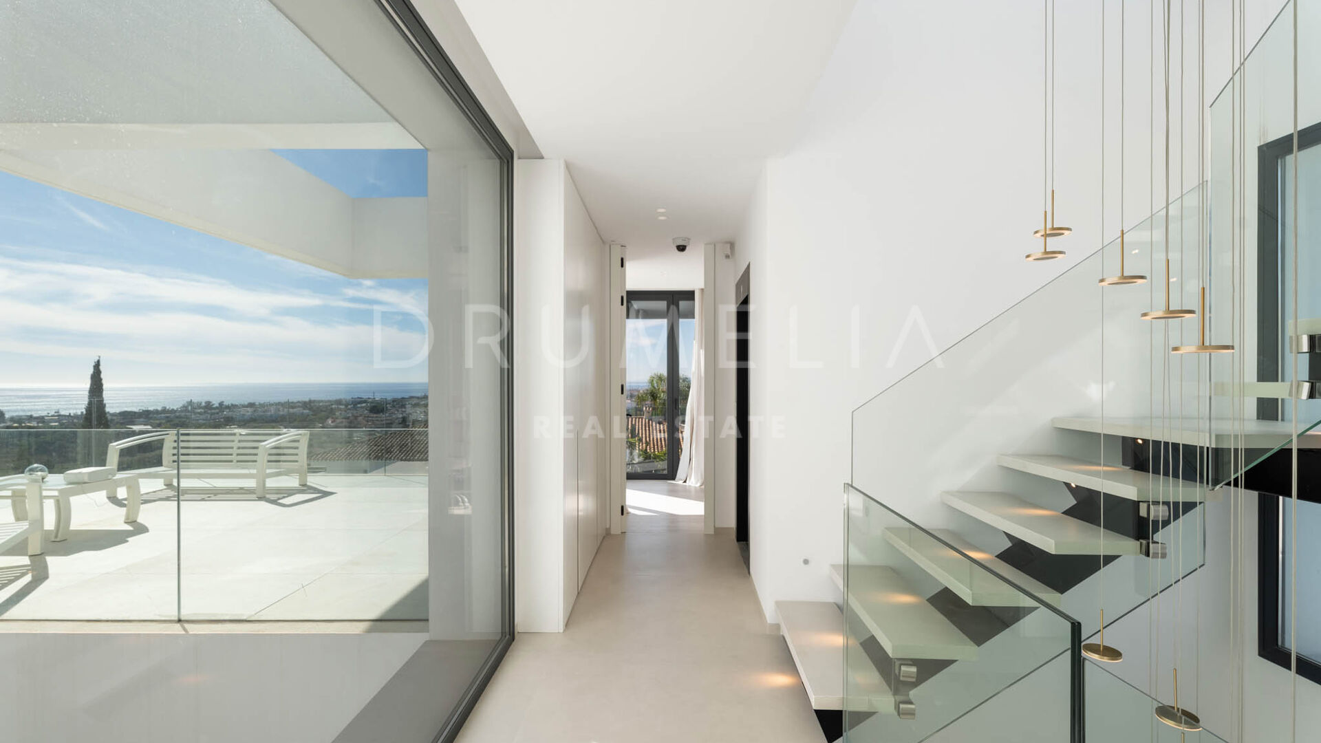 Denne designervillaen i Paraiso Alto presenteres som en moderne bolig skapt for dem som søker privatliv, romslighet og en direkte forbindelse med omgivelsene. Den forhøyede beliggenheten gir utsikt over El Paraíso Golf, Middelhavet, Gibraltar, den afrikanske kystlinjen og La Concha-fjellet fra flere rom og utendørsområder, noe som skaper en særegen visuell opplevelse.