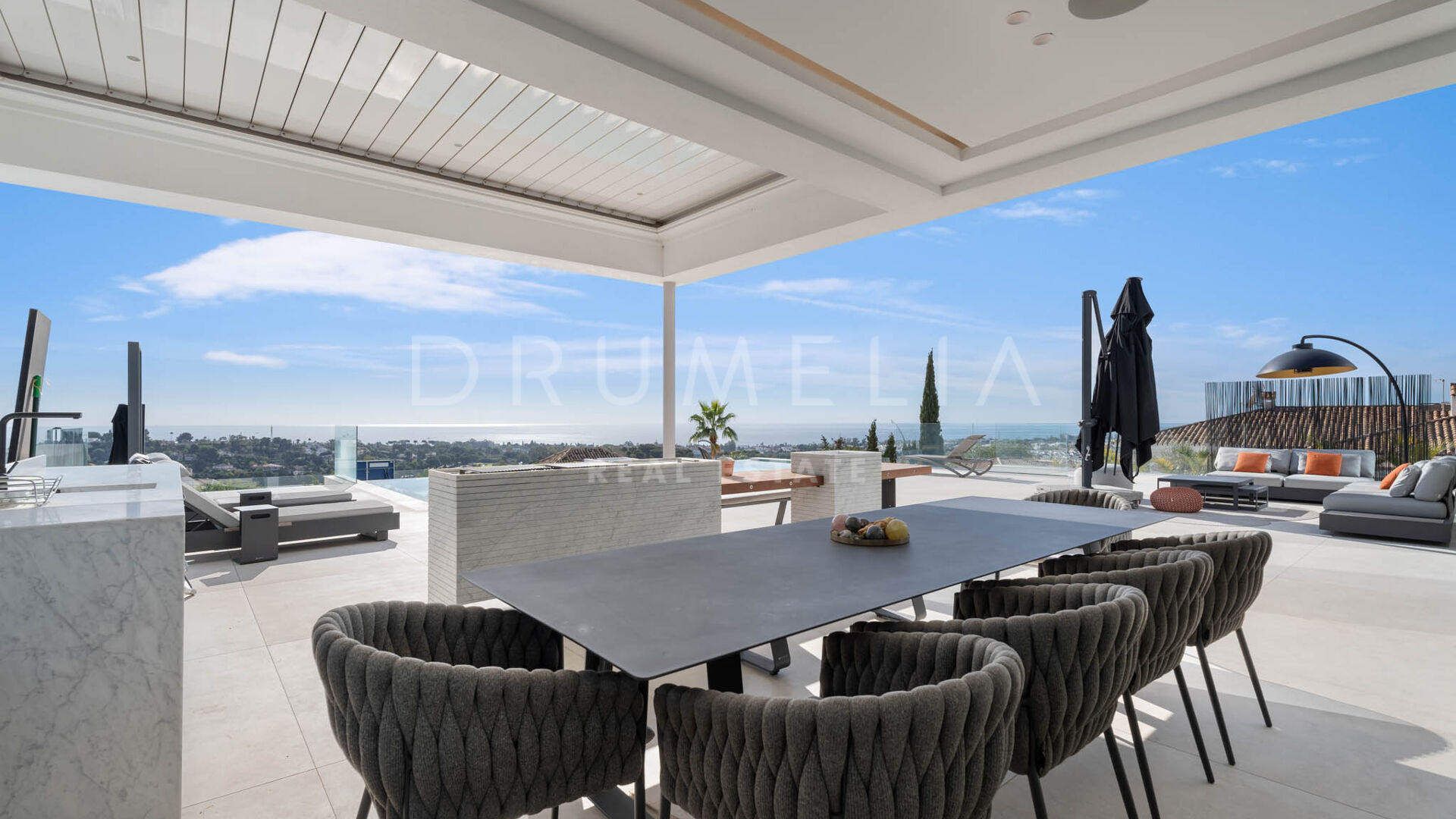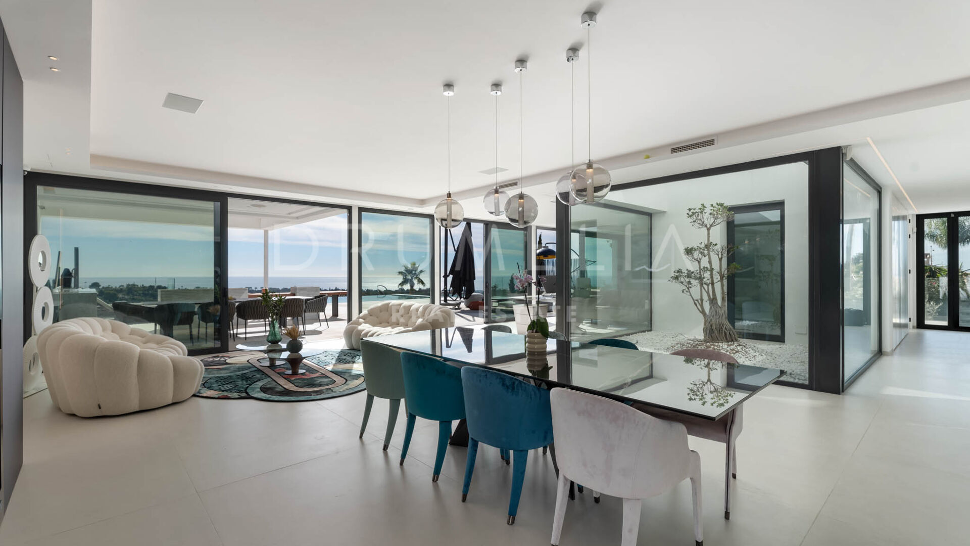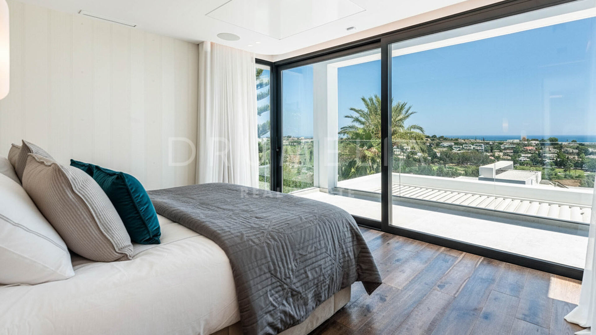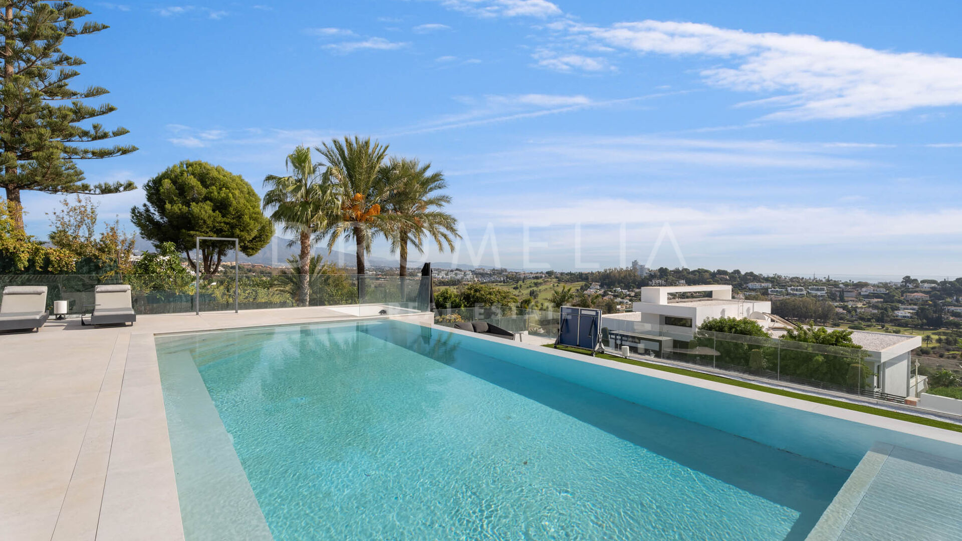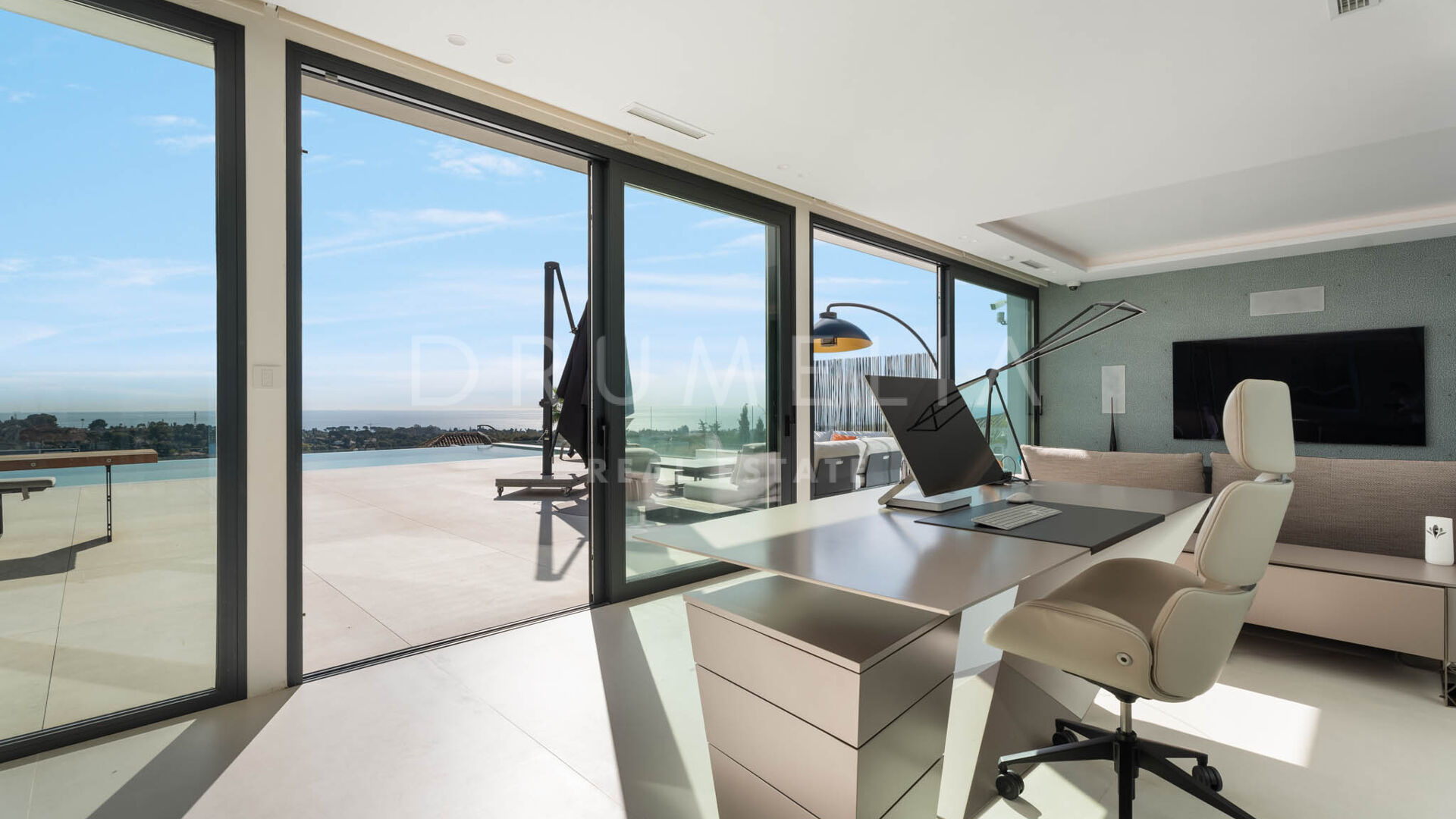 Denne designervillaen i Paraiso Alto presenteres som en moderne bolig skapt for dem som søker privatliv, romslighet og en direkte forbindelse med omgivelsene. Den forhøyede beliggenheten gir utsikt over El Paraíso Golf, Middelhavet, Gibraltar, den afrikanske kystlinjen og La Concha-fjellet fra flere rom og utendørsområder, noe som skaper en særegen visuell opplevelse.