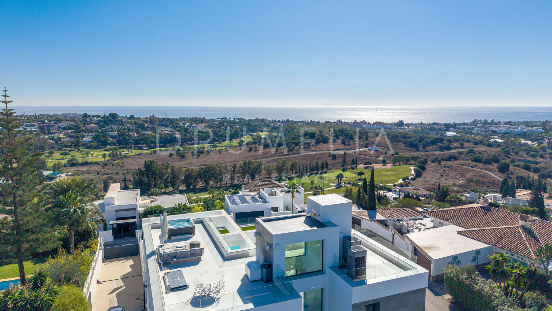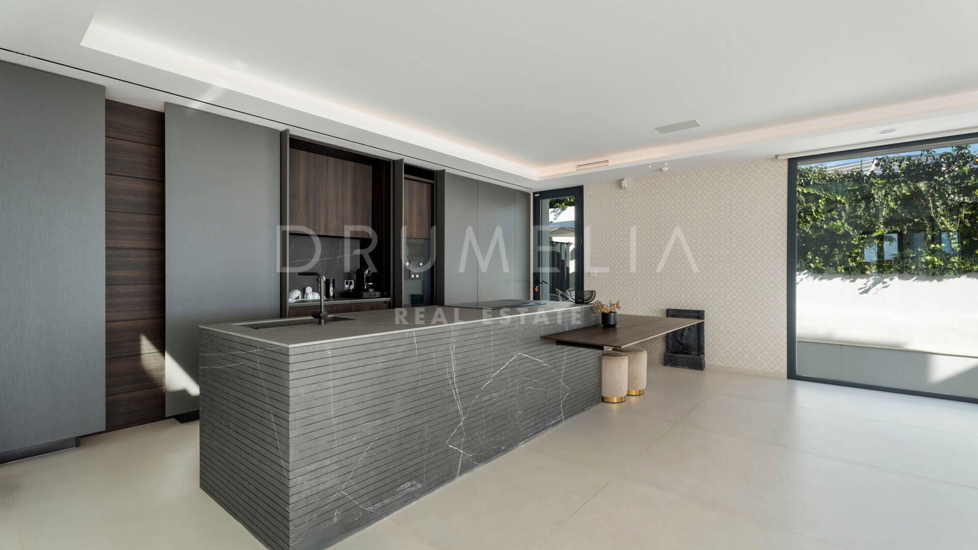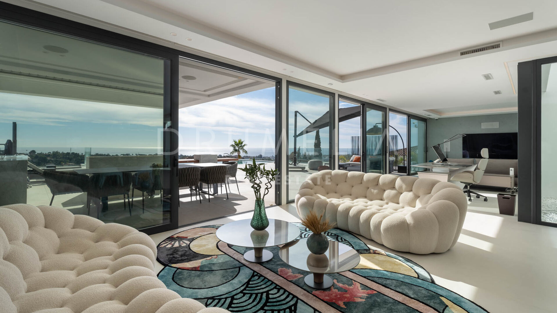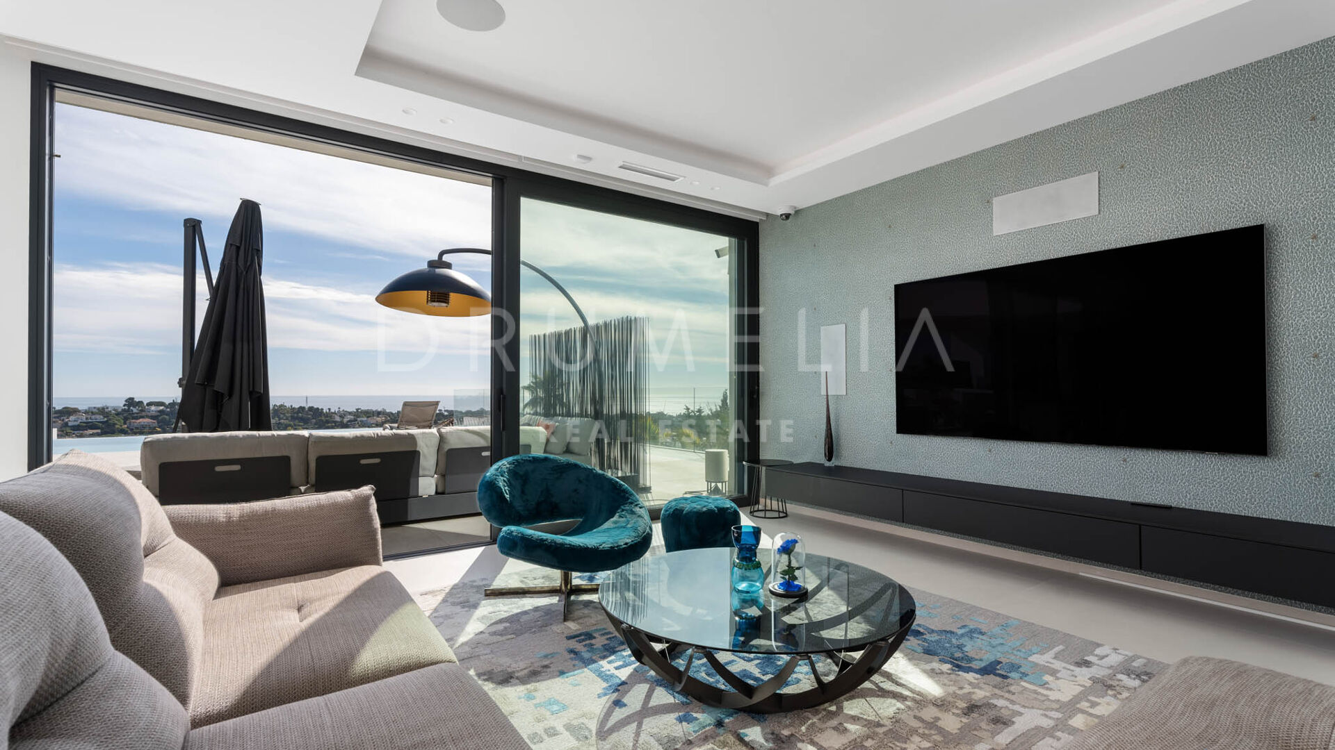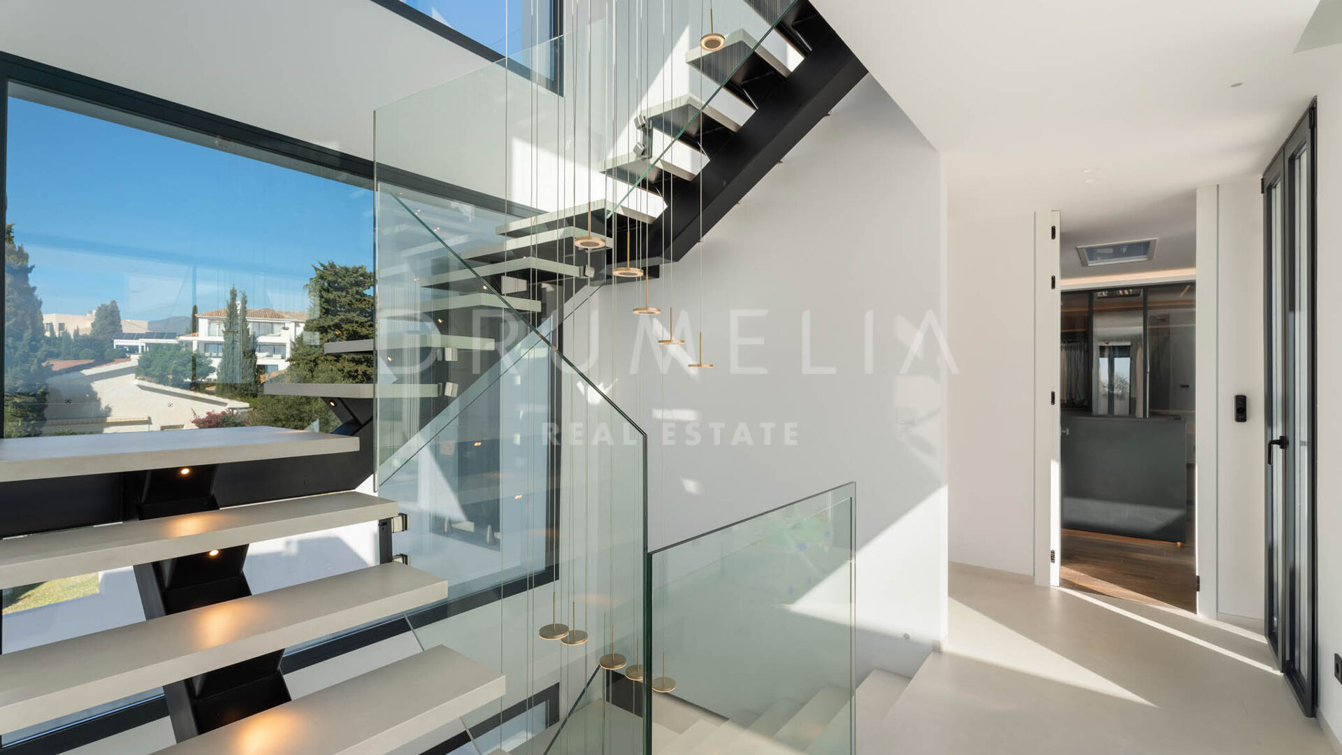 Denne designervillaen i Paraiso Alto presenteres som en moderne bolig skapt for dem som søker privatliv, romslighet og en direkte forbindelse med omgivelsene. Den forhøyede beliggenheten gir utsikt over El Paraíso Golf, Middelhavet, Gibraltar, den afrikanske kystlinjen og La Concha-fjellet fra flere rom og utendørsområder, noe som skaper en særegen visuell opplevelse.
