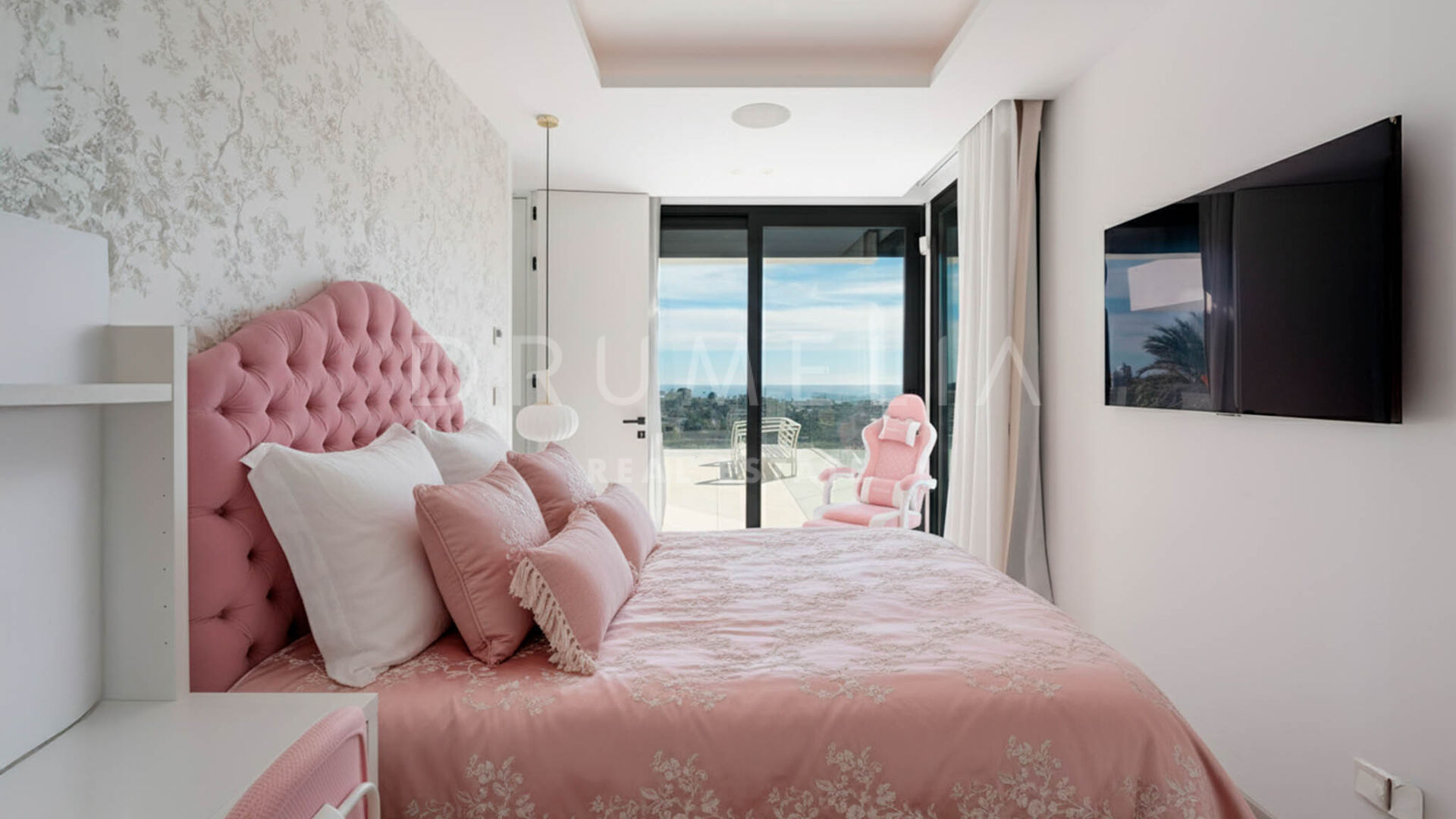 Villaen tilbyr seks soverom, alle med egne bad designet for komfort og privatliv. Hovedsuiten har havutsikt og tilgang til en privat terrasse. Den øverste etasjen inkluderer et solarium med jacuzzi og panoramautsikt som strekker seg fra golfbanen til Afrika, og gir et dedikert sted for å nyte omgivelsene fra eiendommens høyeste punkt.