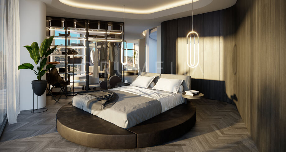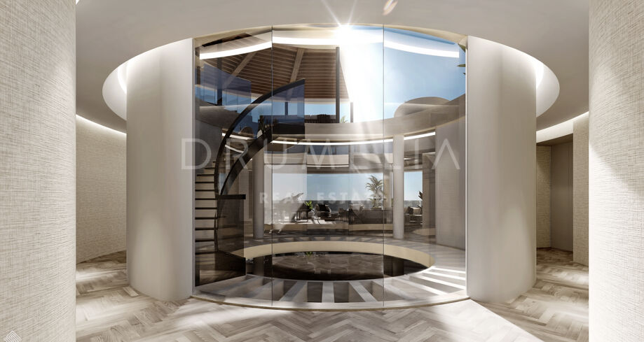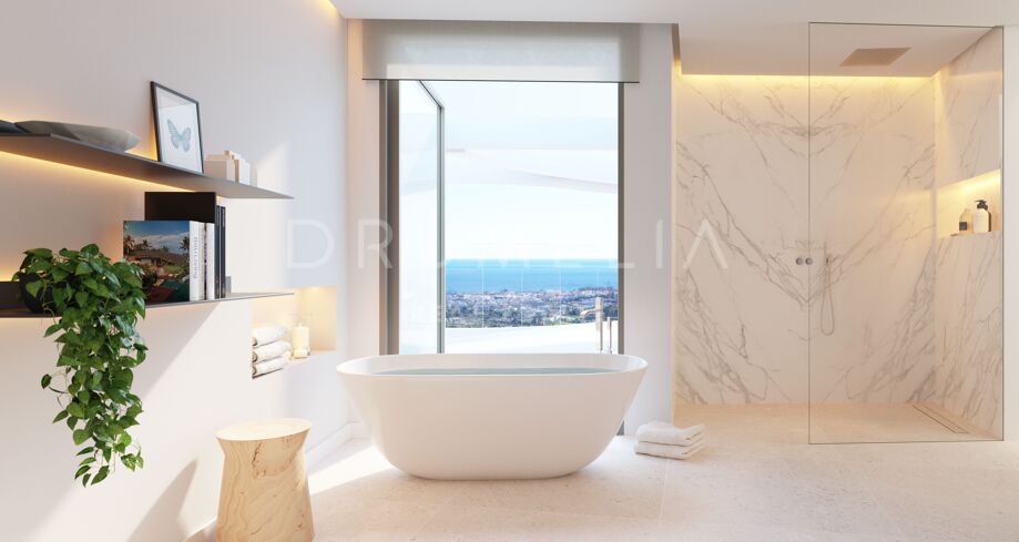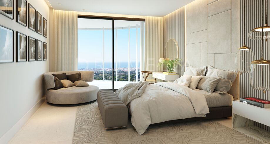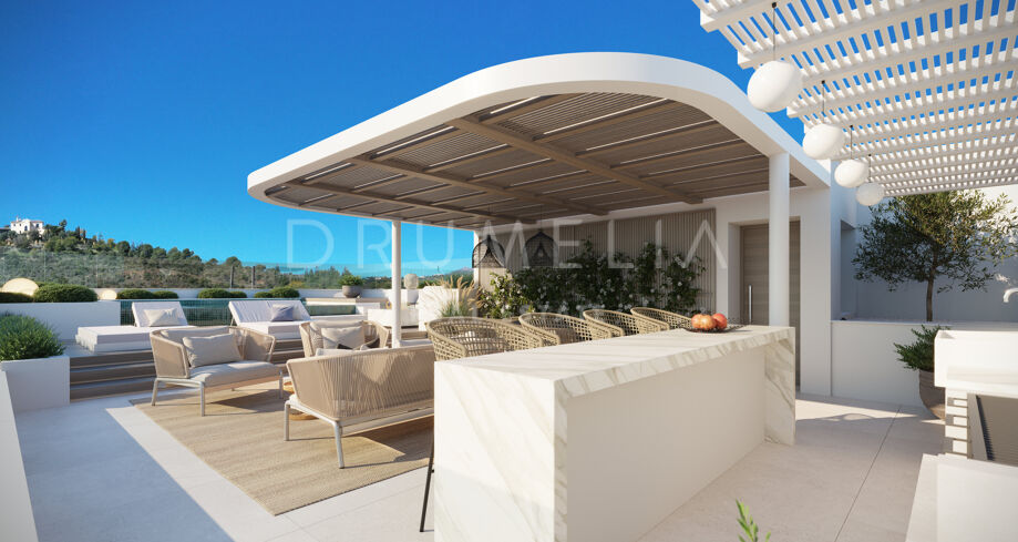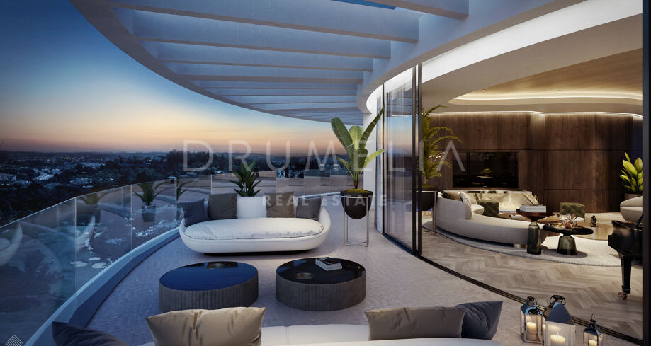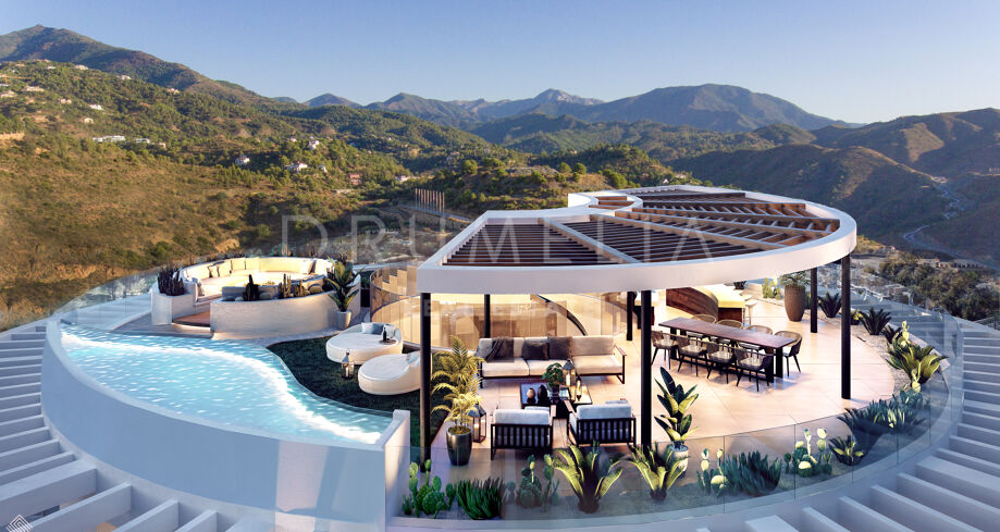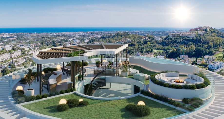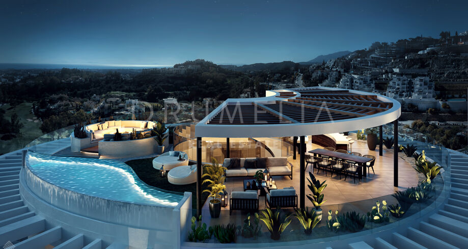 Dupleks toppleilighet til salgs i The View Marbella, Benahavis med 4 soverom, 4 baderom, 4 baderom med eget bad, 1 toalett, innebygd 2022 og har basseng (felles), garasje (felles) og hage (felles). Dimensjoner: 450m² bygget, 218m² interiør og 230m² terrasse.