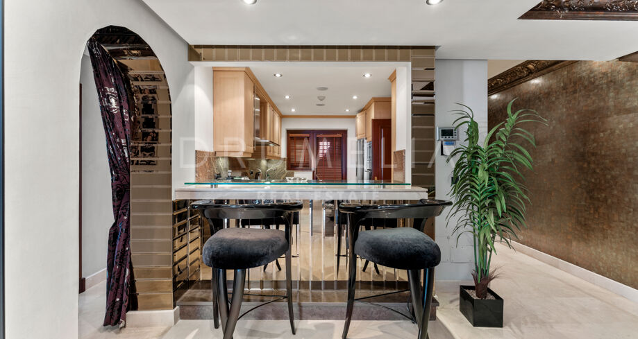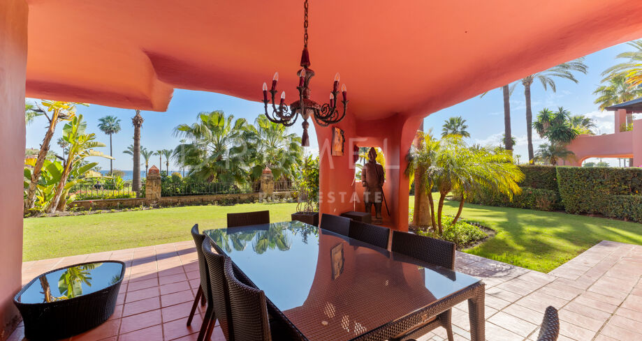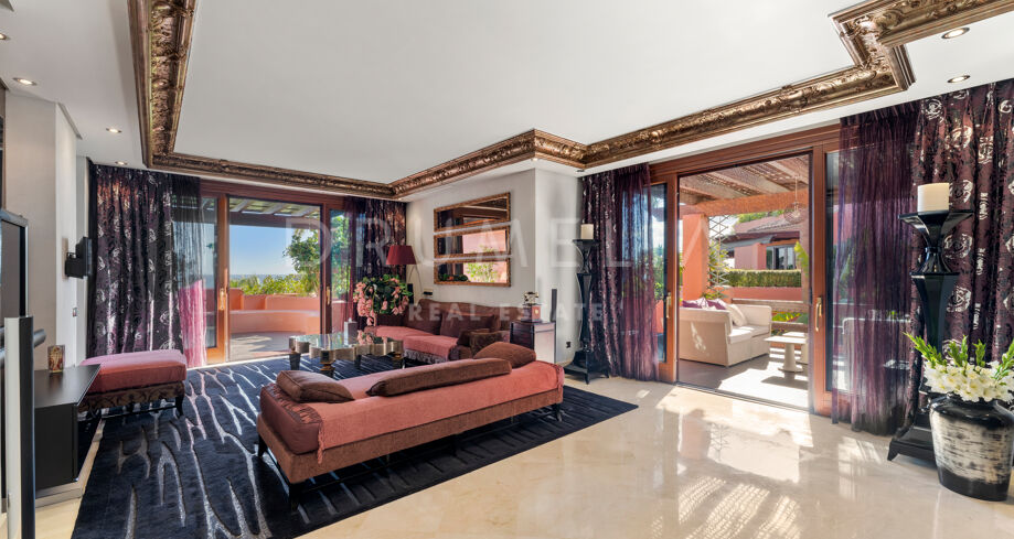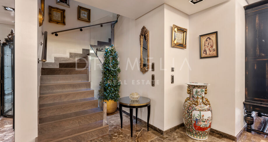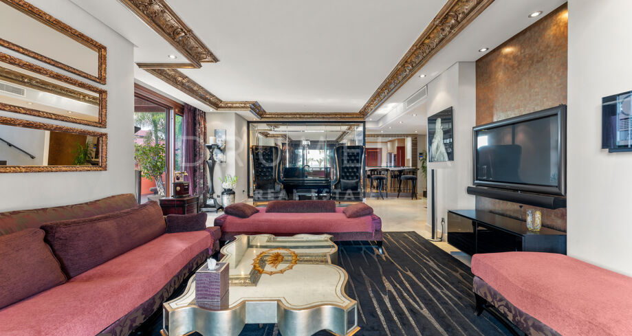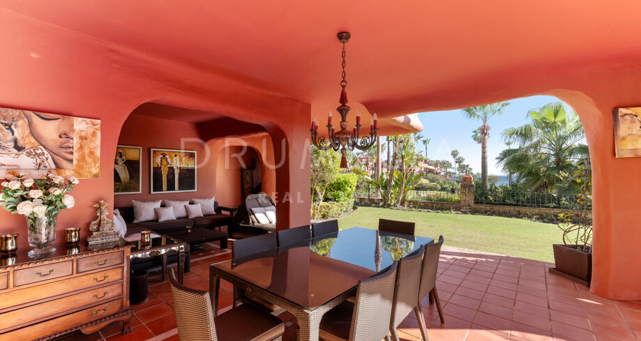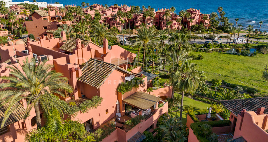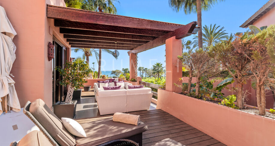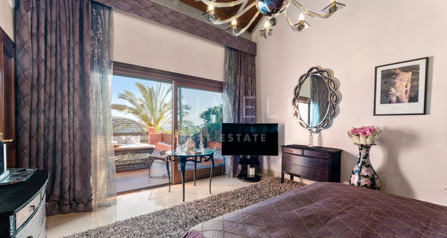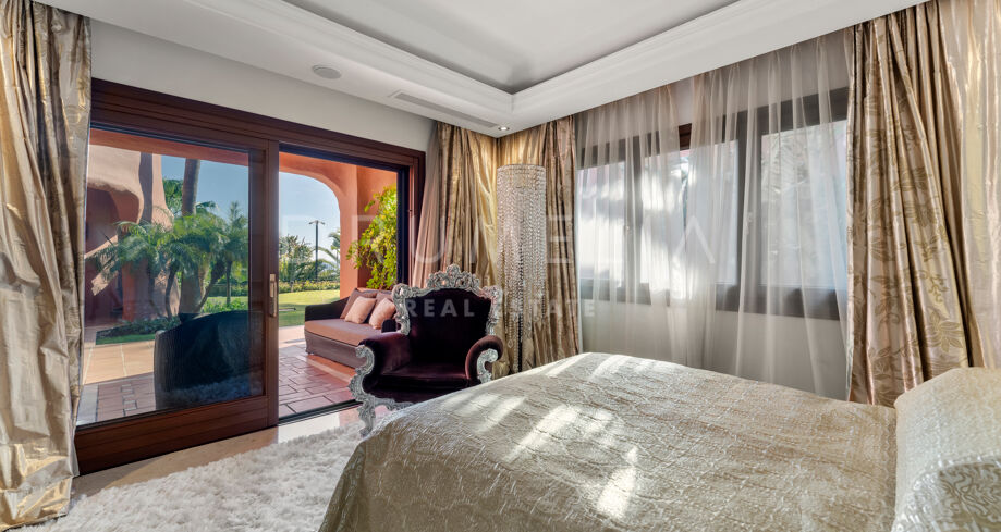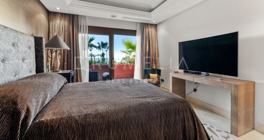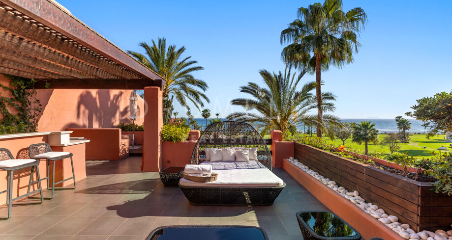 Denne unike triplexleiligheten ved stranden ligger i det ettertraktede boligkomplekset Torre Bermeja på Esteponas New Golden Mile. Med direkte tilgang til stranden og fantastisk havutsikt, tilbyr den et komfortabelt og stilig bomiljø over tre plan. Boligen har to separate innganger, to romslige stuer med spiseplass, seks soverom med eget bad og seks private terrasser, inkludert et hageområde som er perfekt for utendørs avslapning. De fullt utstyrte kjøkkenene innendørs og utendørs er utstyrt med hvitevarer av høy kvalitet.