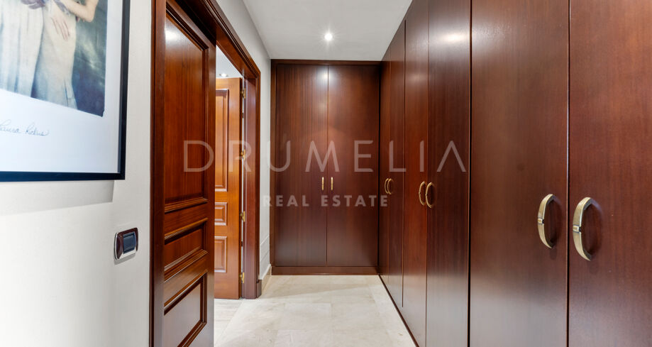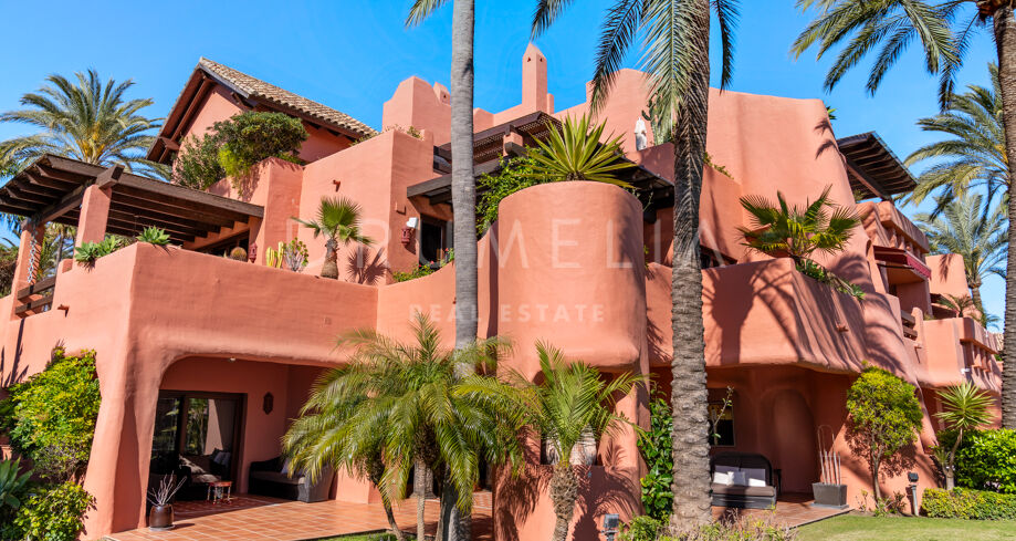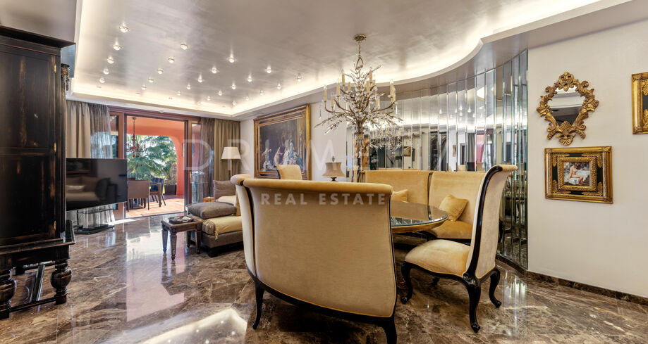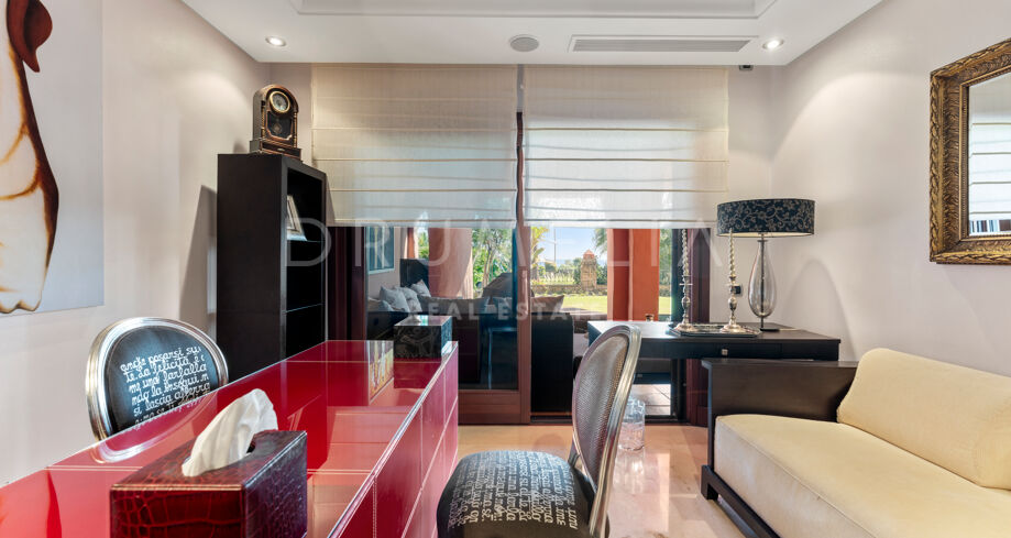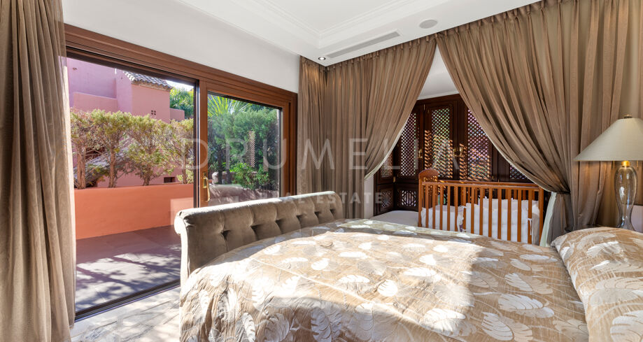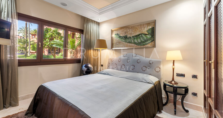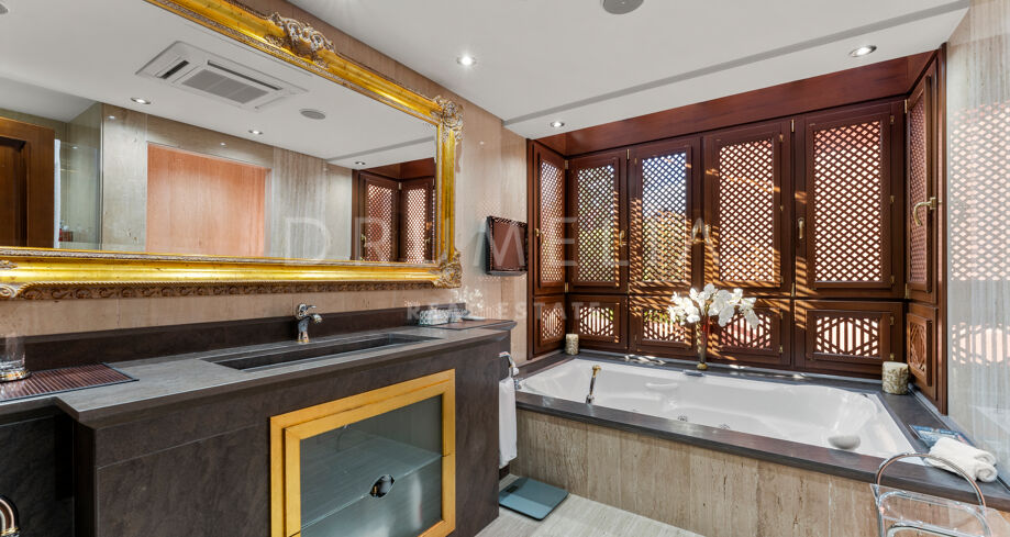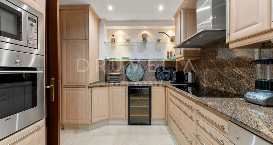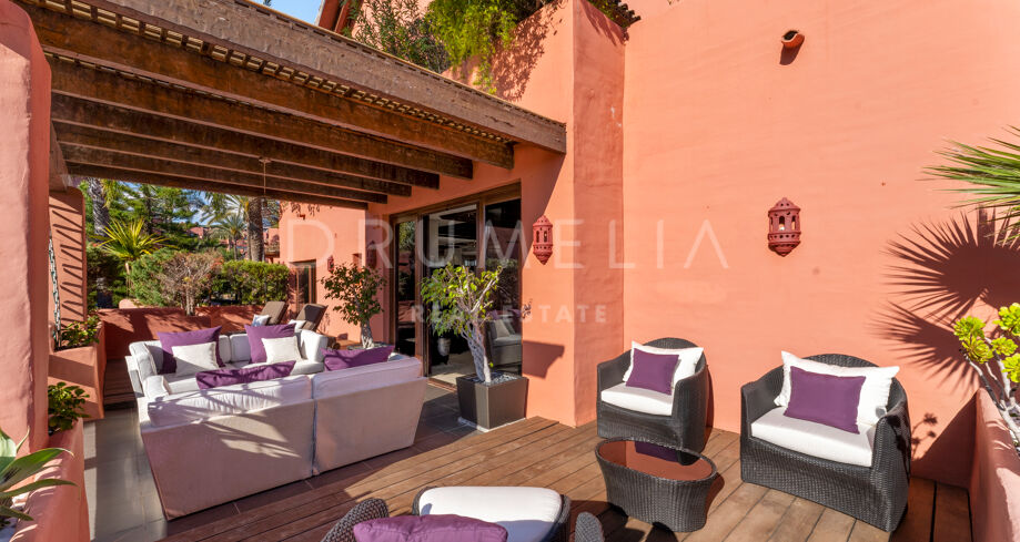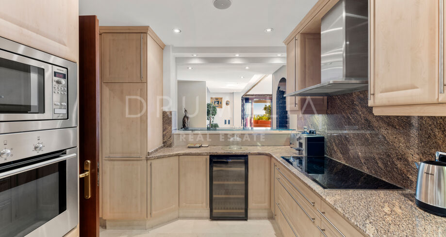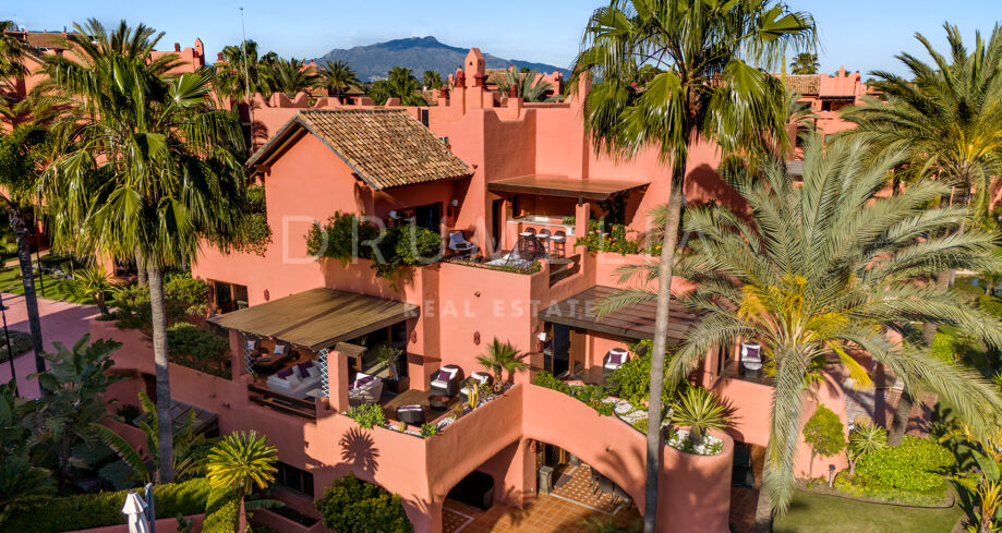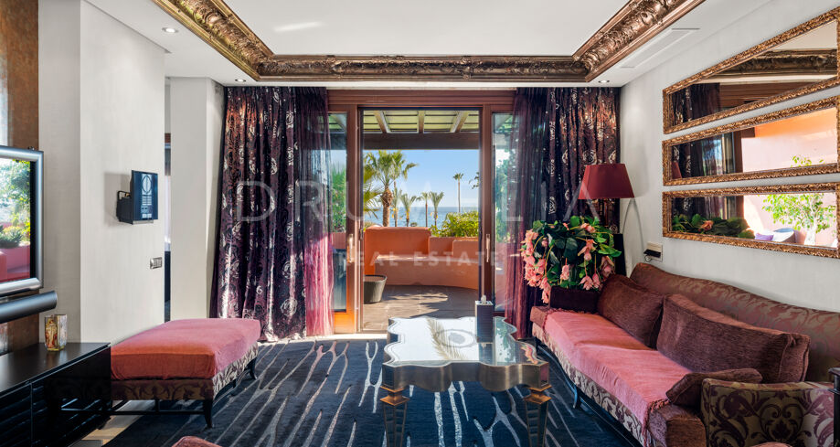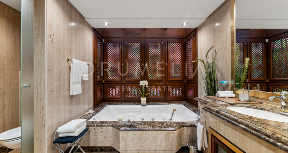 Denne unike triplexleiligheten ved stranden ligger i det ettertraktede boligkomplekset Torre Bermeja på Esteponas New Golden Mile. Med direkte tilgang til stranden og fantastisk havutsikt, tilbyr den et komfortabelt og stilig bomiljø over tre plan. Boligen har to separate innganger, to romslige stuer med spiseplass, seks soverom med eget bad og seks private terrasser, inkludert et hageområde som er perfekt for utendørs avslapning. De fullt utstyrte kjøkkenene innendørs og utendørs er utstyrt med hvitevarer av høy kvalitet.