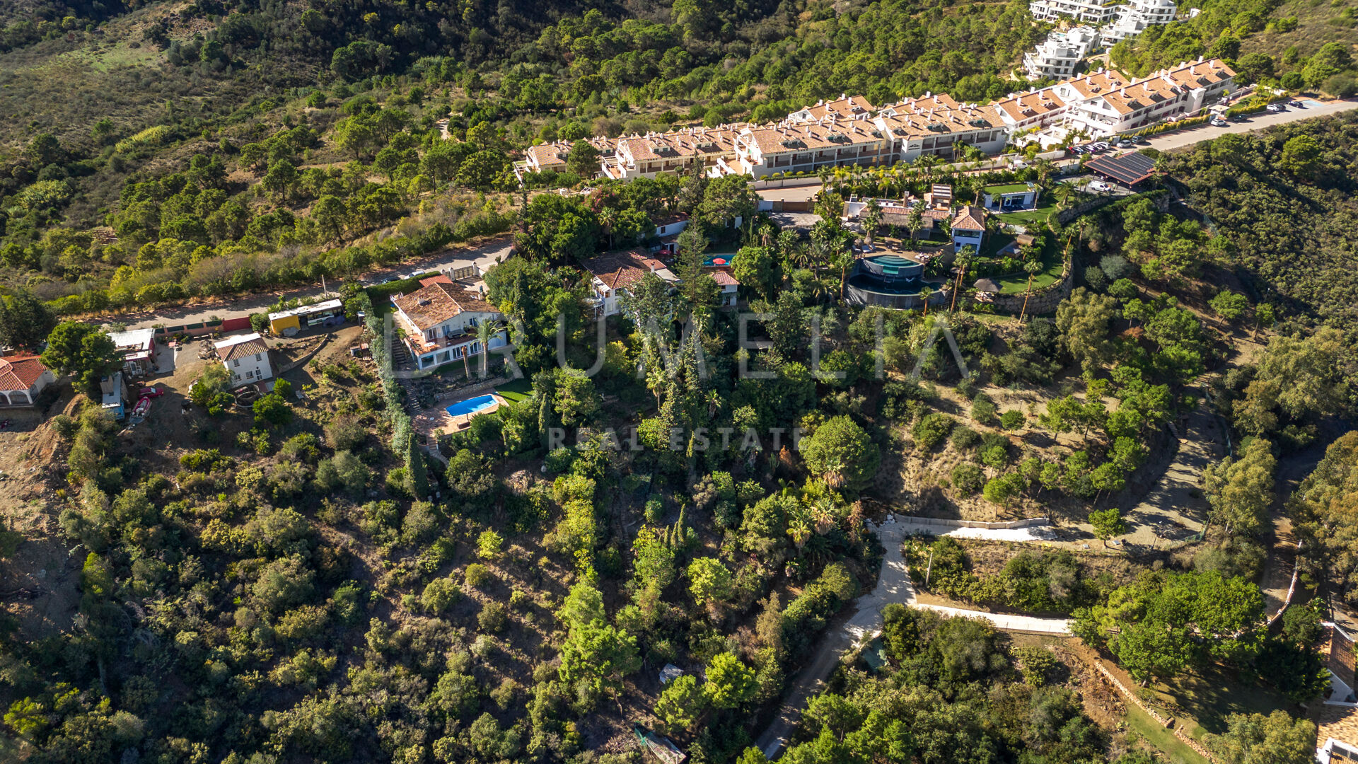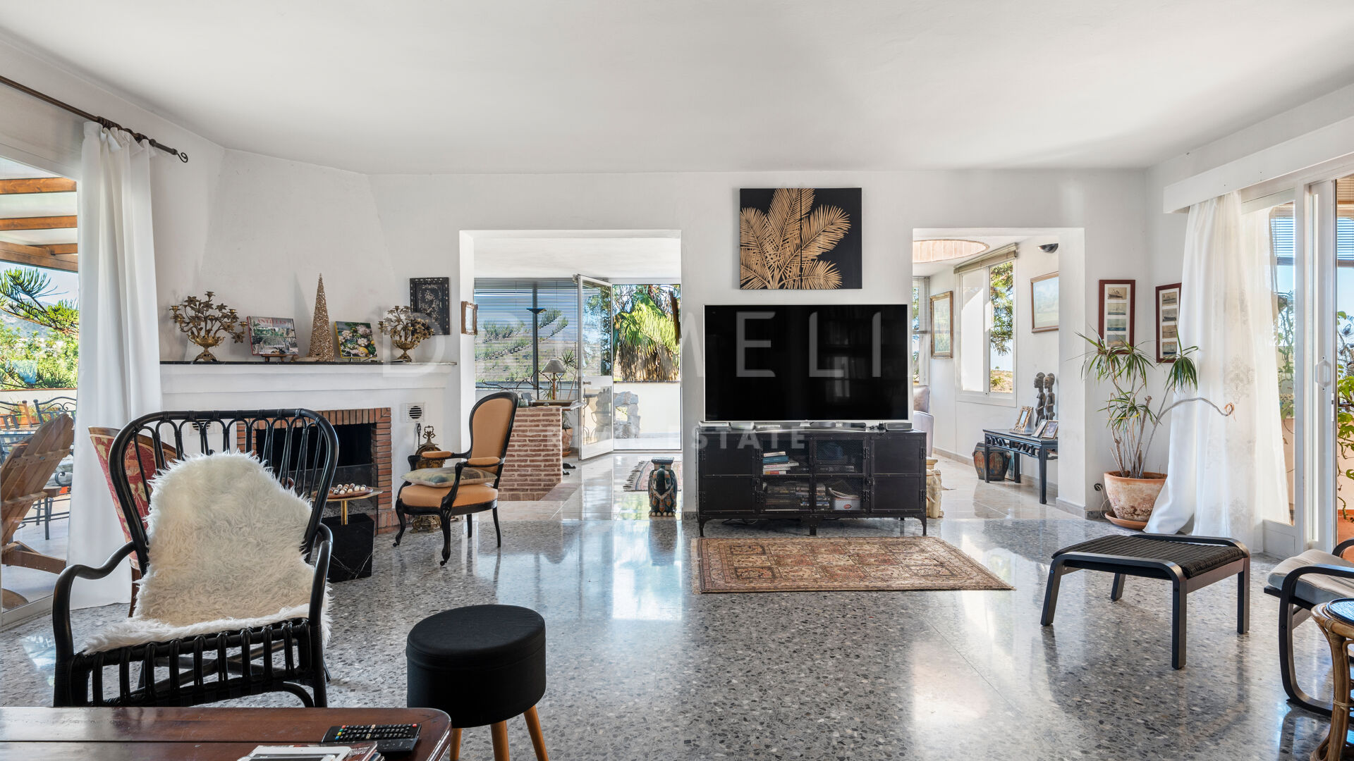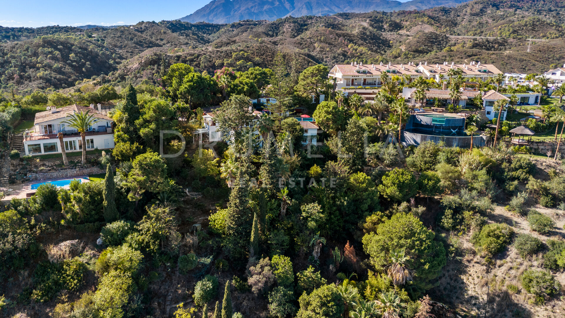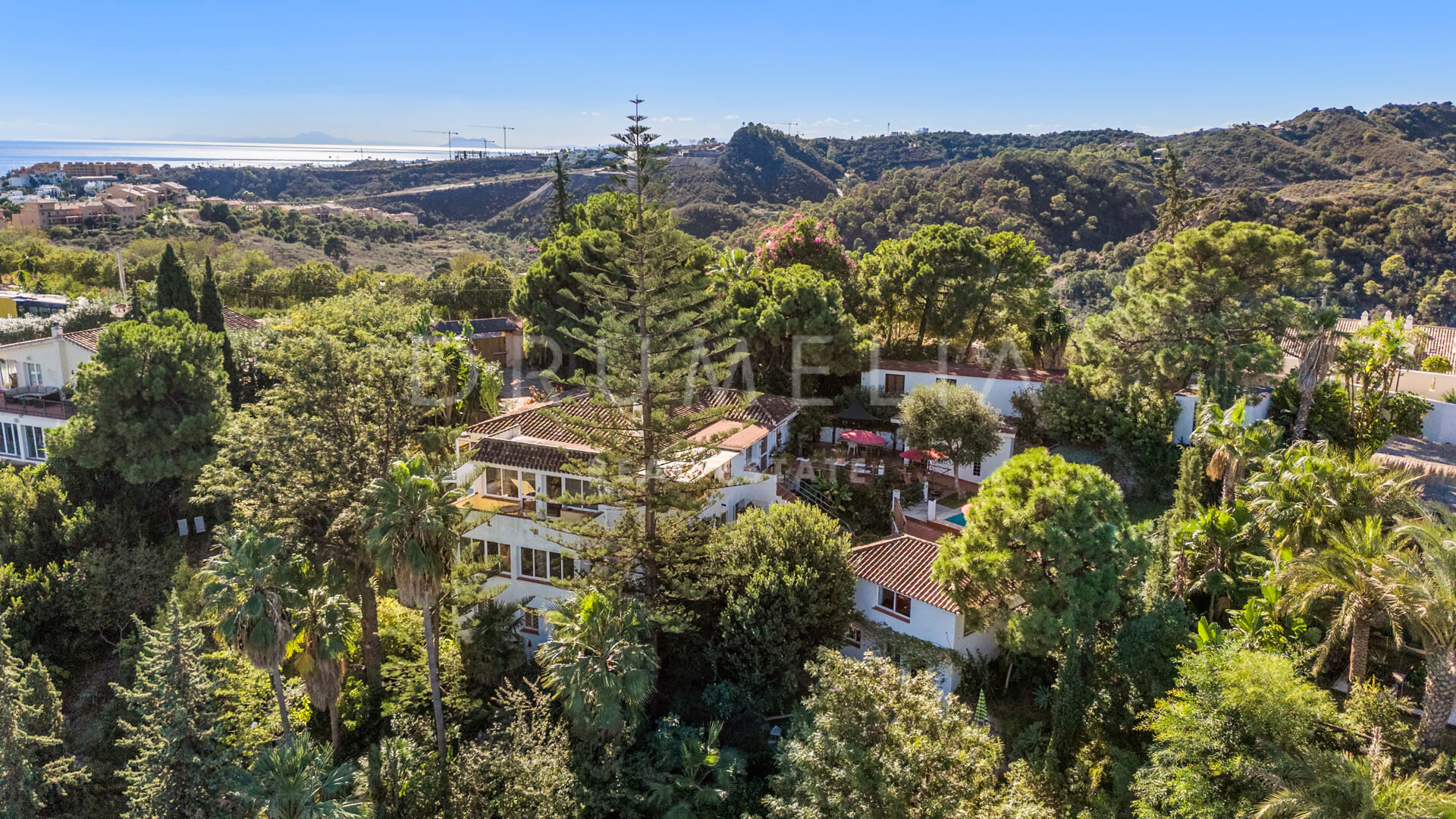Umgeben von üppigem Grün und Luxusimmobilien im modernen/zeitgenössischen oder klassischen andalusischen/mediterranen Design liegt das 708 m² große Haus auf einem beeindruckenden Grundstück von 5.800 m². Wenn Sie die Weite dieses Grundstücks betreten, werden Sie von einem Gefühl der Ruhe umhüllt. Der Panoramablick ist endlos, Grüntöne bilden eine faszinierende Kulisse und saphirfarbene Töne gehen am Horizont nahtlos ineinander über. Die Immobilie wird in einem guten Zustand und mit großem Potenzial verkauft. Nach einigen Renovierungsarbeiten kann es Ihr Traumhaus an der Costa del Sol werden. Es verfügt über 6 Schlafzimmer (insgesamt) und 6 Bäder, eine funktionelle Küche, die mit kleinen Mosaikfliesen in leuchtenden Farben revitalisiert wurde, Ess- und Wohnzimmer, Büro, Abstell- und Waschräume, Garage, etc. Es gibt ein kleines, unabhängiges Gästehaus mit einem Schlafzimmer, einem Badezimmer, einem Wohnzimmer, einer kleinen Küche und einer Terrasse mit Blick auf die Landschaft und das Meer. Dies ist die perfekte Lösung für die Unterbringung von Mitarbeitern oder Gästen, wobei deren Privatsphäre und Komfort gewährleistet ist.