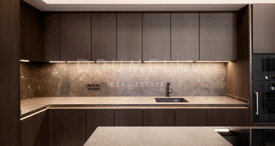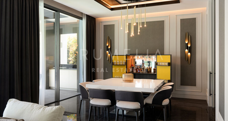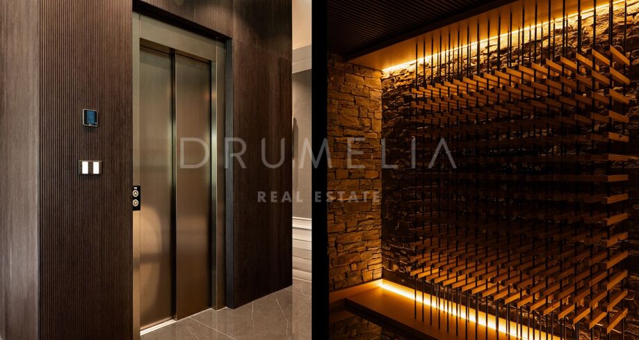 Die Villa erstreckt sich über vier großzügige Etagen, die durch einen Aufzug mit goldener Veredelung verbunden sind. Sie bietet durchdachte Innenräume mit hohen Decken, maßgefertigten Details und einem fließenden Übergang zwischen Innen- und Außenbereich. Die Küche von Siematic ist mit Geräten von Gaggenau ausgestattet und verfügt über Schiebetüren, die vielseitige Nutzung ermöglichen.