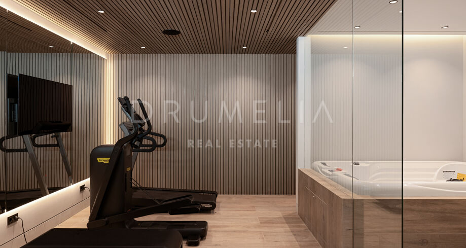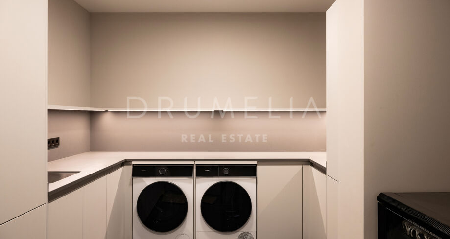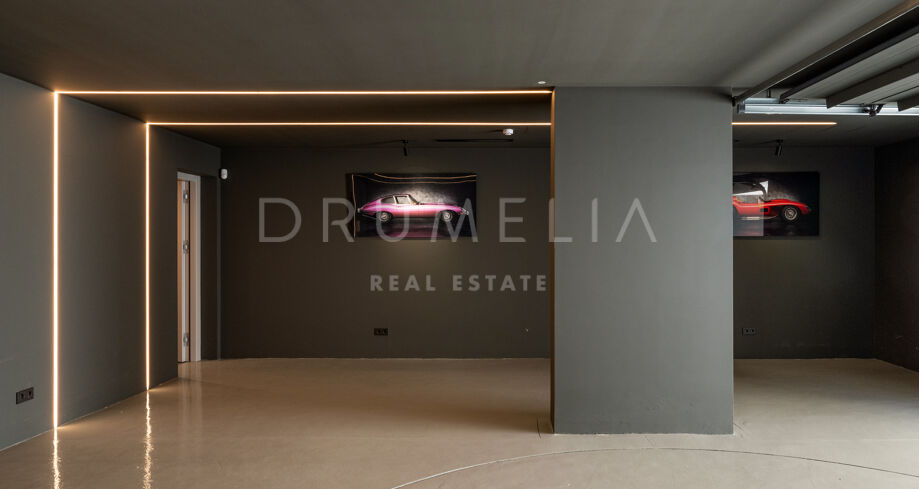 Bodentiefe Fenster öffnen sich zu einem angelegten Garten und einem 17 Meter langen beheizten Pool mit Solarabdeckung. Die Dachterrasse ist ideal für Abendessen im Freien, mit Panoramablick, Außenküche und Jacuzzi. Der Wellnessbereich umfasst ein privates Fitnessstudio, Sauna, Massageraum und einen klimatisierten Weinkeller. Ergänzt wird das Anwesen durch eine drehbare Plattform in der Garage, Ladestationen für Elektrofahrzeuge und ein vollständig über eine App steuerbares Smart-Home-System.