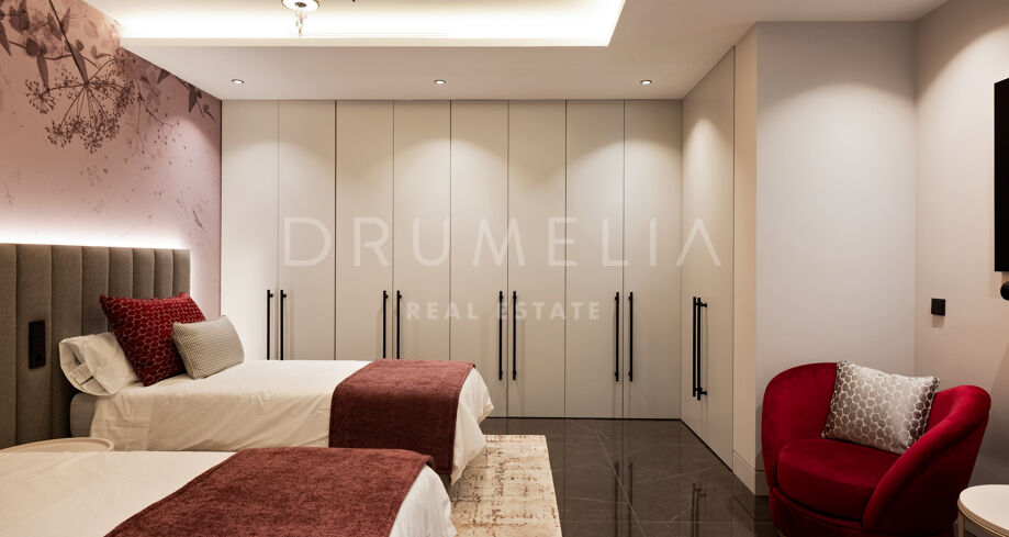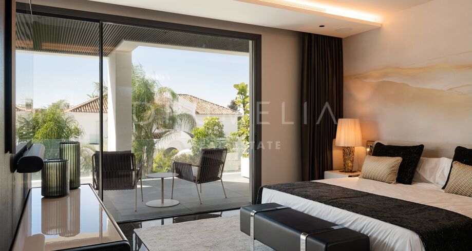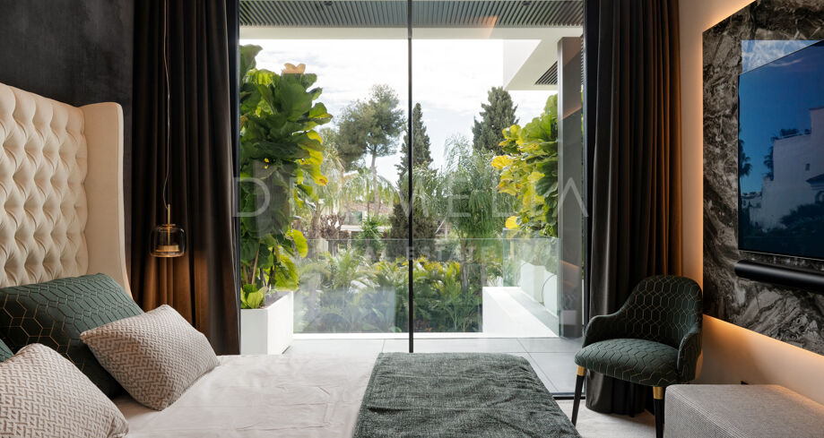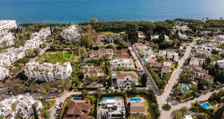 In einer der exklusivsten Wohngegenden direkt am Meer in Marbella gelegen, vereint diese außergewöhnliche Fünf-Schlafzimmer-Villa anspruchsvolles Design mit modernster Technologie. Nur wenige Schritte vom Strand, dem Marbella Club und der Altstadt entfernt, befindet sich das Anwesen in einer geschlossenen Wohnanlage, umgeben von hohen Pinien und üppigem Grün – eine Oase der Ruhe und Privatsphäre.