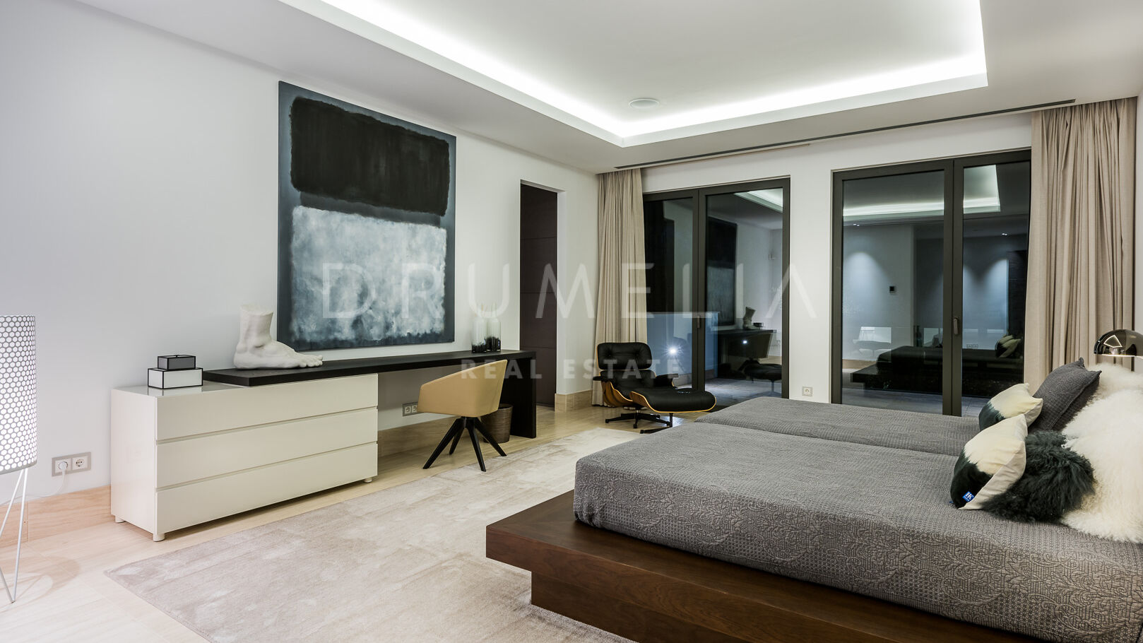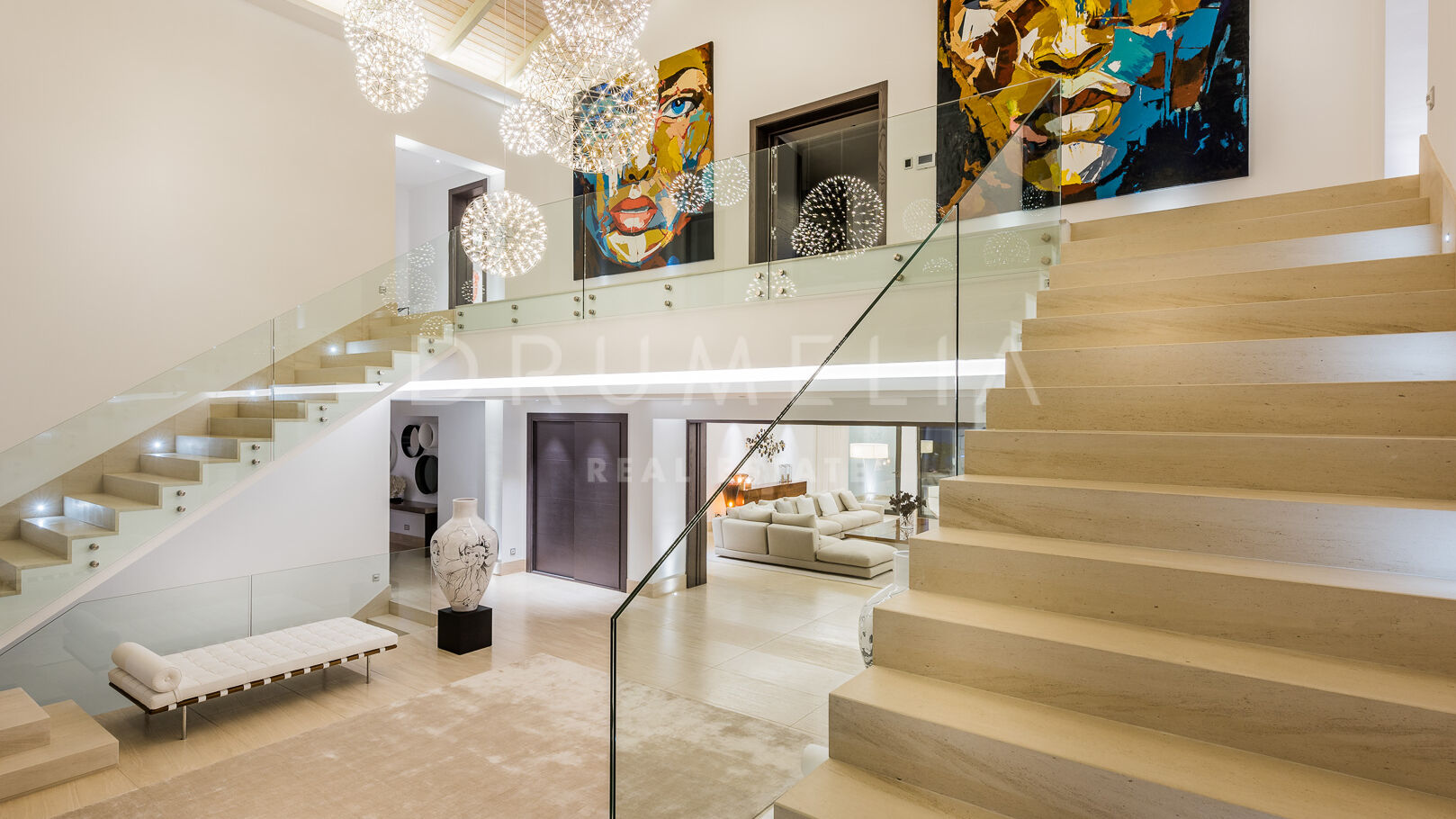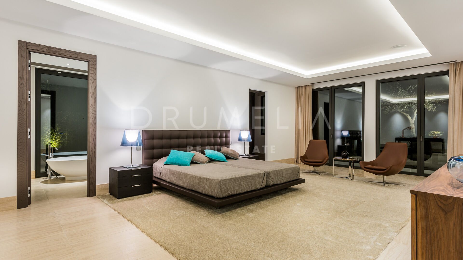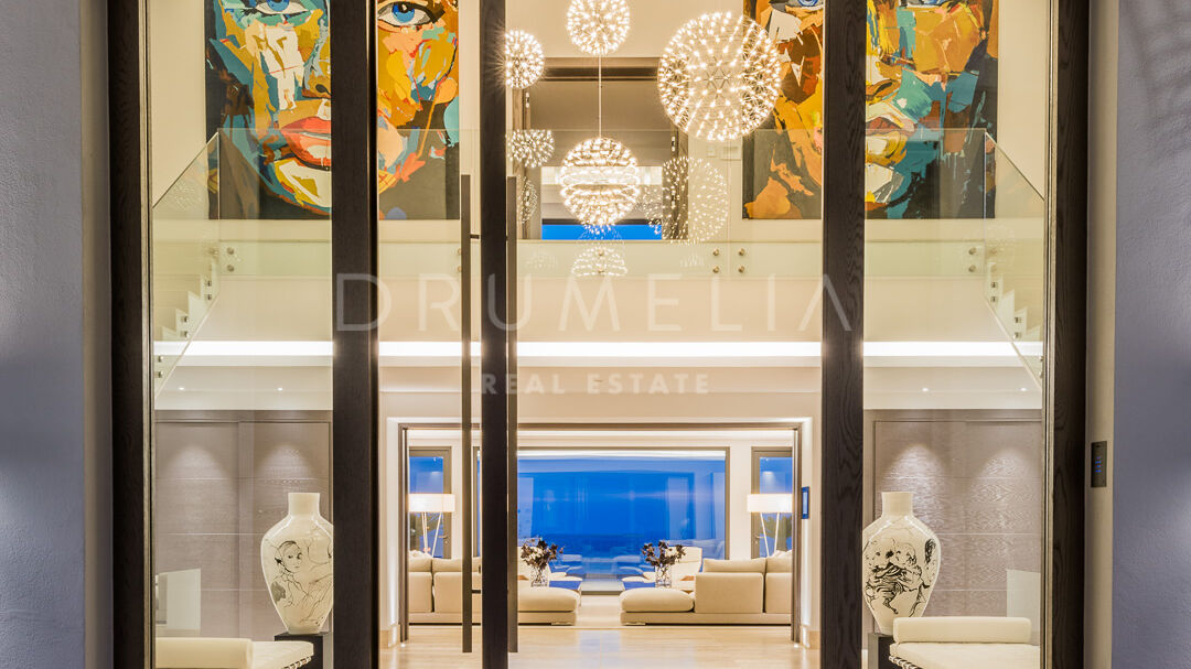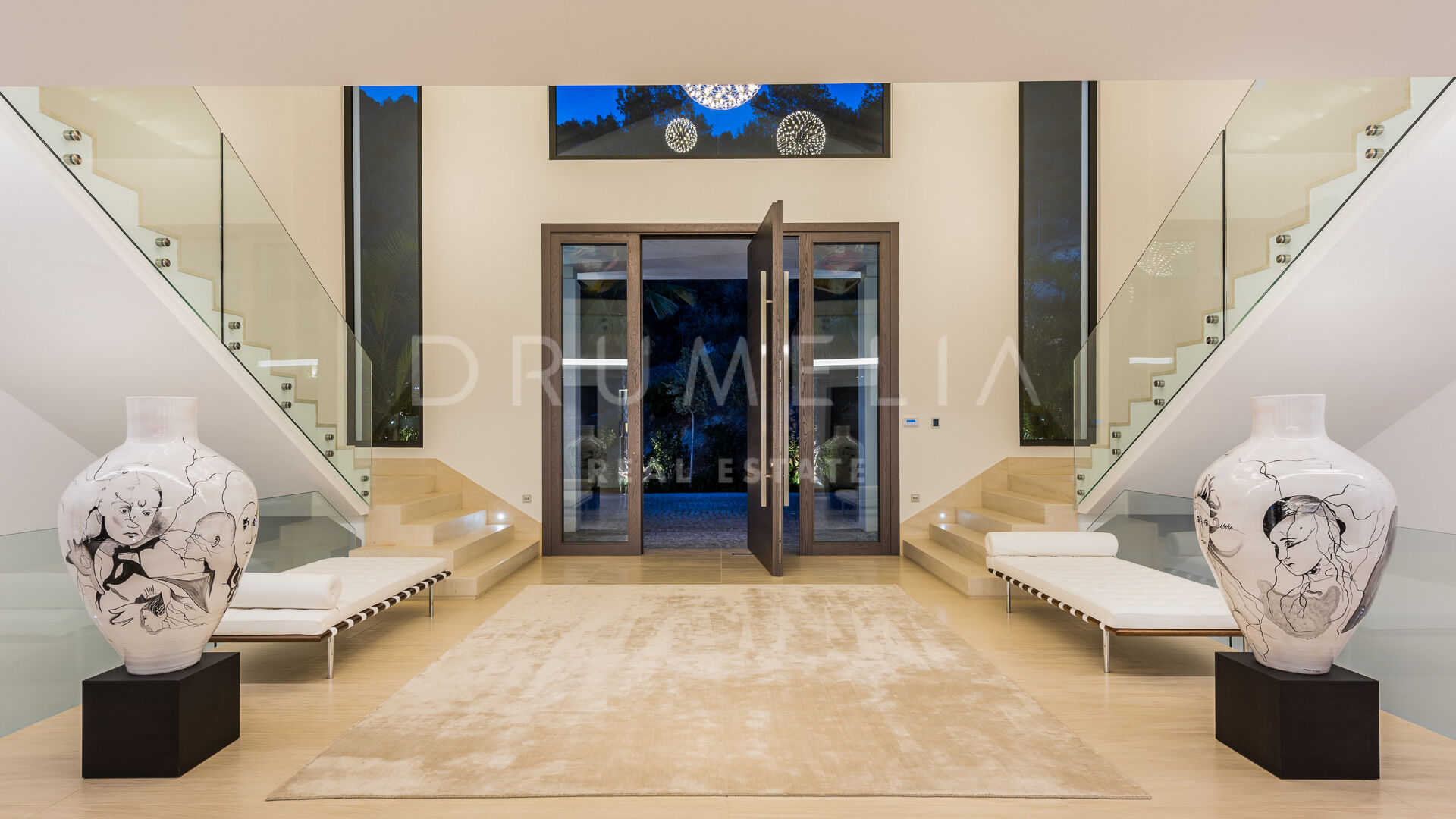 Die makellose große Villa mit fesselnder Eleganz, moderner Ästhetik und praktischer Anziehungskraft bringt einen neuen Standard an architektonischer Raffinesse und kreativer Exzellenz sogar nach Marbella, das mit der Natur von Luxus und extravagantem Wohnen sehr vertraut ist. Es zieht das Auge mit exquisiten geometrischen Linien und subtilen visuellen Details an, ohne jemals überflüssig zu werden. Sein innovatives Design verbindet harmonisch das Beste aus zeitgenössischen Elementen mit den attraktivsten mediterranen Merkmalen. Die kunstvolle Manipulation von Raum und Licht durch die Designer erzeugt einen nahtlosen Fluss der Wohnräume und eine freizügige Verteilung. Die angesehenen Bewohner und ihre Gäste müssen sich keine Sorgen machen, dieses Haus zu genießen. Mit 2.600m2 luxuriöser Wohnfläche, verteilt auf 3 Ebenen, bietet es Wohn-, Empfangs- und Esszimmer, 8 geräumige Schlafzimmersuiten, inspirierende hochmoderne Küche, Büro, separate Waschküche, Lager- und Technikräume, separates Apartment, Innen- und Außenpools, SPA, Sauna, Fitnessraum, Kino, Spielzimmer, ‘Meditations- und Aussichtsbereich’… Der atemberaubende Weinkeller ist der Traum eines jeden Weinliebhabers. Stellen Sie sich vor, Sie steigen eine Treppe hinunter in eine schicke ‘Felsengrotte’, klimatisiert, komplett mit passenden Fliesenböden, Weinkühler und Regalen voll mit den geschmackvollsten Trankopfern aus aller Welt. Ein weiterer Traum, der in Erfüllung geht, ist ein begehbarer Kleiderschrank aus Holz, ideal zur Aufbewahrung und Präsentation der Kollektionen modischer Designer.