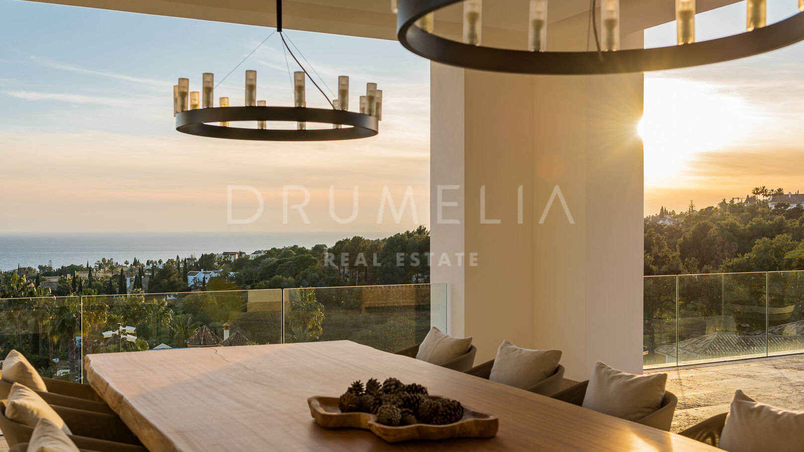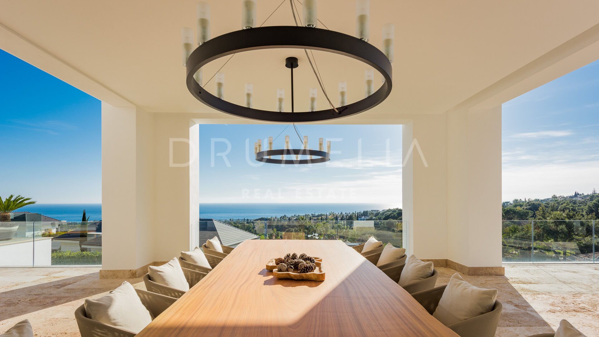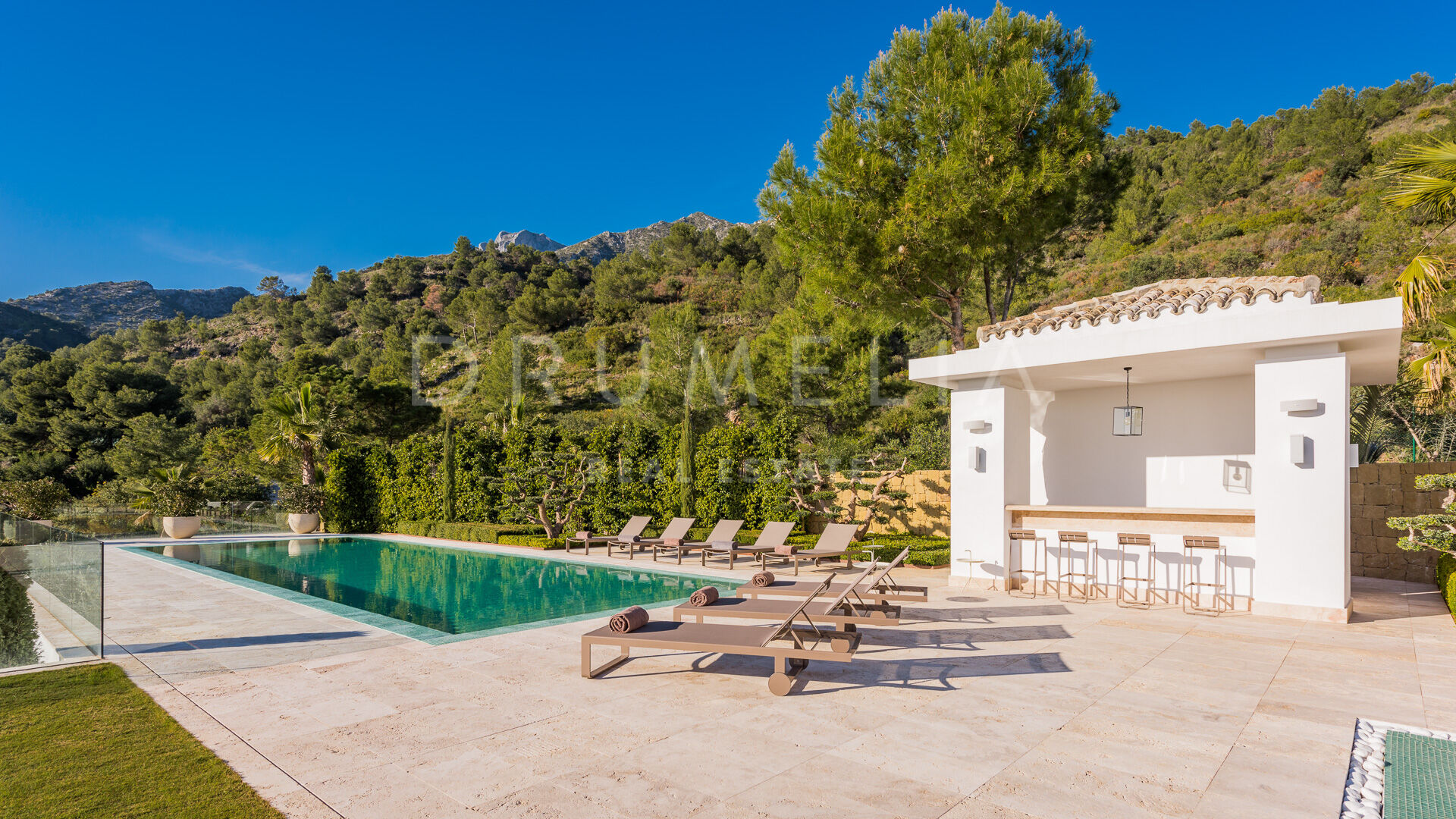 Die überdachten und sonnigen 830 m² großen Terrassen mit ihren raffinierten Lounges, Ess- und Liegebereichen im Freien setzen die Raffinesse des Innenbereichs nahtlos fort. Perfekt zum Entspannen und Unterhalten, bieten die Außenbereiche das ganze Jahr über Chill-out-Zonen, einen imposanten Pool, Solarien, eine Bar und einen Jacuzzi, alles eingebettet in atemberaubende, subtropische Gärten mit Olivenbäumen, Palmen, Zypressen und wunderschönen Grünflächen. Das Anwesen wurde sorgfältig angelegt, um den atemberaubenden Panoramablick über die malerische andalusische Landschaft, Marbella und das Mittelmeer in Richtung Gibraltar und die nordafrikanische Küste voll auszunutzen.