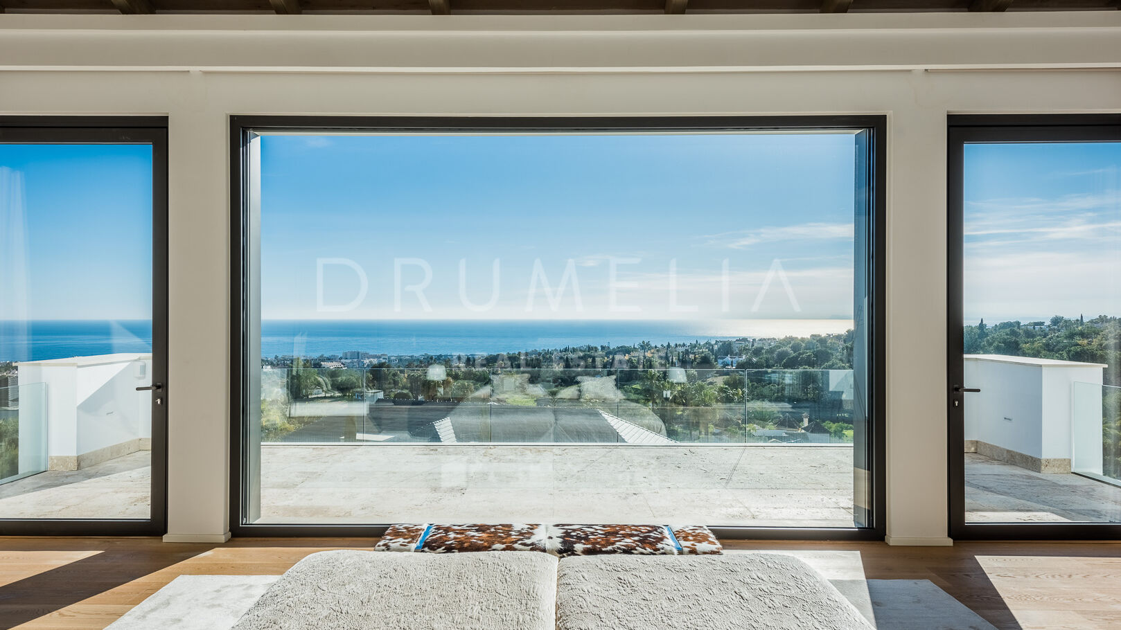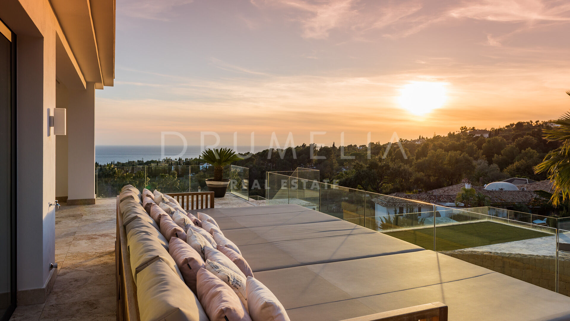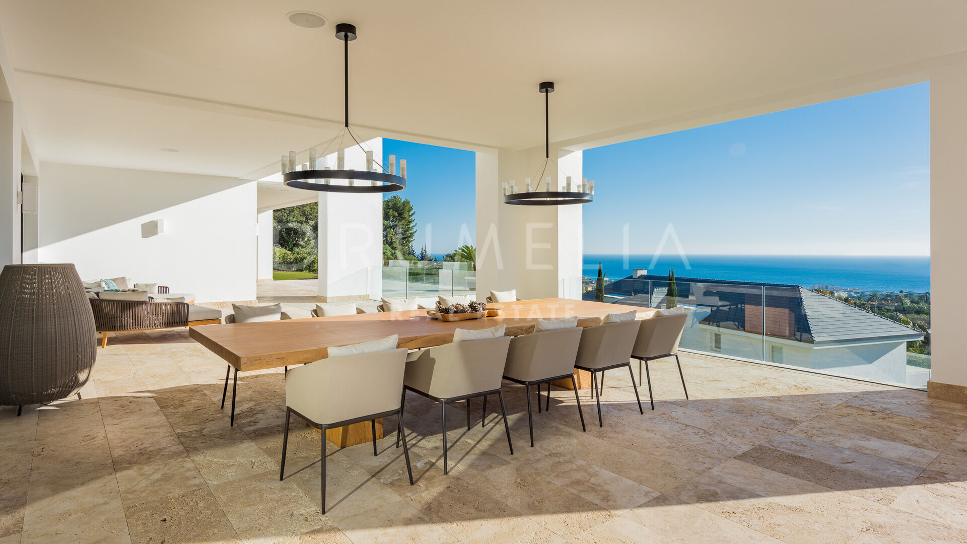 Die überdachten und sonnigen 830 m² großen Terrassen mit ihren raffinierten Lounges, Ess- und Liegebereichen im Freien setzen die Raffinesse des Innenbereichs nahtlos fort. Perfekt zum Entspannen und Unterhalten, bieten die Außenbereiche das ganze Jahr über Chill-out-Zonen, einen imposanten Pool, Solarien, eine Bar und einen Jacuzzi, alles eingebettet in atemberaubende, subtropische Gärten mit Olivenbäumen, Palmen, Zypressen und wunderschönen Grünflächen. Das Anwesen wurde sorgfältig angelegt, um den atemberaubenden Panoramablick über die malerische andalusische Landschaft, Marbella und das Mittelmeer in Richtung Gibraltar und die nordafrikanische Küste voll auszunutzen.