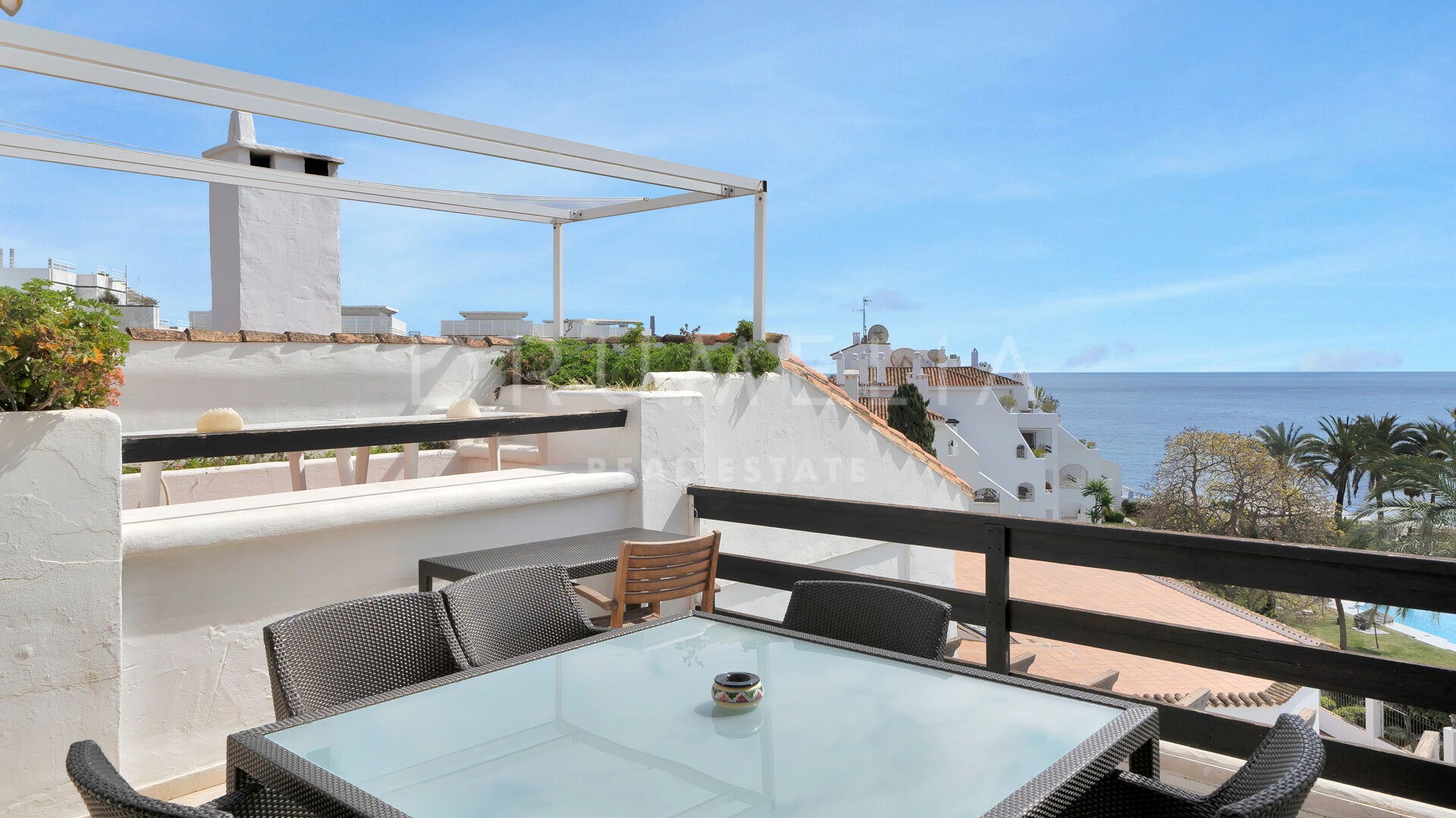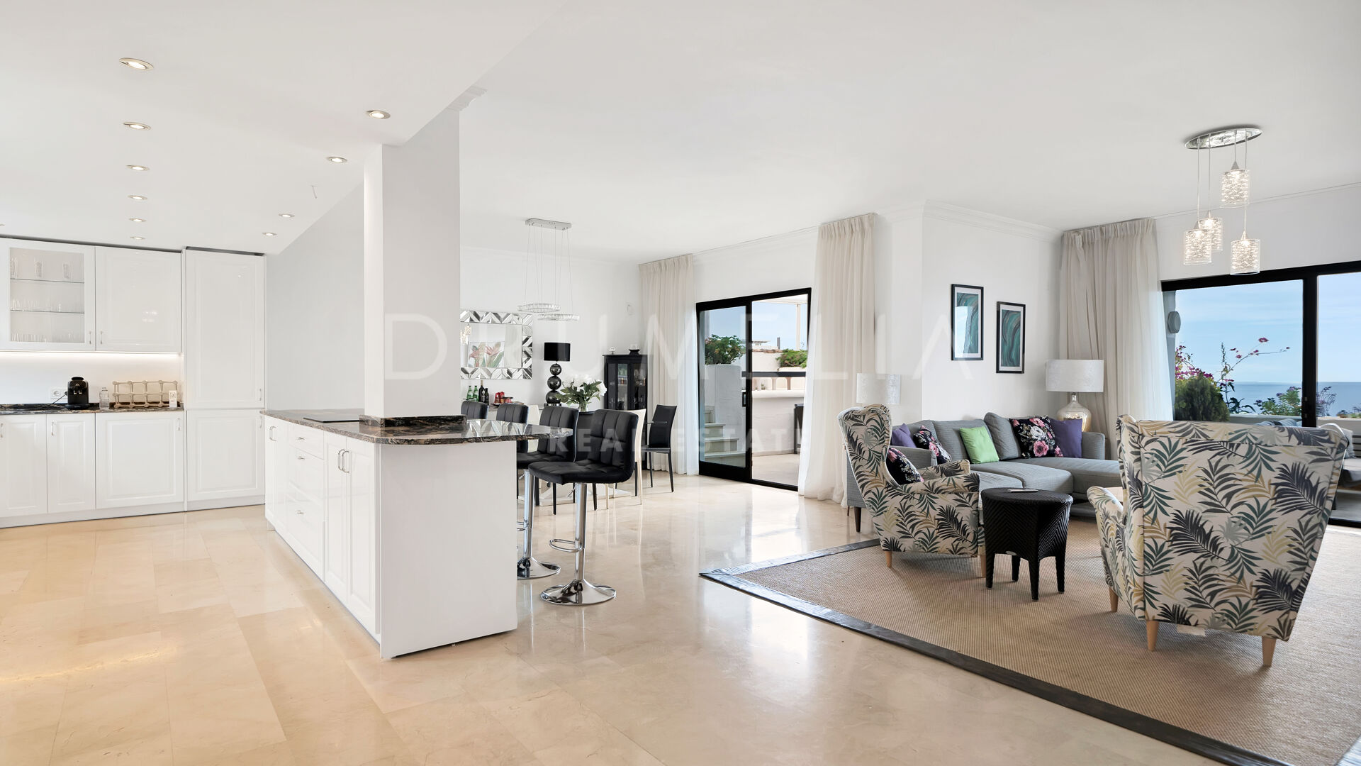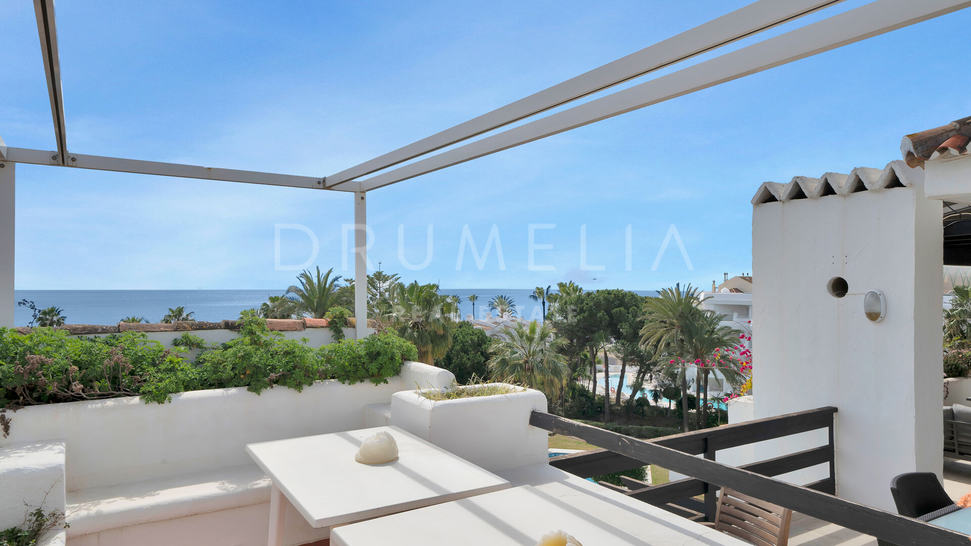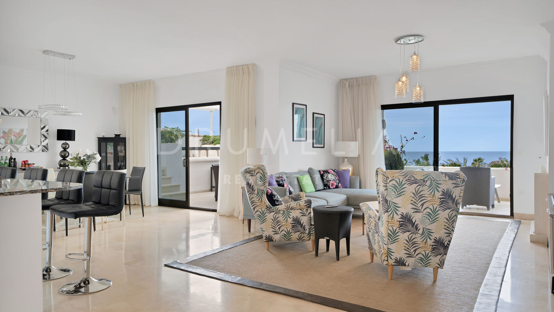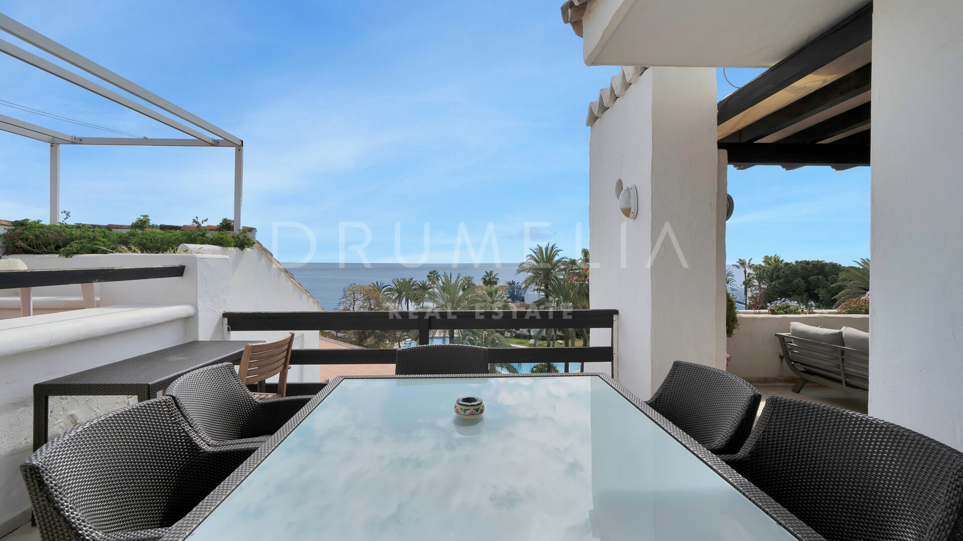Außergewöhnliches Strandpenthouse mit atemberaubendem Panoramablick auf das Meer und direktem Zugang zum Strand, gelegen im exklusiven Coral Beach Komplex an der Golden Mile von Marbella. Diese elegante Immobilie verfügt über drei großzügige Schlafzimmer und drei Badezimmer, darunter zwei Suiten mit Meerblick. Die große, nach Süden ausgerichtete Terrasse bietet absolute Privatsphäre und ist ideal zum Entspannen, Essen oder Genießen des Mittelmeerblicks.