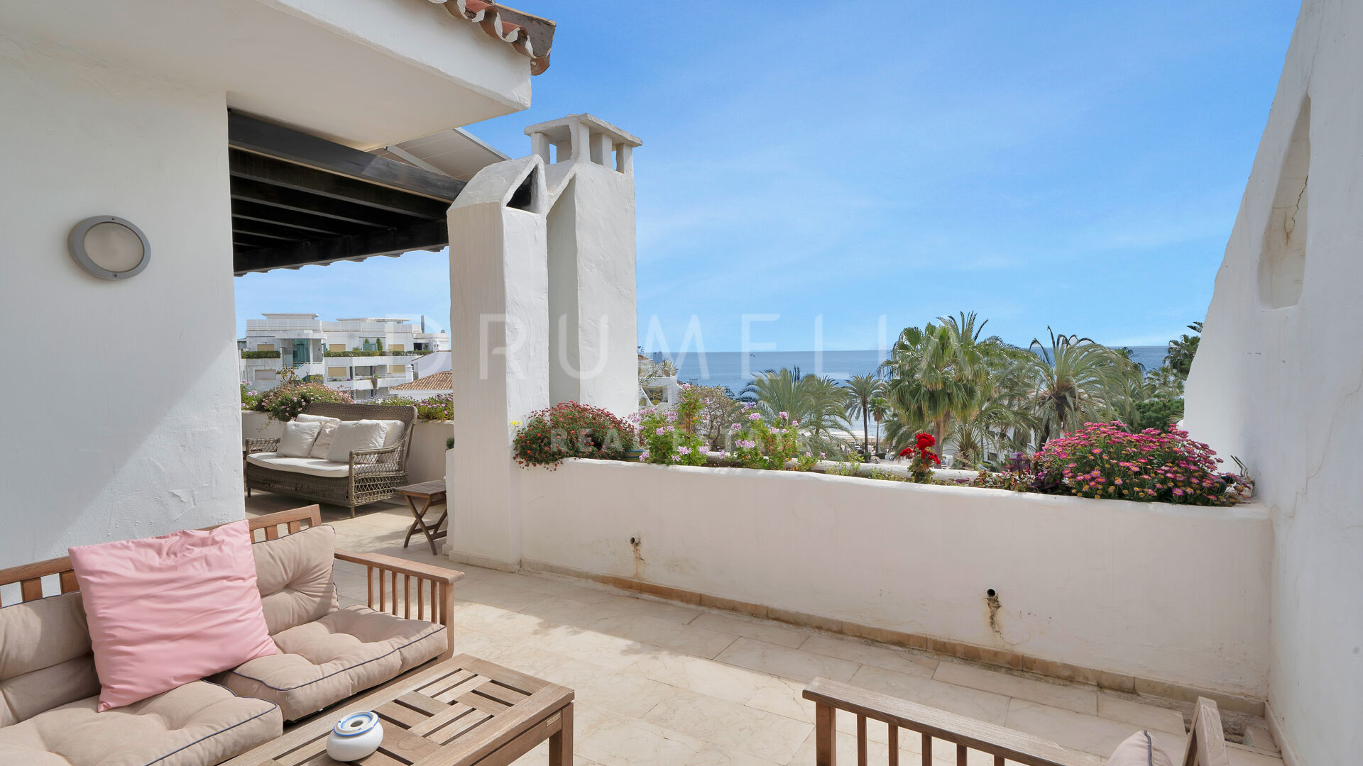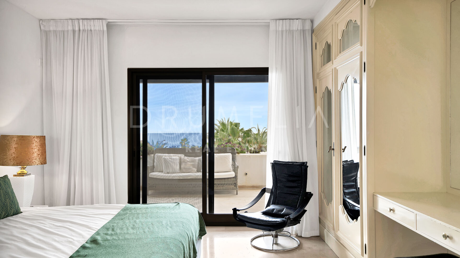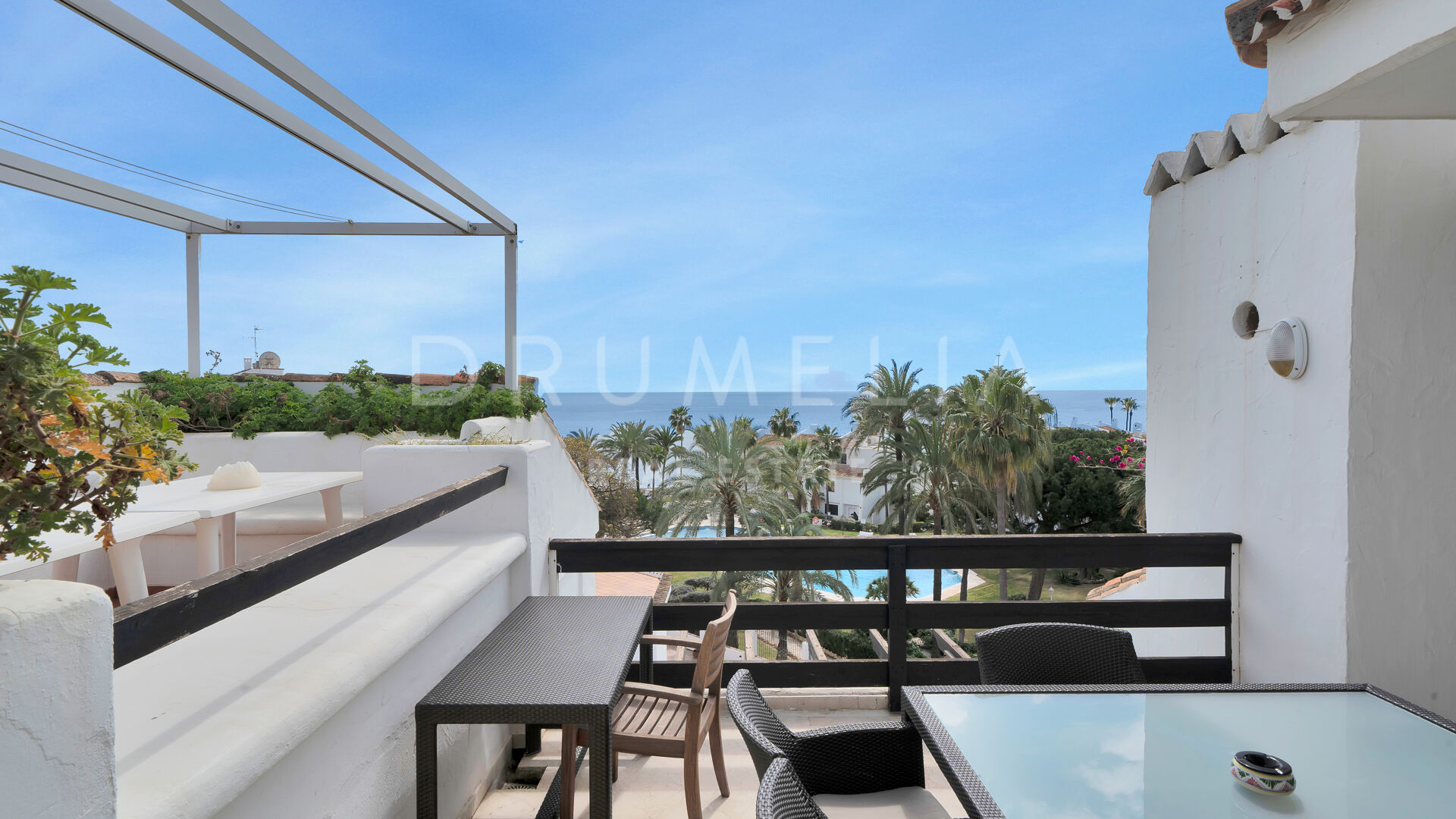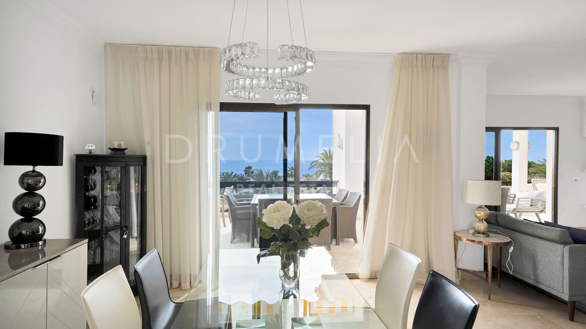 Außergewöhnliches Strandpenthouse mit atemberaubendem Panoramablick auf das Meer und direktem Zugang zum Strand, gelegen im exklusiven Coral Beach Komplex an der Golden Mile von Marbella. Diese elegante Immobilie verfügt über drei großzügige Schlafzimmer und drei Badezimmer, darunter zwei Suiten mit Meerblick. Die große, nach Süden ausgerichtete Terrasse bietet absolute Privatsphäre und ist ideal zum Entspannen, Essen oder Genießen des Mittelmeerblicks.