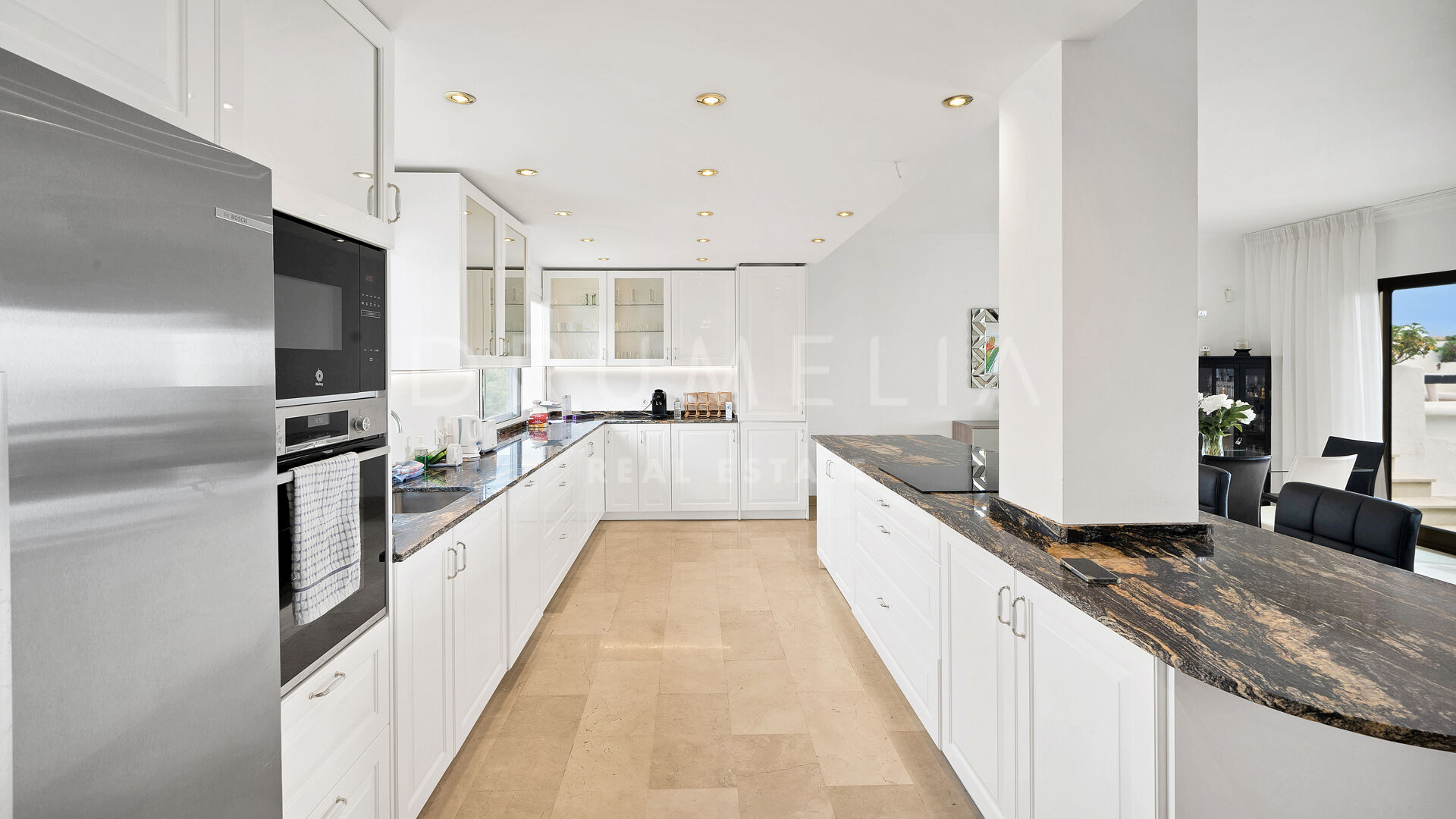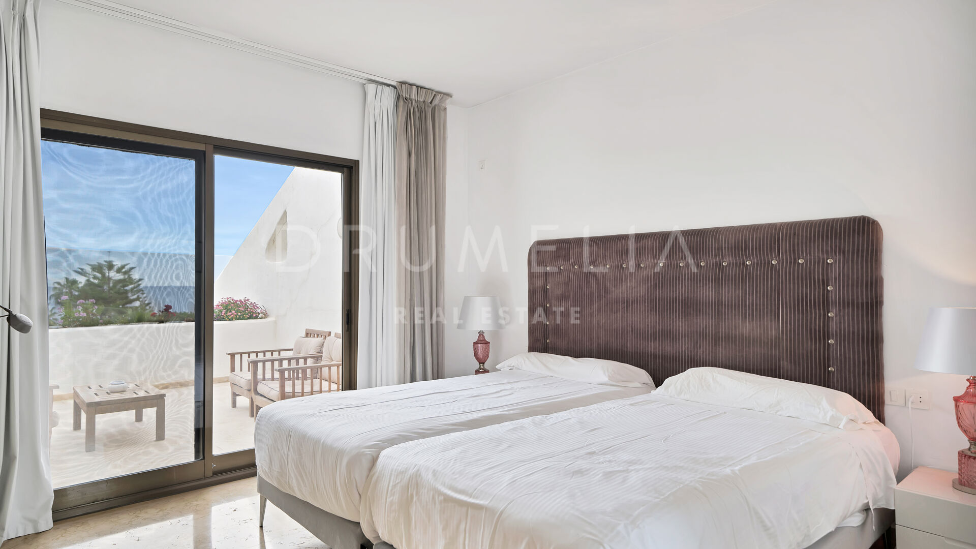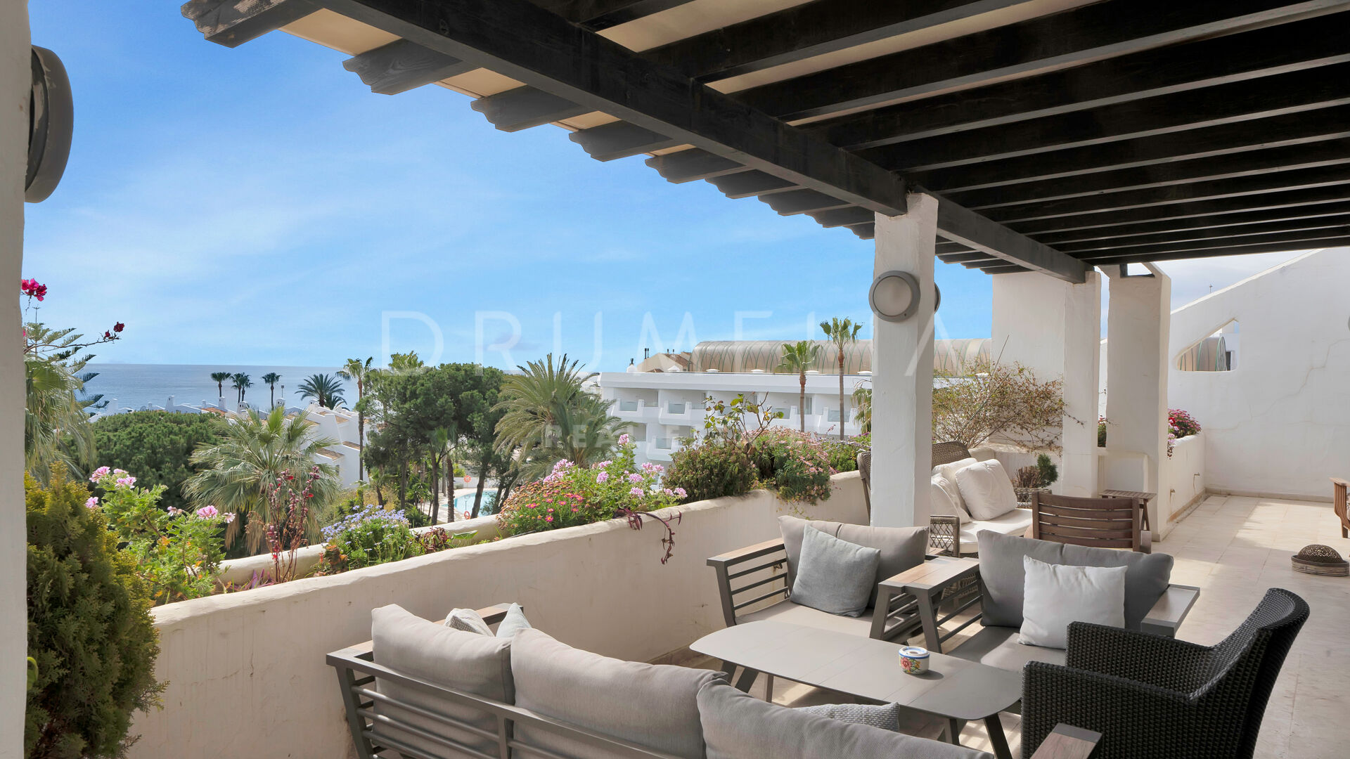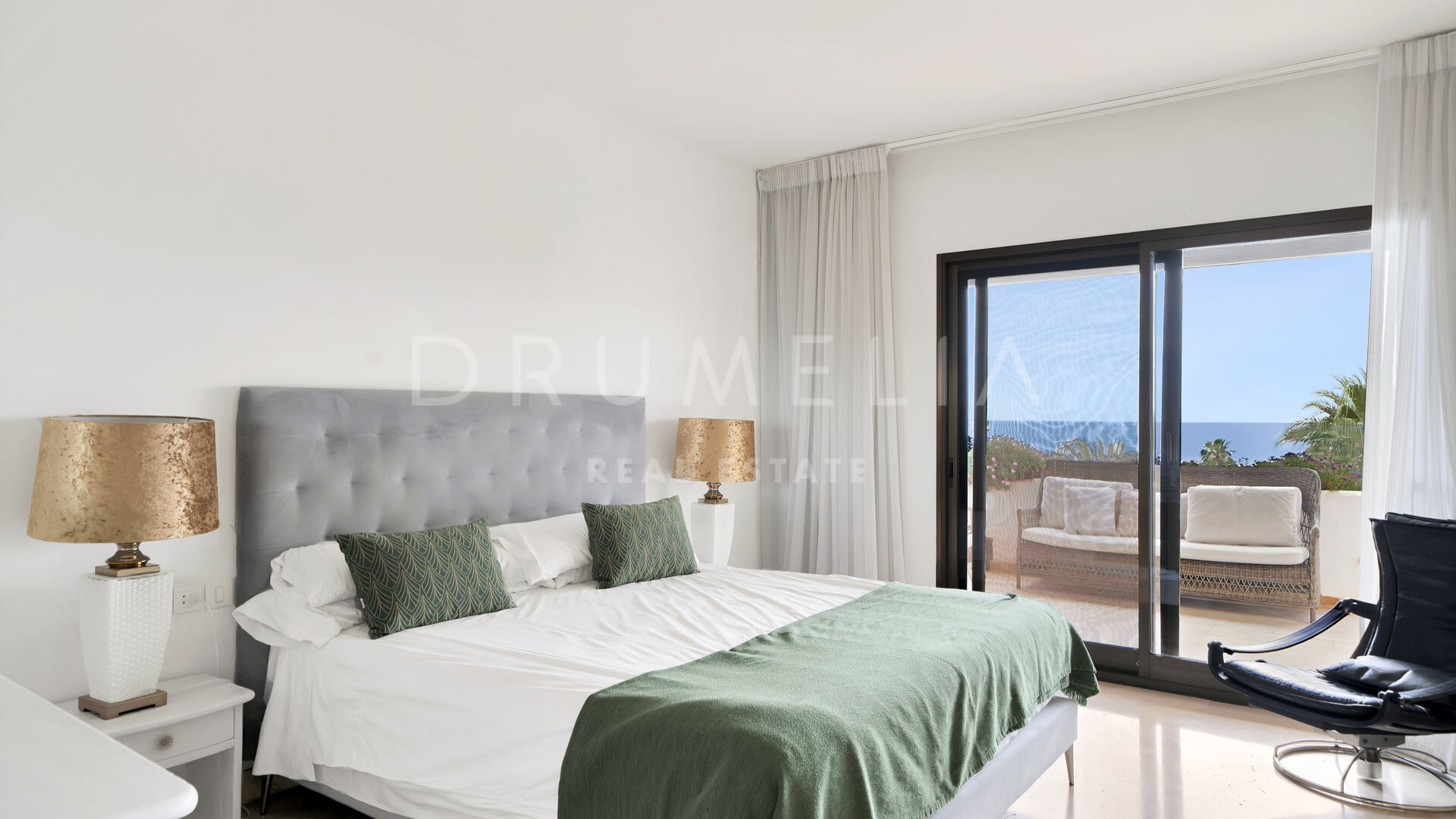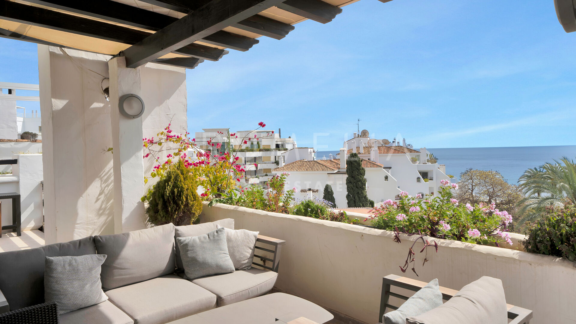 Außergewöhnliches Strandpenthouse mit atemberaubendem Panoramablick auf das Meer und direktem Zugang zum Strand, gelegen im exklusiven Coral Beach Komplex an der Golden Mile von Marbella. Diese elegante Immobilie verfügt über drei großzügige Schlafzimmer und drei Badezimmer, darunter zwei Suiten mit Meerblick. Die große, nach Süden ausgerichtete Terrasse bietet absolute Privatsphäre und ist ideal zum Entspannen, Essen oder Genießen des Mittelmeerblicks.