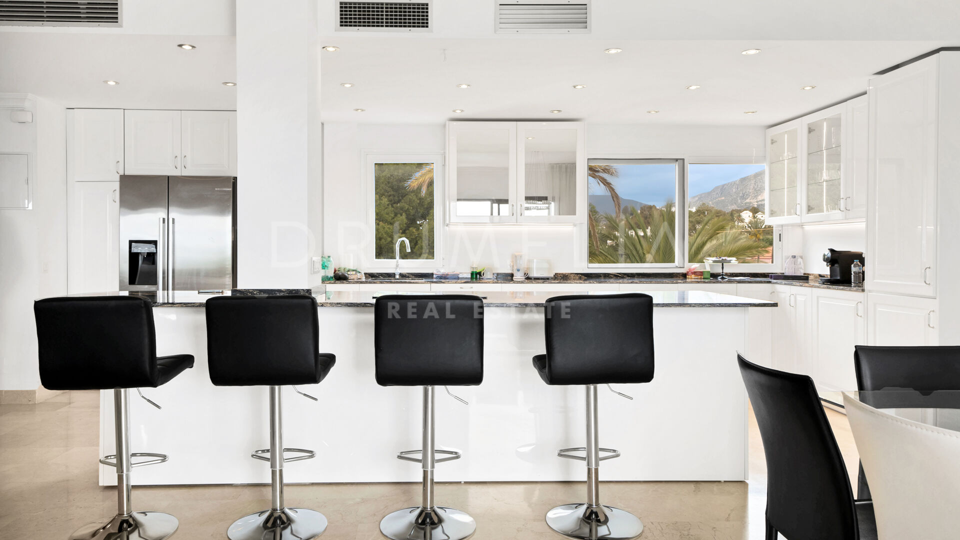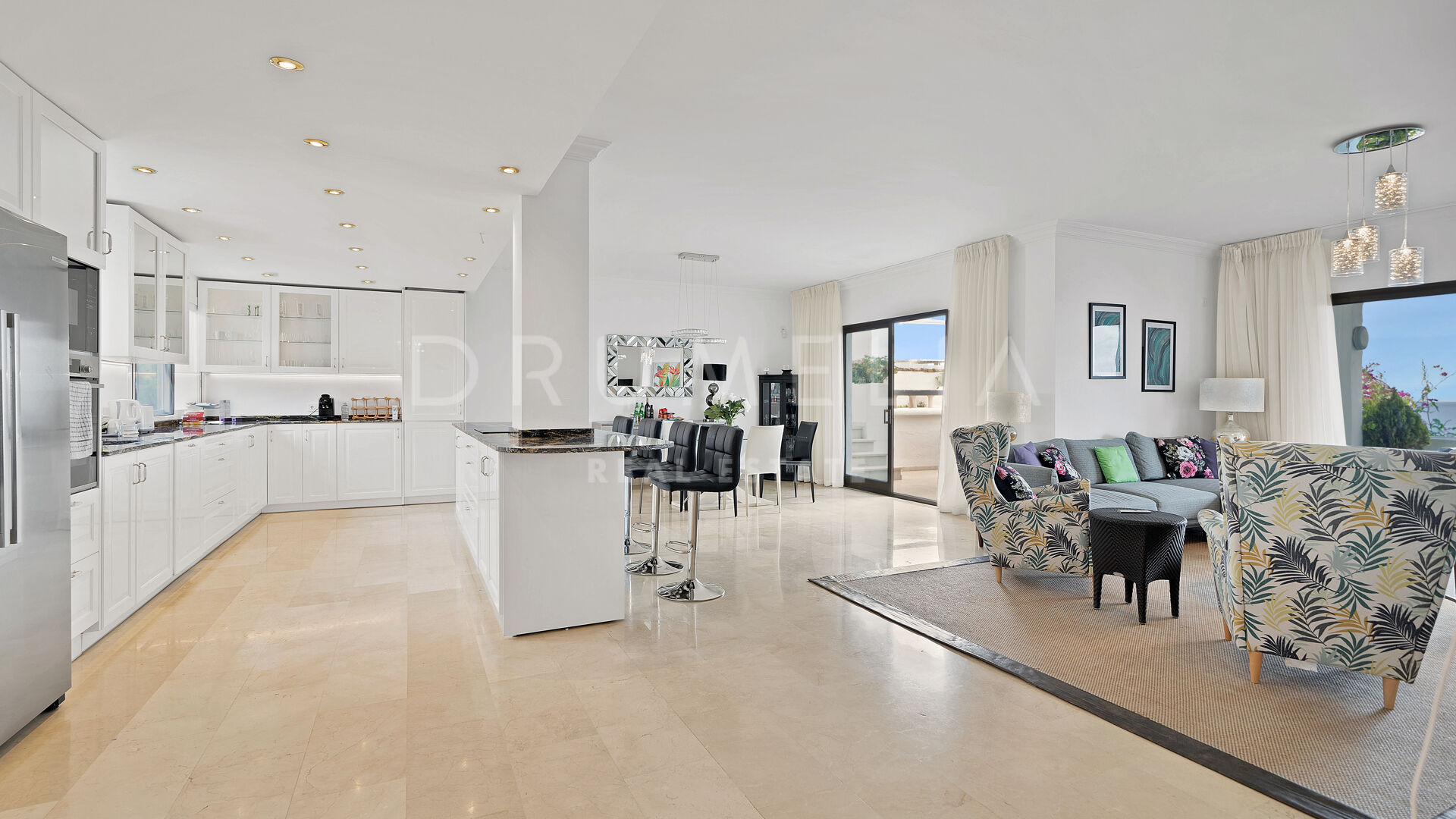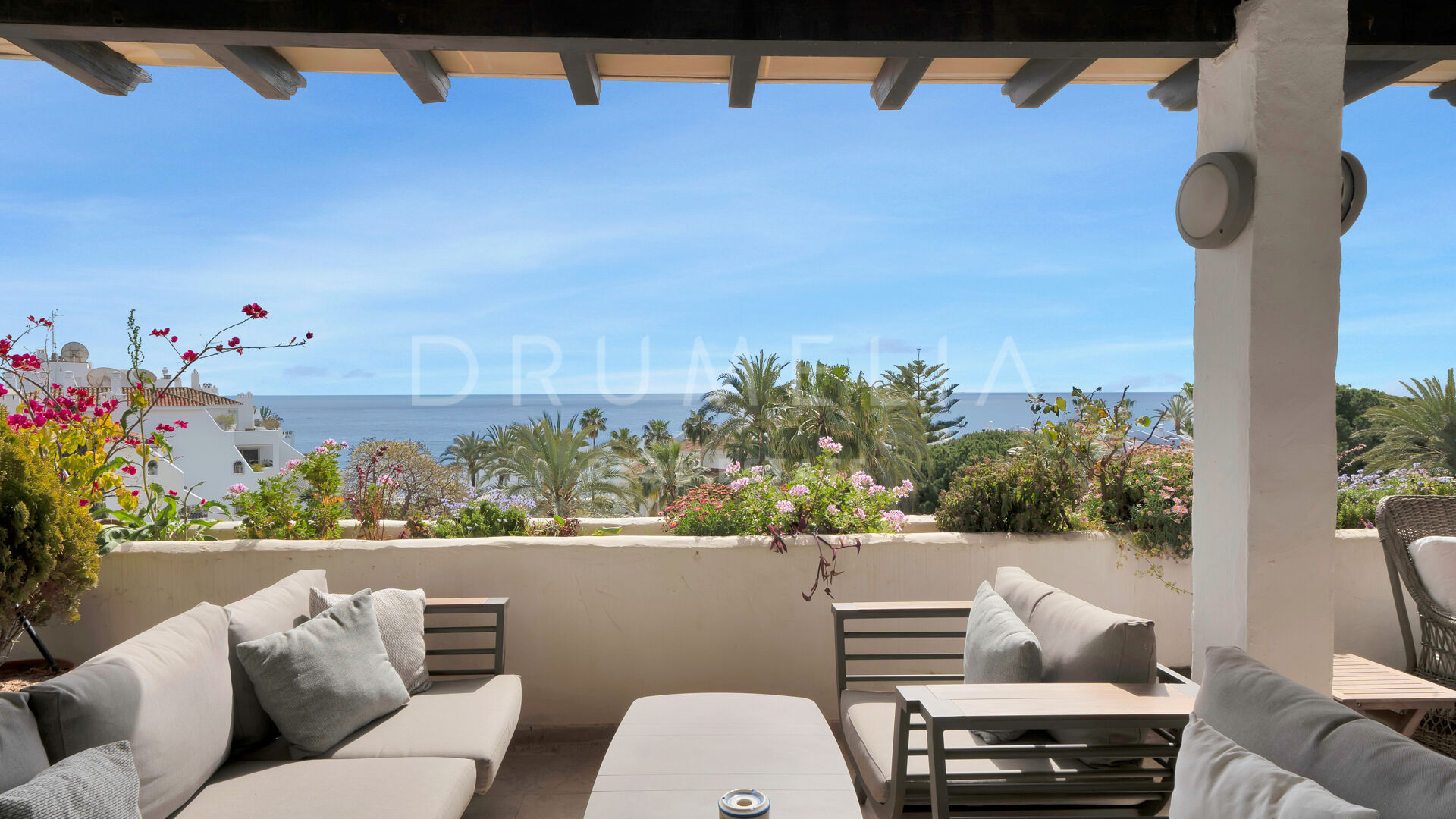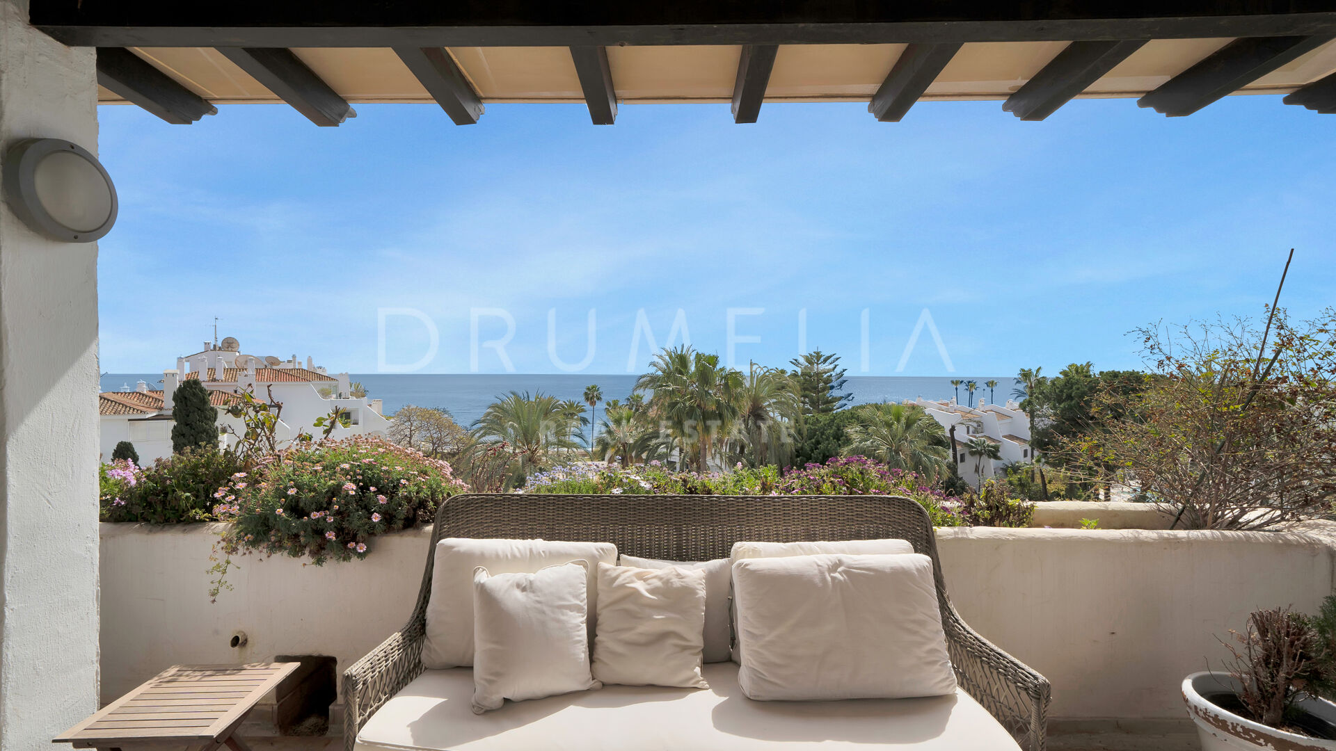 Außergewöhnliches Strandpenthouse mit atemberaubendem Panoramablick auf das Meer und direktem Zugang zum Strand, gelegen im exklusiven Coral Beach Komplex an der Golden Mile von Marbella. Diese elegante Immobilie verfügt über drei großzügige Schlafzimmer und drei Badezimmer, darunter zwei Suiten mit Meerblick. Die große, nach Süden ausgerichtete Terrasse bietet absolute Privatsphäre und ist ideal zum Entspannen, Essen oder Genießen des Mittelmeerblicks.