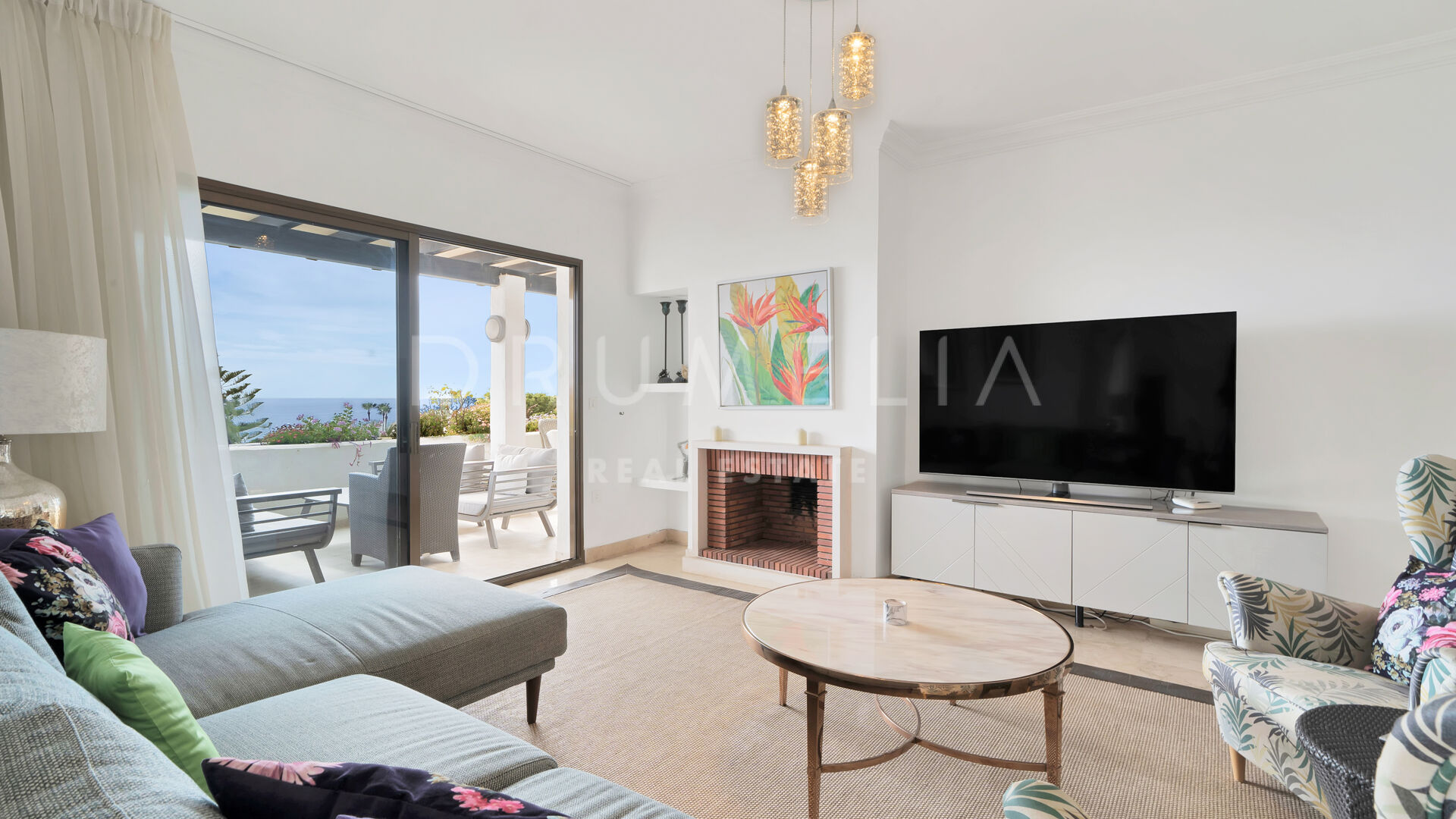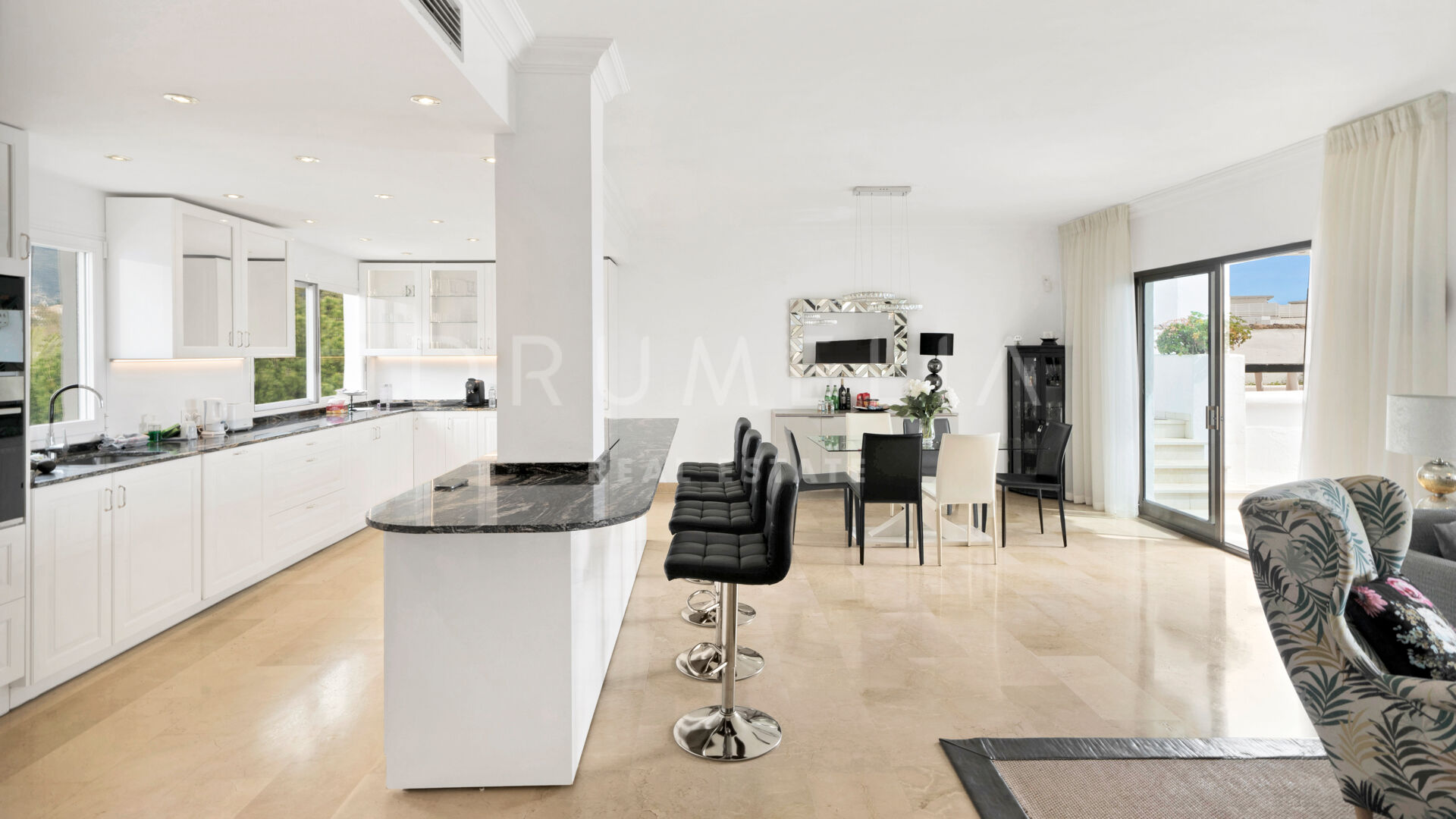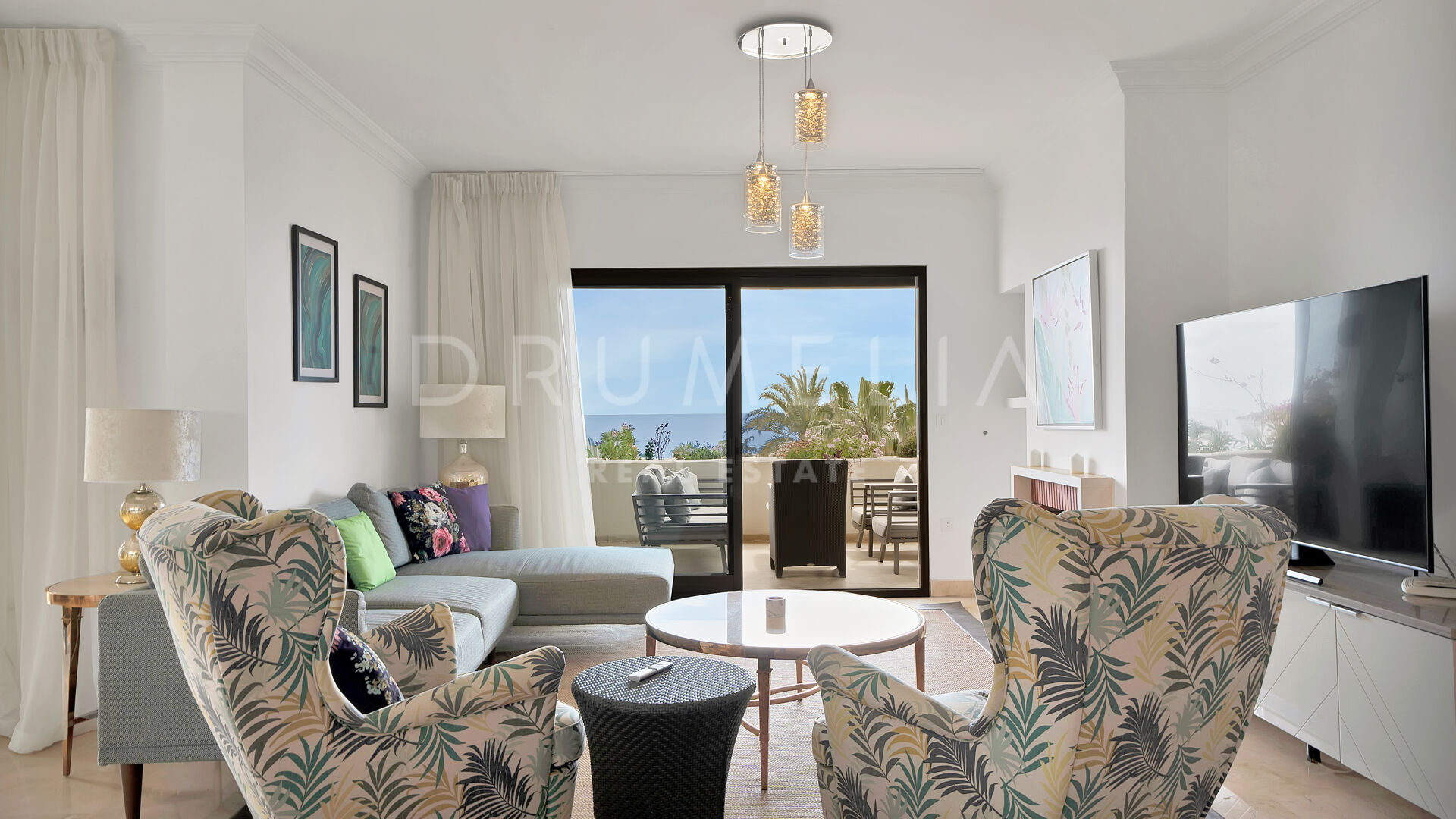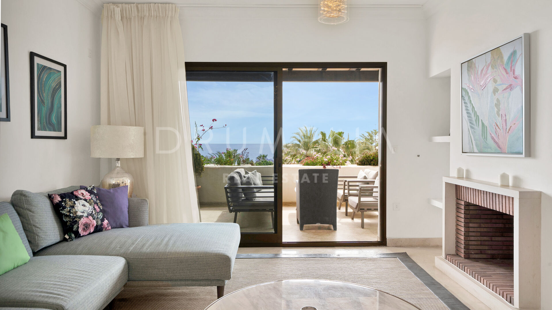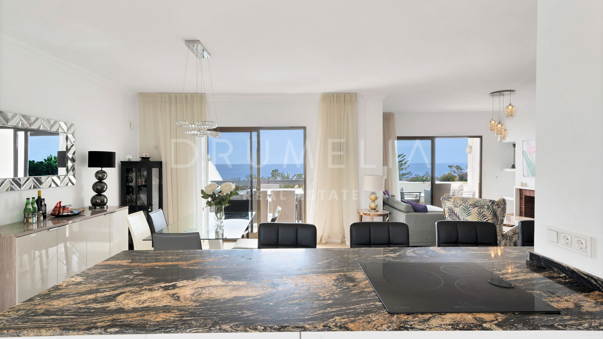 Außergewöhnliches Strandpenthouse mit atemberaubendem Panoramablick auf das Meer und direktem Zugang zum Strand, gelegen im exklusiven Coral Beach Komplex an der Golden Mile von Marbella. Diese elegante Immobilie verfügt über drei großzügige Schlafzimmer und drei Badezimmer, darunter zwei Suiten mit Meerblick. Die große, nach Süden ausgerichtete Terrasse bietet absolute Privatsphäre und ist ideal zum Entspannen, Essen oder Genießen des Mittelmeerblicks.