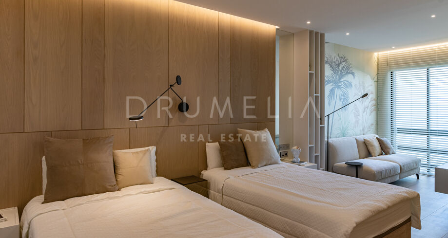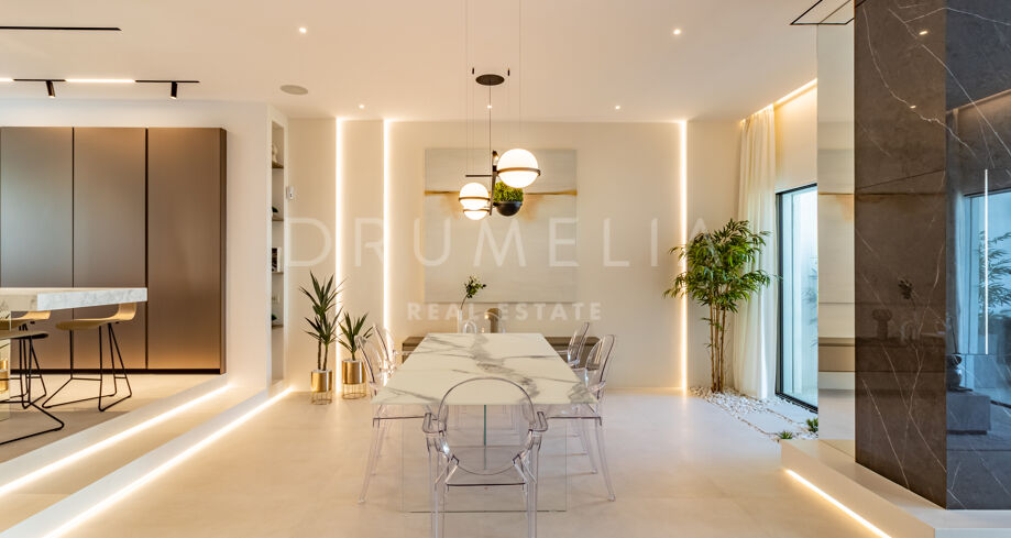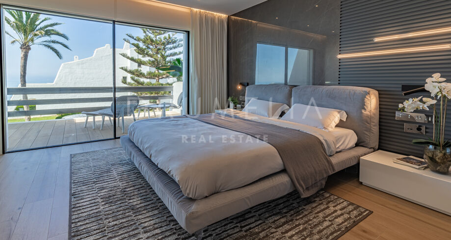 Das 316 m² große, nach Süden und Westen ausgerichtete Stadthaus ist auf drei Ebenen verteilt und besticht durch seine authentische Architektur im andalusischen Stil, eine moderne Einrichtung mit viel natürlichem Licht, hellen weißen Wänden und exquisiten Design-Akzenten. Es verfügt über einen wunderschönen Wohn- und Essbereich, eine voll ausgestattete moderne Küche, 4 ruhige Schlafzimmer, 2 davon mit eigenem Bad, die anderen teilen sich ein Bad, und ein Gäste-WC. Die 36 m² große Terrasse bietet einen atemberaubenden Blick auf das Meer. Das Haus wurde vor Kurzem nach den neuesten Standards renoviert und befindet sich in einem ausgezeichneten Zustand. Es verfügt über zahlreiche Ausstattungsmerkmale, die das Wohnen luxuriös und sehr komfortabel machen (Klimaanlage, hochwertige Led-Beleuchtung, Doppelverglasung, Glastüren, Einbauschränke usw.).