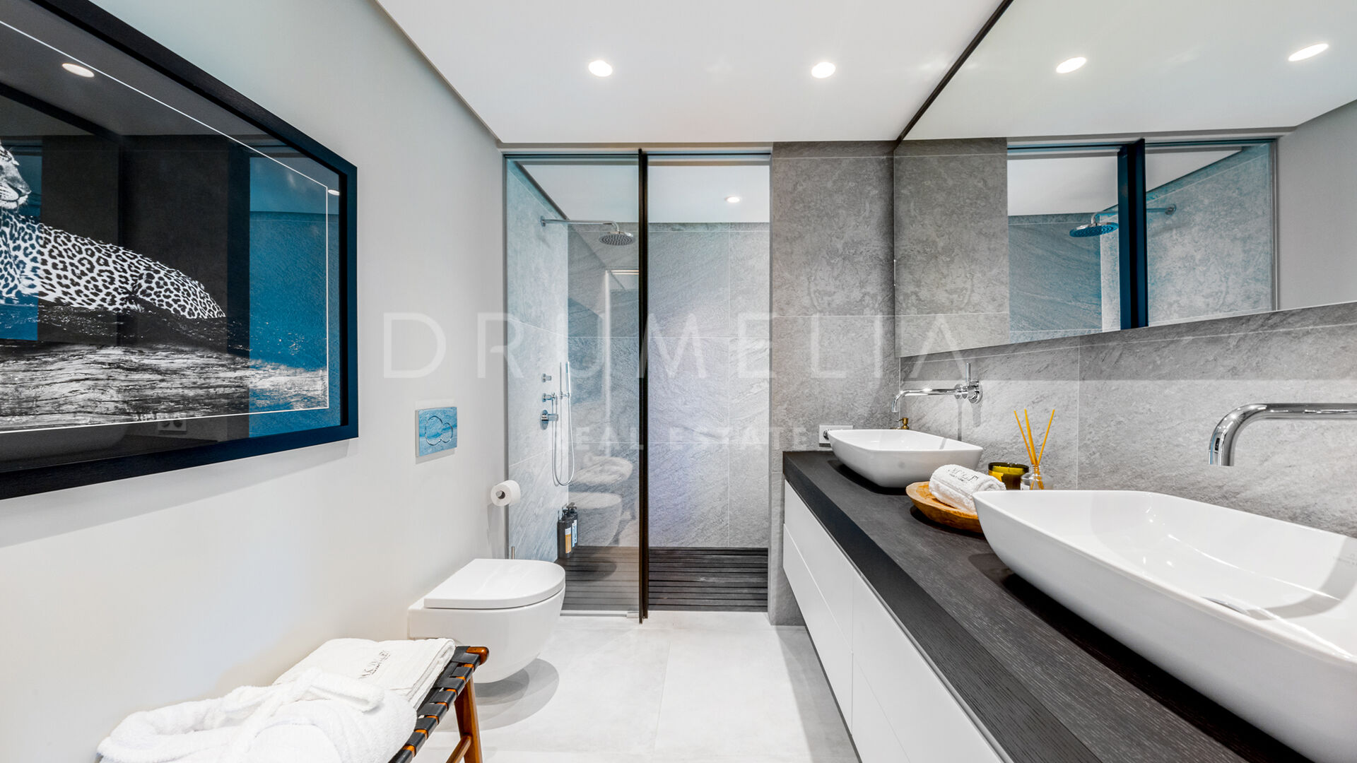 Das nagelneue, 1.080 m² große Haus steht auf einem 4.300 m² großen Grundstück und beeindruckt schon beim Betreten des wunderschön symmetrischen Foyers, das wie alle anderen Räume mit einem schönen Fußboden und einer raffinierten Deckengestaltung mit einem atemberaubenden Kronleuchter und LED-Licht aufwartet. Das Haus verfügt über 5 atemberaubende Schlafzimmer, 5 Bäder en-suite (mit modernen Möbeln, hochwertigen Geräten, Armaturen und Sanitäreinrichtungen, einer freistehenden Luxusbadewanne, von der aus man die Aussicht genießen kann, einem Whirlpool und Duschkabinen), 2 Gästetoiletten, eine minimalistisch eingerichtete Küche und ein Esszimmer sowie ein elegantes Wohnzimmer. Die Zimmer haben Glastüren und große Fenster, die viel Licht hereinlassen und zu den Terrassen und dem Swimmingpool führen, der von einem angelegten Garten umgeben ist. Hier kannst du dich entspannen oder eine lustige Poolparty feiern, ein Sonnenbad nehmen, mit deiner Familie im Freien essen und mit Freunden grillen und dabei das beste Klima in Kontinentaleuropa und den weltberühmten mediterranen Lebensstil genießen. Das Haus bietet ein fantastisches Panorama über die malerische Landschaft und das Mittelmeer bis hin zur afrikanischen Küste.
