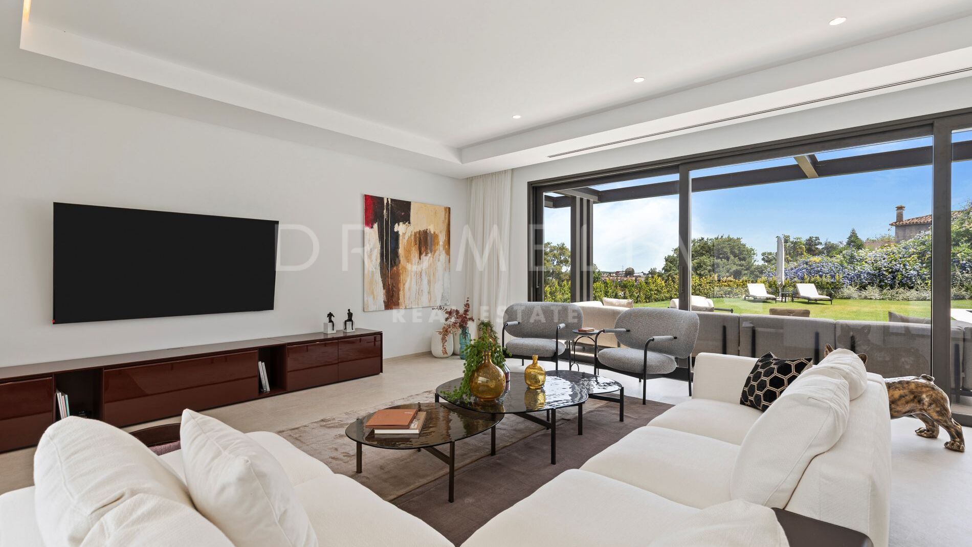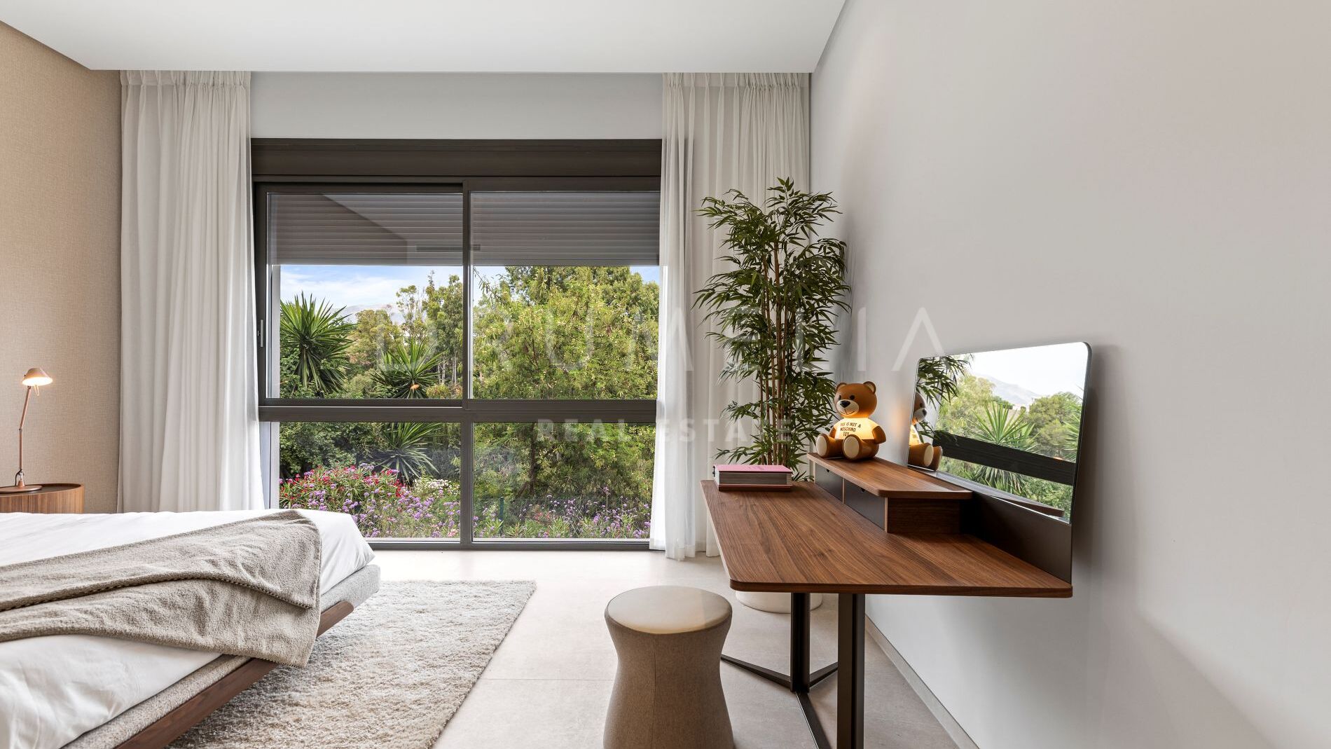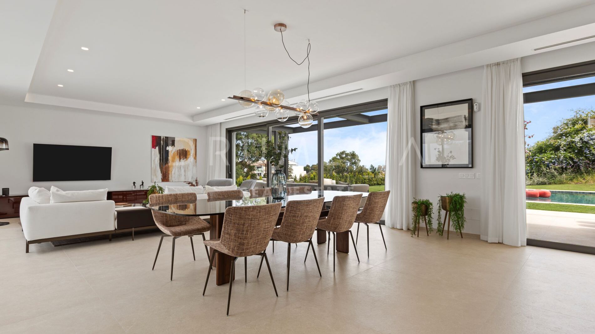 Über drei Etagen verteilt, verfügt die Villa über ein helles Wohnzimmer mit offener Küche, das direkt auf die Terrasse, den Garten und den privaten Pool führt. Sechs Schlafzimmer mit eigenen Bädern sowie zwei Gästetoiletten sind vorhanden. Die Hauptsuite im ersten Stock bietet einen großzügigen begehbaren Kleiderschrank. Das offene Untergeschoss kann individuell als Fitnessraum, Heimkino oder Freizeitbereich gestaltet werden.