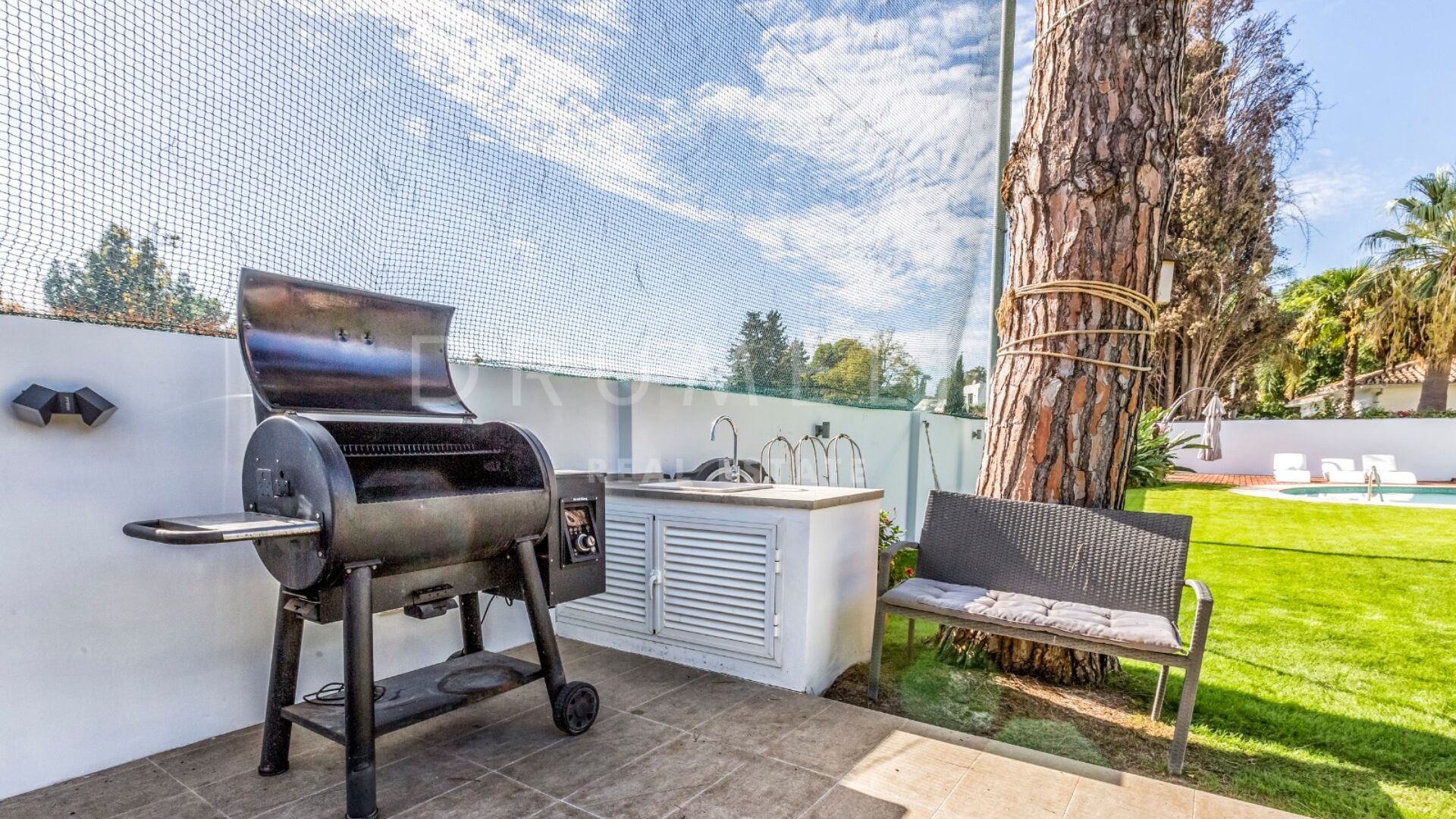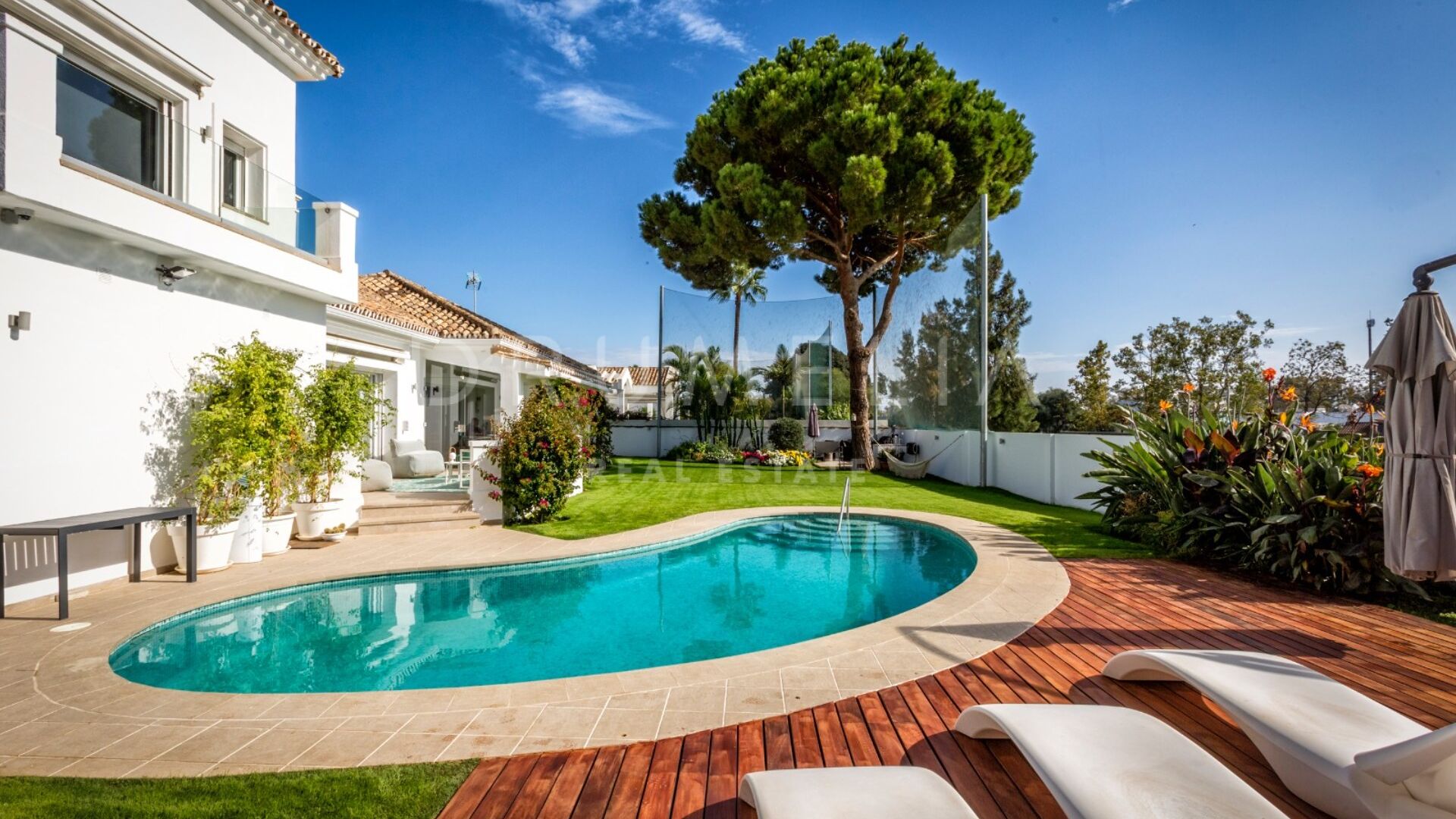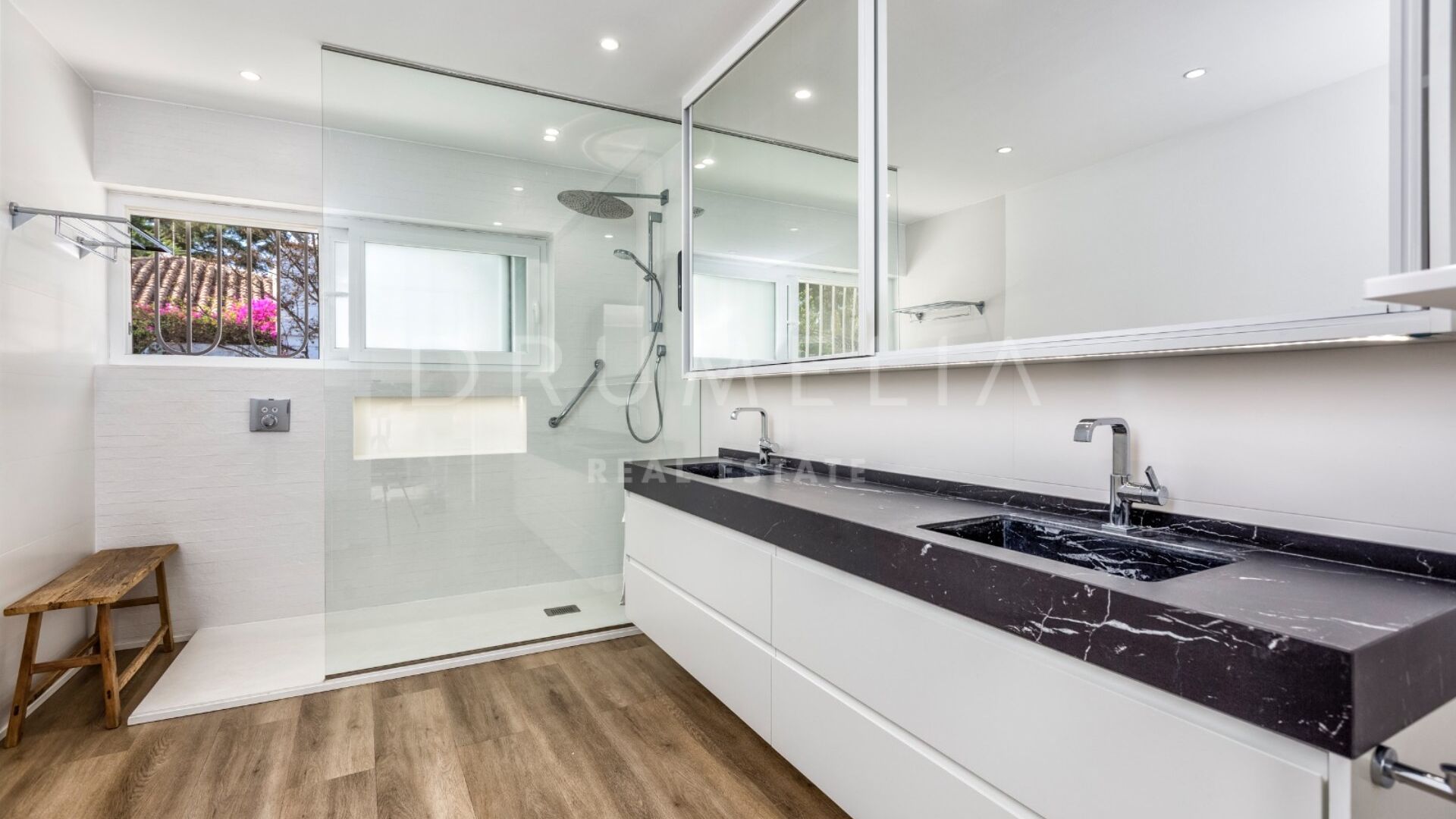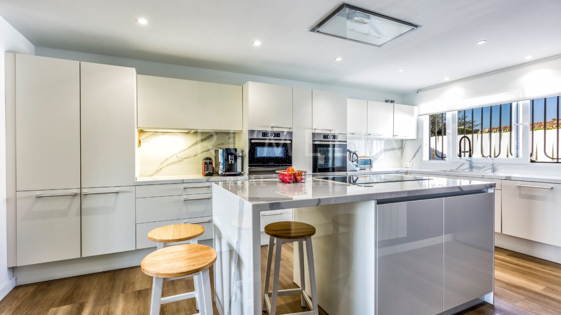 In Guadalmina Alta, San Pedro, wird eine renovierte Luxusvilla mit 4 Schlafzimmern und herrlichem Blick auf den Golfplatz zum Verkauf angeboten. Dies ist eine der begehrtesten Gegenden von Marbella. Ideal an der Westseite von Marbella gelegen, ist die ruhige Gemeinde eine Welt entfernt vom Lärm und Stress der touristischen Gebiete. Gleichzeitig befindet sie sich in unmittelbarer Nähe zu allen Dienstleistungen und Annehmlichkeiten, nur eine kurze Strecke vom Zentrum von San Pedro entfernt, einen kurzen Spaziergang vom mit der Blauen Flagge ausgezeichneten Strand entfernt und nur wenige Autominuten vom legendären Puerto Banús entfernt. In der Nähe befinden sich auch die luxuriösen Einrichtungen des Guadalmina Spa & Golf Resort, Chiringuitos und gute Restaurants, Geschäfte, internationale Schulen, medizinische Einrichtungen, historische Schutzgebiete usw. Guadalmina bietet wunderschöne Ausblicke auf die Golfplätze, das Mittelmeer und das Wahrzeichen von Marbella, La Concha, das stolz 1.270 m über der Stadt thront.