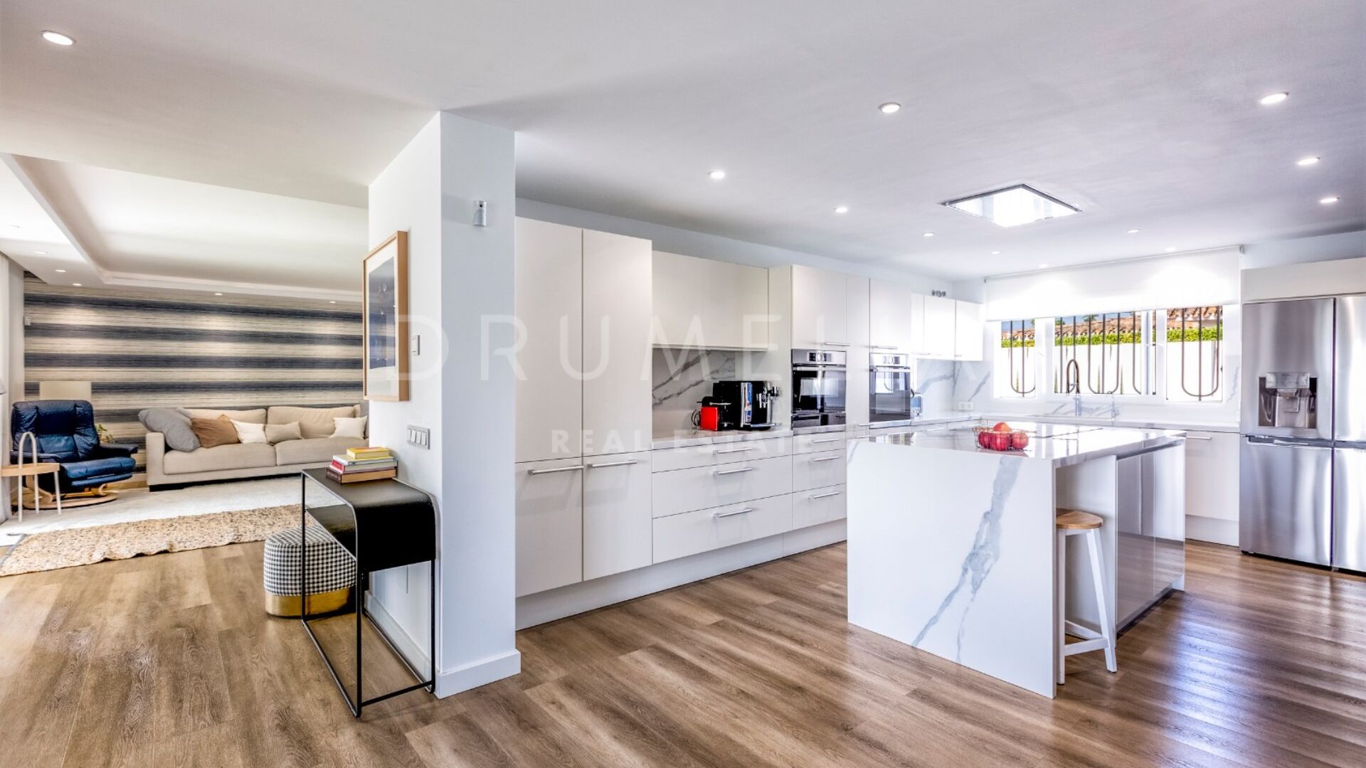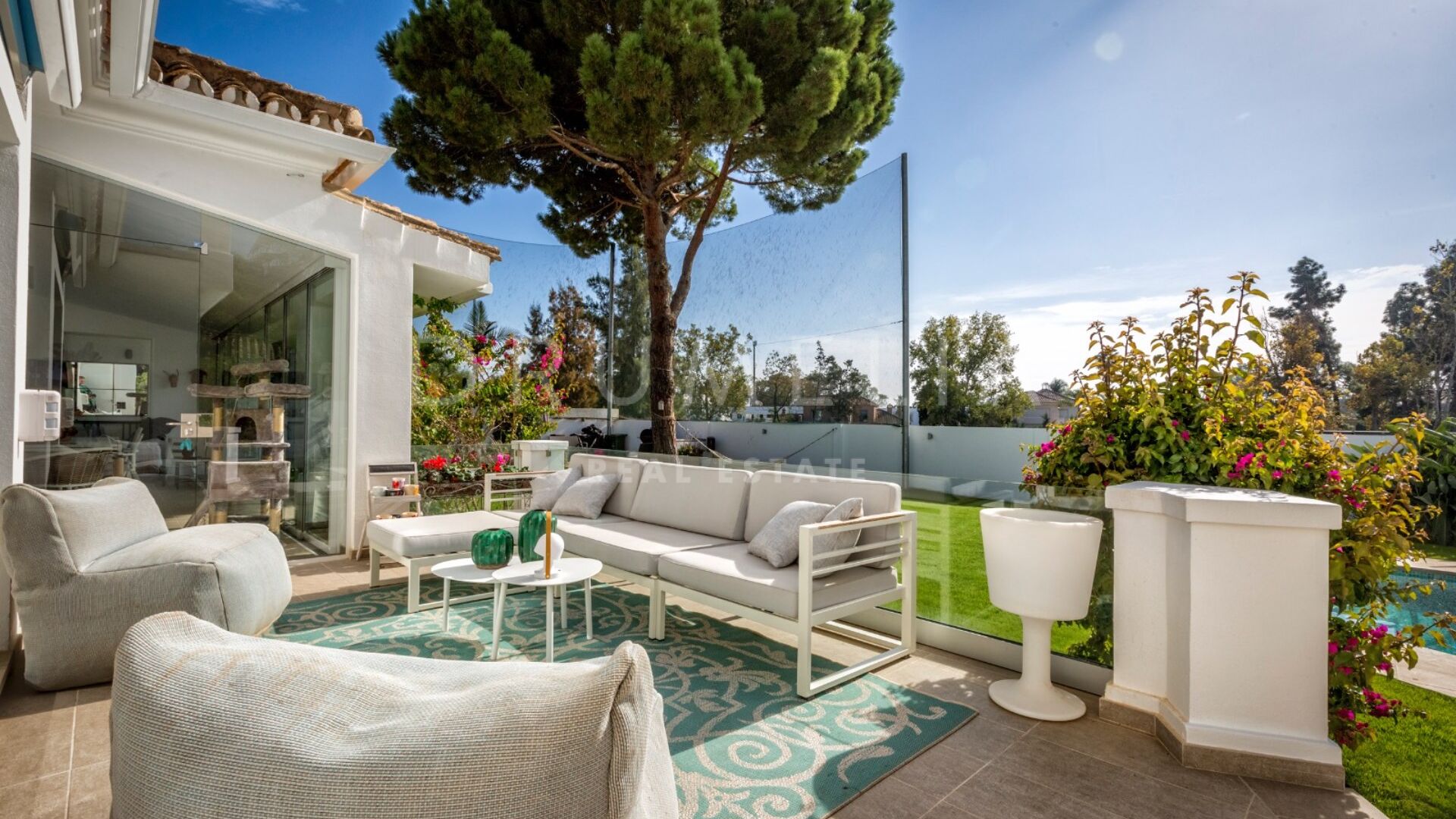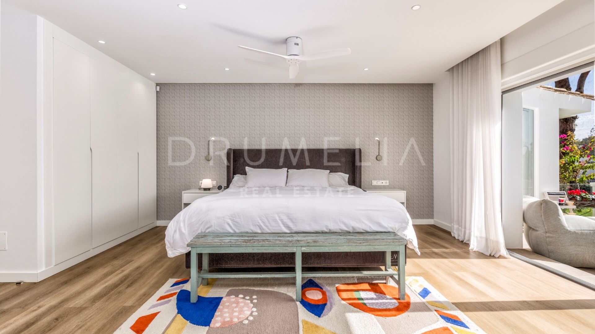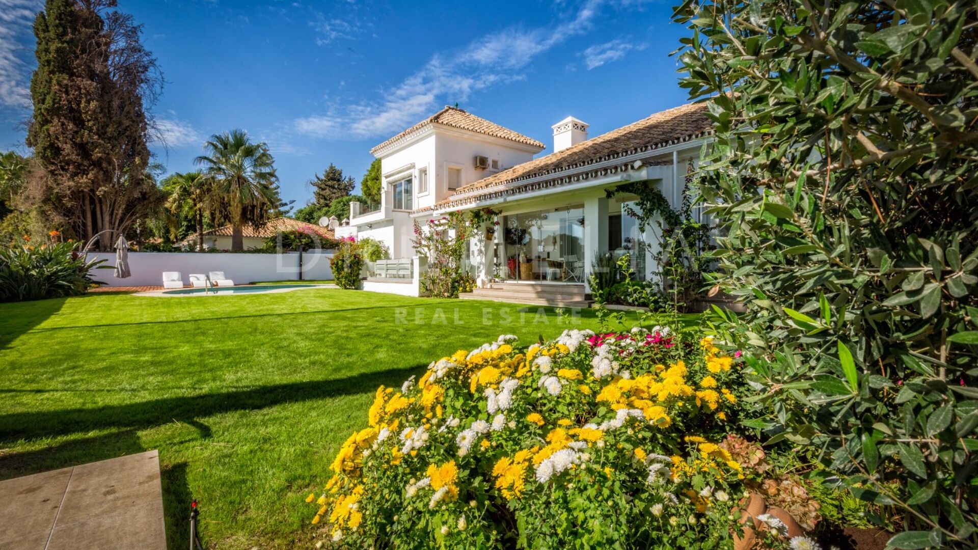 In Guadalmina Alta, San Pedro, wird eine renovierte Luxusvilla mit 4 Schlafzimmern und herrlichem Blick auf den Golfplatz zum Verkauf angeboten. Dies ist eine der begehrtesten Gegenden von Marbella. Ideal an der Westseite von Marbella gelegen, ist die ruhige Gemeinde eine Welt entfernt vom Lärm und Stress der touristischen Gebiete. Gleichzeitig befindet sie sich in unmittelbarer Nähe zu allen Dienstleistungen und Annehmlichkeiten, nur eine kurze Strecke vom Zentrum von San Pedro entfernt, einen kurzen Spaziergang vom mit der Blauen Flagge ausgezeichneten Strand entfernt und nur wenige Autominuten vom legendären Puerto Banús entfernt. In der Nähe befinden sich auch die luxuriösen Einrichtungen des Guadalmina Spa & Golf Resort, Chiringuitos und gute Restaurants, Geschäfte, internationale Schulen, medizinische Einrichtungen, historische Schutzgebiete usw. Guadalmina bietet wunderschöne Ausblicke auf die Golfplätze, das Mittelmeer und das Wahrzeichen von Marbella, La Concha, das stolz 1.270 m über der Stadt thront.