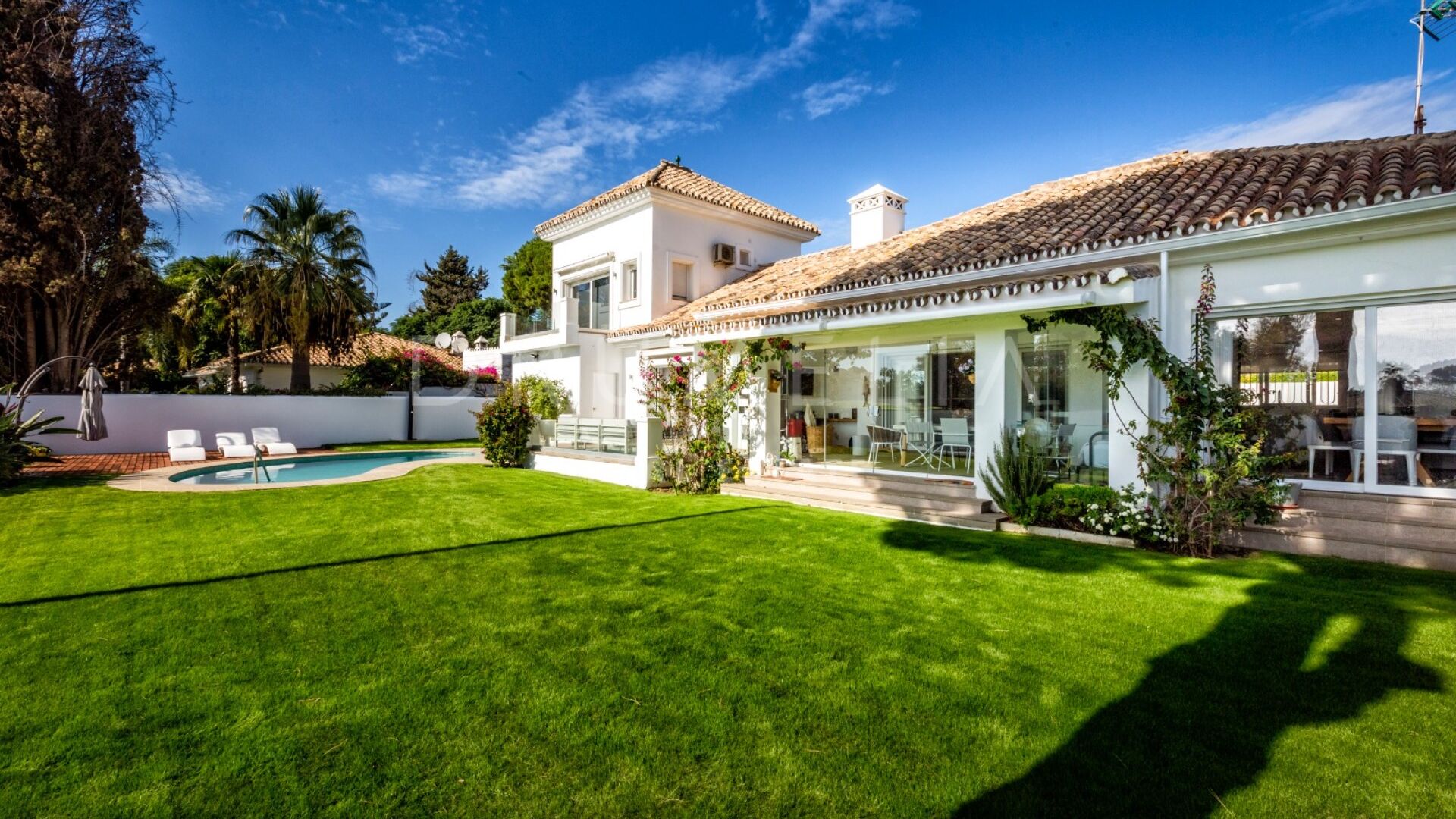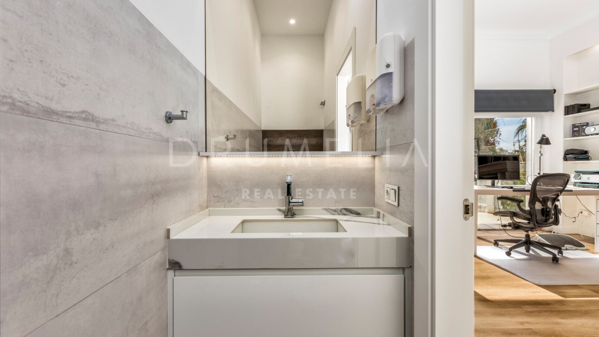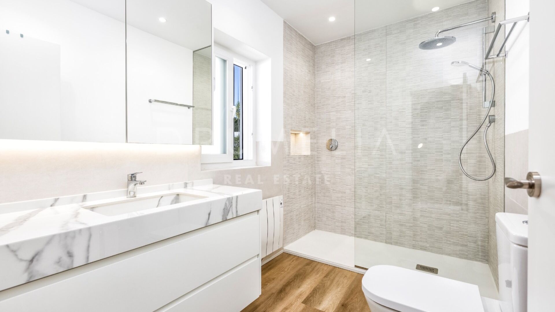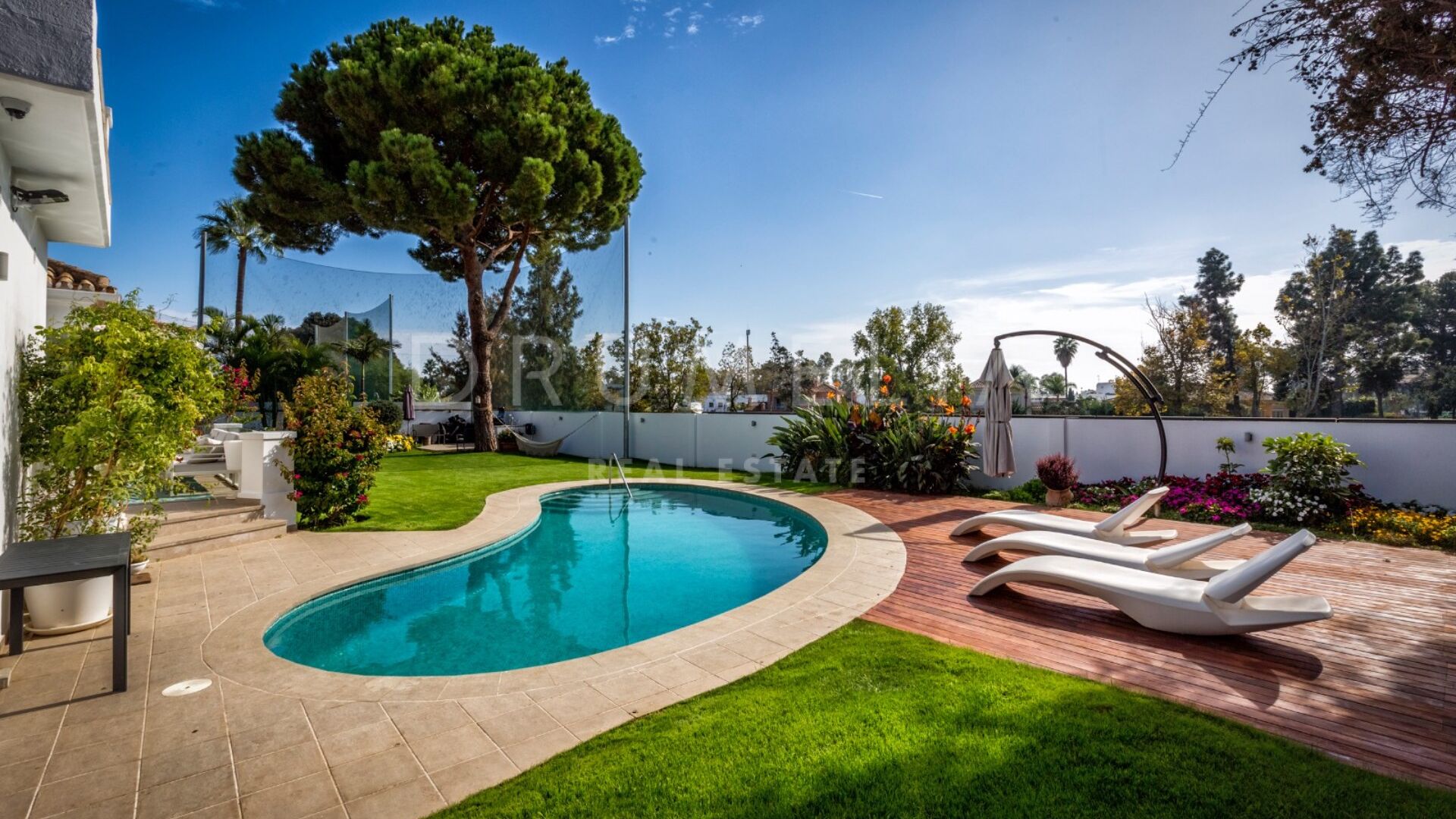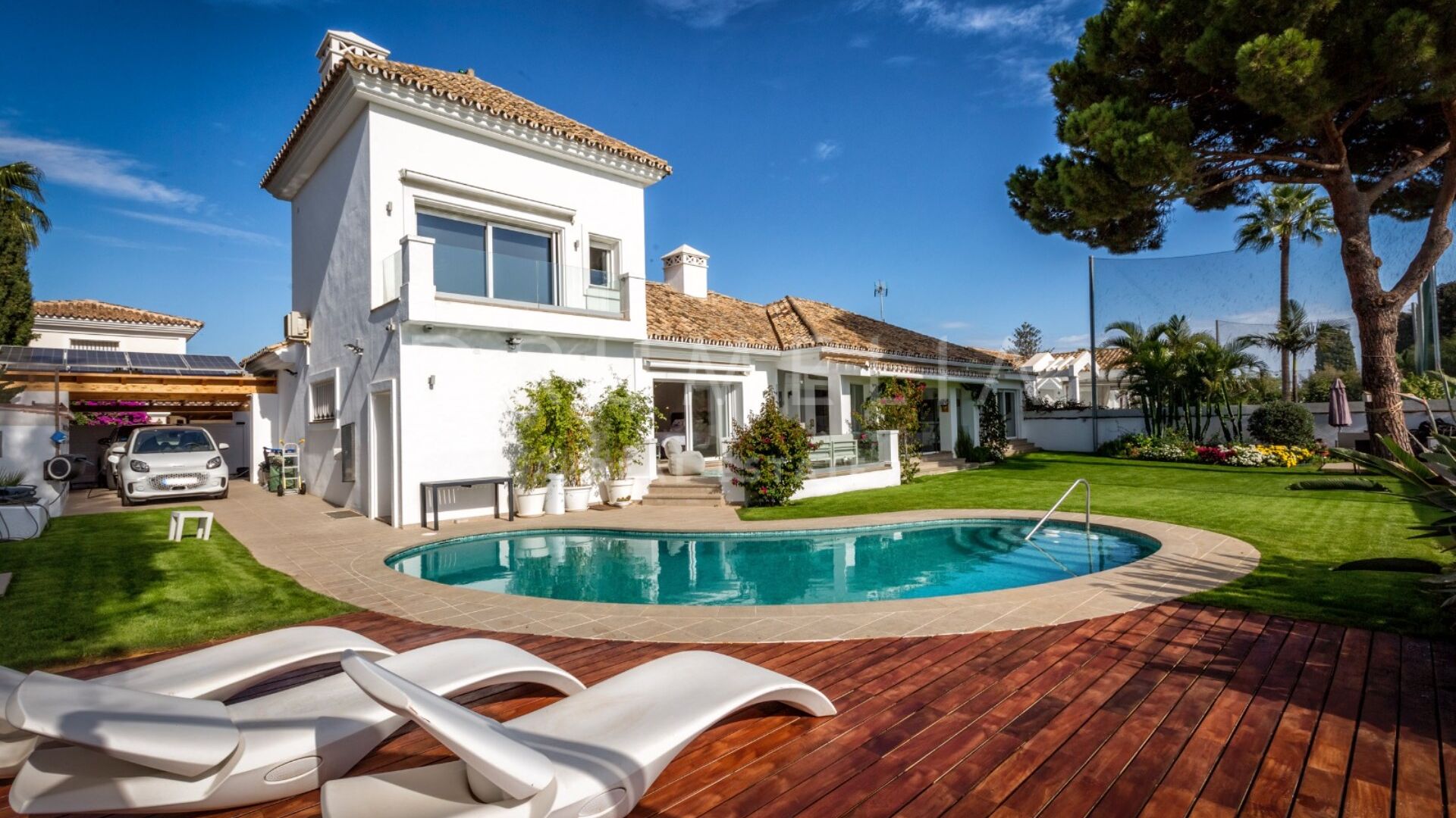 In Guadalmina Alta, San Pedro, wird eine renovierte Luxusvilla mit 4 Schlafzimmern und herrlichem Blick auf den Golfplatz zum Verkauf angeboten. Dies ist eine der begehrtesten Gegenden von Marbella. Ideal an der Westseite von Marbella gelegen, ist die ruhige Gemeinde eine Welt entfernt vom Lärm und Stress der touristischen Gebiete. Gleichzeitig befindet sie sich in unmittelbarer Nähe zu allen Dienstleistungen und Annehmlichkeiten, nur eine kurze Strecke vom Zentrum von San Pedro entfernt, einen kurzen Spaziergang vom mit der Blauen Flagge ausgezeichneten Strand entfernt und nur wenige Autominuten vom legendären Puerto Banús entfernt. In der Nähe befinden sich auch die luxuriösen Einrichtungen des Guadalmina Spa & Golf Resort, Chiringuitos und gute Restaurants, Geschäfte, internationale Schulen, medizinische Einrichtungen, historische Schutzgebiete usw. Guadalmina bietet wunderschöne Ausblicke auf die Golfplätze, das Mittelmeer und das Wahrzeichen von Marbella, La Concha, das stolz 1.270 m über der Stadt thront.