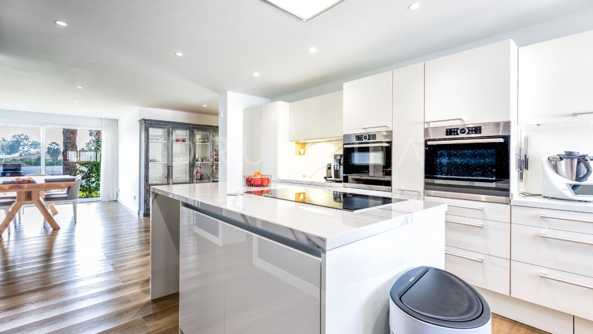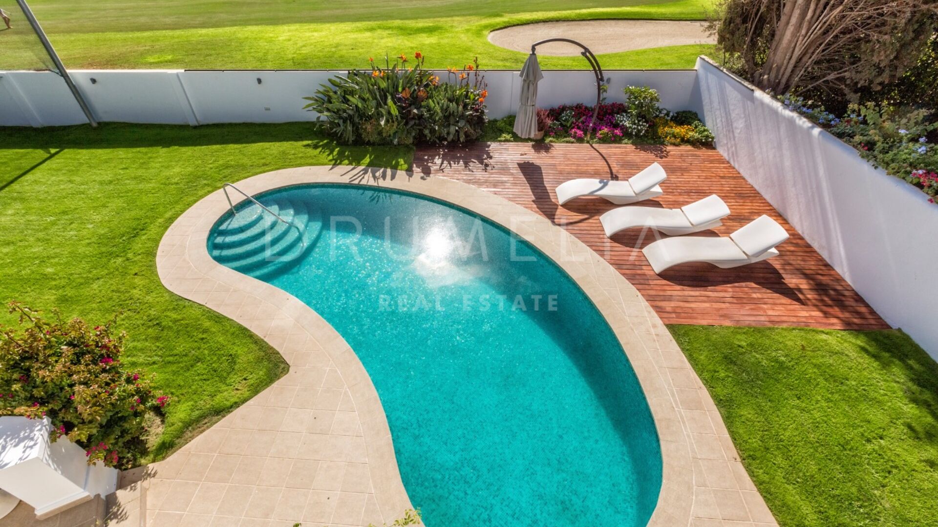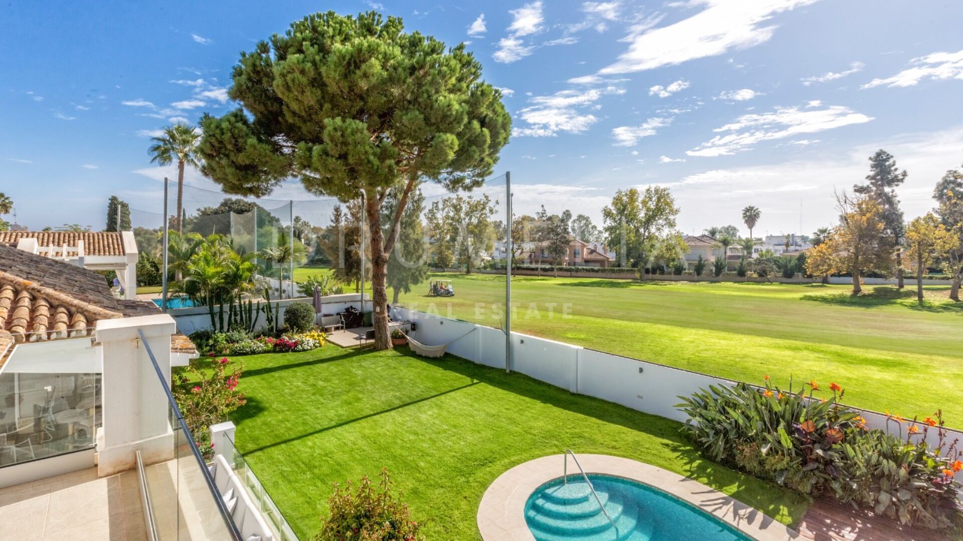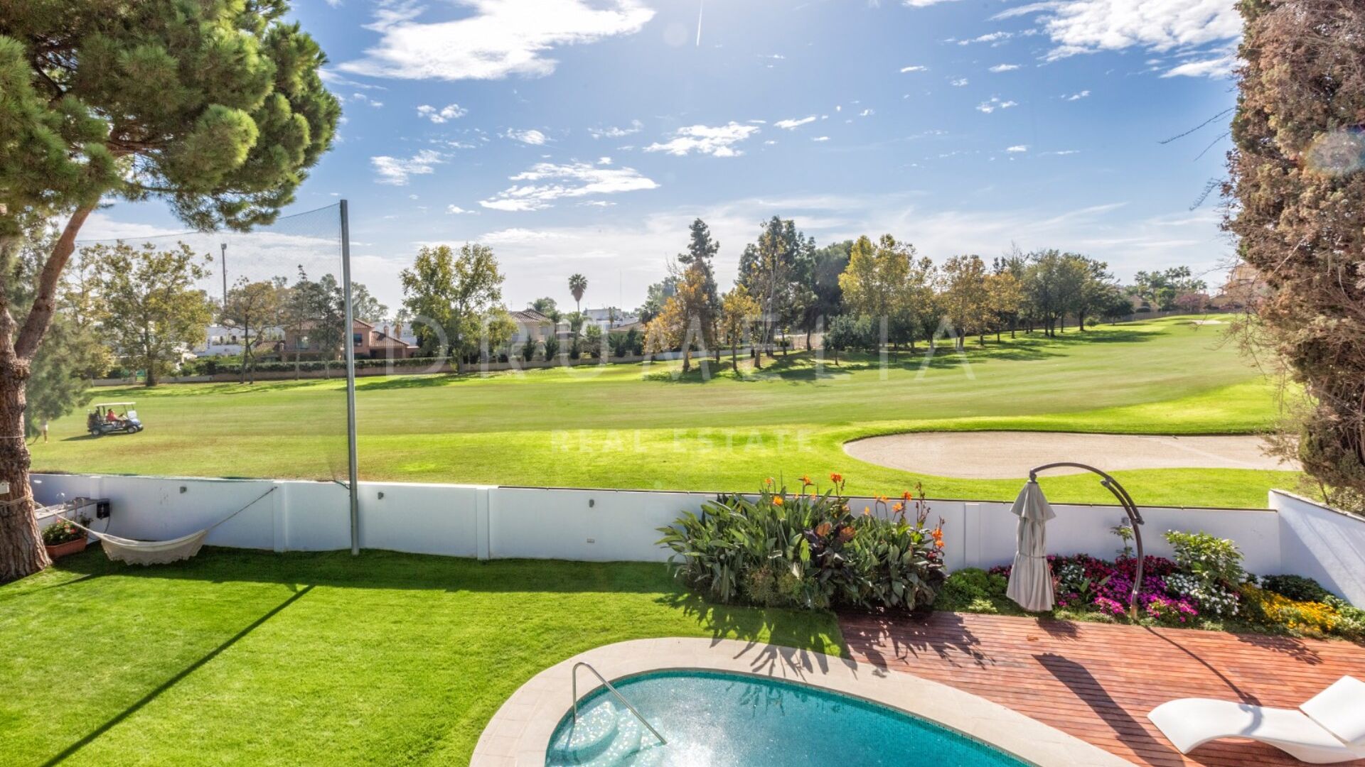 Umgeben von üppigem Grün und den Luxusimmobilien der prestigeträchtigen Gegend, wurde die mediterrane Villa von 340 m² mit den besten Qualitäten renoviert, sowohl in der Konstruktion als auch in der Technologie, und bietet ein wirklich bemerkenswertes Wohnerlebnis. Sie steht auf einem 906 m² großen, quadratischen Grundstück mit einem großen Garten, einem Swimmingpool und Parkplätzen für mehrere Autos. Das Haus besticht durch eine elegante mediterrane Architektur und eine schöne Innenausstattung, die ein angenehmes Gefühl von Ruhe und Frieden vermittelt. Dank der Südausrichtung und der vielen Glasflächen wird das Innere den ganzen Tag über von Sonne und Licht erhellt. Sie werden die herrliche Aussicht auf die bezaubernde Umgebung, den Landschaftsgarten und den Golfplatz genießen. Das geräumige und helle Anwesen besteht aus einem großen Wohnzimmer mit Zugang zu den Terrassen zum Entspannen und Essen im Freien, einer offenen, voll ausgestatteten Küche im minimalistischen Stil mit Waschküche und Weinkühler, einem separaten Esszimmer, einem Büro, 5 gemütlichen Schlafzimmern mit Einbauschränken und einem begehbaren Ankleidebereich sowie 6 Badezimmern. Die Zimmer befinden sich auf einer Etage, mit Ausnahme eines der Schlafzimmer mit Bad und Terrasse, das sich im ersten Stock befindet und Ihre beeindruckende Master Suite sein kann. Die vollständig zu öffnenden Schiebefenster und Glastüren, die das Innere mit dem Äußeren verbinden, führen nach draußen und lassen mehr Raum für frische Luft, die in das bemerkenswerte Haus strömt. Der nierenförmige Pool mit seinem hölzernen Sonnendeck, den Liegestühlen und der Dusche fügt sich nahtlos in die Ästhetik des sauberen Gartens mit seinem grünen Rasen und den mediterranen Pflanzen ein. Eine Hängematte verleiht dem Garten ein besonderes Flair und ist eine großartige Möglichkeit, die freie Zeit in der Natur und mit Blick auf den smaragdgrünen Golfplatz zu verbringen.