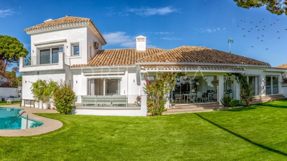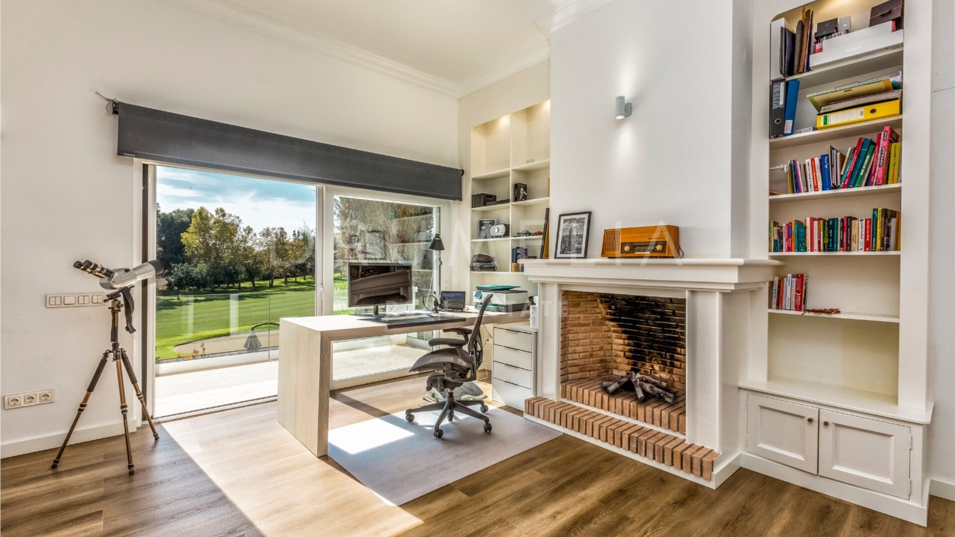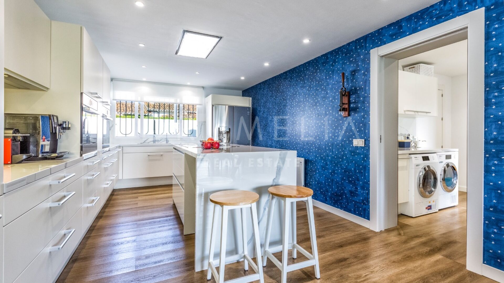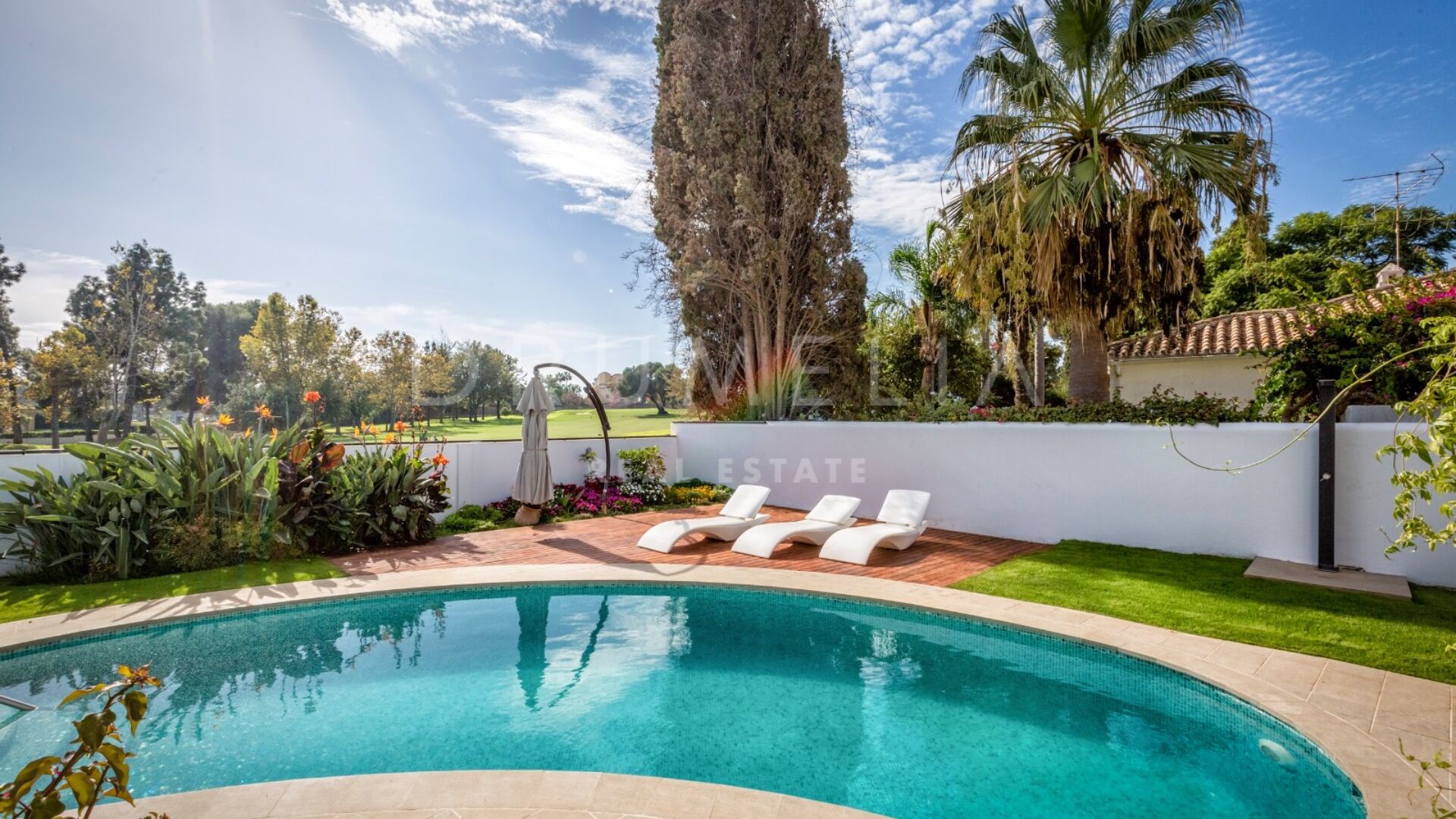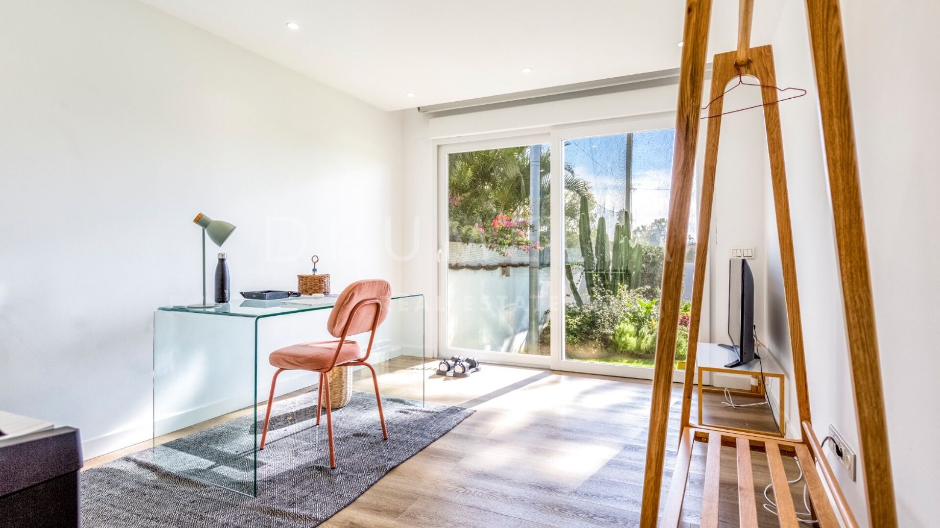 Umgeben von üppigem Grün und den Luxusimmobilien der prestigeträchtigen Gegend, wurde die mediterrane Villa von 340 m² mit den besten Qualitäten renoviert, sowohl in der Konstruktion als auch in der Technologie, und bietet ein wirklich bemerkenswertes Wohnerlebnis. Sie steht auf einem 906 m² großen, quadratischen Grundstück mit einem großen Garten, einem Swimmingpool und Parkplätzen für mehrere Autos. Das Haus besticht durch eine elegante mediterrane Architektur und eine schöne Innenausstattung, die ein angenehmes Gefühl von Ruhe und Frieden vermittelt. Dank der Südausrichtung und der vielen Glasflächen wird das Innere den ganzen Tag über von Sonne und Licht erhellt. Sie werden die herrliche Aussicht auf die bezaubernde Umgebung, den Landschaftsgarten und den Golfplatz genießen. Das geräumige und helle Anwesen besteht aus einem großen Wohnzimmer mit Zugang zu den Terrassen zum Entspannen und Essen im Freien, einer offenen, voll ausgestatteten Küche im minimalistischen Stil mit Waschküche und Weinkühler, einem separaten Esszimmer, einem Büro, 5 gemütlichen Schlafzimmern mit Einbauschränken und einem begehbaren Ankleidebereich sowie 6 Badezimmern. Die Zimmer befinden sich auf einer Etage, mit Ausnahme eines der Schlafzimmer mit Bad und Terrasse, das sich im ersten Stock befindet und Ihre beeindruckende Master Suite sein kann. Die vollständig zu öffnenden Schiebefenster und Glastüren, die das Innere mit dem Äußeren verbinden, führen nach draußen und lassen mehr Raum für frische Luft, die in das bemerkenswerte Haus strömt. Der nierenförmige Pool mit seinem hölzernen Sonnendeck, den Liegestühlen und der Dusche fügt sich nahtlos in die Ästhetik des sauberen Gartens mit seinem grünen Rasen und den mediterranen Pflanzen ein. Eine Hängematte verleiht dem Garten ein besonderes Flair und ist eine großartige Möglichkeit, die freie Zeit in der Natur und mit Blick auf den smaragdgrünen Golfplatz zu verbringen.
