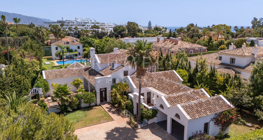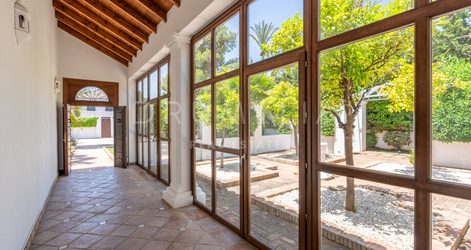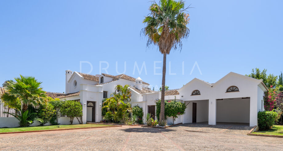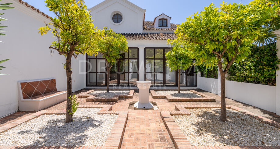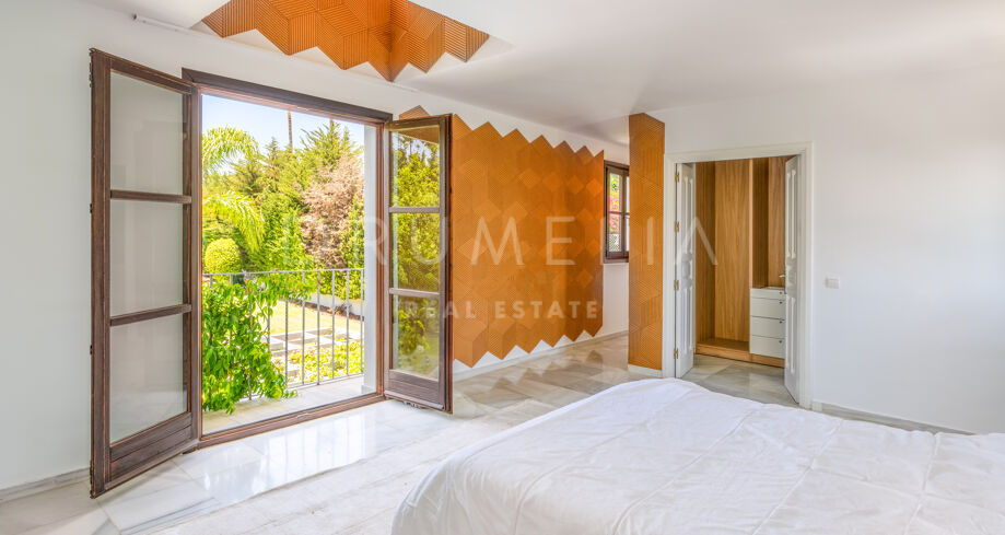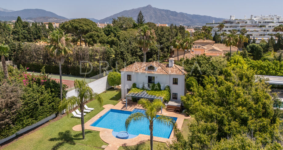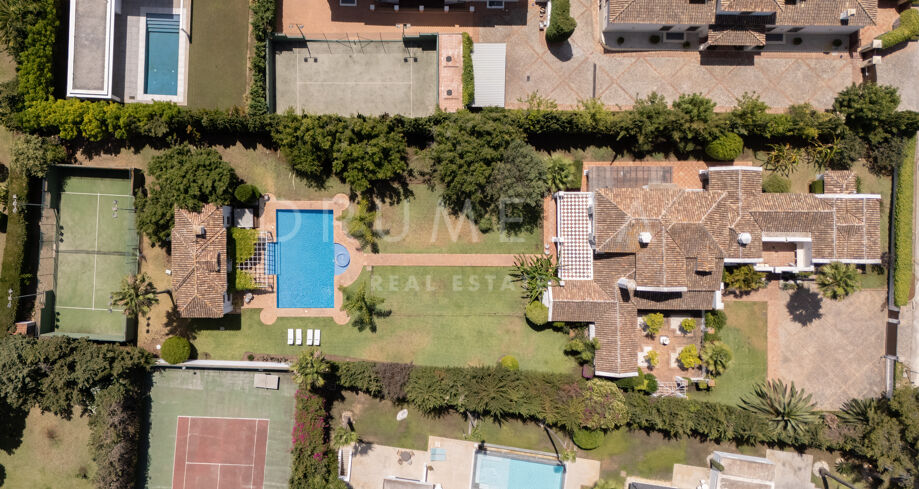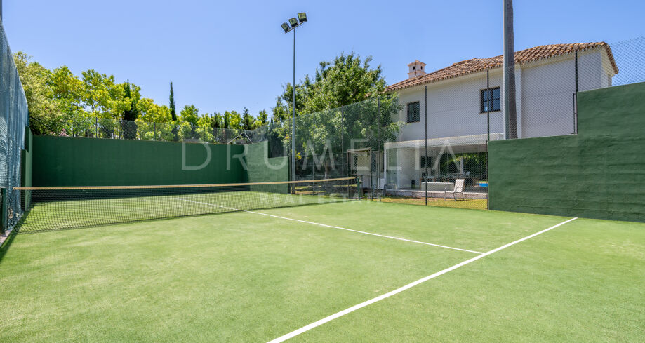 Traditioneller Luxus findet sich in jeder Ecke dieses 2-stöckigen, nach Süden ausgerichteten Anwesens mit ruhigem Blick auf die malerische Umgebung und wunderschönem Innen- und Außendesign. Auf einem großzügigen Grundstück von 3.374 m² mit Ein- und Ausfahrt verfügt das 750 m² große Haus über einen eleganten Wohnbereich mit Kaminsalon und direktem Zugang zum malerischen Garten, 5 Schlafzimmer (einige mit eigenem Balkon), 8 herrliche moderne Badezimmer und 1 Gäste-WC. Die exzellente, moderne Küche ist top ausgestattet und verfügt über eine raffinierte, moderne Beleuchtungslösung. Die fabelhafte Immobilie hat definitiv eine starke Persönlichkeit und der Außenbereich trägt zu ihrem einzigartigen Charakter bei. Wunderschöne Balkone und Terrassen laden zum Essen im Freien und zum Entspannen ein. Der andalusische Innenhof ist mit Terrakottafliesen, einer traditionellen Bank, einem Springbrunnen und Zitrusbäumen ausgestattet. Es gibt Wasserobjekte, Pergolen, einen parkähnlichen subtropischen Landschaftsgarten mit grünen Rasenflächen, alten Palmen und blühenden Blumenbeeten, einen imposanten Swimmingpool und einen Tennisplatz. Es gibt ein separates Gästeapartment und eine private Garage mit 2 Stellplätzen.