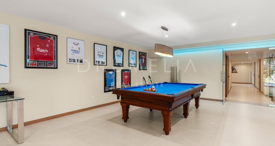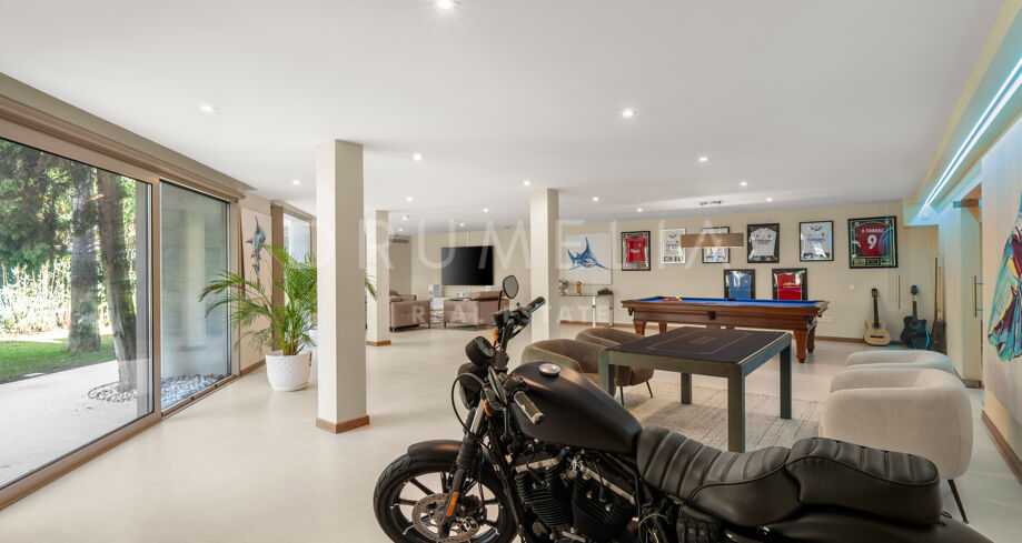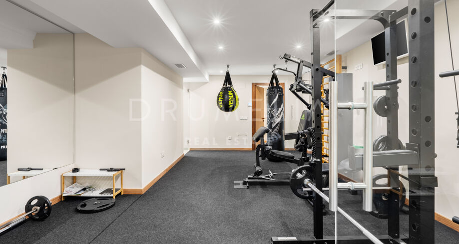 Wellness und Freizeit stehen im Mittelpunkt, mit einem privaten Spa, einem voll ausgestatteten Fitnessraum und einem separaten Büro. Der Spielraum setzt ein besonderes Highlight mit luxuriösem Pool und integriertem Soundsystem, das jede Gelegenheit zu einem Erlebnis macht.