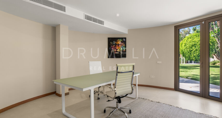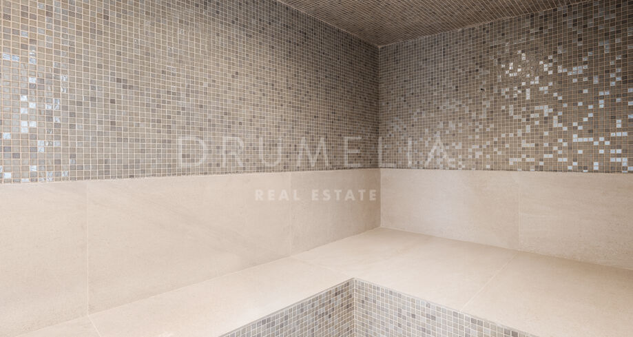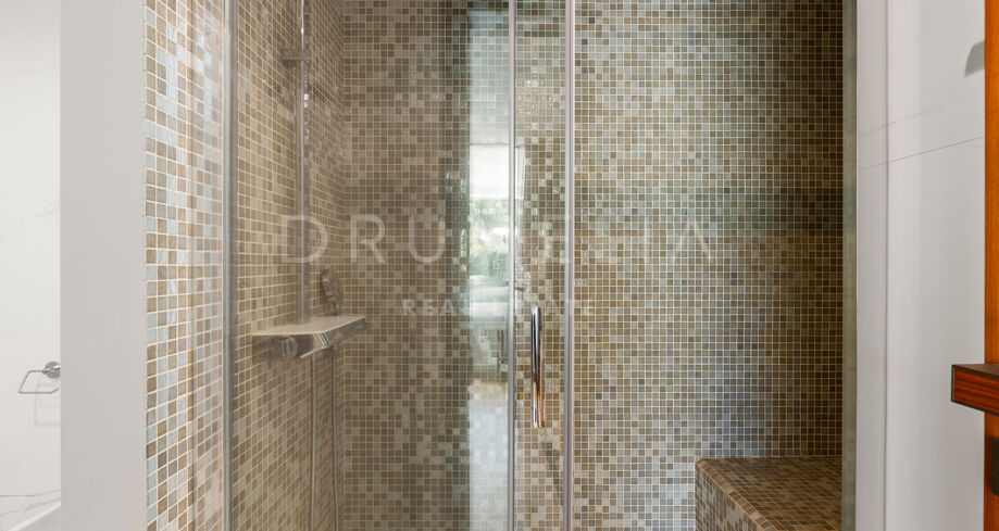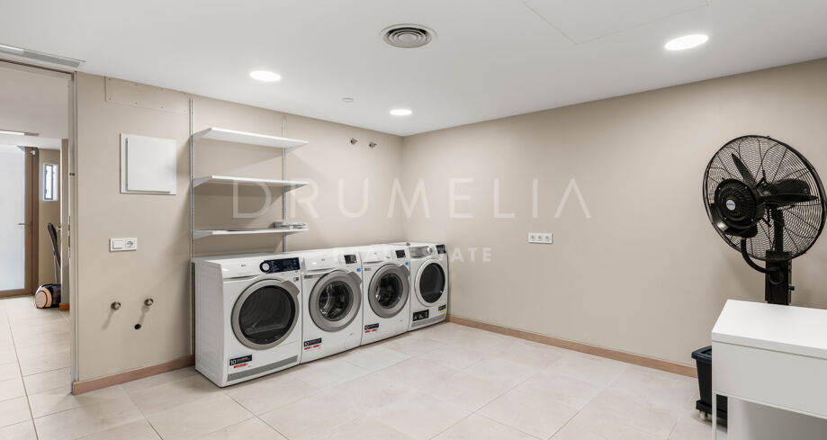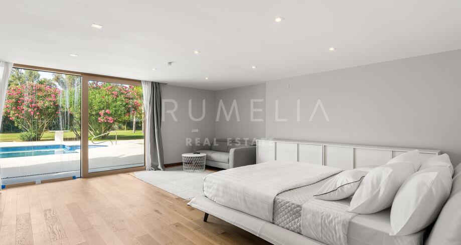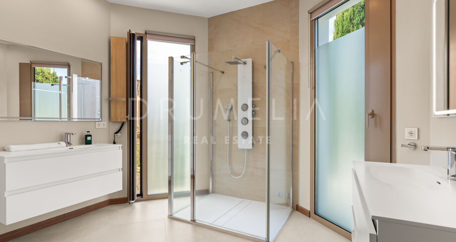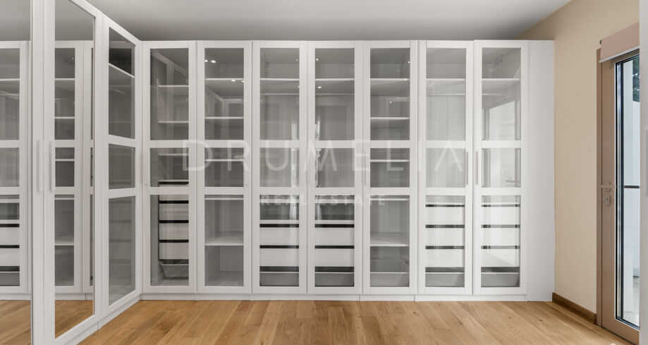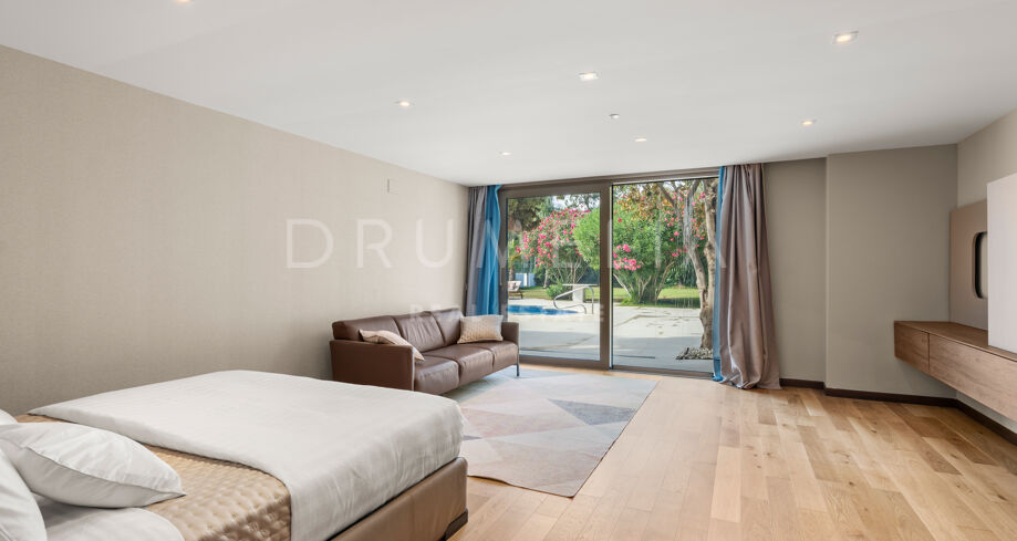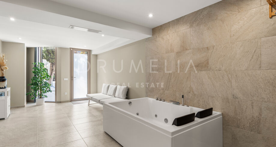 Die Villa bietet sechs großzügige Schlafzimmer und elf Badezimmer, ausgestattet mit Porcelanosa-Fliesen, maßgefertigten Holzböden und luxuriösen Armaturen. Bodentiefe Reynaers-Fenster mit integriertem Anti-Pilz-System fluten die Innenräume mit natürlichem Licht und gewährleisten hervorragende Isolierung und Langlebigkeit.