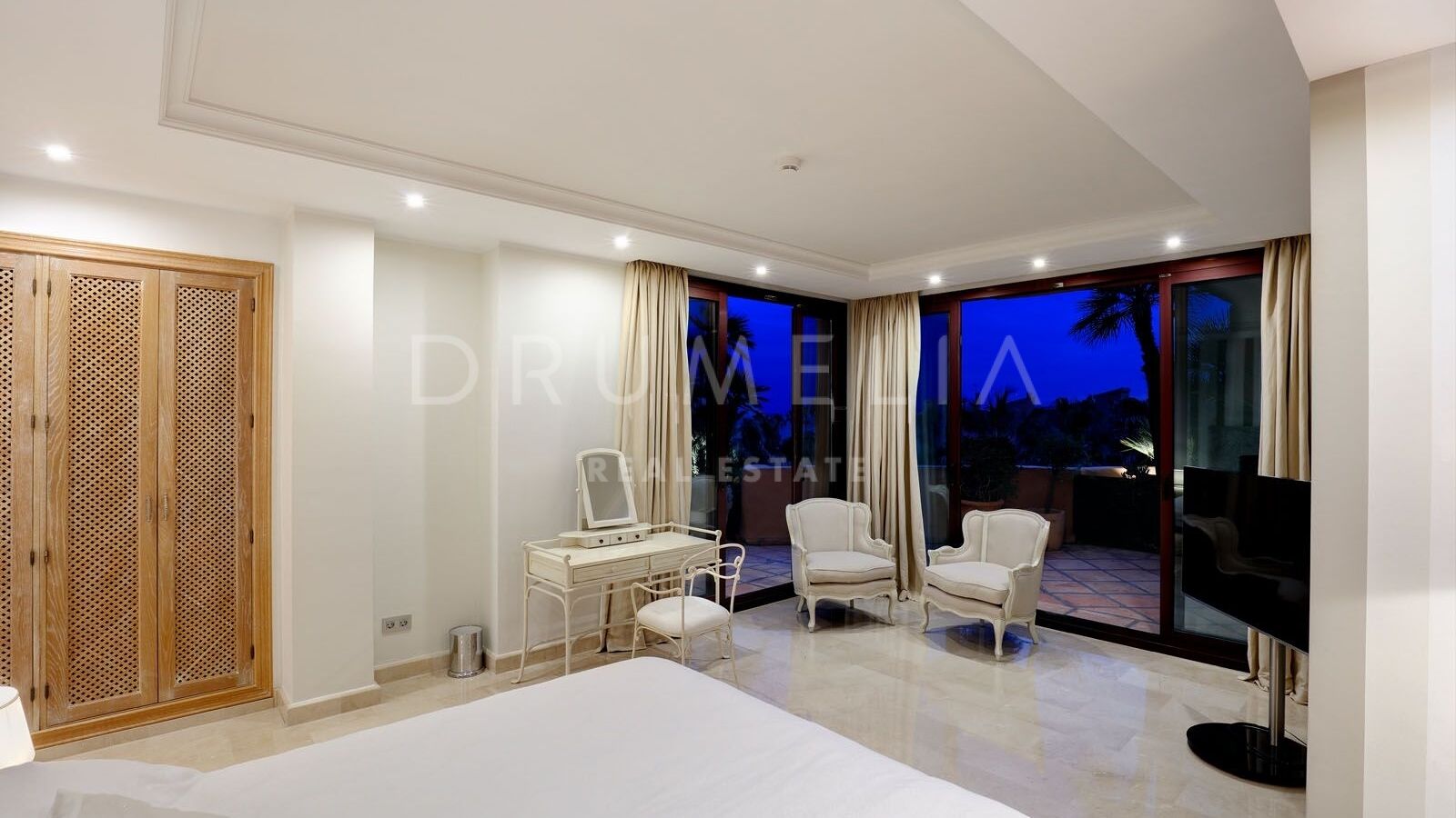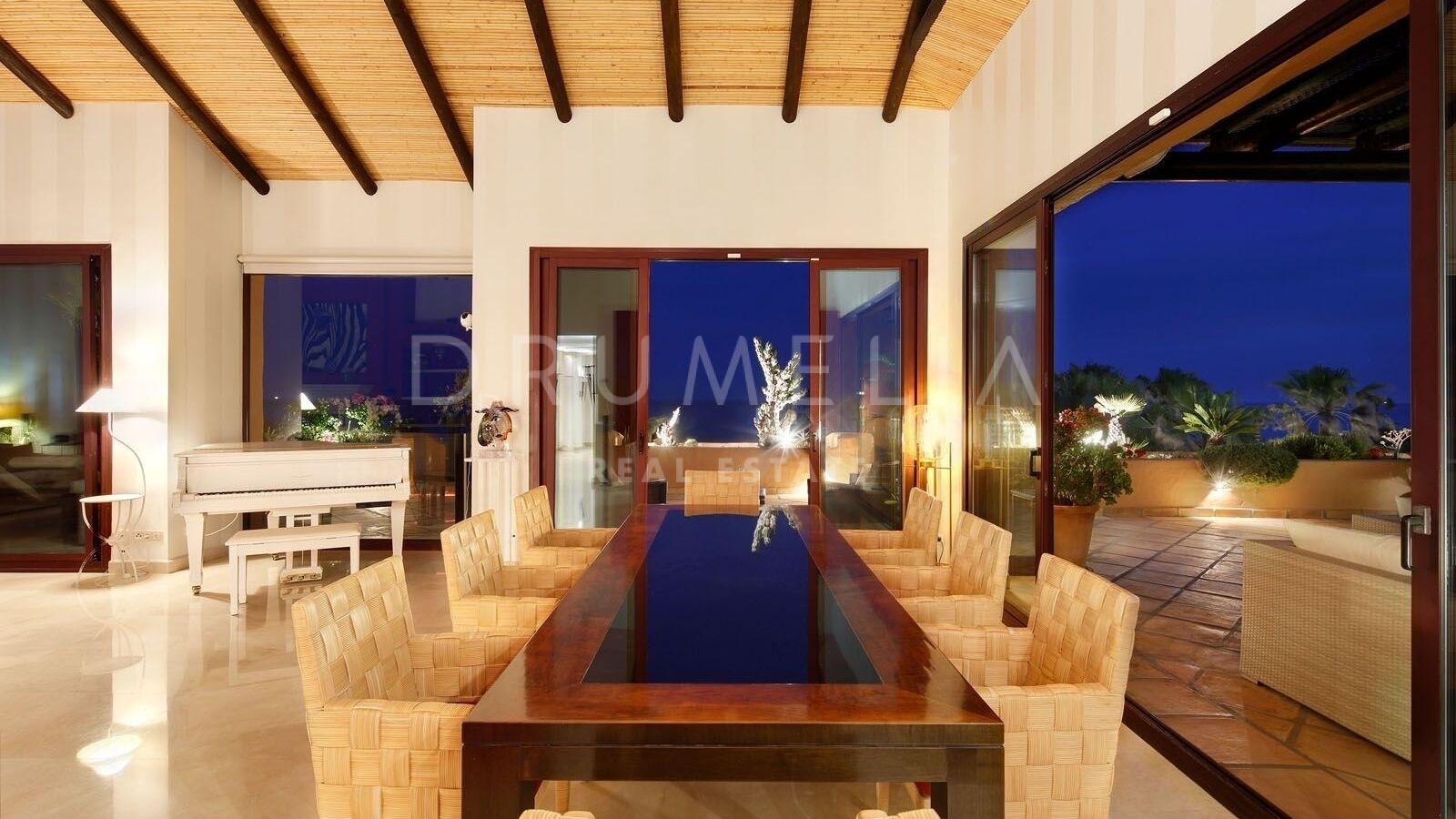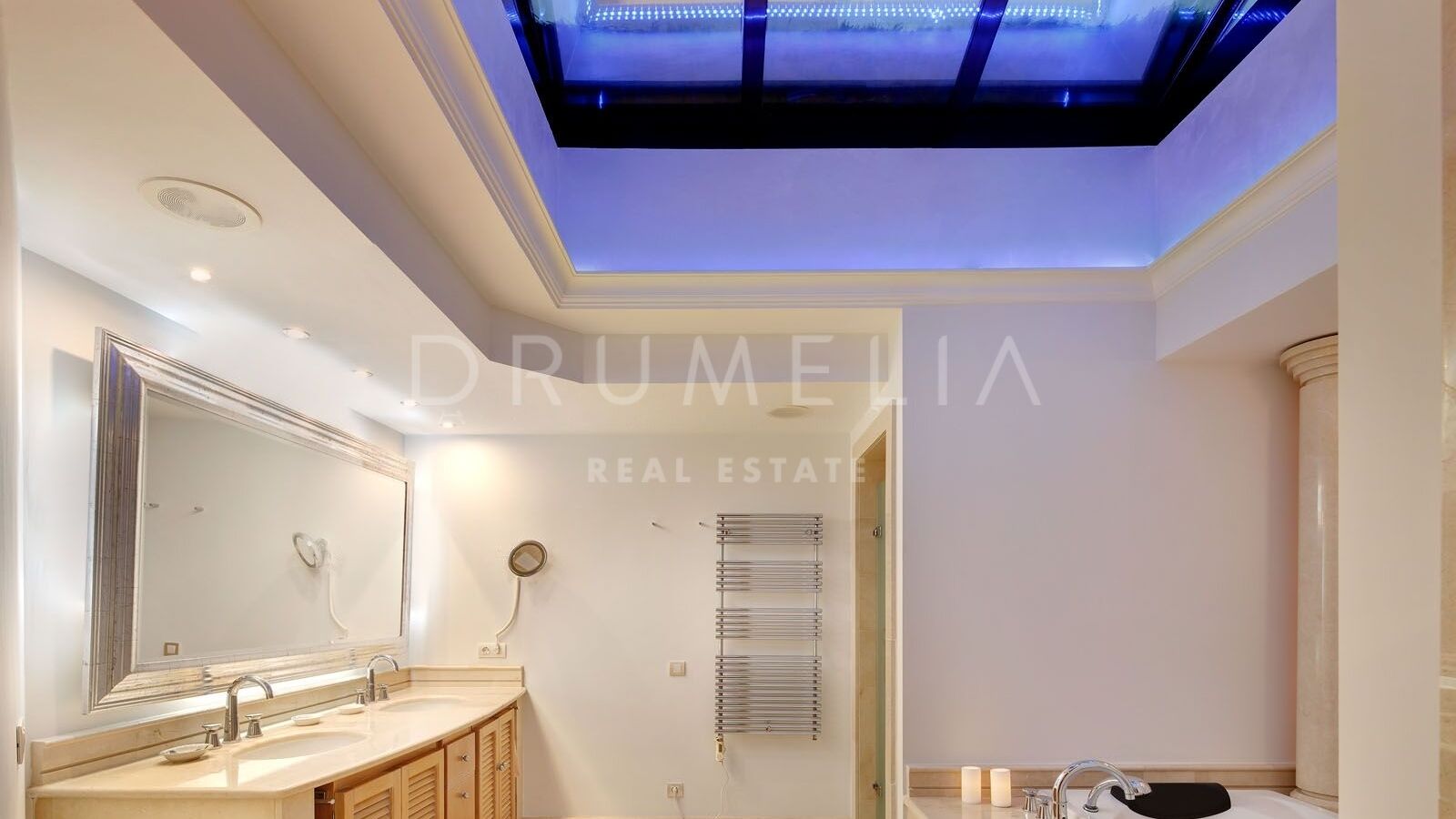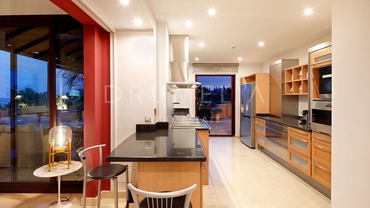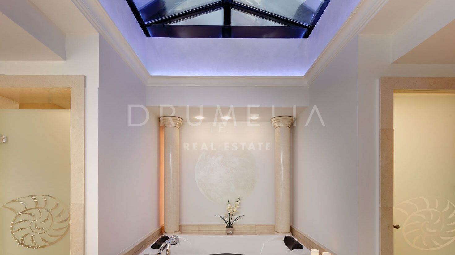 Erleben Sie höchsten Wohnkomfort in diesem großzügigen Penthouse auf einer Ebene mit 427 m² Wohnfläche und zusätzlichen 286 m² sonnigen Terrassen. Ein privater Aufzug führt in eine eindrucksvolle Eingangshalle, die in ein helles Wohnzimmer mit hohen Decken, stilvollem Kamin und raumhohen Fenstern mit atemberaubendem Meerblick übergeht. Die halboffene, komplett ausgestattete Designer-Küche vereint Eleganz mit Funktionalität – ideal für den Alltag und zum Bewirten von Gästen. Alle drei Schlafzimmer bieten direkten Zugang zur Terrasse, darunter eine luxuriöse Master-Suite mit Spa-Badezimmer und Ankleideraum.