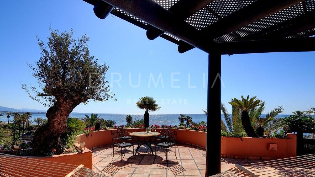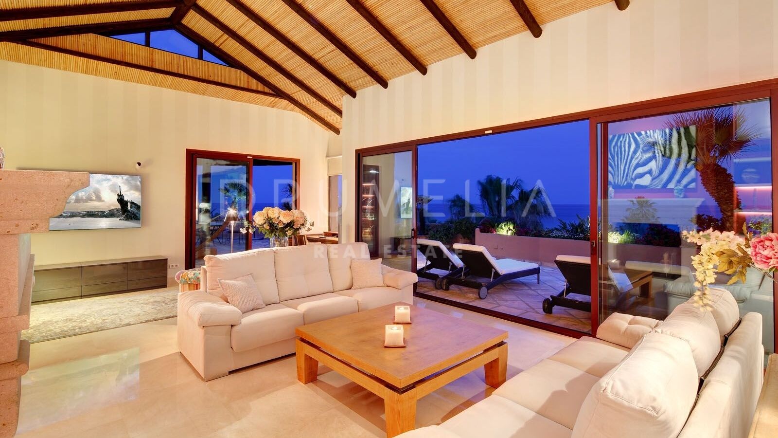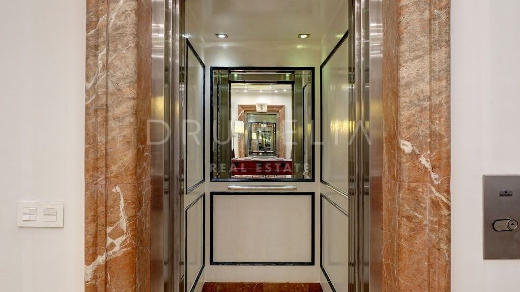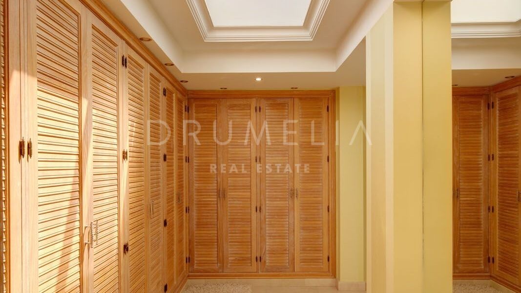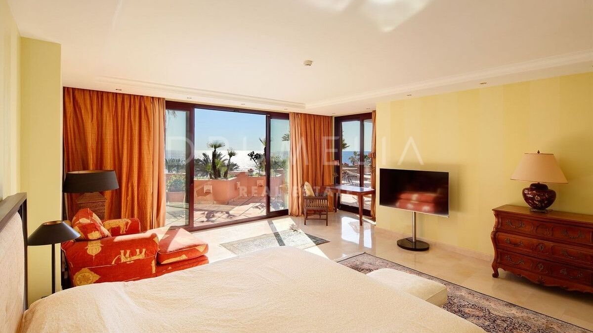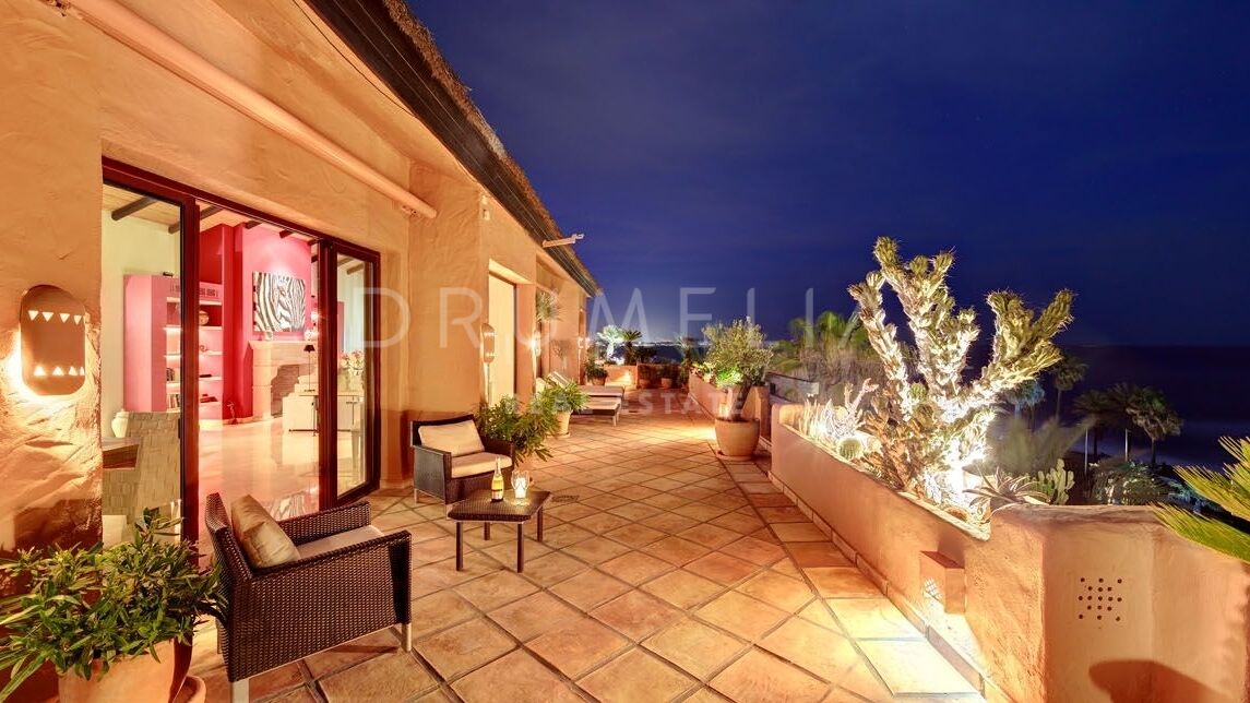 Erleben Sie höchsten Wohnkomfort in diesem großzügigen Penthouse auf einer Ebene mit 427 m² Wohnfläche und zusätzlichen 286 m² sonnigen Terrassen. Ein privater Aufzug führt in eine eindrucksvolle Eingangshalle, die in ein helles Wohnzimmer mit hohen Decken, stilvollem Kamin und raumhohen Fenstern mit atemberaubendem Meerblick übergeht. Die halboffene, komplett ausgestattete Designer-Küche vereint Eleganz mit Funktionalität – ideal für den Alltag und zum Bewirten von Gästen. Alle drei Schlafzimmer bieten direkten Zugang zur Terrasse, darunter eine luxuriöse Master-Suite mit Spa-Badezimmer und Ankleideraum.