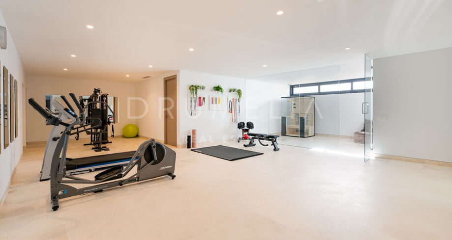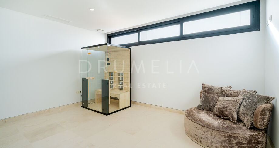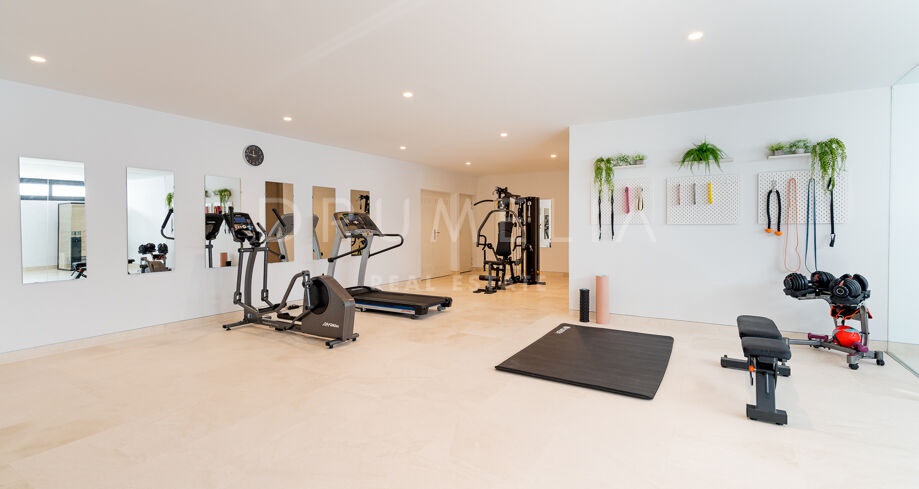 Im Untergeschoss befinden sich ein geräumiger Mehrzweckraum, ein privater Fitnessraum mit Bad und sichere Parkplätze. Die Villa ist für diejenigen gedacht, die Privatsphäre und Ruhe suchen, und liegt in einer Sackgasse in einer sicheren Wohnanlage, nur wenige Minuten von erstklassigen Golfplätzen, internationalen Schulen, dem Strand und den pulsierenden Zentren von Marbella und Puerto Banús entfernt.
