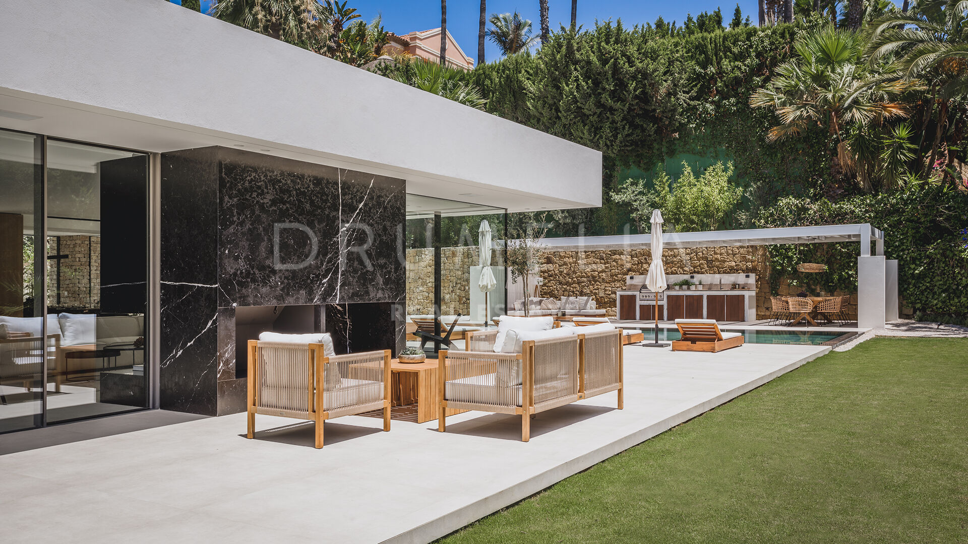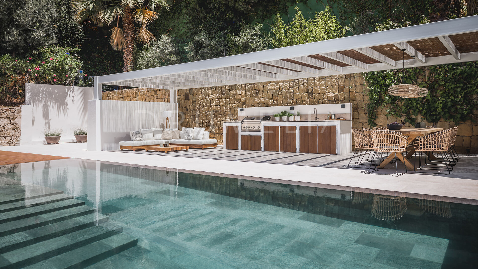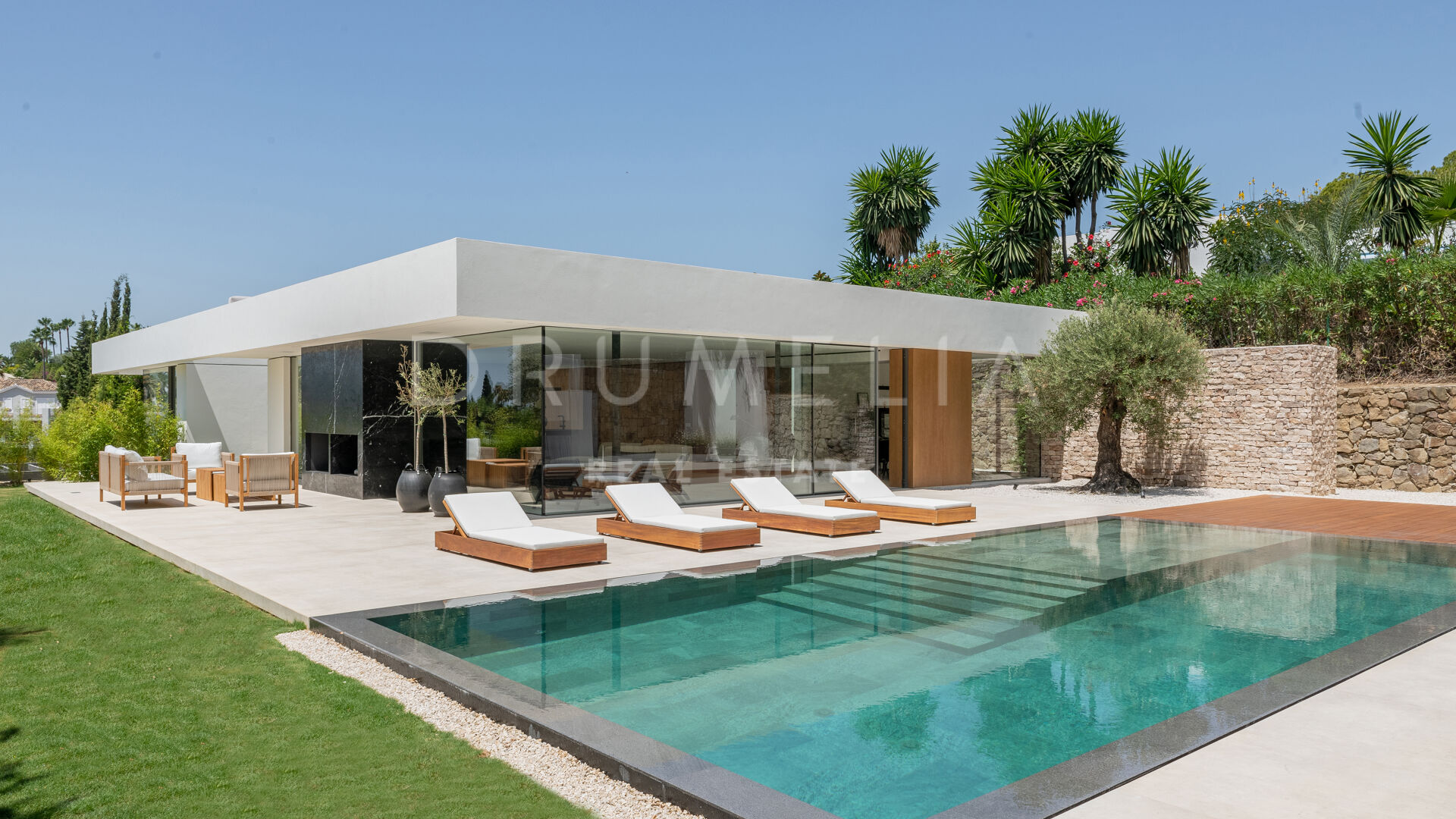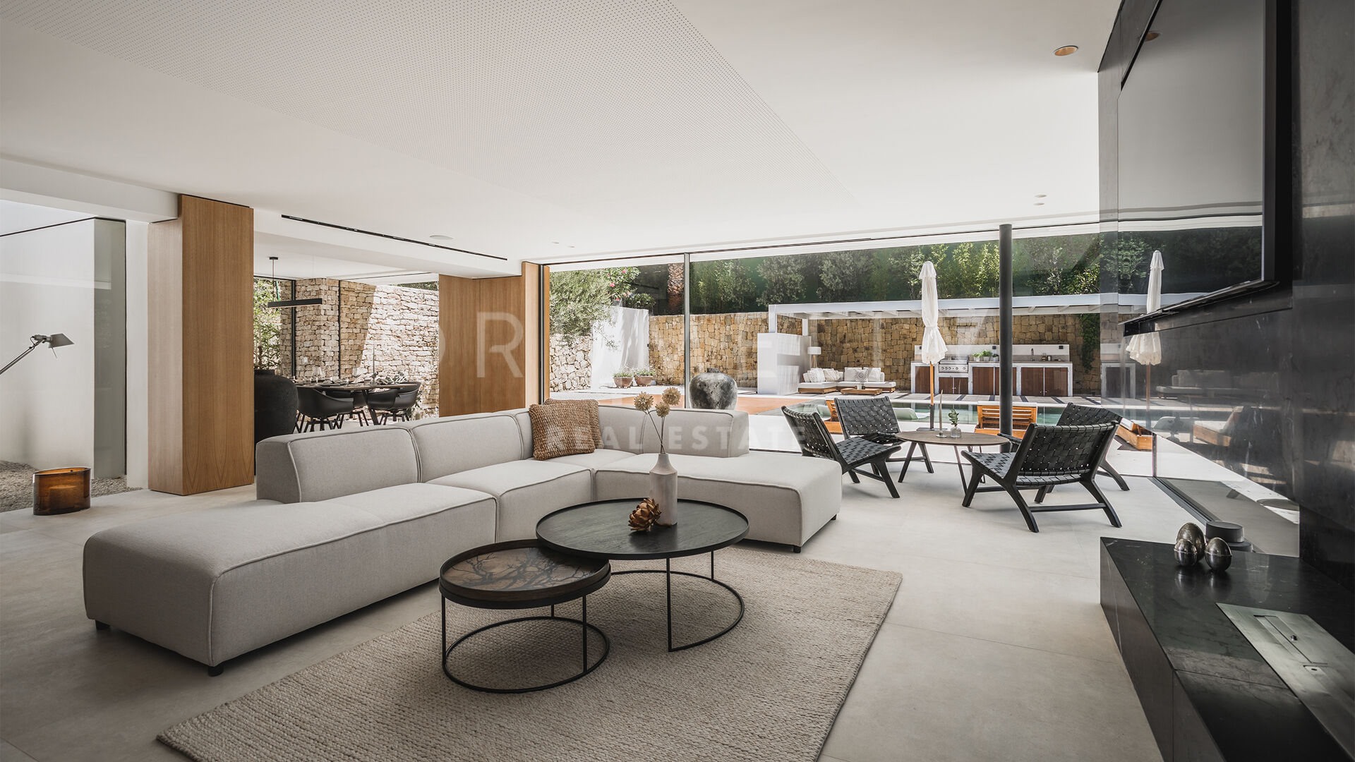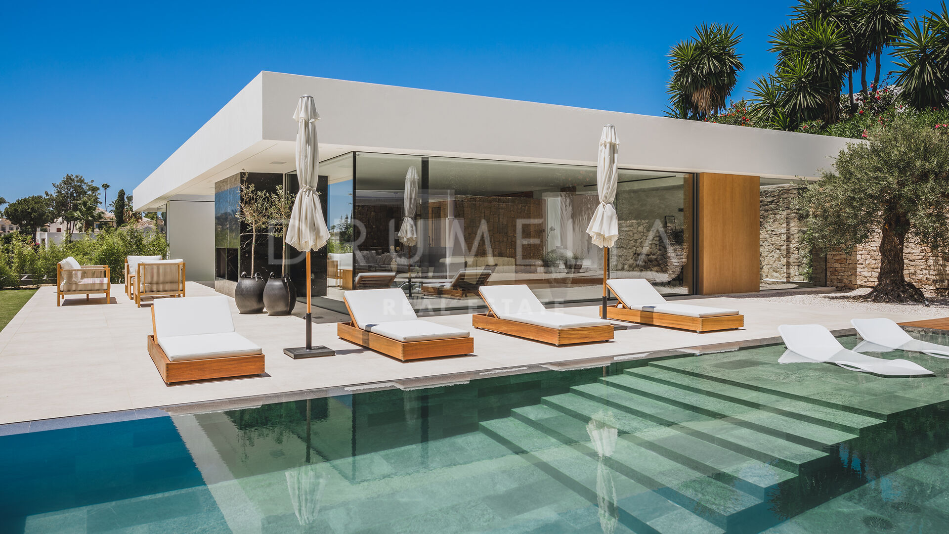 Das ultramoderne Projekt wurde von N-MOBE Architecture & Interior Design, Marbella, entworfen, die für ihre Fähigkeit bekannt sind, qualitativ hochwertige Villen zu entwickeln oder zu renovieren, die den aktuellen Standards entsprechen. Diese exquisite, sehr private Villa wurde von der modernen ibizenkischen Architektur inspiriert. Auf einem Grundstück von 1.202 m² verteilt sich das Haus mit 660 m² auf einer Ebene und bietet offene Wohnbereiche mit bodentiefen Fenstern und Glaswänden, die das Haus mit natürlichem Tageslicht durchfluten und die Innenräume mit den Außenbereichen verbinden, die von Natursteinmauern und üppiger Vegetation umgeben sind.