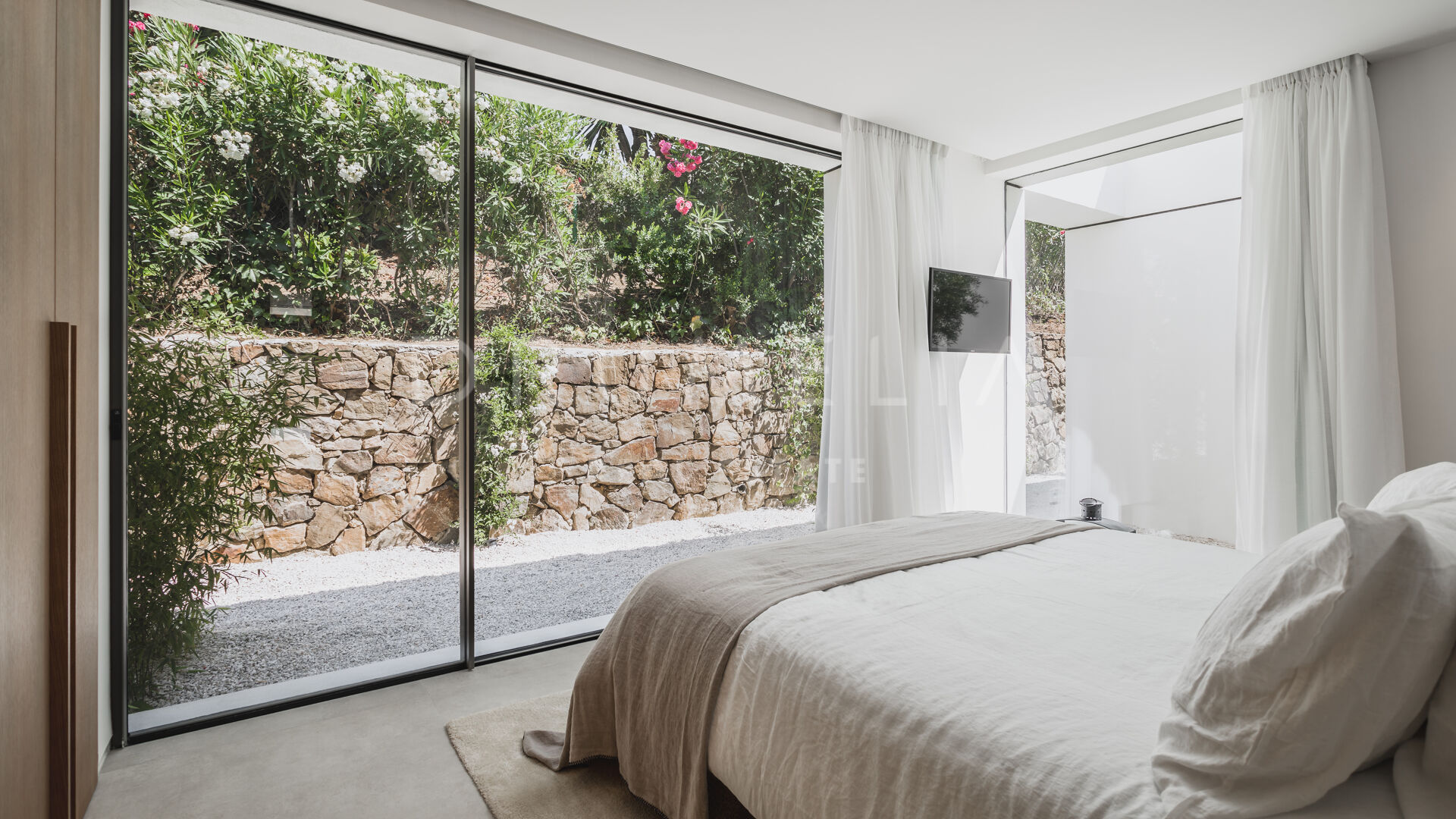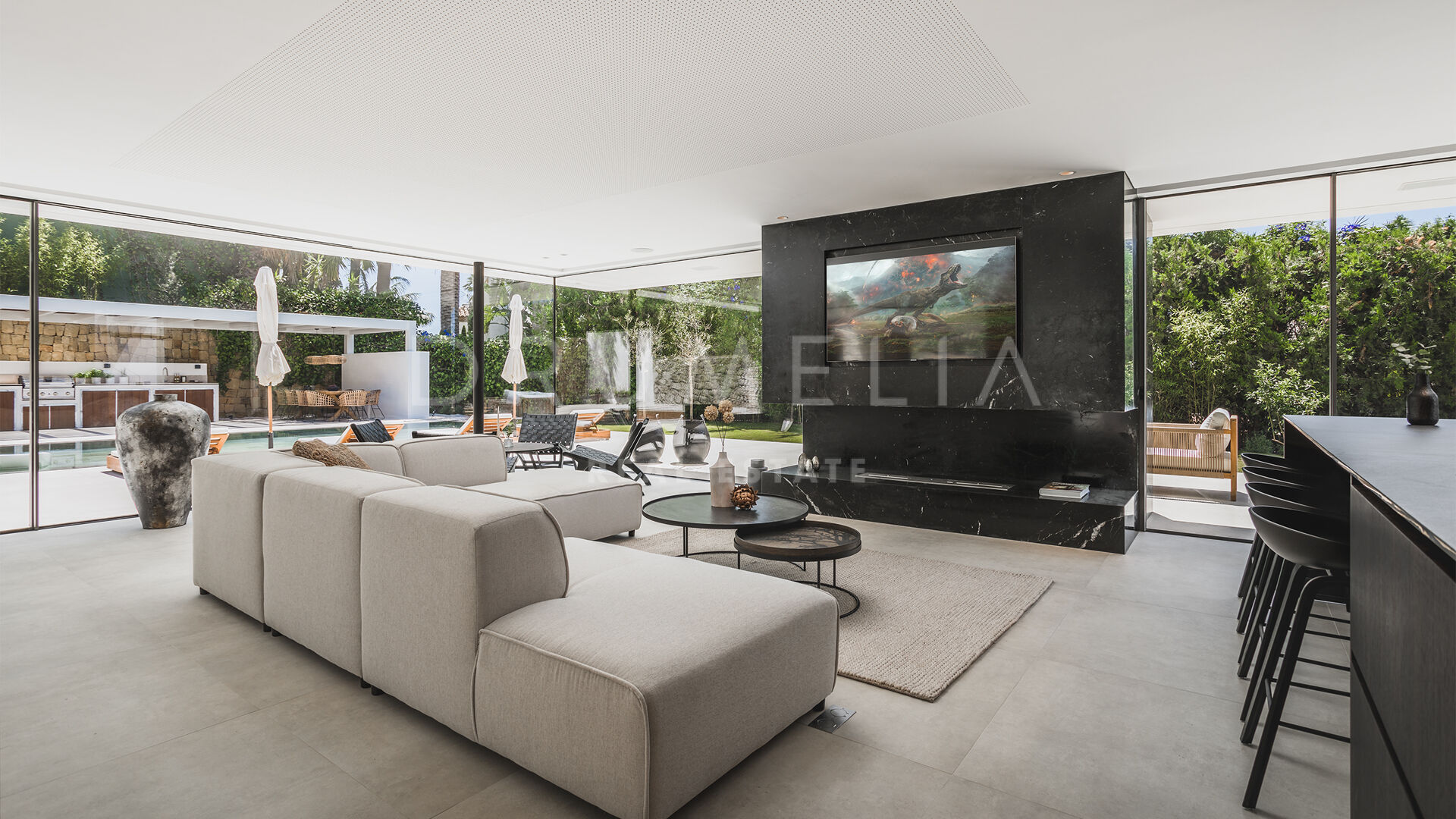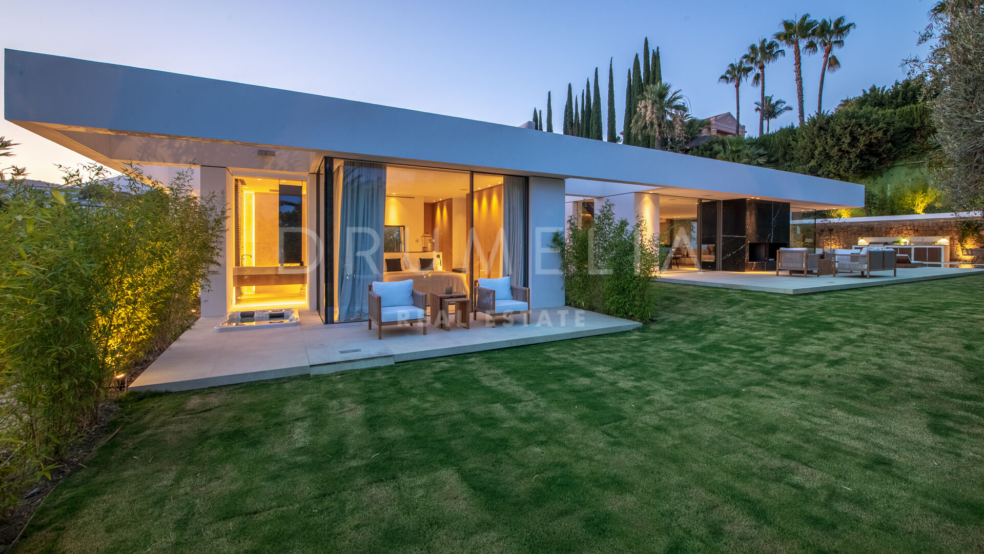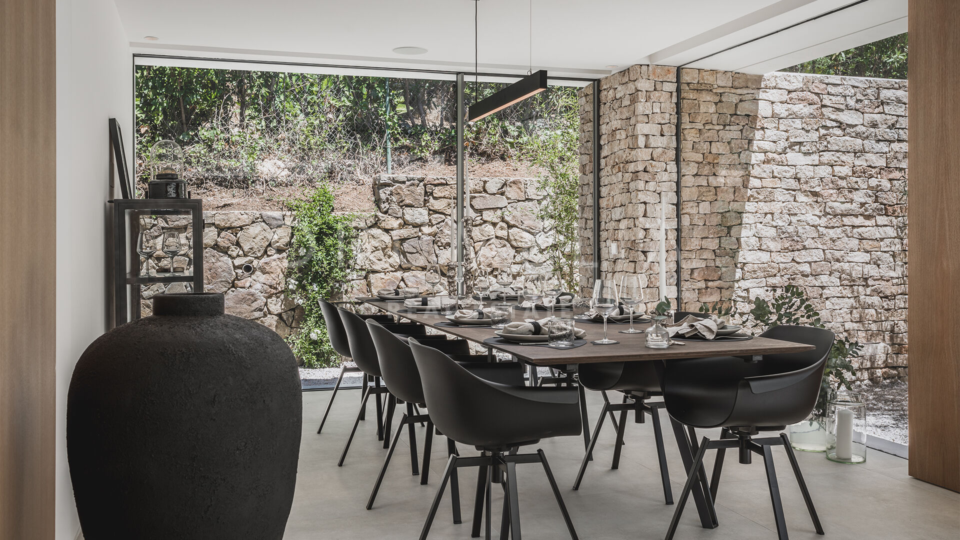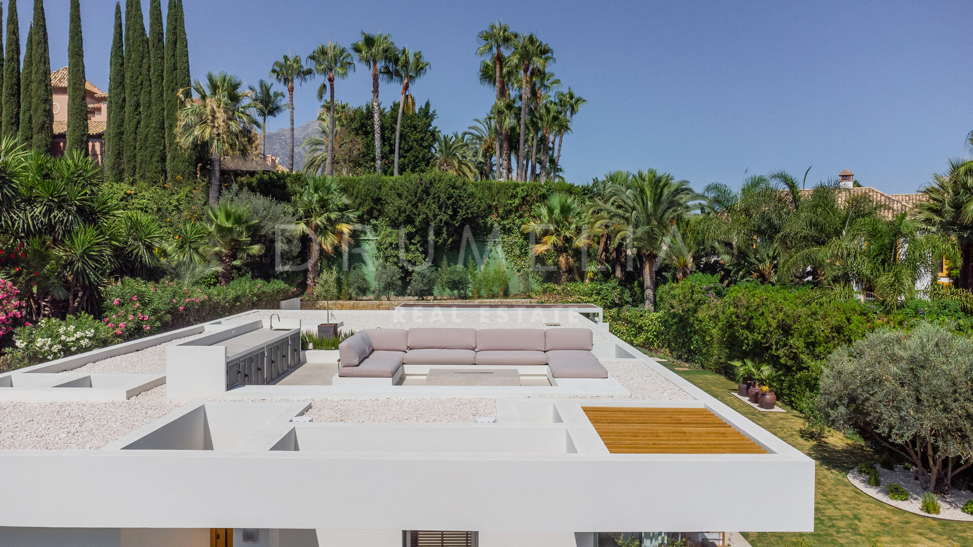 Das ultramoderne Projekt wurde von N-MOBE Architecture & Interior Design, Marbella, entworfen, die für ihre Fähigkeit bekannt sind, qualitativ hochwertige Villen zu entwickeln oder zu renovieren, die den aktuellen Standards entsprechen. Diese exquisite, sehr private Villa wurde von der modernen ibizenkischen Architektur inspiriert. Auf einem Grundstück von 1.202 m² verteilt sich das Haus mit 660 m² auf einer Ebene und bietet offene Wohnbereiche mit bodentiefen Fenstern und Glaswänden, die das Haus mit natürlichem Tageslicht durchfluten und die Innenräume mit den Außenbereichen verbinden, die von Natursteinmauern und üppiger Vegetation umgeben sind.