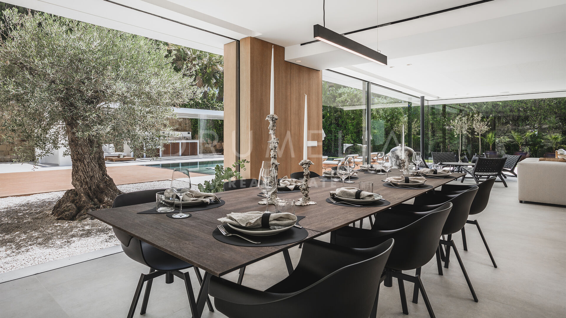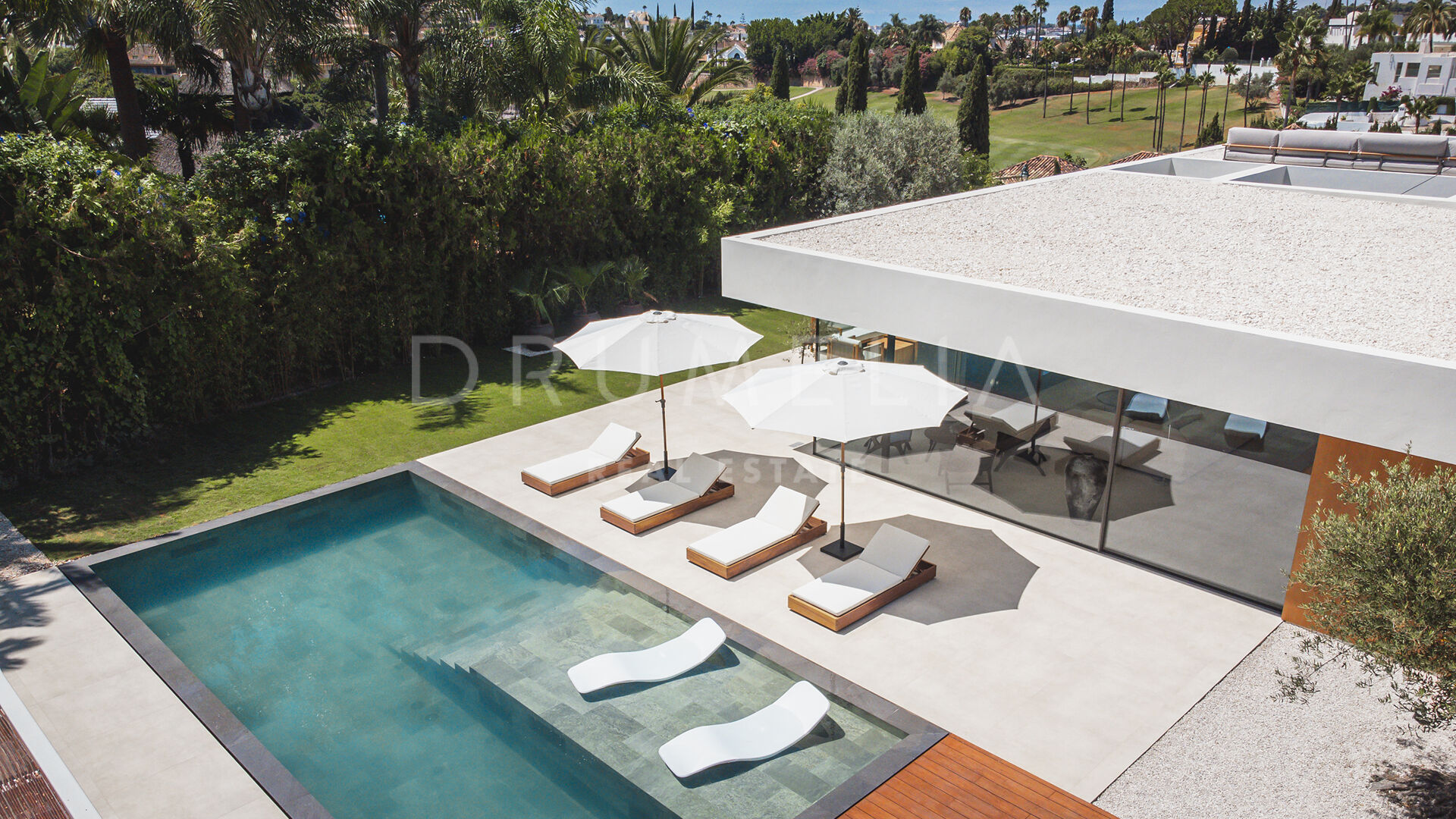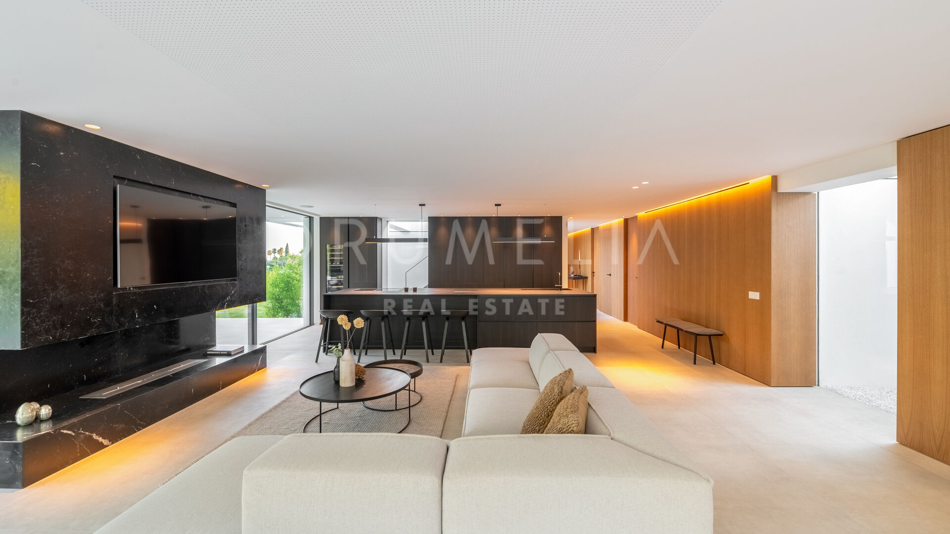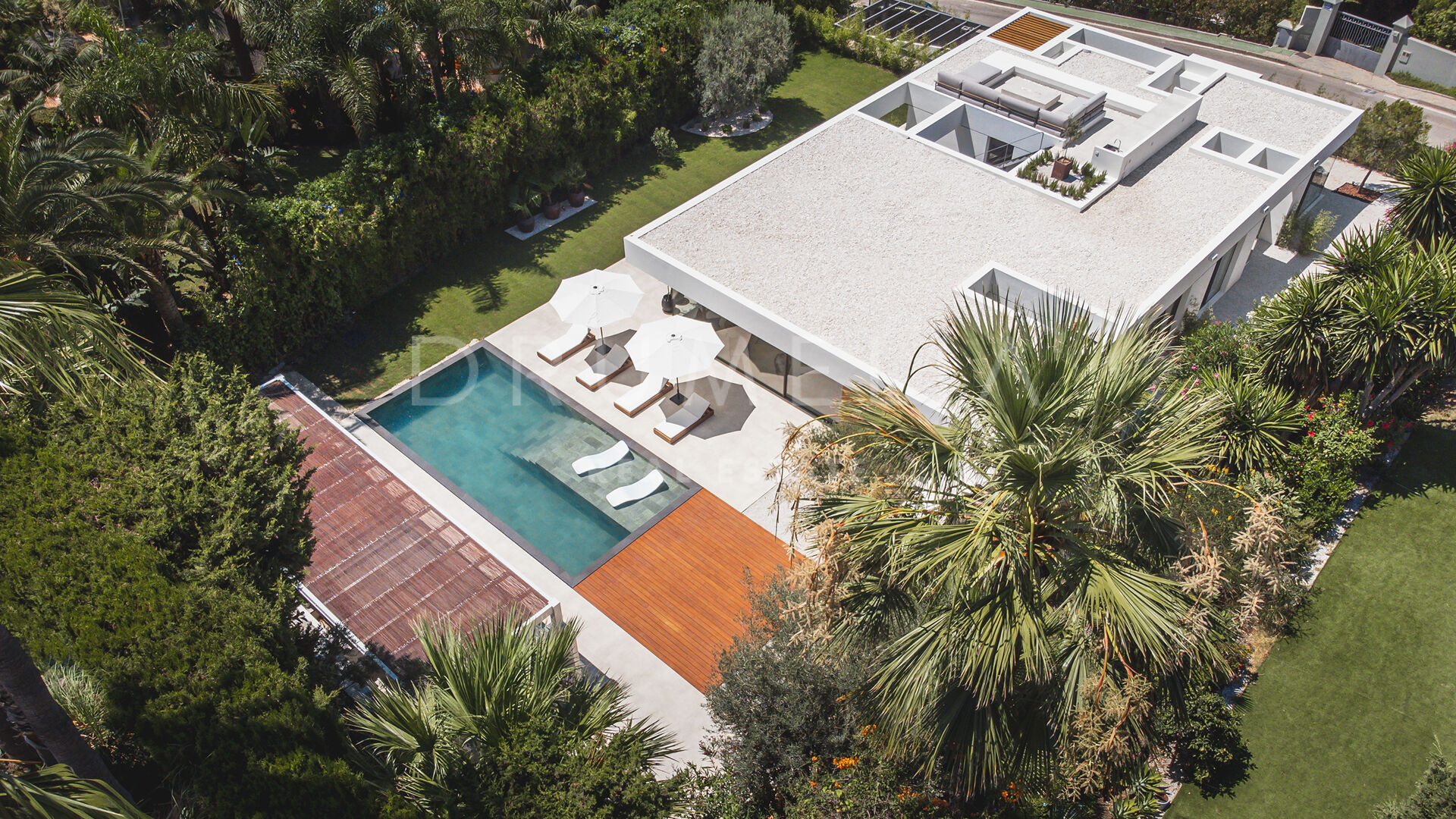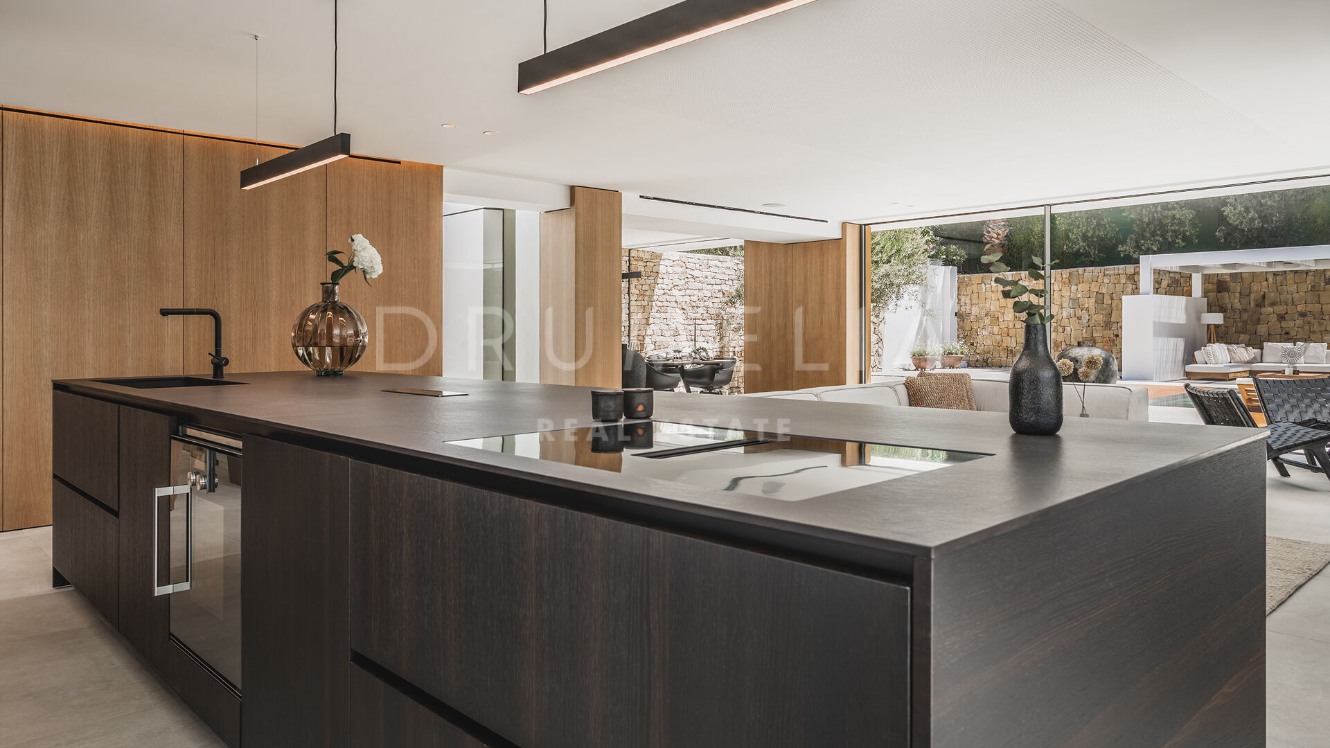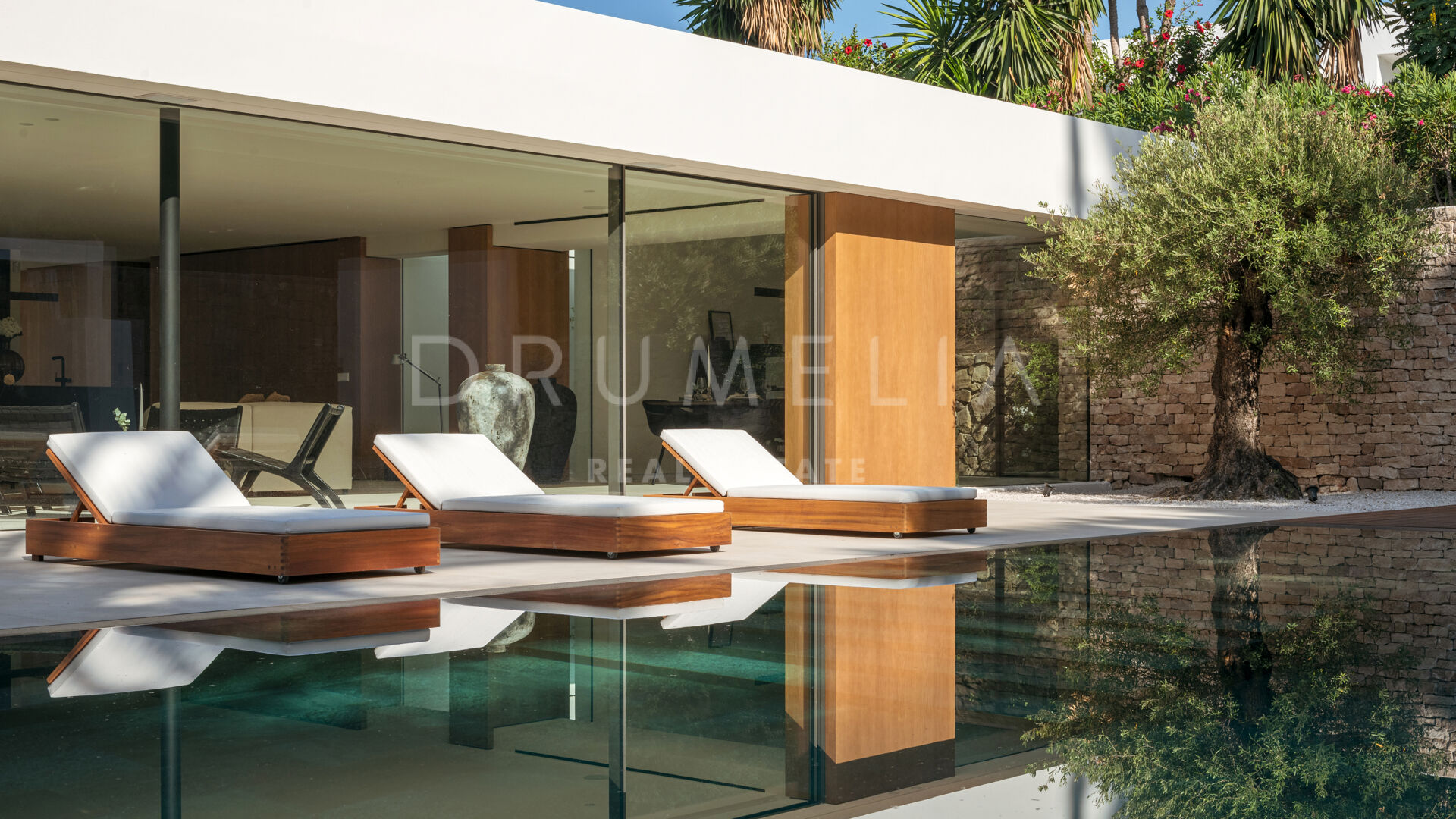 Das ultramoderne Projekt wurde von N-MOBE Architecture & Interior Design, Marbella, entworfen, die für ihre Fähigkeit bekannt sind, qualitativ hochwertige Villen zu entwickeln oder zu renovieren, die den aktuellen Standards entsprechen. Diese exquisite, sehr private Villa wurde von der modernen ibizenkischen Architektur inspiriert. Auf einem Grundstück von 1.202 m² verteilt sich das Haus mit 660 m² auf einer Ebene und bietet offene Wohnbereiche mit bodentiefen Fenstern und Glaswänden, die das Haus mit natürlichem Tageslicht durchfluten und die Innenräume mit den Außenbereichen verbinden, die von Natursteinmauern und üppiger Vegetation umgeben sind.