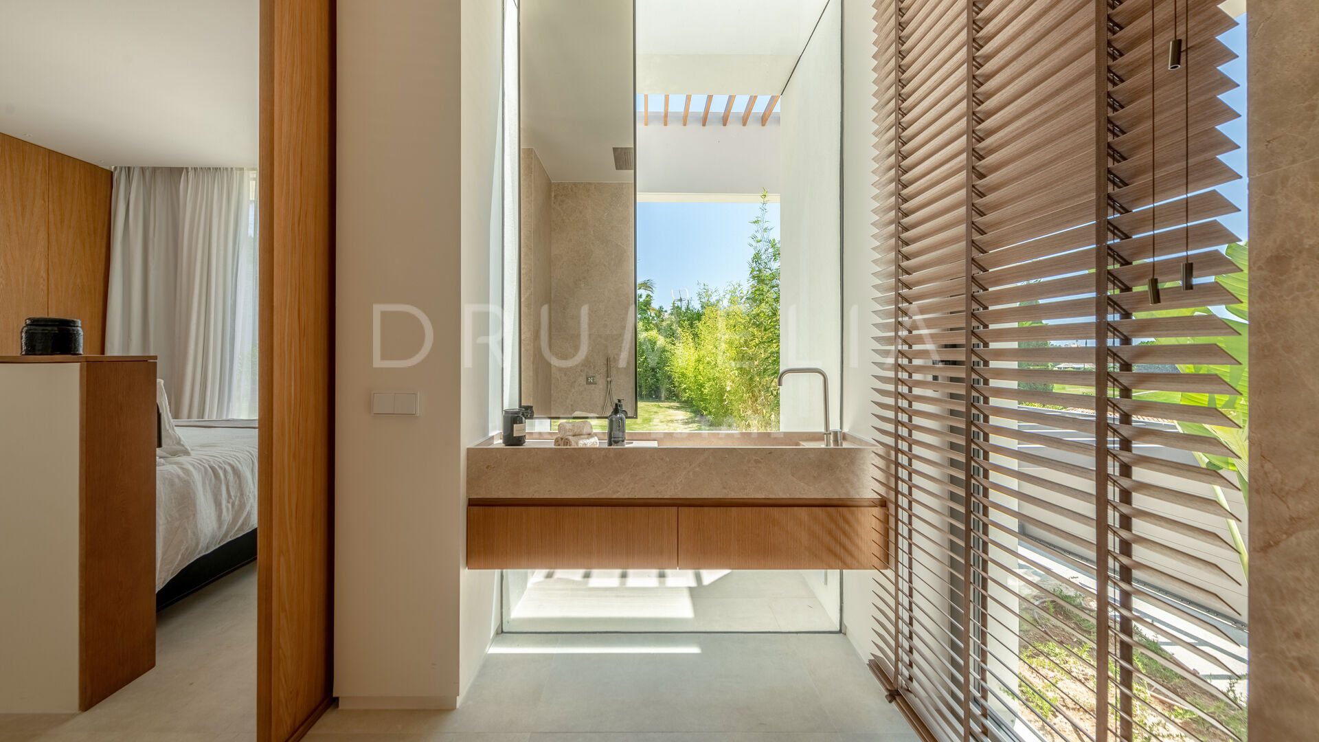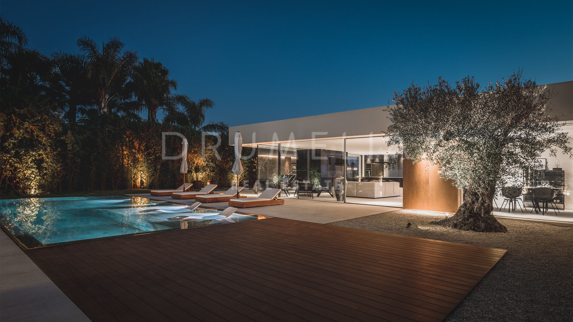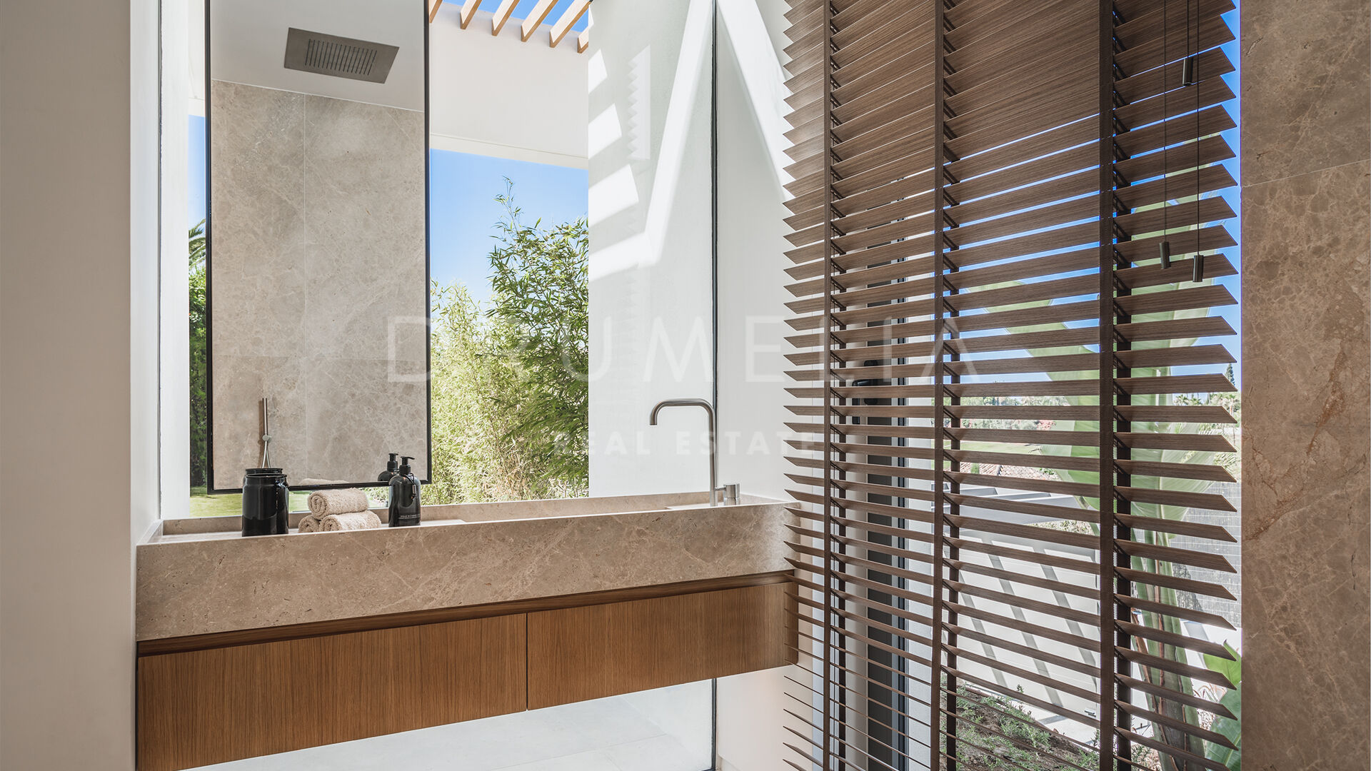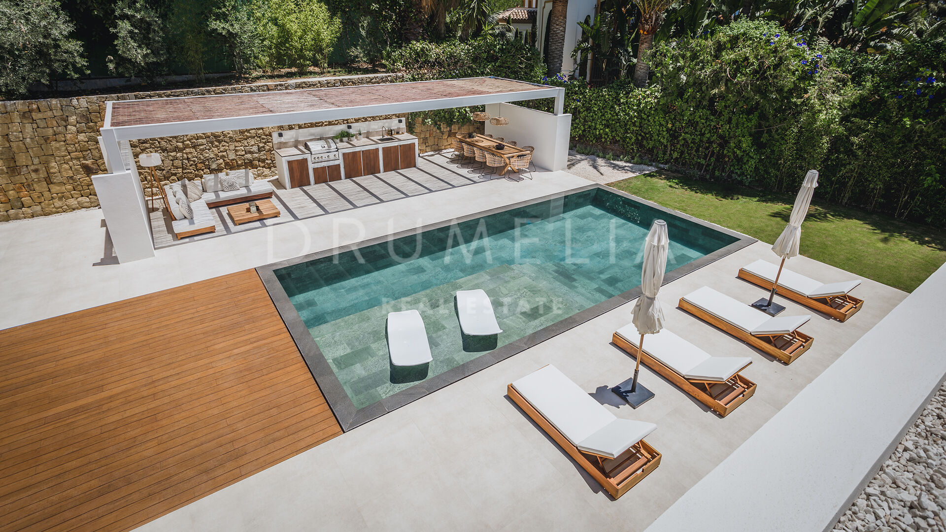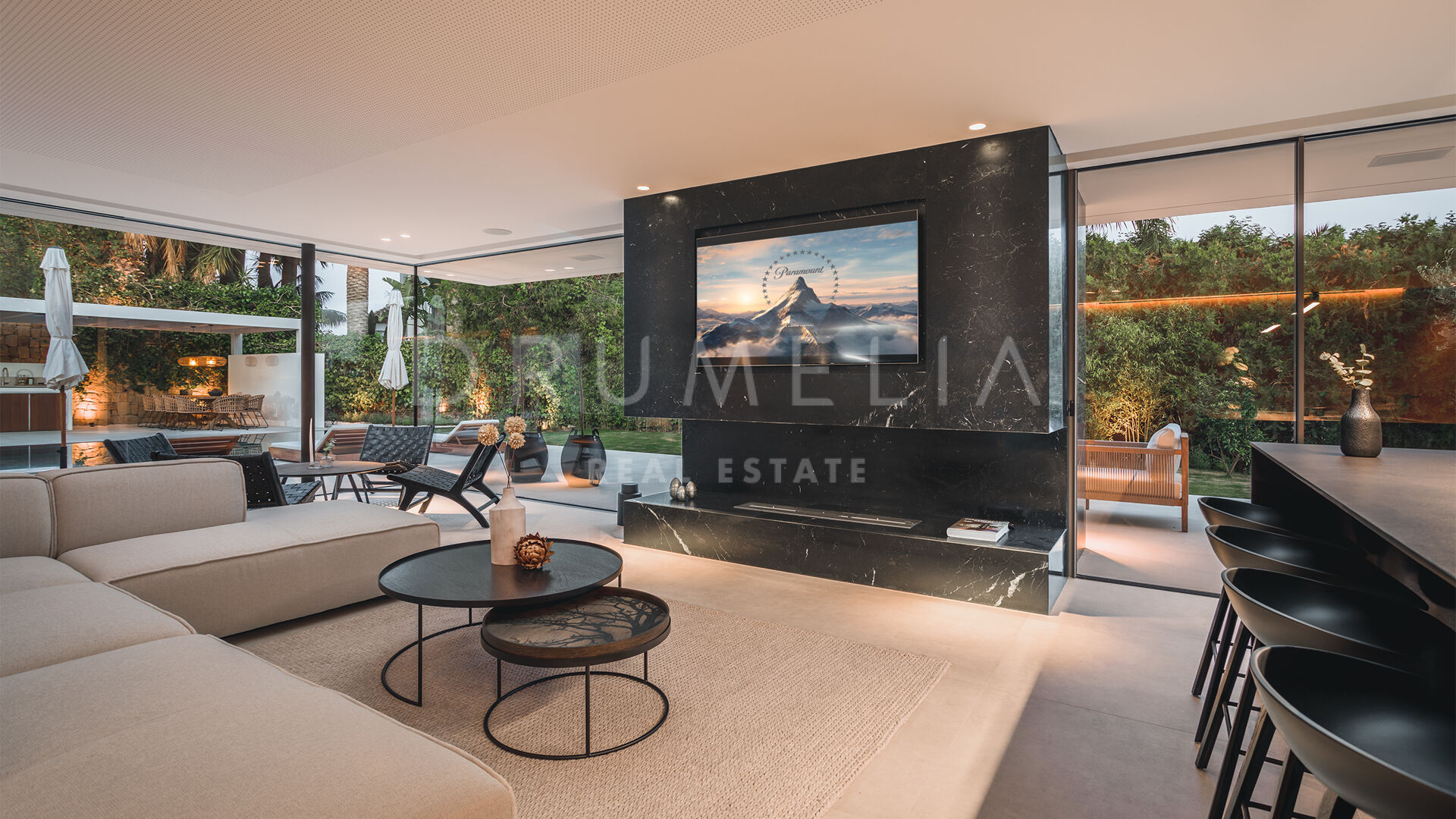Das ultramoderne Projekt wurde von N-MOBE Architecture & Interior Design, Marbella, entworfen, die für ihre Fähigkeit bekannt sind, qualitativ hochwertige Villen zu entwickeln oder zu renovieren, die den aktuellen Standards entsprechen. Diese exquisite, sehr private Villa wurde von der modernen ibizenkischen Architektur inspiriert. Auf einem Grundstück von 1.202 m² verteilt sich das Haus mit 660 m² auf einer Ebene und bietet offene Wohnbereiche mit bodentiefen Fenstern und Glaswänden, die das Haus mit natürlichem Tageslicht durchfluten und die Innenräume mit den Außenbereichen verbinden, die von Natursteinmauern und üppiger Vegetation umgeben sind.