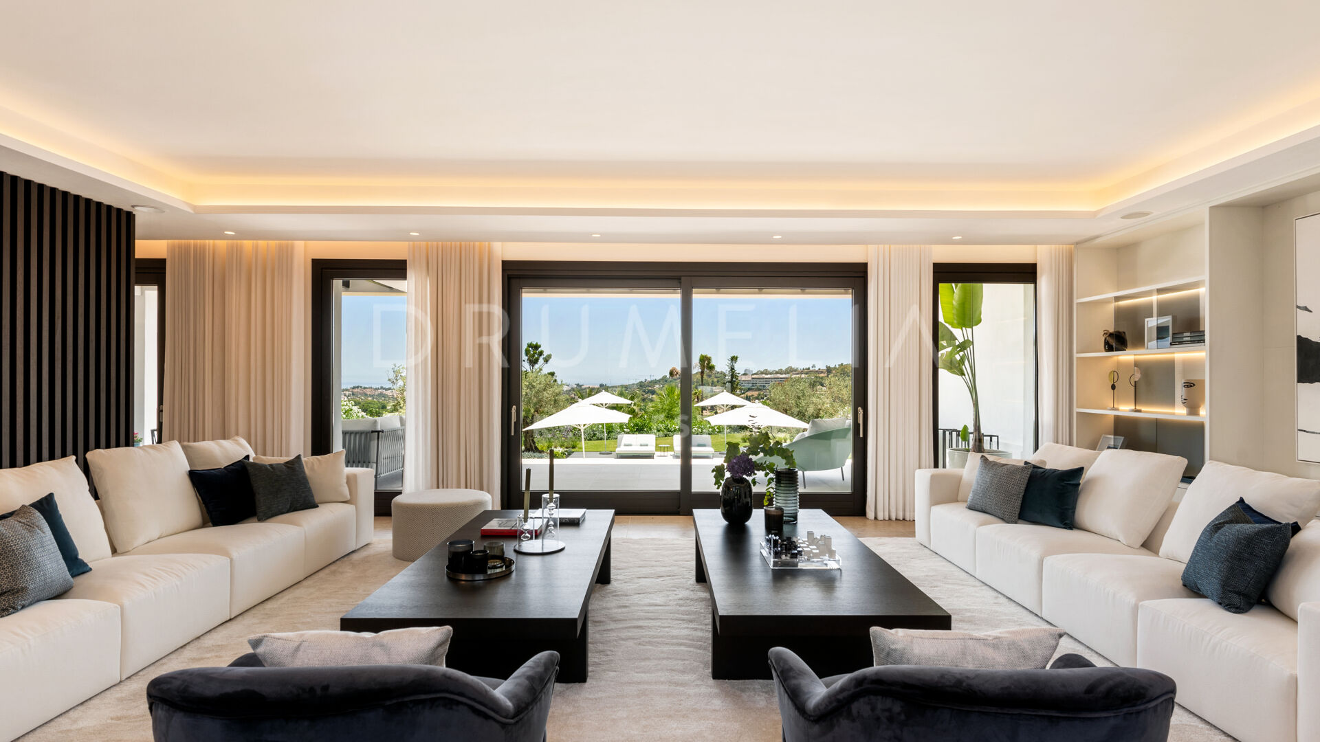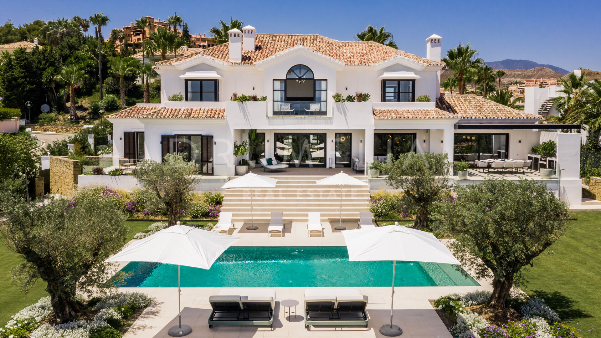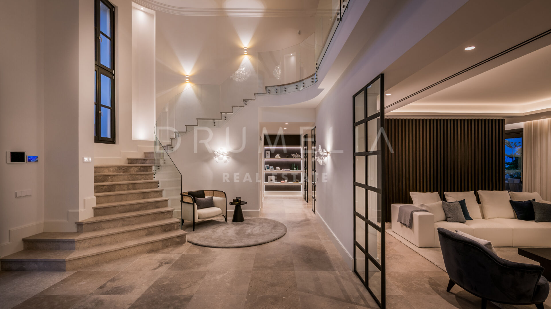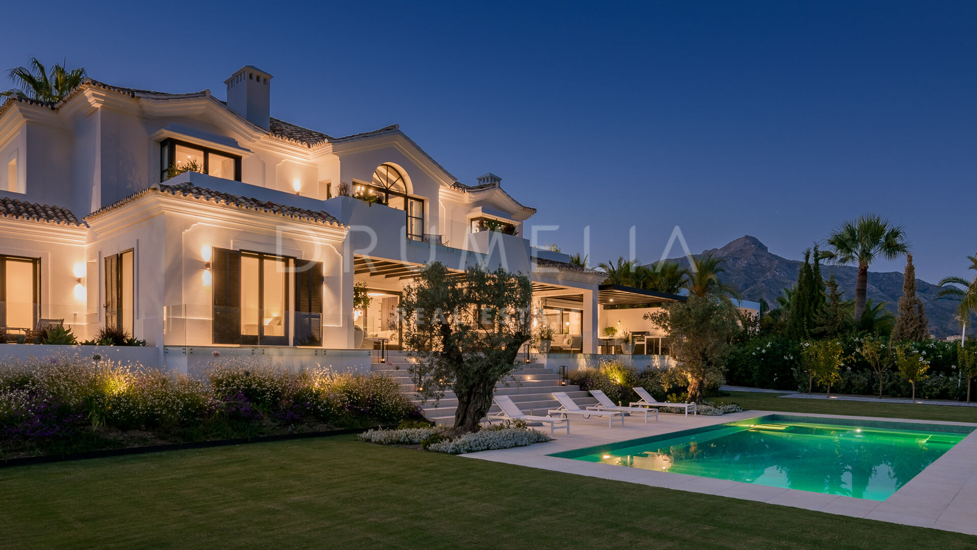 Diese prächtige Luxusvilla mit herausragenden Qualitäten bietet Ihnen einen Lebensstil von außergewöhnlichem Komfort aufgrund ihrer hervorragenden Lage in der renommierten Gemeinde La Cerquilla, Nueva Andalucia, den höchsten Standards, Größe, spektakuläre Architektur, elegante moderne Innenräume und Komfort. Kürzlich komplett reformiert mit besonderem Augenmerk auf Qualität zu einem sehr hohen Standard, ist das atemberaubende Anwesen von 946 m² auf einem großen malerischen Grundstück von 2.778 m² in der obersten Straße von La Cerquilla mit herrlichem Panoramablick über das Golf-Tal in Richtung Mittelmeer gelegen. Die Größe des Hauses und des Grundstücks macht es zu einer der größten verfügbaren Villen in La Cerquilla.