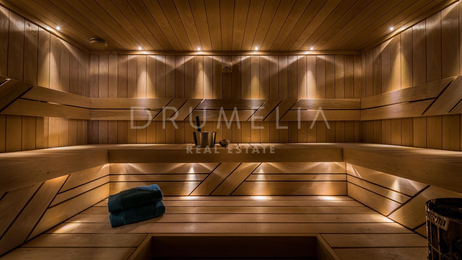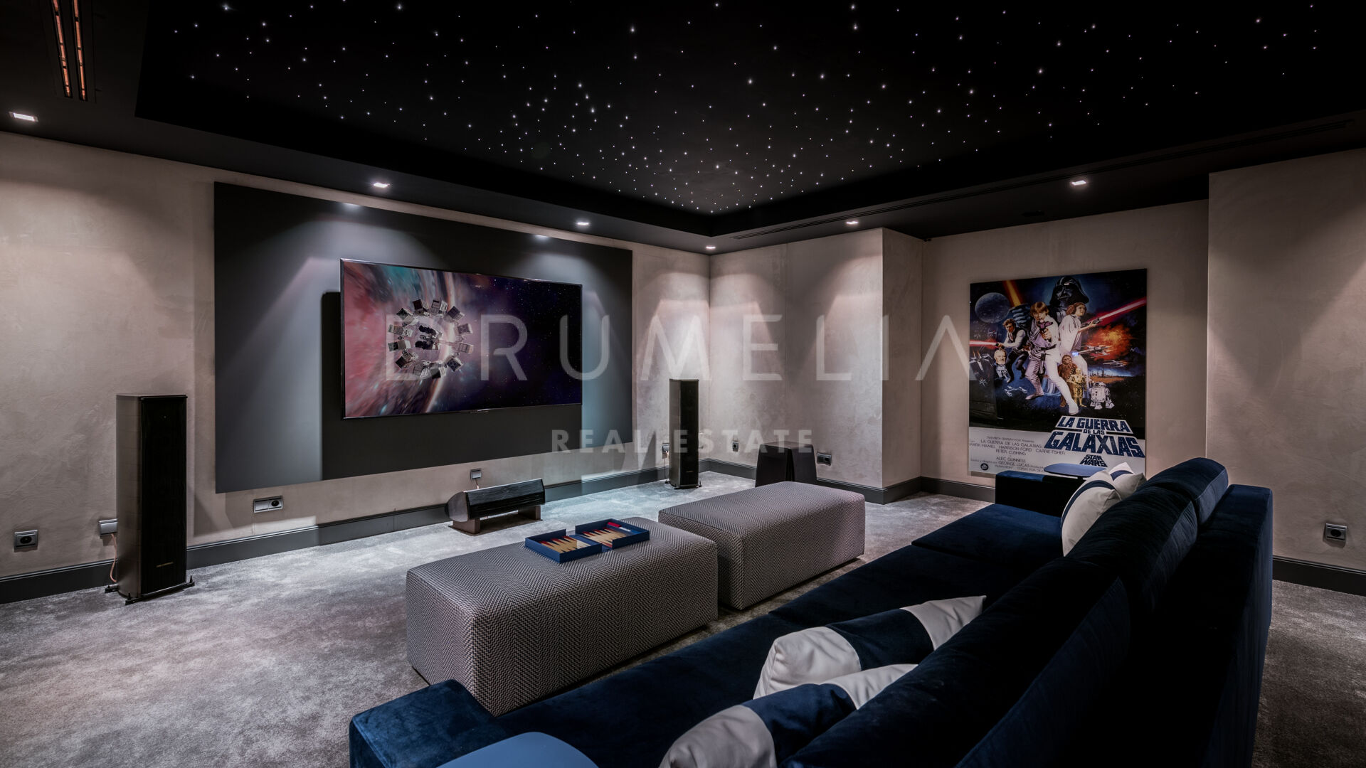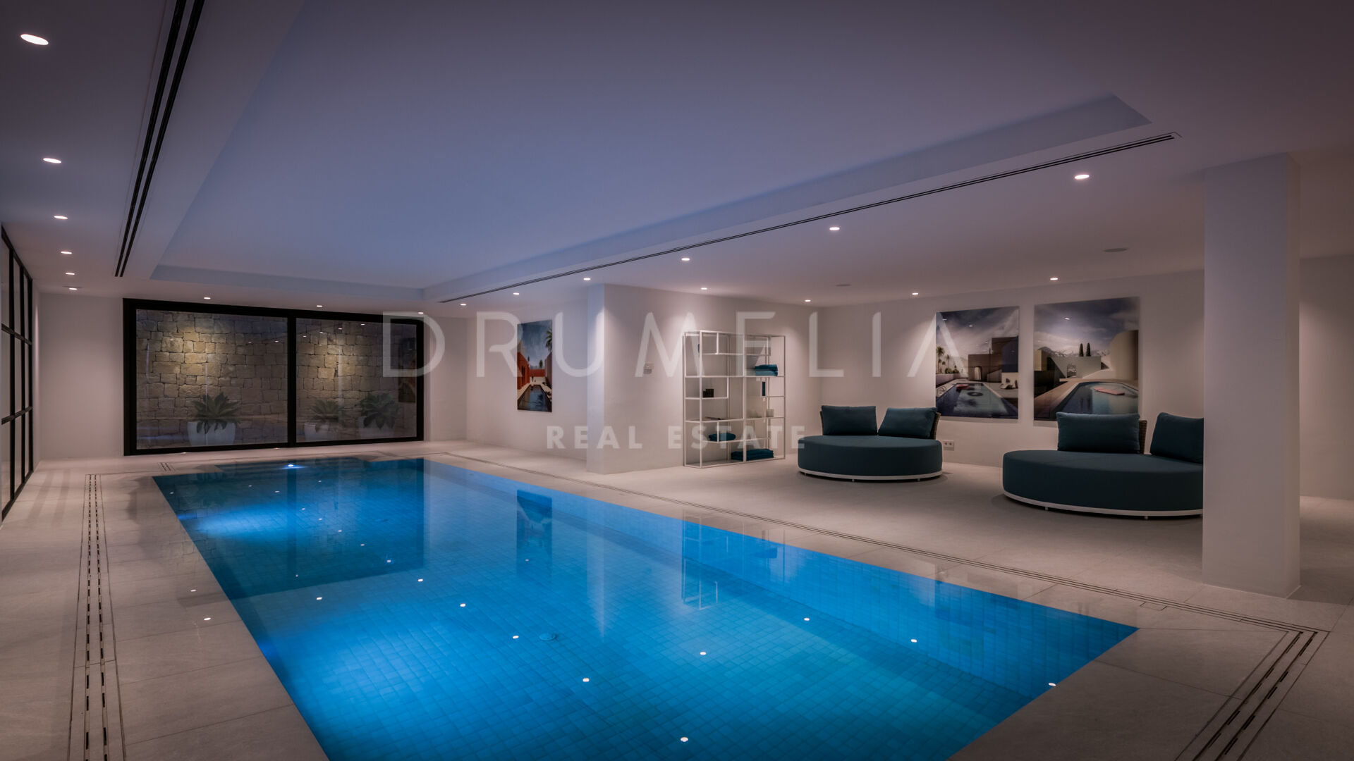 Die untere Etage bietet begehrte Annehmlichkeiten, die in dieser Lage selten zu finden sind: einen Innenpool in voller Größe mit natürlichem Licht und Belüftung durch einen Innenhof und einen angrenzenden Chill-out-Bereich, der auch als Yoga-Bereich genutzt werden könnte, einen SPA- und Fitnessbereich mit professionell ausgestattetem Fitnessstudio, Sauna und Dusche, eine ausgestattete Weinbodega, ein luxuriöses Heimkino, eine Waschküche, einen Abstellraum und eine Garage für 3 Autos, die durch einen separaten privaten Eingang zugänglich ist. Die Villa kommt mit optionalen High-End-Möbeln, einem Kamin, Aufzug, Klimaanlage, Fußbodenheizung im ganzen Haus, elektrische Jalousien, Einbauschränke, Internet – Wi-Fi, Doppelverglasung, Überwachungskameras, etc.