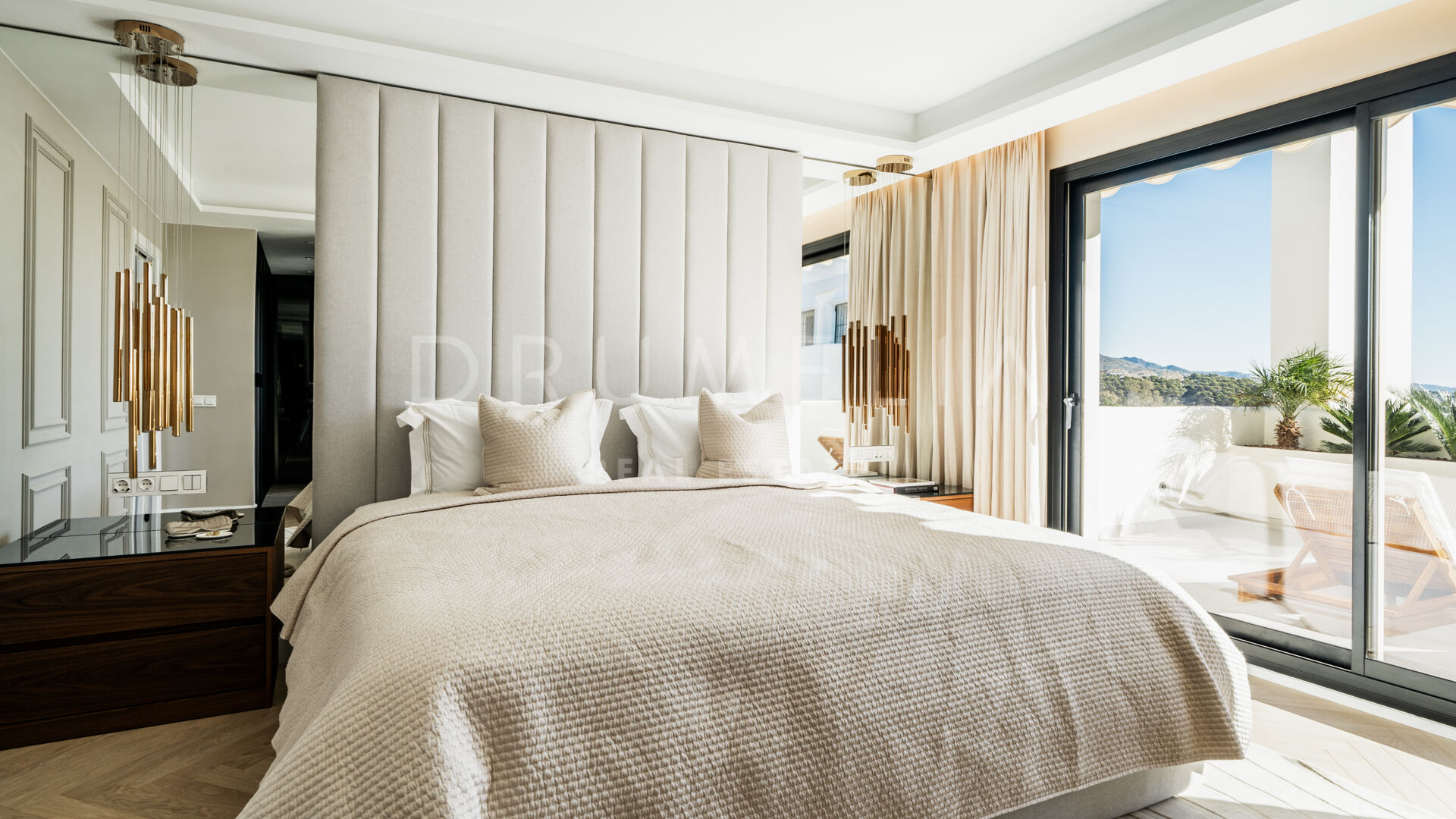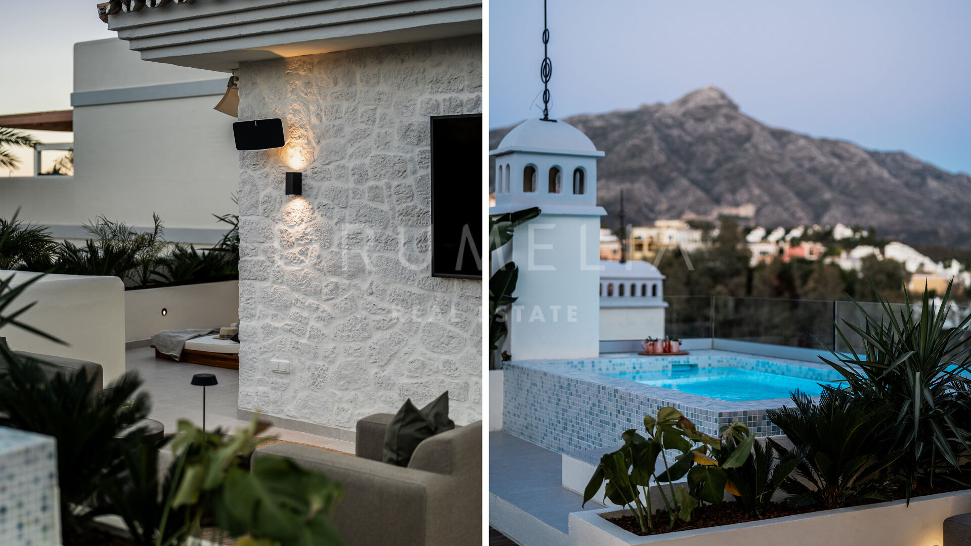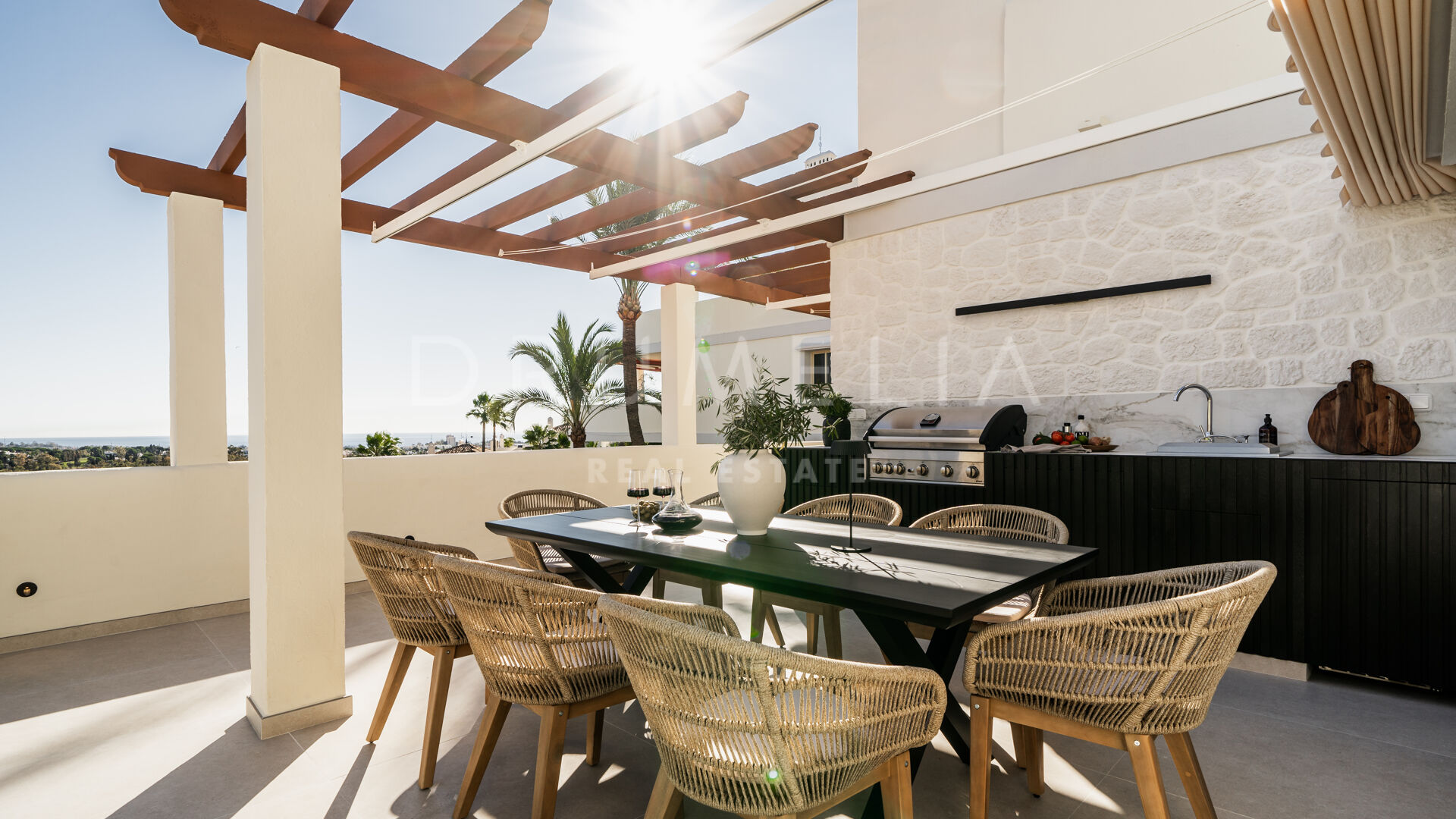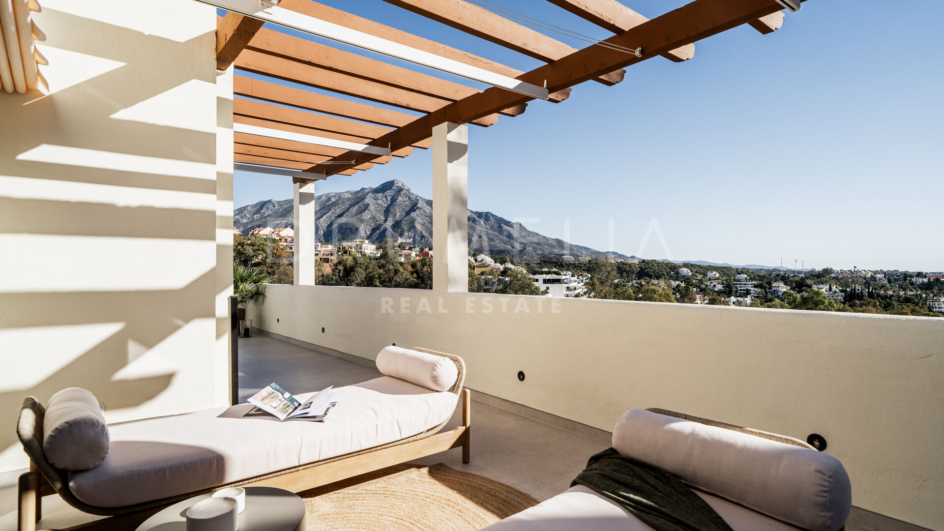 Umgeben von üppigem Grün und den Luxusimmobilien von Nueva Andalucia bietet das außergewöhnliche Apartment auf 2 Ebenen mit 172 m² eine fantastische Terrassenfläche von 180 m², die viel Platz für Entspannung und Unterhaltung bietet. Die Wohnung wurde auf hohem Niveau und mit exquisitem Geschmack renoviert und verbindet nahtlos zeitgenössisches Design mit trendigem skandinavischem Design und fügt ansprechende Elemente des klassischen modernen mediterranen Stils hinzu. Vom offenen, gemütlichen Wohnbereich mit schönen Parkettböden und Glastüren gelangen Sie auf die großzügigen, teilweise überdachten Terrassen und Pergolen. Der Panoramablick auf die malerische Umgebung, La Concha und das Mittelmeer ist einfach atemberaubend. Das elegante Esszimmer ist mit der voll ausgestatteten, eleganten Küche mit modernen Geräten und einer Insel/Bartheke verbunden und bietet den perfekten Raum für geselliges Beisammensein und die Bewirtung von Gästen und führt zum Grill und der Terrasse im Freien. Eine Holztreppe führt in das Obergeschoss, wo das große Hauptschlafzimmer mit einem luxuriösen Bad und einem schönen Ankleidezimmer beeindruckt. Mit 3 ruhigen Schlafzimmern und 4 schicken, modernen Badezimmern mit Fußbodenheizung bietet dieses luxuriöse Haus reichlich Platz für ein komfortables Leben.