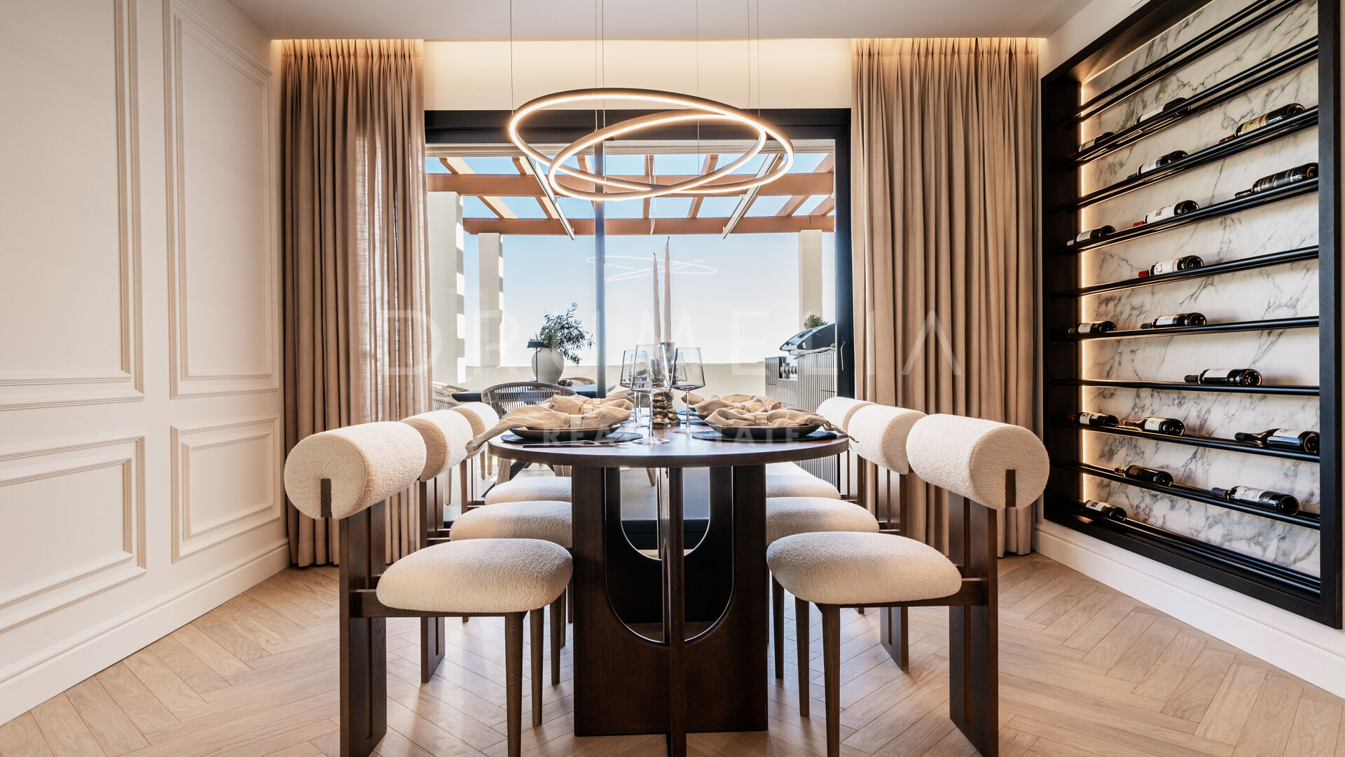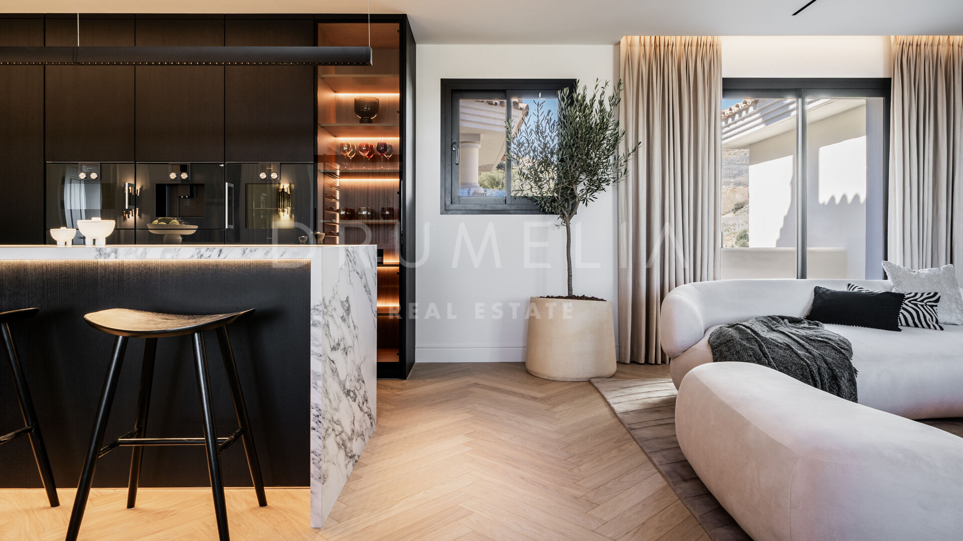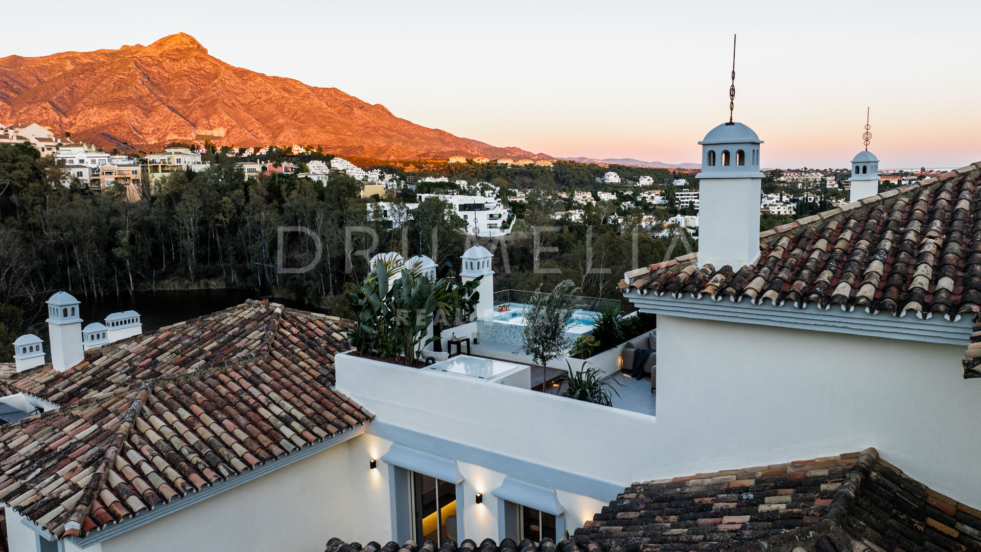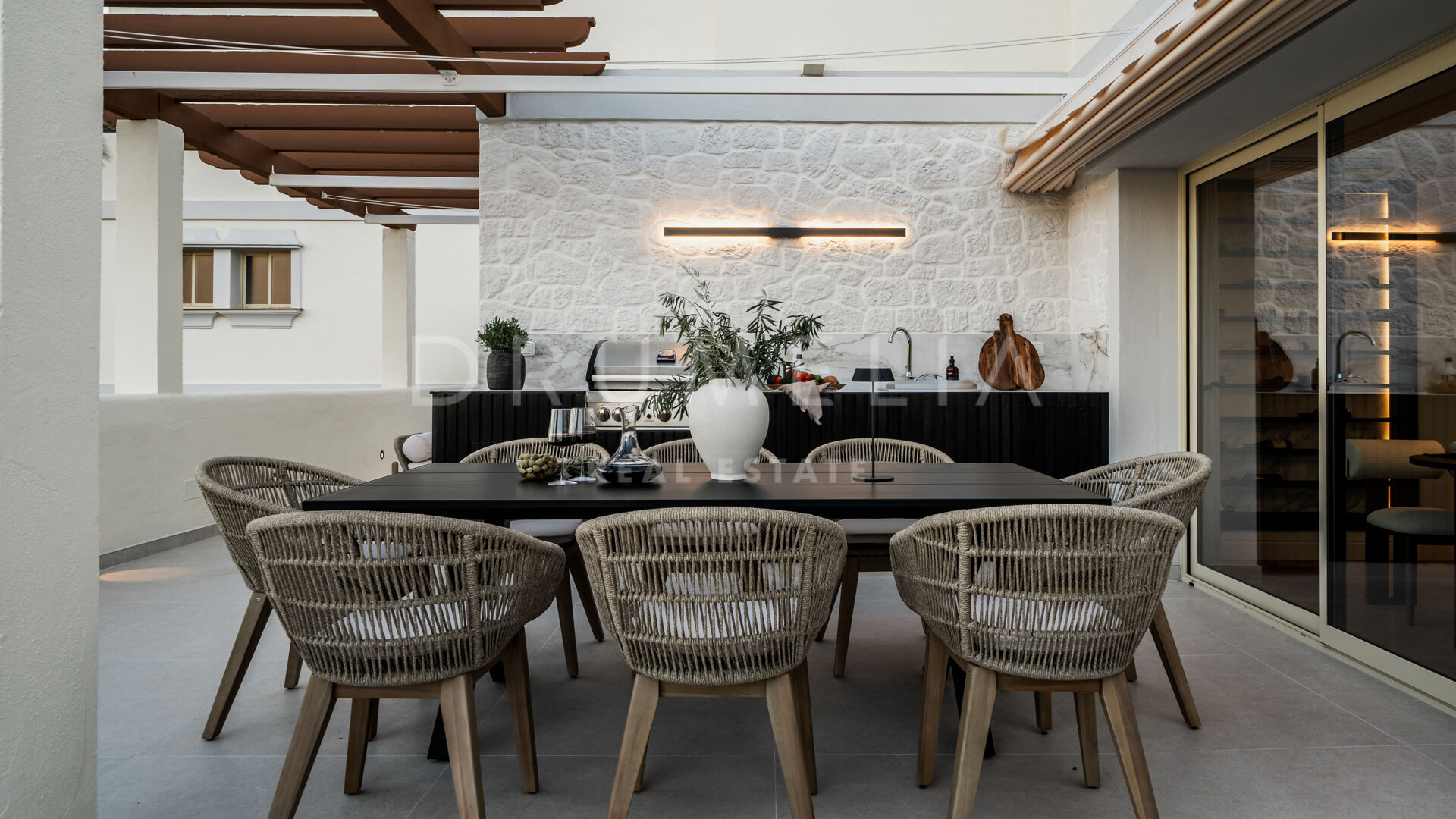 Umgeben von üppigem Grün und den Luxusimmobilien von Nueva Andalucia bietet das außergewöhnliche Apartment auf 2 Ebenen mit 172 m² eine fantastische Terrassenfläche von 180 m², die viel Platz für Entspannung und Unterhaltung bietet. Die Wohnung wurde auf hohem Niveau und mit exquisitem Geschmack renoviert und verbindet nahtlos zeitgenössisches Design mit trendigem skandinavischem Design und fügt ansprechende Elemente des klassischen modernen mediterranen Stils hinzu. Vom offenen, gemütlichen Wohnbereich mit schönen Parkettböden und Glastüren gelangen Sie auf die großzügigen, teilweise überdachten Terrassen und Pergolen. Der Panoramablick auf die malerische Umgebung, La Concha und das Mittelmeer ist einfach atemberaubend. Das elegante Esszimmer ist mit der voll ausgestatteten, eleganten Küche mit modernen Geräten und einer Insel/Bartheke verbunden und bietet den perfekten Raum für geselliges Beisammensein und die Bewirtung von Gästen und führt zum Grill und der Terrasse im Freien. Eine Holztreppe führt in das Obergeschoss, wo das große Hauptschlafzimmer mit einem luxuriösen Bad und einem schönen Ankleidezimmer beeindruckt. Mit 3 ruhigen Schlafzimmern und 4 schicken, modernen Badezimmern mit Fußbodenheizung bietet dieses luxuriöse Haus reichlich Platz für ein komfortables Leben.