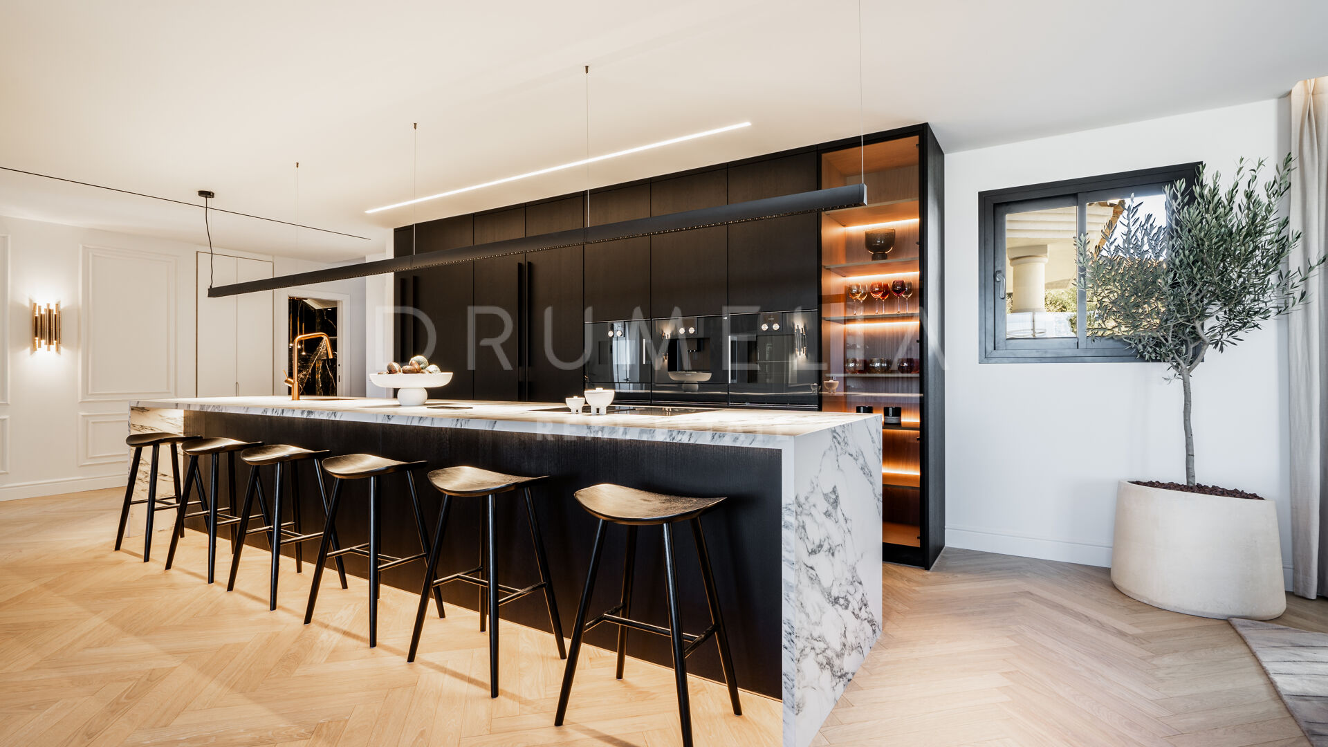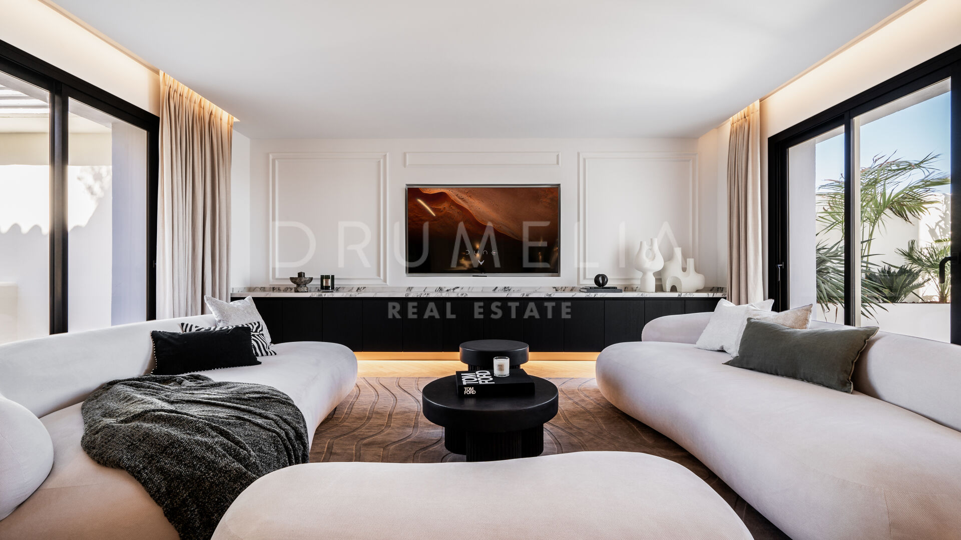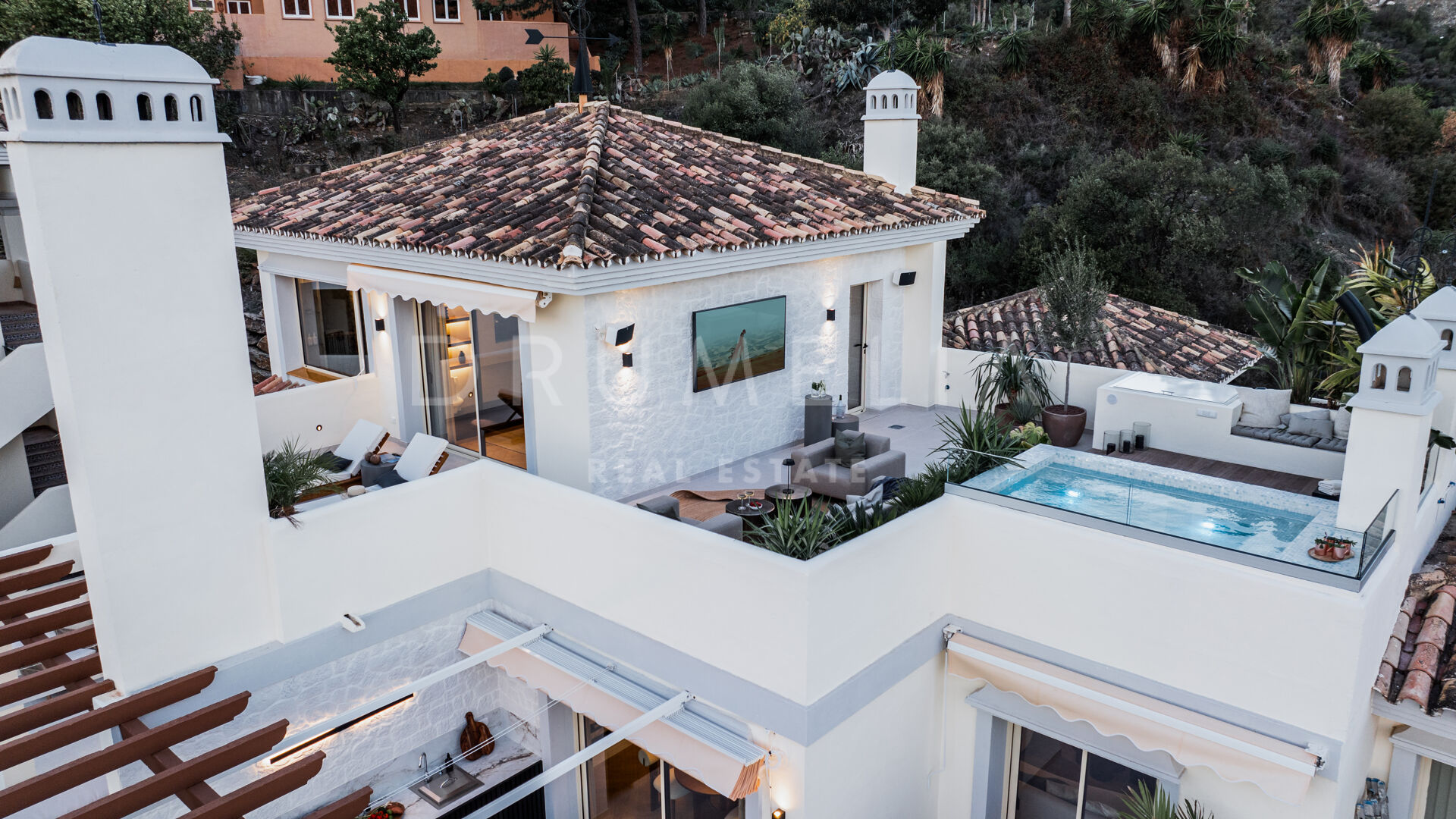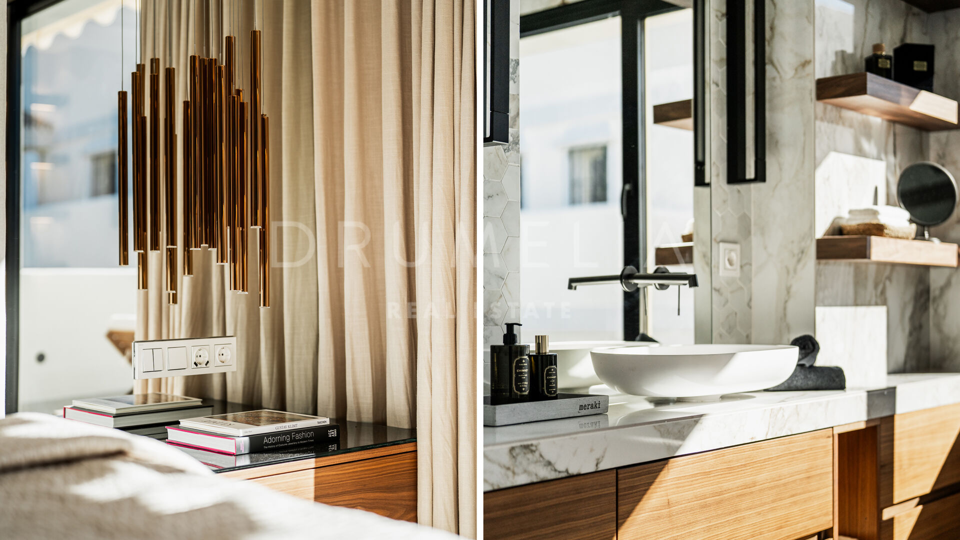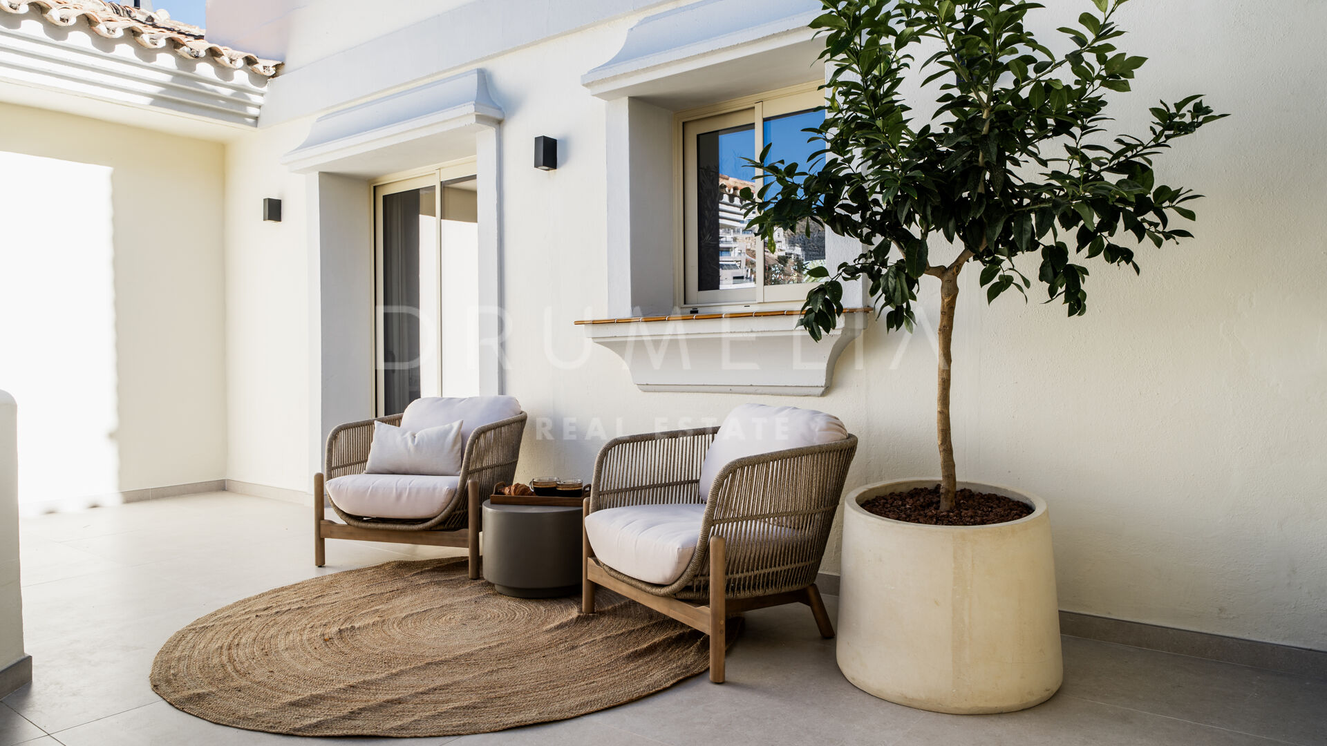 Umgeben von üppigem Grün und den Luxusimmobilien von Nueva Andalucia bietet das außergewöhnliche Apartment auf 2 Ebenen mit 172 m² eine fantastische Terrassenfläche von 180 m², die viel Platz für Entspannung und Unterhaltung bietet. Die Wohnung wurde auf hohem Niveau und mit exquisitem Geschmack renoviert und verbindet nahtlos zeitgenössisches Design mit trendigem skandinavischem Design und fügt ansprechende Elemente des klassischen modernen mediterranen Stils hinzu. Vom offenen, gemütlichen Wohnbereich mit schönen Parkettböden und Glastüren gelangen Sie auf die großzügigen, teilweise überdachten Terrassen und Pergolen. Der Panoramablick auf die malerische Umgebung, La Concha und das Mittelmeer ist einfach atemberaubend. Das elegante Esszimmer ist mit der voll ausgestatteten, eleganten Küche mit modernen Geräten und einer Insel/Bartheke verbunden und bietet den perfekten Raum für geselliges Beisammensein und die Bewirtung von Gästen und führt zum Grill und der Terrasse im Freien. Eine Holztreppe führt in das Obergeschoss, wo das große Hauptschlafzimmer mit einem luxuriösen Bad und einem schönen Ankleidezimmer beeindruckt. Mit 3 ruhigen Schlafzimmern und 4 schicken, modernen Badezimmern mit Fußbodenheizung bietet dieses luxuriöse Haus reichlich Platz für ein komfortables Leben.