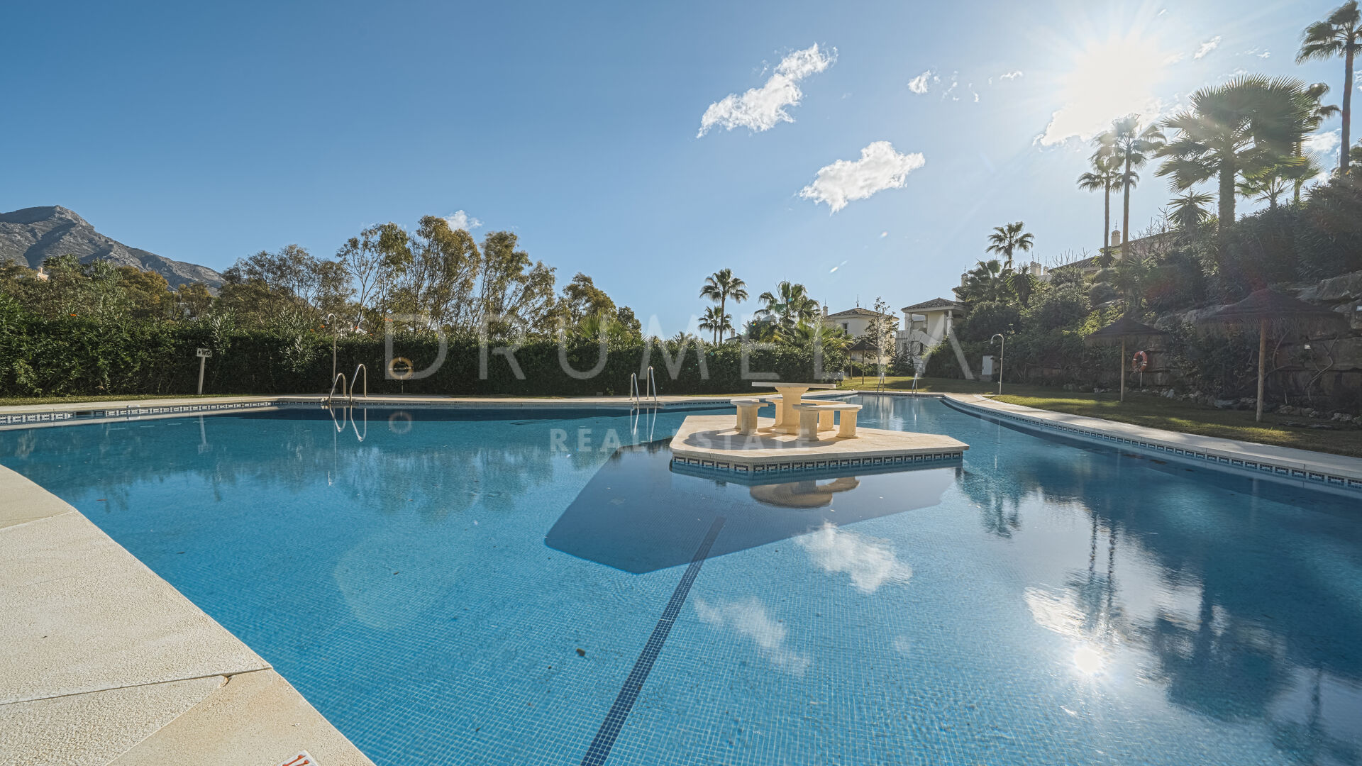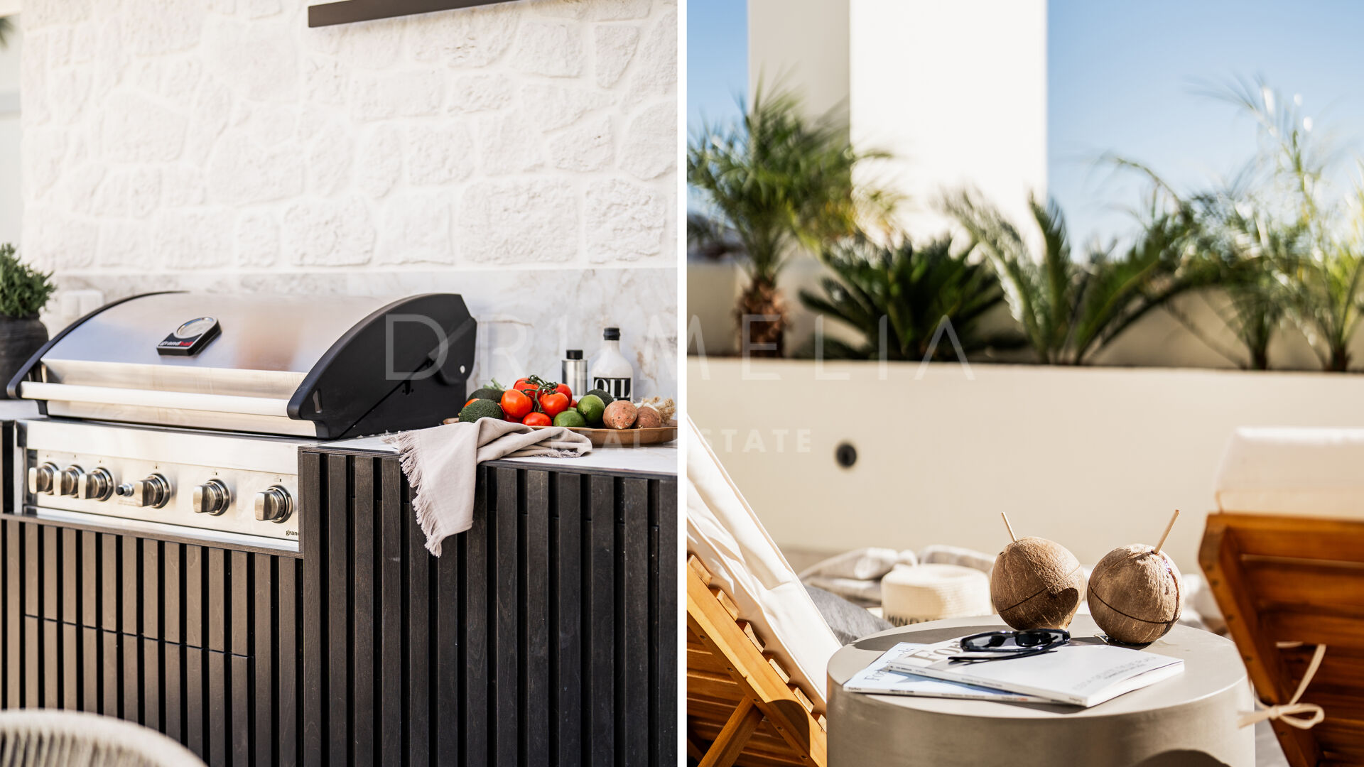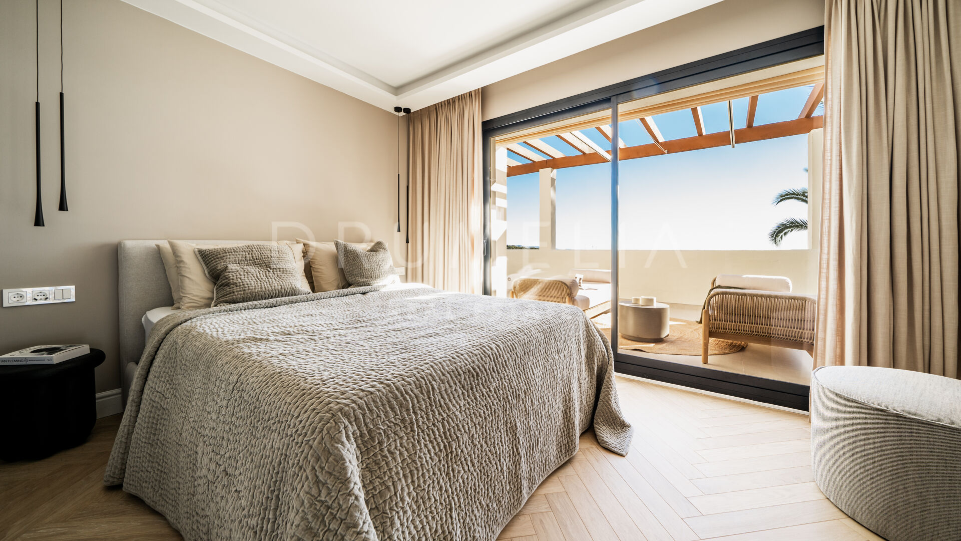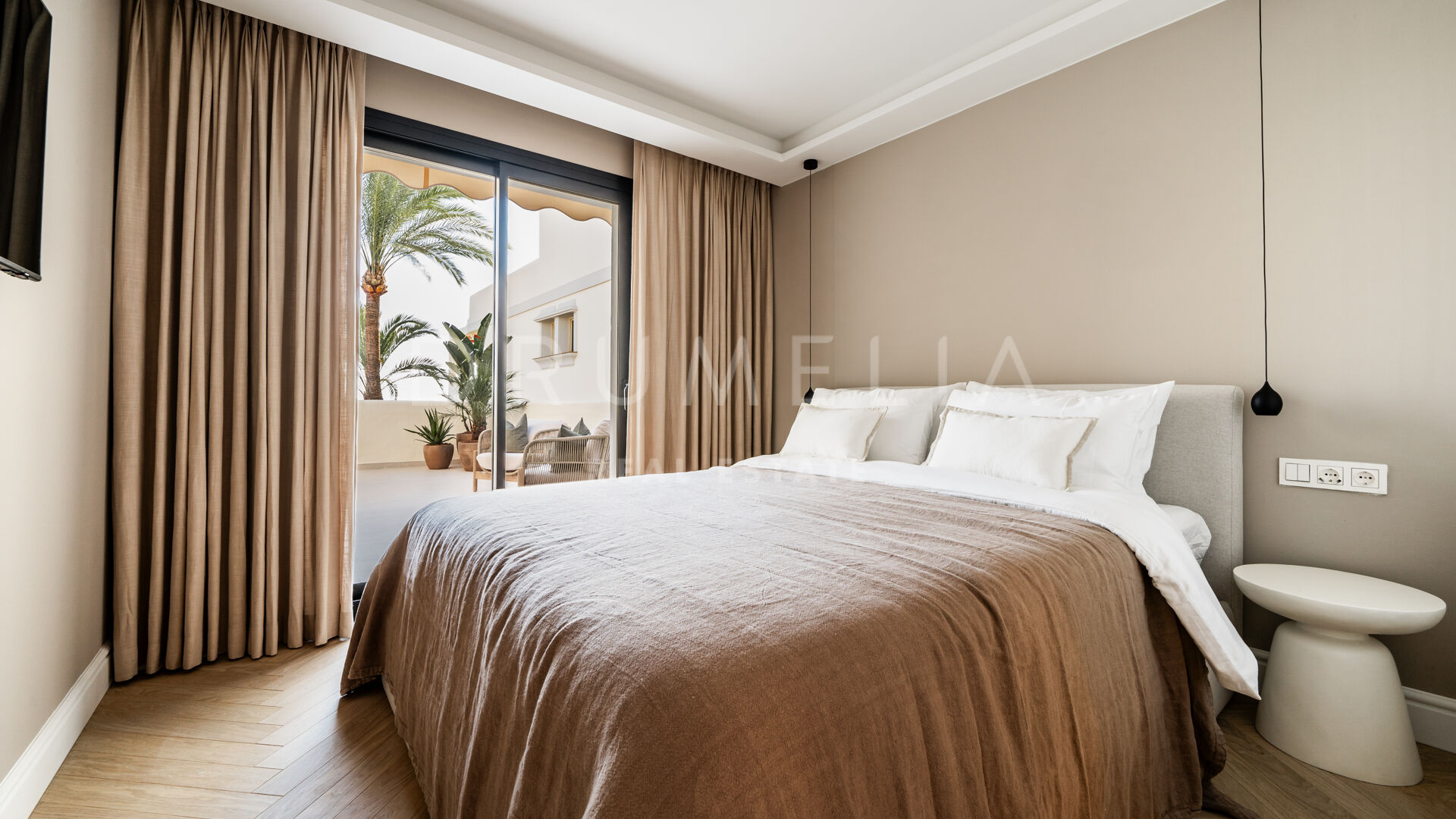 Umgeben von üppigem Grün und den Luxusimmobilien von Nueva Andalucia bietet das außergewöhnliche Apartment auf 2 Ebenen mit 172 m² eine fantastische Terrassenfläche von 180 m², die viel Platz für Entspannung und Unterhaltung bietet. Die Wohnung wurde auf hohem Niveau und mit exquisitem Geschmack renoviert und verbindet nahtlos zeitgenössisches Design mit trendigem skandinavischem Design und fügt ansprechende Elemente des klassischen modernen mediterranen Stils hinzu. Vom offenen, gemütlichen Wohnbereich mit schönen Parkettböden und Glastüren gelangen Sie auf die großzügigen, teilweise überdachten Terrassen und Pergolen. Der Panoramablick auf die malerische Umgebung, La Concha und das Mittelmeer ist einfach atemberaubend. Das elegante Esszimmer ist mit der voll ausgestatteten, eleganten Küche mit modernen Geräten und einer Insel/Bartheke verbunden und bietet den perfekten Raum für geselliges Beisammensein und die Bewirtung von Gästen und führt zum Grill und der Terrasse im Freien. Eine Holztreppe führt in das Obergeschoss, wo das große Hauptschlafzimmer mit einem luxuriösen Bad und einem schönen Ankleidezimmer beeindruckt. Mit 3 ruhigen Schlafzimmern und 4 schicken, modernen Badezimmern mit Fußbodenheizung bietet dieses luxuriöse Haus reichlich Platz für ein komfortables Leben.