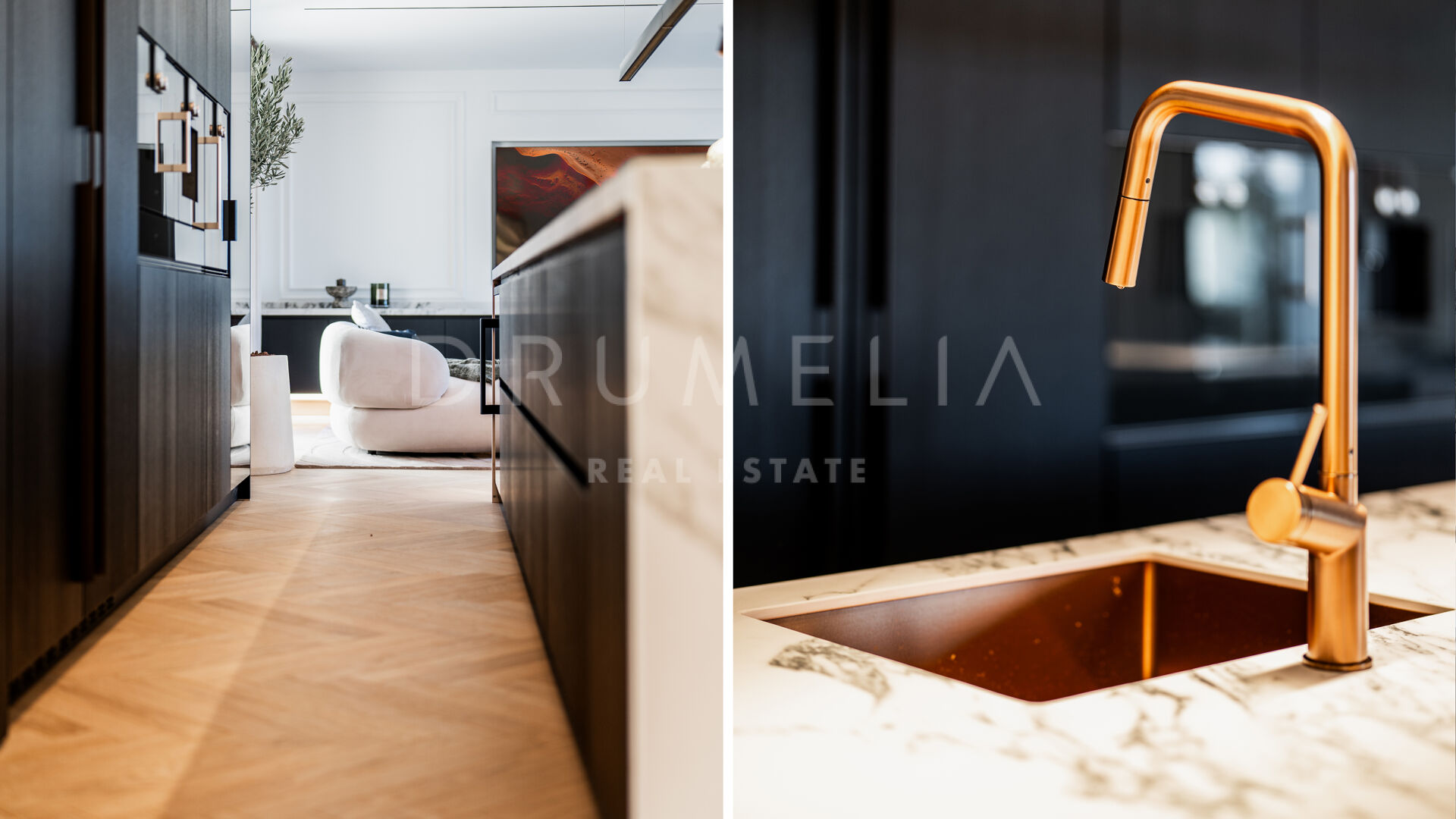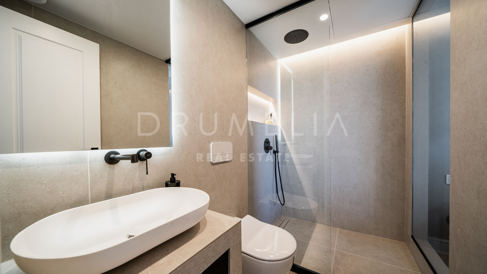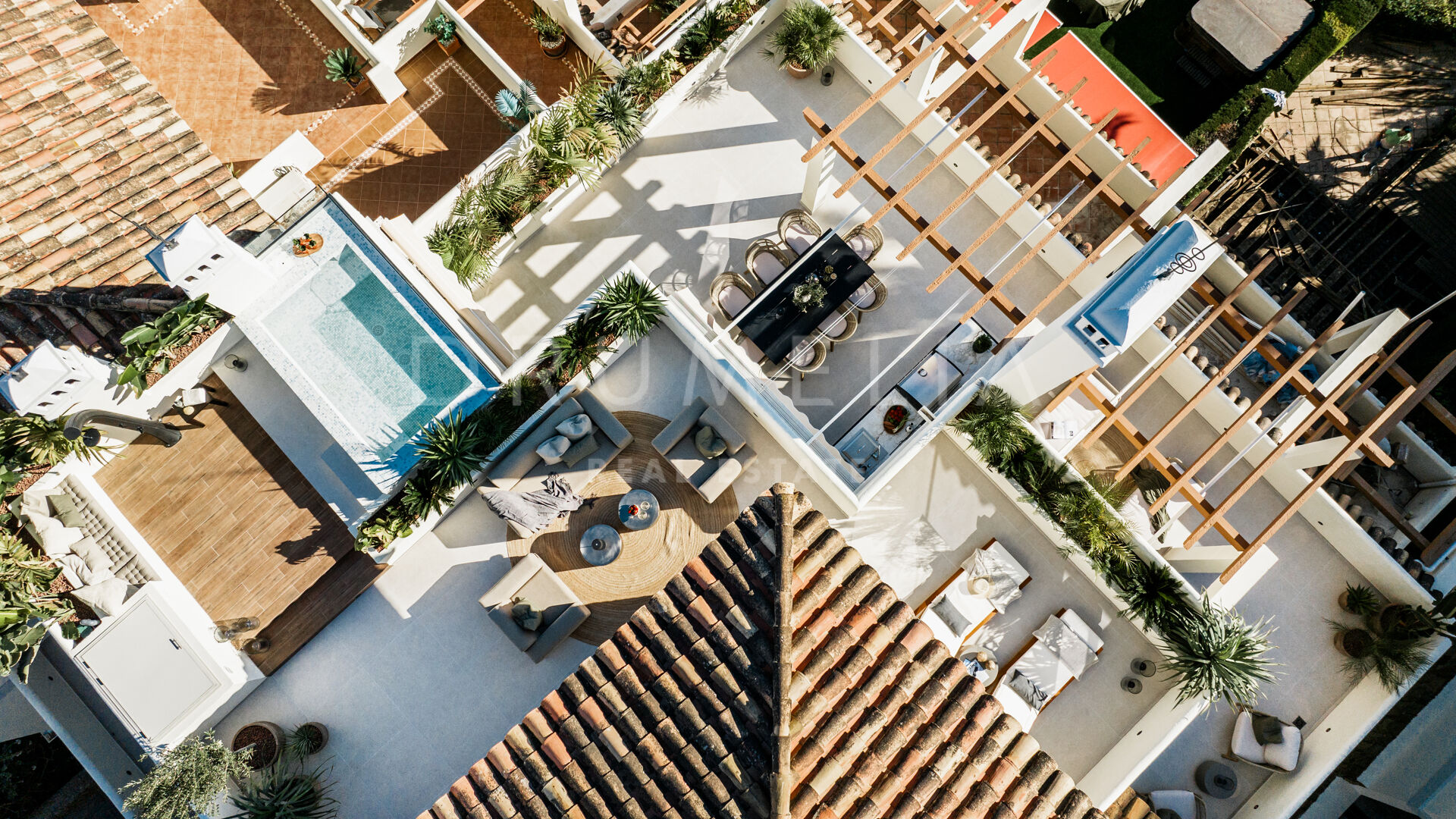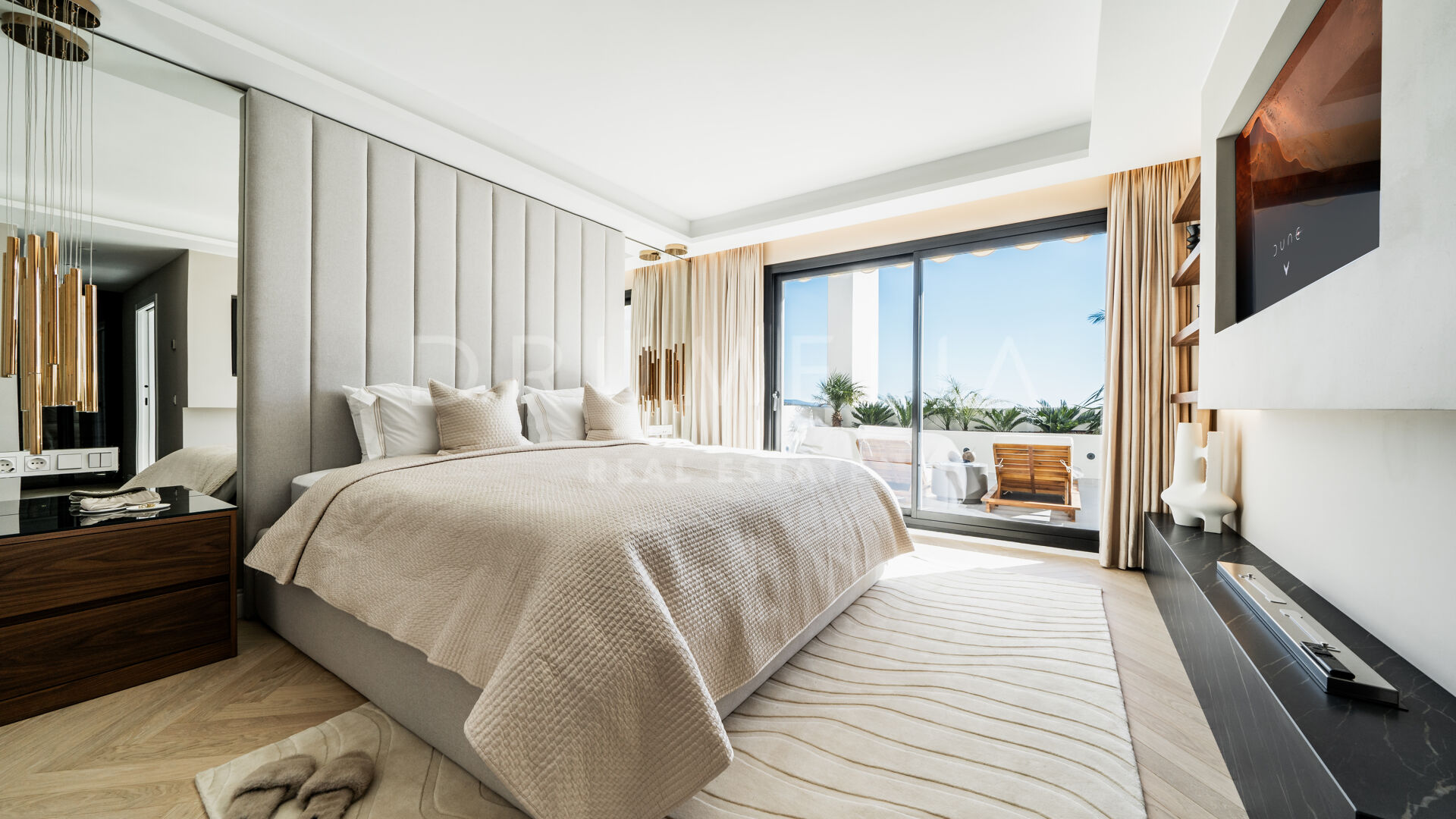 Umgeben von üppigem Grün und den Luxusimmobilien von Nueva Andalucia bietet das außergewöhnliche Apartment auf 2 Ebenen mit 172 m² eine fantastische Terrassenfläche von 180 m², die viel Platz für Entspannung und Unterhaltung bietet. Die Wohnung wurde auf hohem Niveau und mit exquisitem Geschmack renoviert und verbindet nahtlos zeitgenössisches Design mit trendigem skandinavischem Design und fügt ansprechende Elemente des klassischen modernen mediterranen Stils hinzu. Vom offenen, gemütlichen Wohnbereich mit schönen Parkettböden und Glastüren gelangen Sie auf die großzügigen, teilweise überdachten Terrassen und Pergolen. Der Panoramablick auf die malerische Umgebung, La Concha und das Mittelmeer ist einfach atemberaubend. Das elegante Esszimmer ist mit der voll ausgestatteten, eleganten Küche mit modernen Geräten und einer Insel/Bartheke verbunden und bietet den perfekten Raum für geselliges Beisammensein und die Bewirtung von Gästen und führt zum Grill und der Terrasse im Freien. Eine Holztreppe führt in das Obergeschoss, wo das große Hauptschlafzimmer mit einem luxuriösen Bad und einem schönen Ankleidezimmer beeindruckt. Mit 3 ruhigen Schlafzimmern und 4 schicken, modernen Badezimmern mit Fußbodenheizung bietet dieses luxuriöse Haus reichlich Platz für ein komfortables Leben.