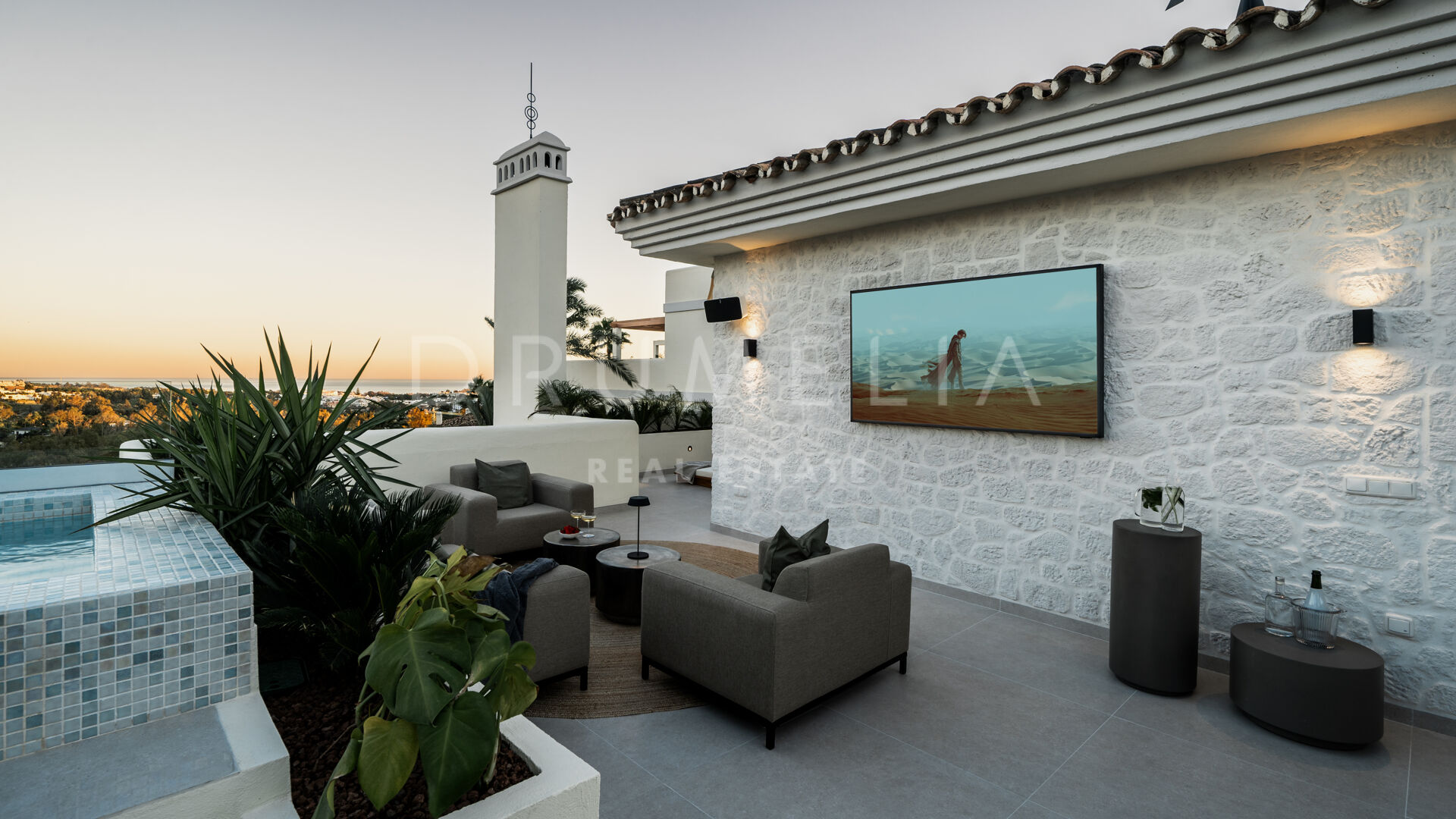 Jeder Aspekt dieser spektakulären Residenz wurde sorgfältig geplant, um den anspruchsvollen Bewohnern ein Höchstmaß an Komfort und Funktionalität zu bieten. Überall, wo man hinschaut, findet man etwas, das optisch ansprechend ist. Die raffinierte Wohnung ist in neutralen Farben gehalten und verfügt über eine sanfte (und energieeffiziente) Beleuchtung. Sie verfügt über exklusive Ausstattungsmerkmale wie Eichenparkett im Fischgrätmuster, UV-Fenster, ein modernes, minimalistisches Weinregal an der Wand, Dreifachverglasung, freistehende Badewanne, Klimaanlage, Einbauschränke usw., die eine harmonische Mischung aus Eleganz und modernem Komfort gewährleisten. Die bemerkenswerten Terrassen verfügen über einen familiengerechten Whirlpool mit Blick auf die Berge, den Golfplatz und das Meer, eine Dusche, eine Außenküche, ein Kino, Sonnenliegen und Loungebereiche. Stellen Sie sich vor, Sie machen eine Siesta, entspannen sich in der warmen Sonne und genießen die Ruhe der umliegenden Natur, veranstalten eine Party oder genießen einen romantischen Moment unter dem nächtlichen Sternenhimmel. Träume werden wahr! Dieses Penthouse ist ein Hort der Raffinesse und des Komforts und ideal, um die höchste Lebensqualität an der Costa del Sol zu genießen, mit ihrem reichen kulturellen Erbe, dem besten Klima Europas und dem südlichen Charme. Außerdem ist es eine gute, solide Investition mit allen Vorteilen, die ein exklusives Haus unter der mediterranen Sonne mit sich bringt.