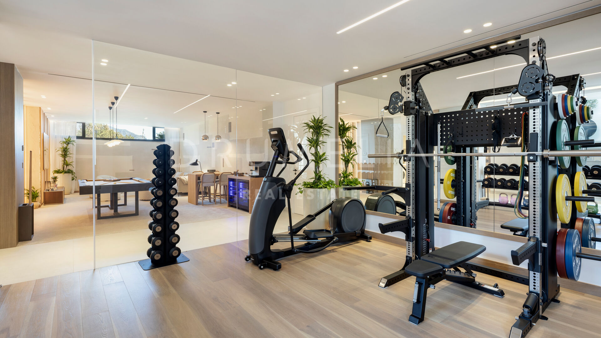 Smart-Home-Technologie, Fußbodenheizung und zonenweise Klimaanlage sorgen ganzjährig für Komfort und Kontrolle. Eine Energieeffizienzklasse A, eine Garage für drei Autos, ein Hauswirtschaftsraum und ein kunstvoll angelegter tropischer Garten unterstreichen das durchdachte Design.