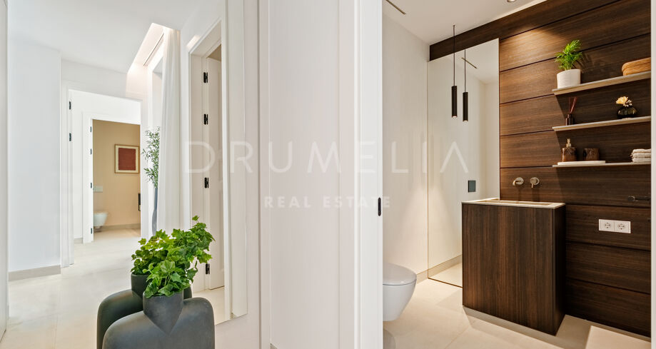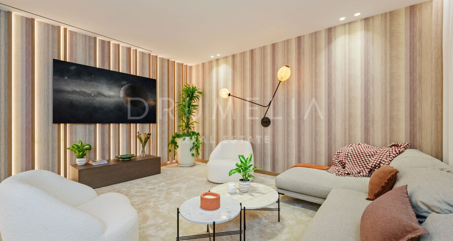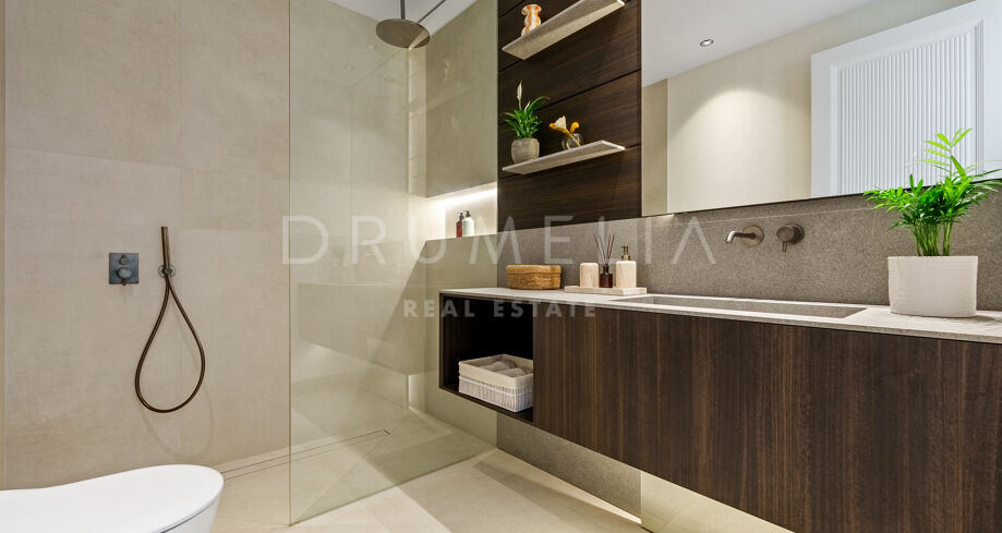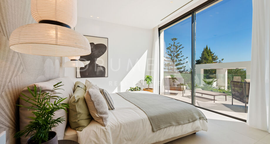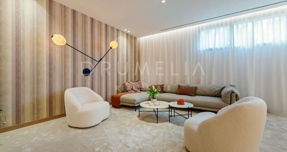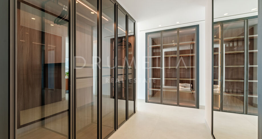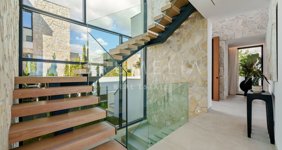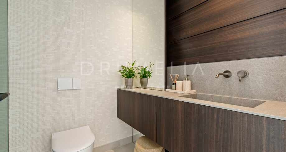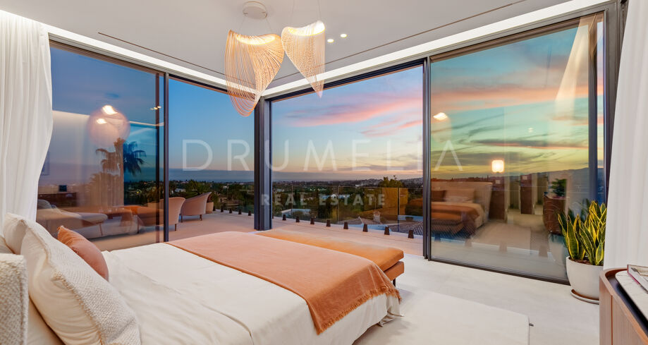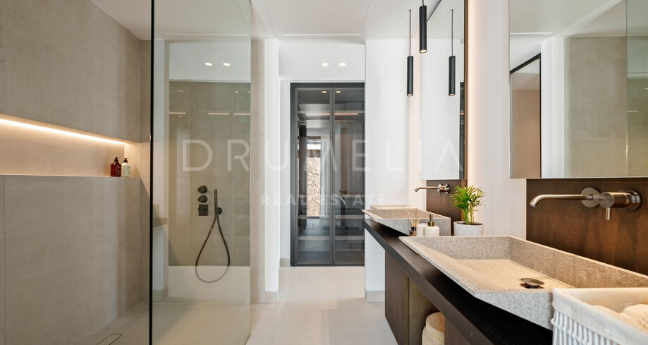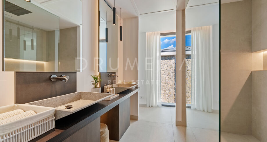 Auf drei Ebenen verteilt, bietet die Villa offene und lichtdurchflutete Wohnbereiche, eine Designerküche und elegante Essbereiche, die direkt auf großzügige Terrassen führen. Die Außenbereiche sind um einen 51 m² großen Infinity-Pool angeordnet und schaffen einen nahtlosen Übergang zwischen Innen- und Außenbereich. Die fünf Schlafzimmer und fünf Badezimmer umfassen Gästesuiten und eine große Mastersuite mit privater Terrasse, Ankleidebereich und einem Badezimmer im zeitgenössischen Stil.