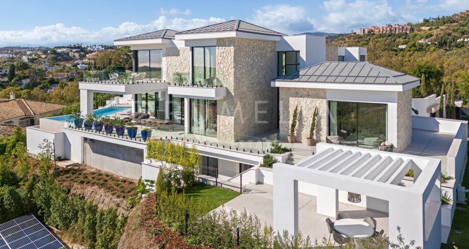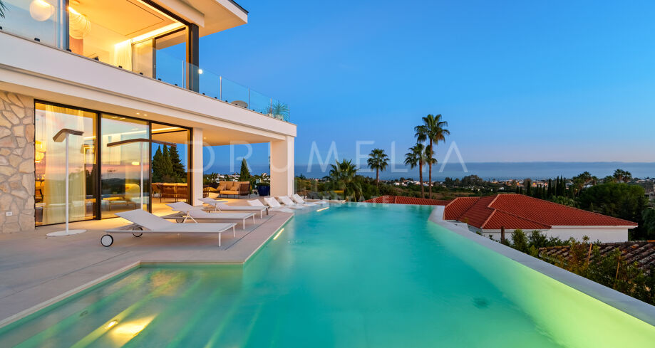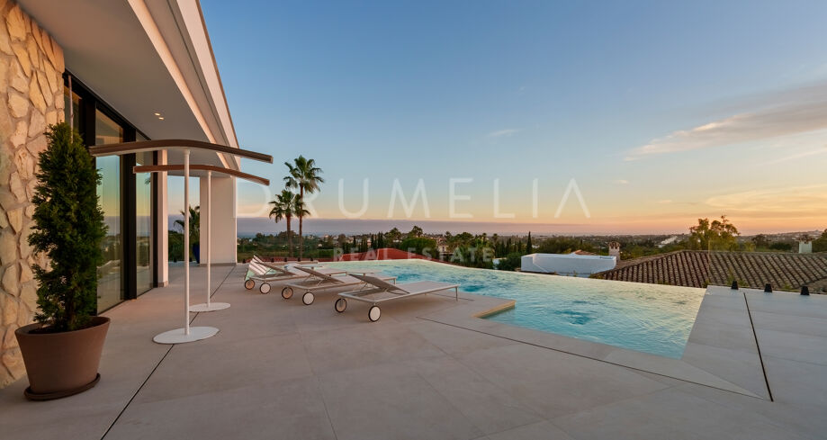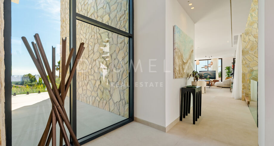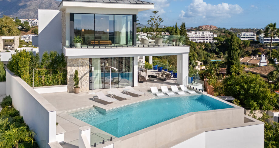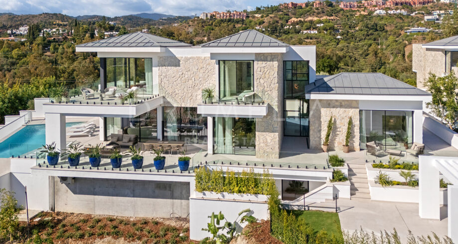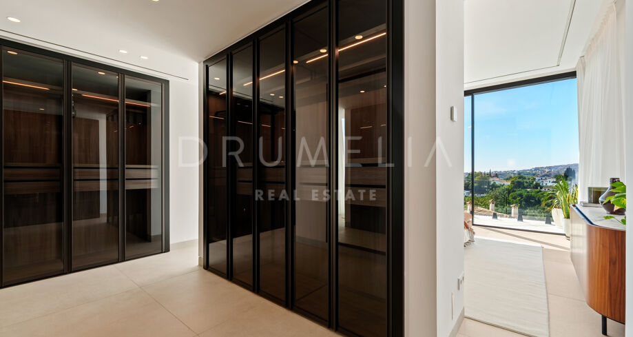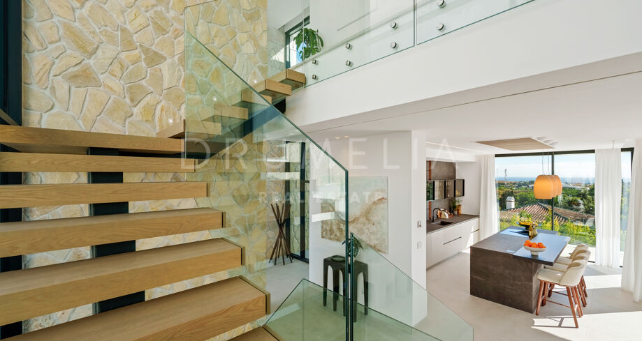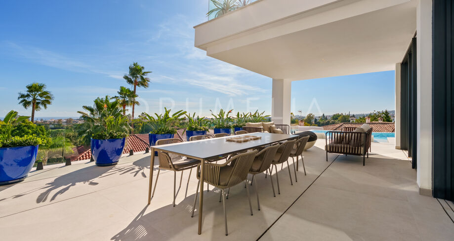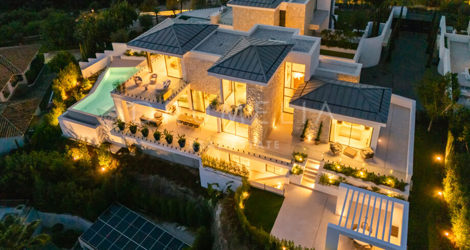 Diese zeitgenössische Villa in La Quinta, Benahavís, liegt zwischen dem Mittelmeer und dem La-Concha-Berg und bietet einen Panoramablick über das Golf Valley und die Küste. Die Lage bietet Privatsphäre, Ruhe und unmittelbaren Zugang zu Golfplätzen wie dem La Quinta Golf & Country Club, Los Naranjos und Los Arqueros, während Puerto Banús und Puente Romano nur eine kurze Fahrt entfernt sind.